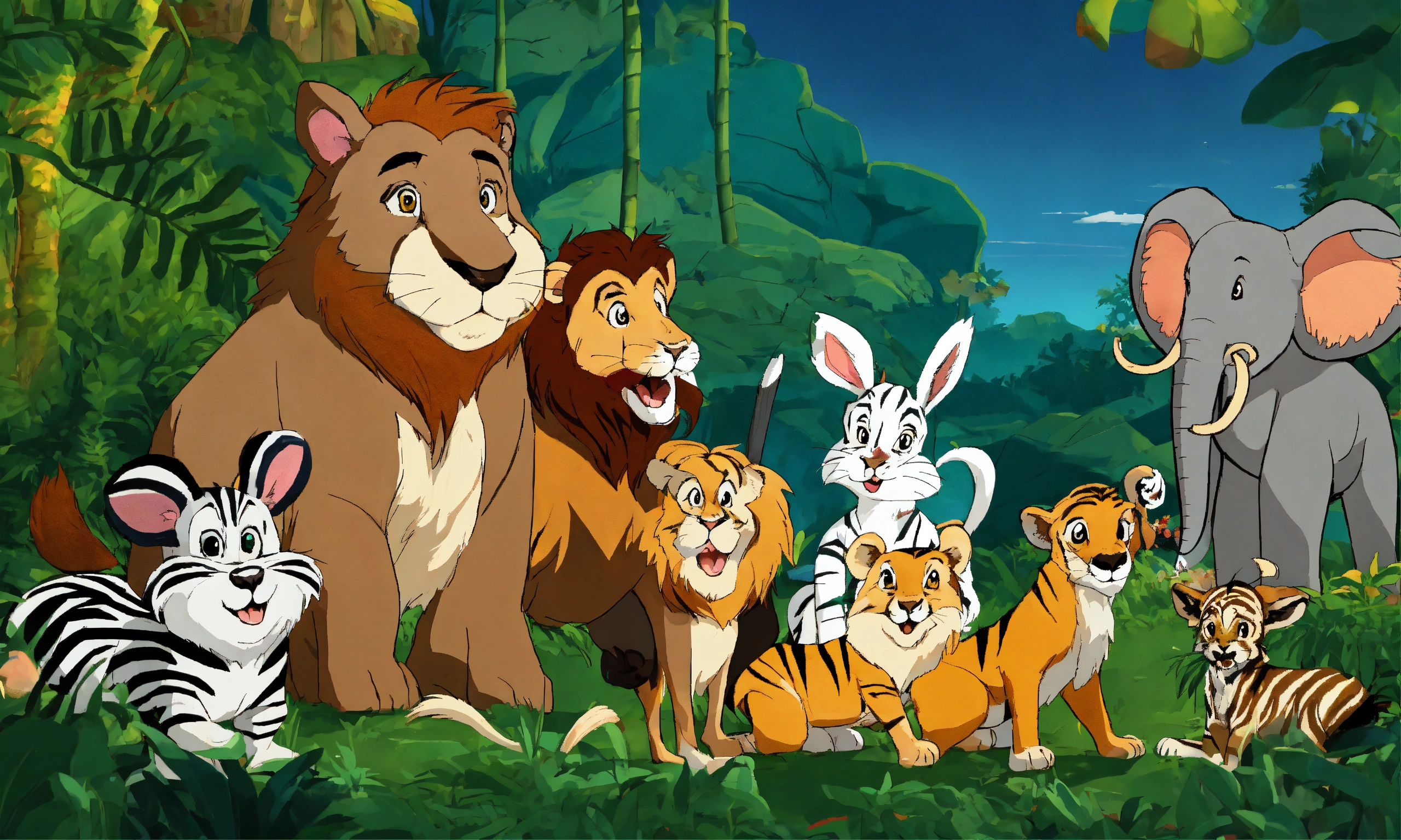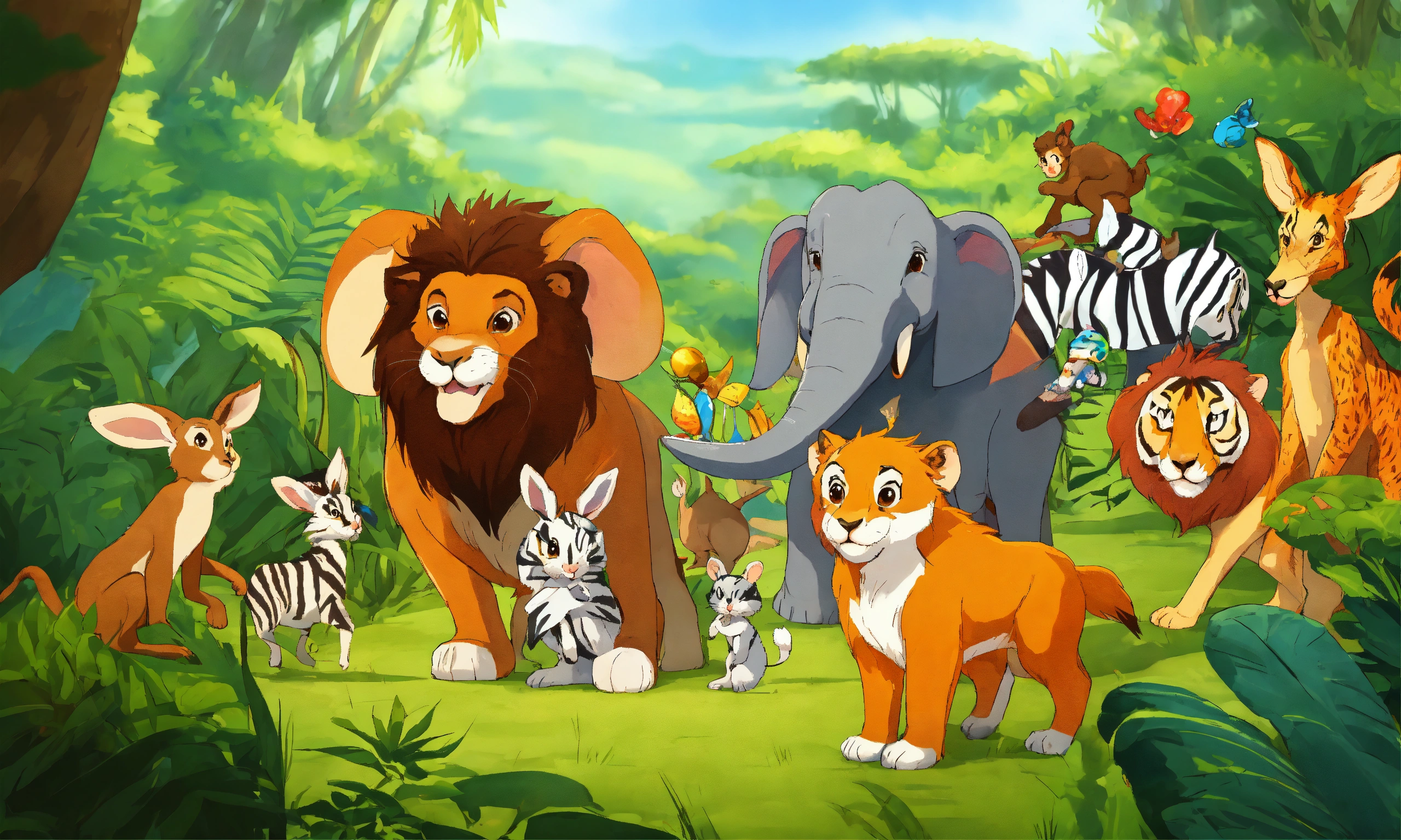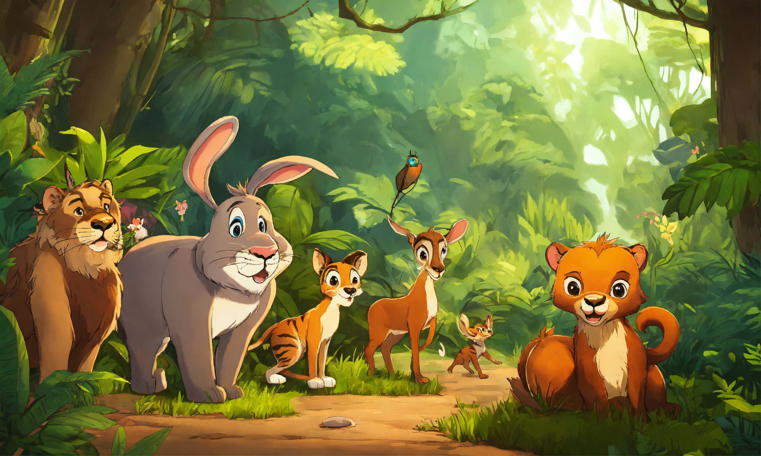 Cartoon rabbit is showing its presence in front of other jungle animals elephant wolf deer lion monkeys zebra bear for being faster