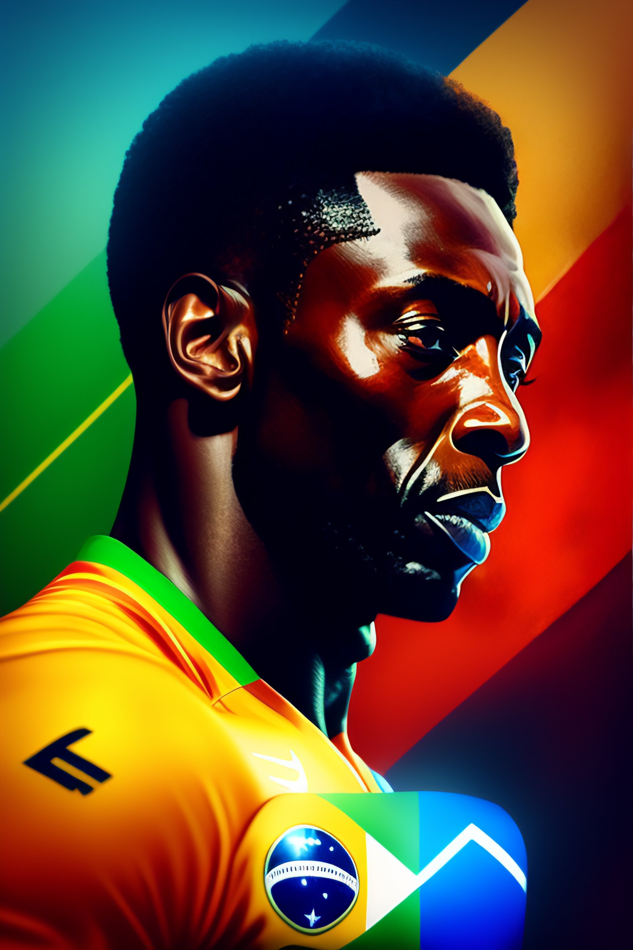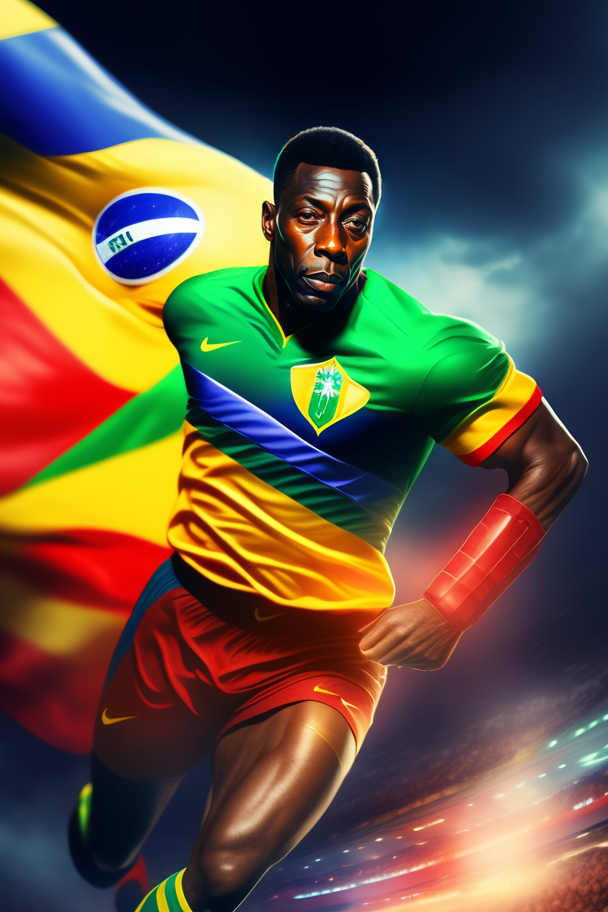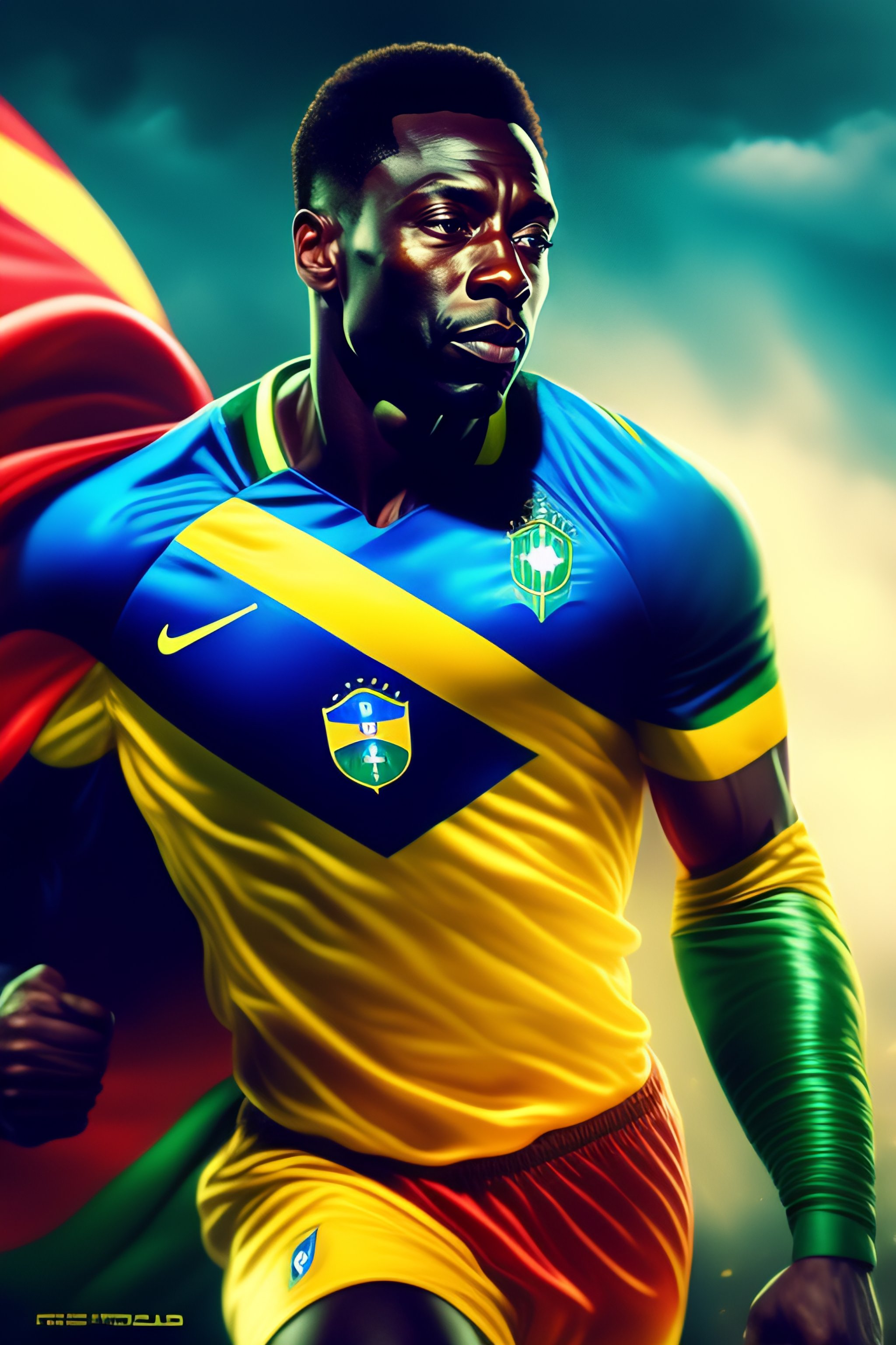 Pelé as super hero, brazil flag, sky, intricate, highly detailed, sharp focus, artstation, digital paiting, wide shot