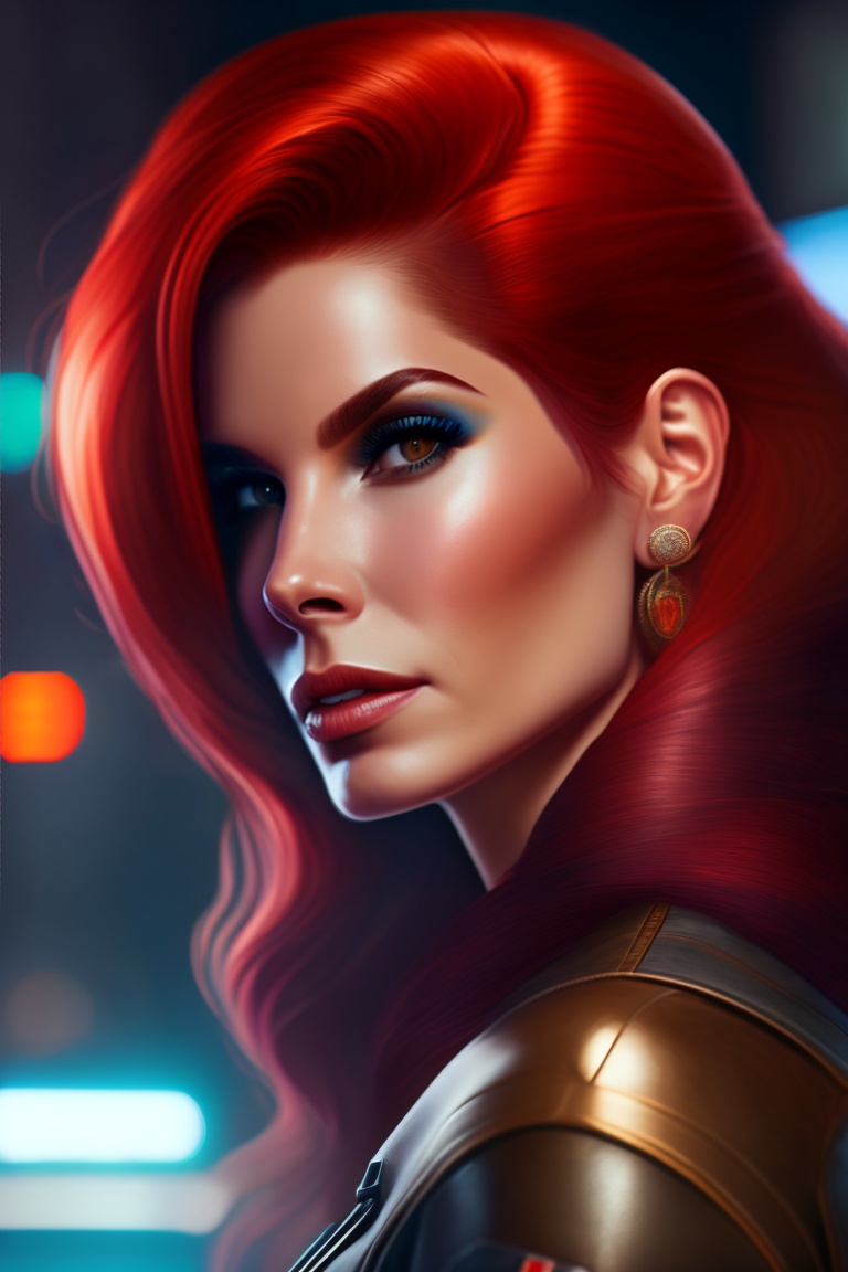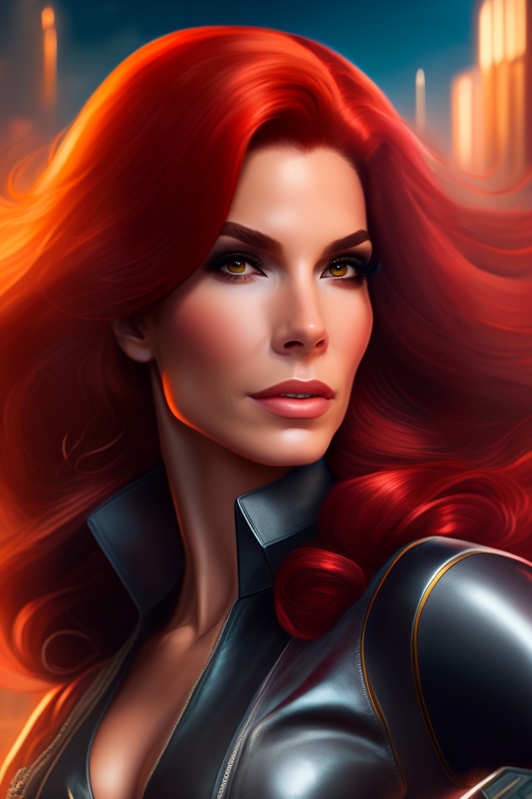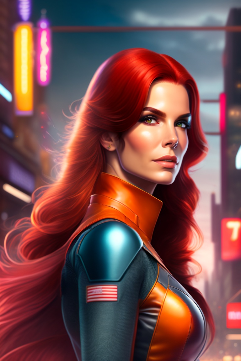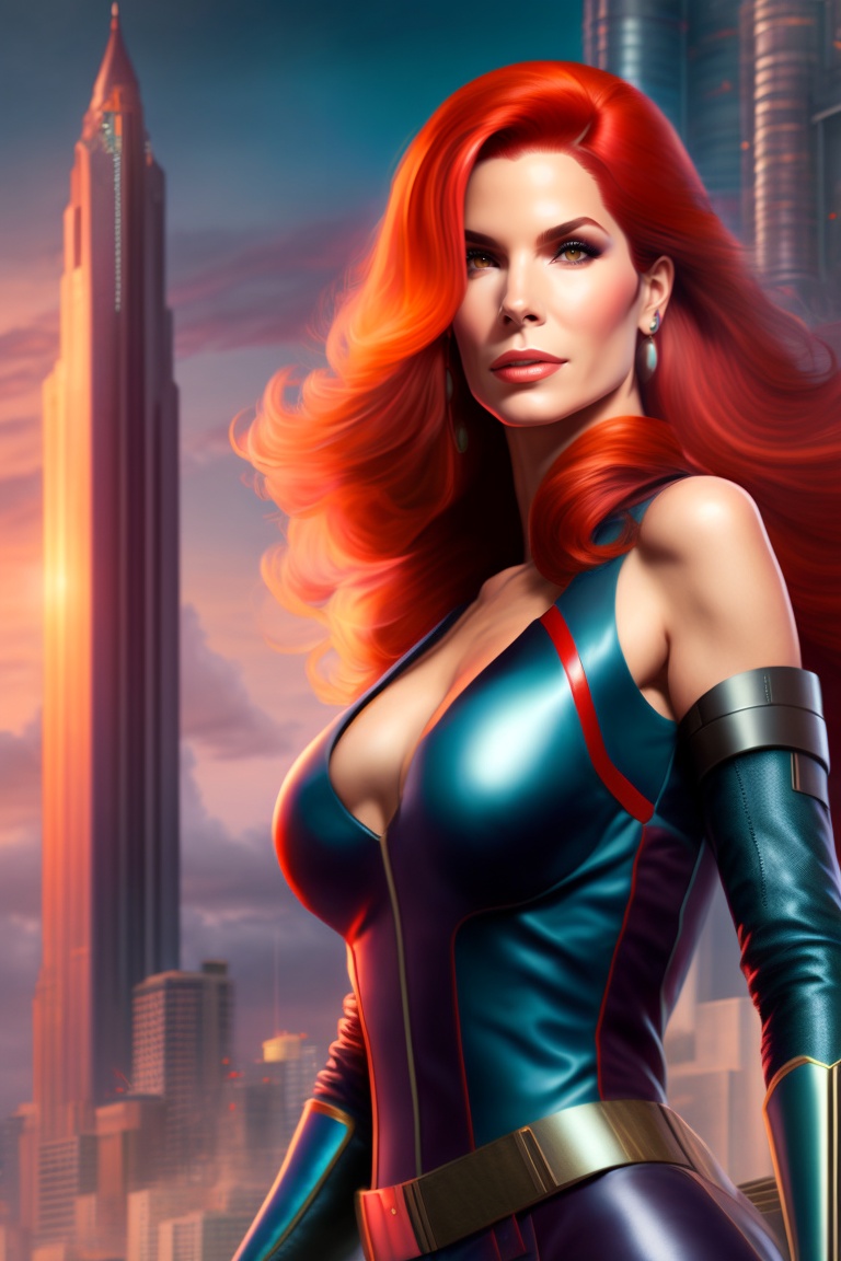 Detailed photorealistic (close-up) of sandra bullock, by marvel, long red hair, heroic posing, ((perfect body)), 4k, dystopian cityscape in the background, rich moody colors, full body shot, long legs