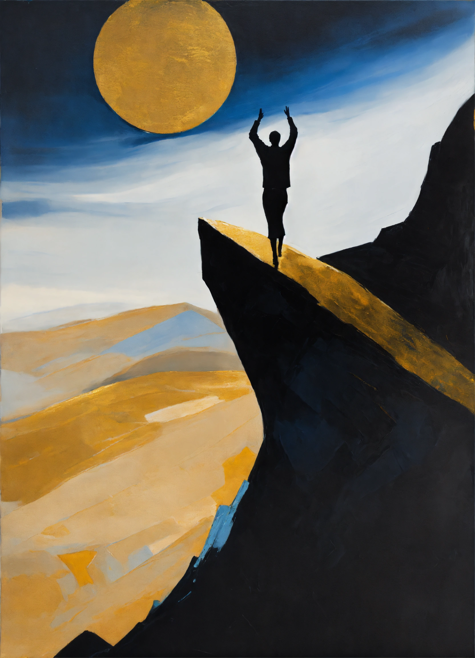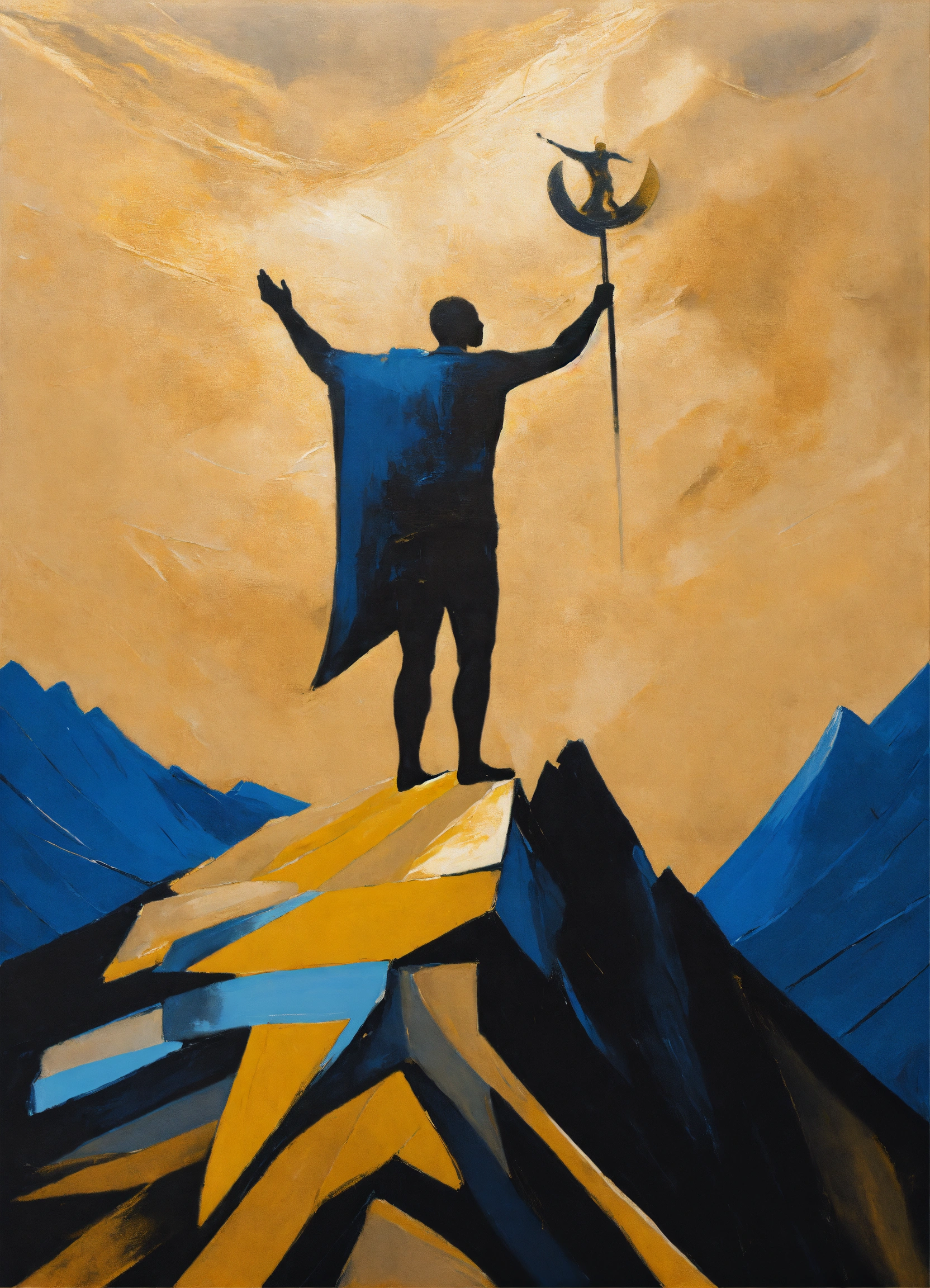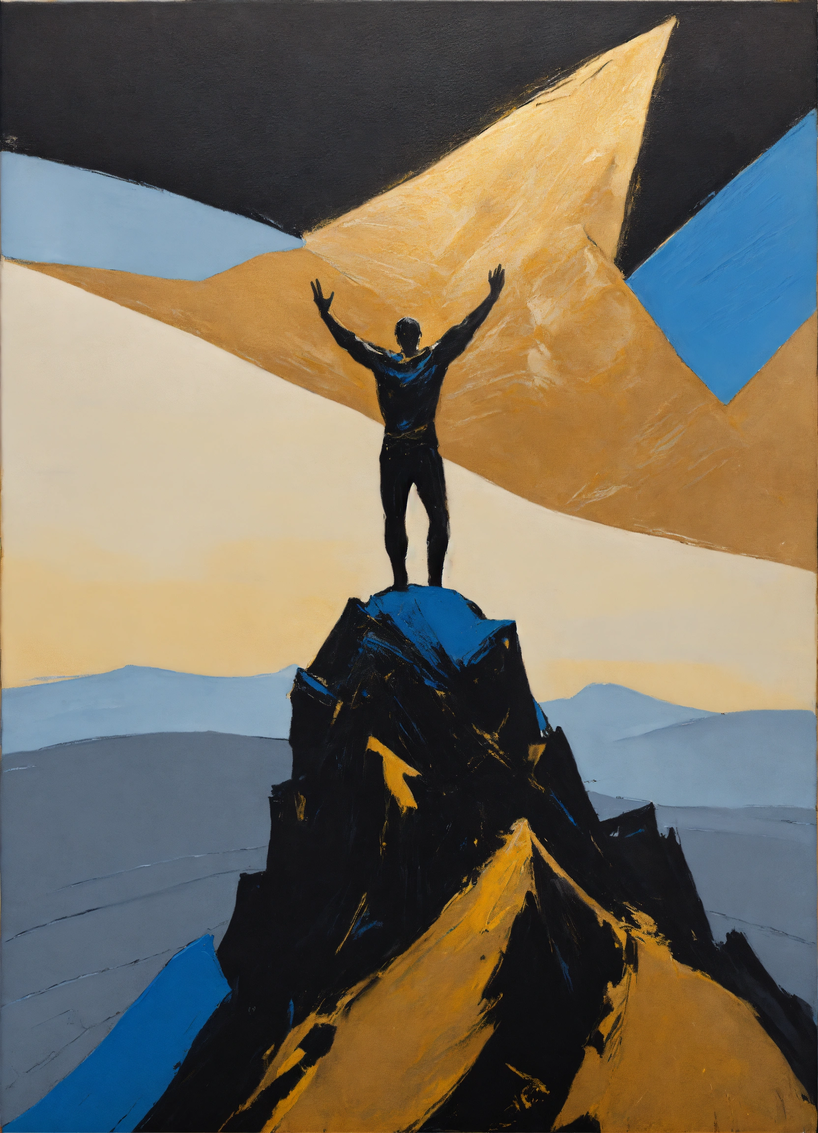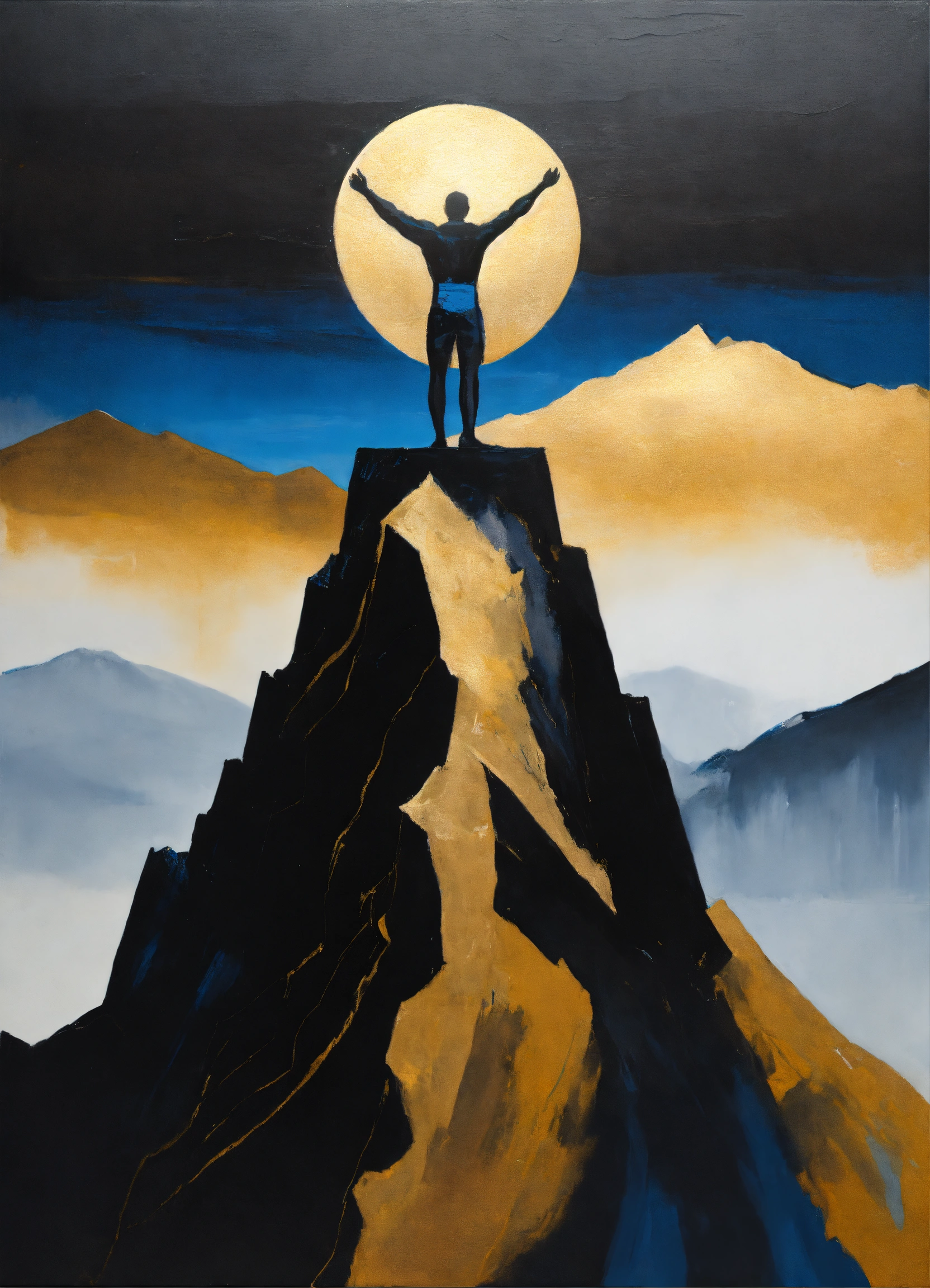 Abstract and minimalist oil painting of human figure on a mountain peak celebrating victory in black, gold and blue