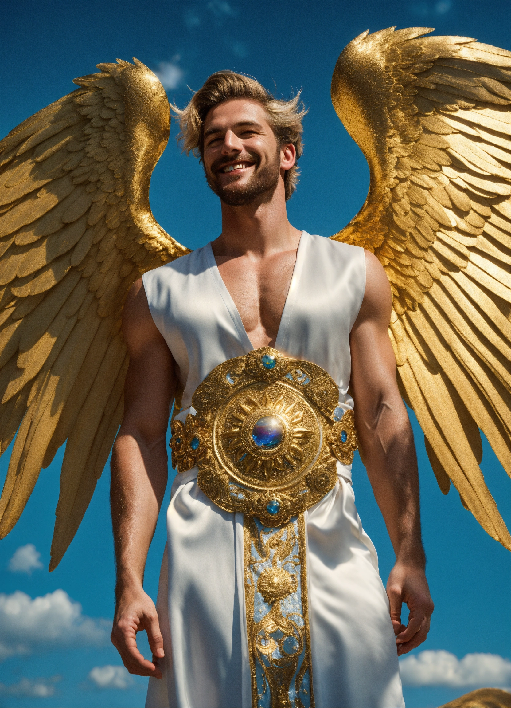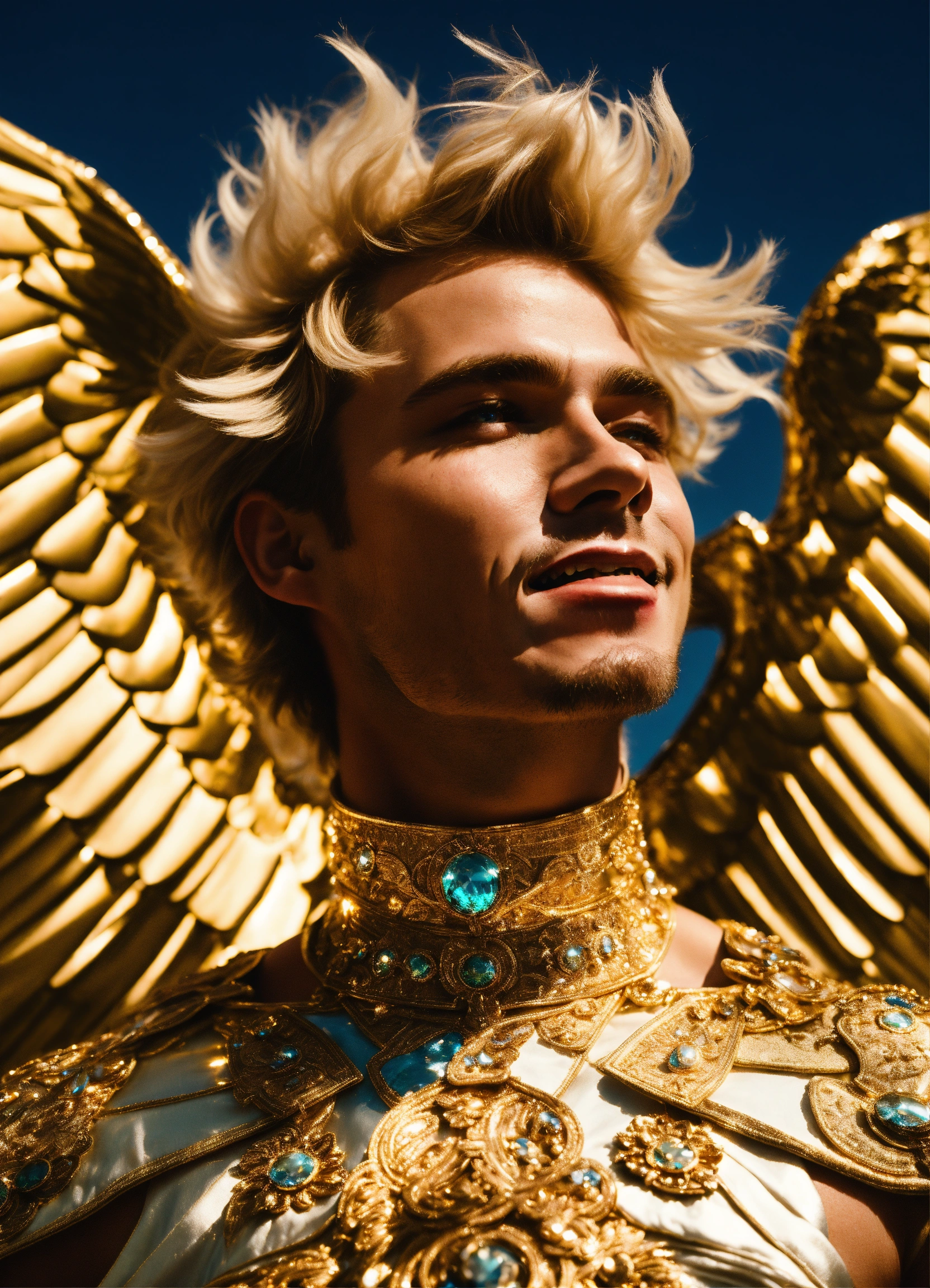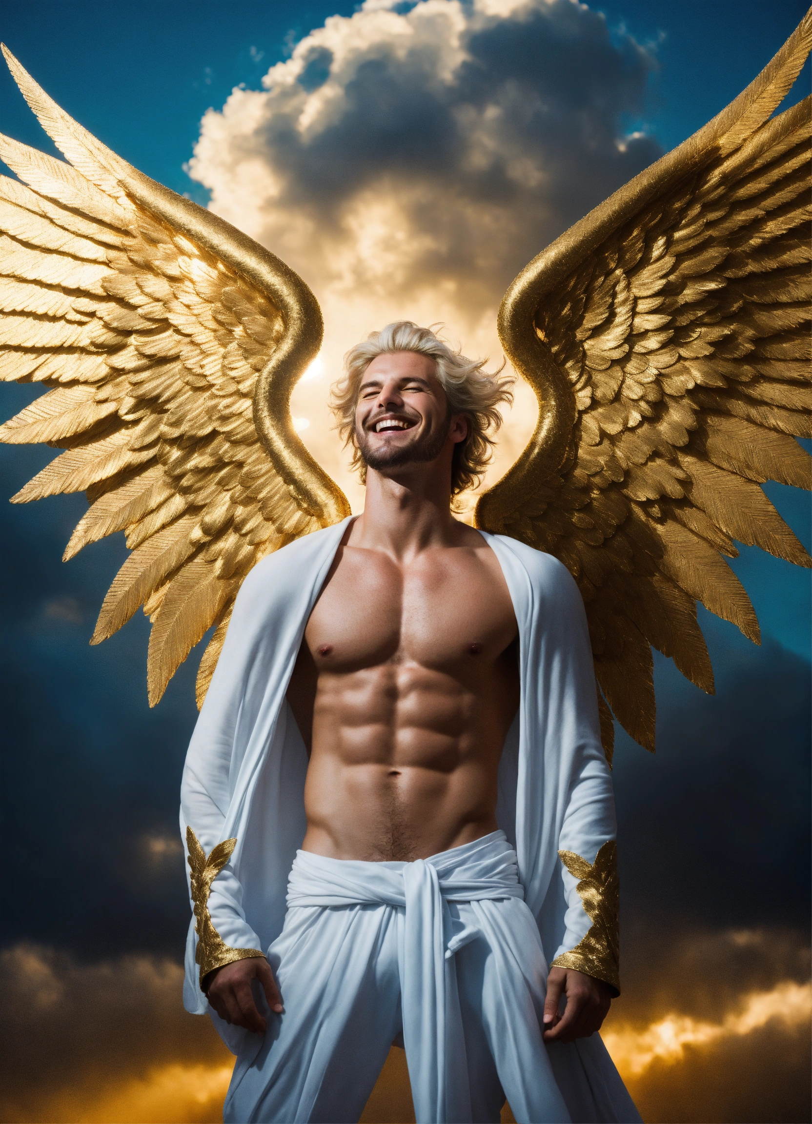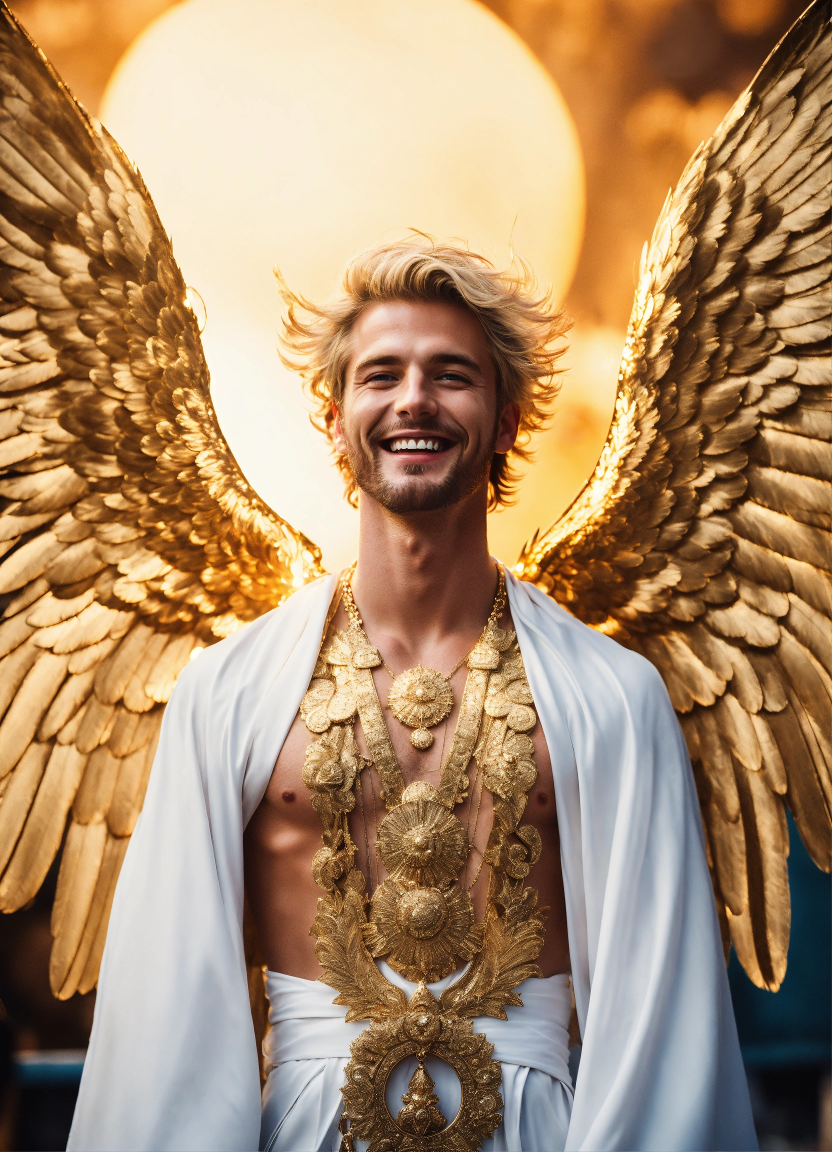 Iconoclastic dazzlingly bright photograph portrait of handsome fit masculine male archangel of the sun supermodel white, laughing smile, laughing and staring directly into camera at me, massive white wings spreading out from his back, short blonde hair, glowing loving blue eyes focussed on me, wearing stylized glowing white robes with stylized sun details over a sparkling gold tunic with high neckline, symmetrical, iconic, dazzling, striking, award winning photo, powerful, emotional, fantasy magazine photoshoot by alessio albi, background is fluffy white clouds in brilliant blue sunshiny sky. film grain.