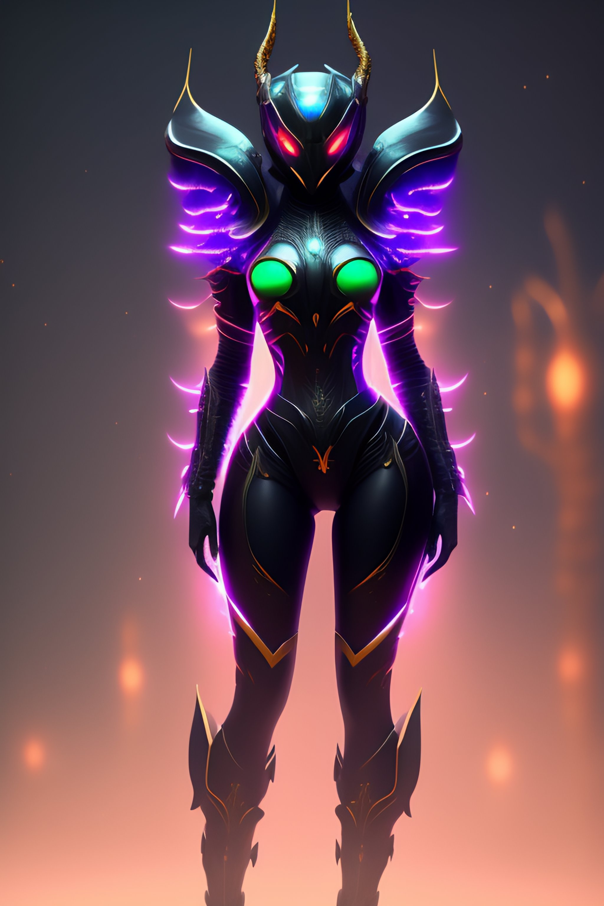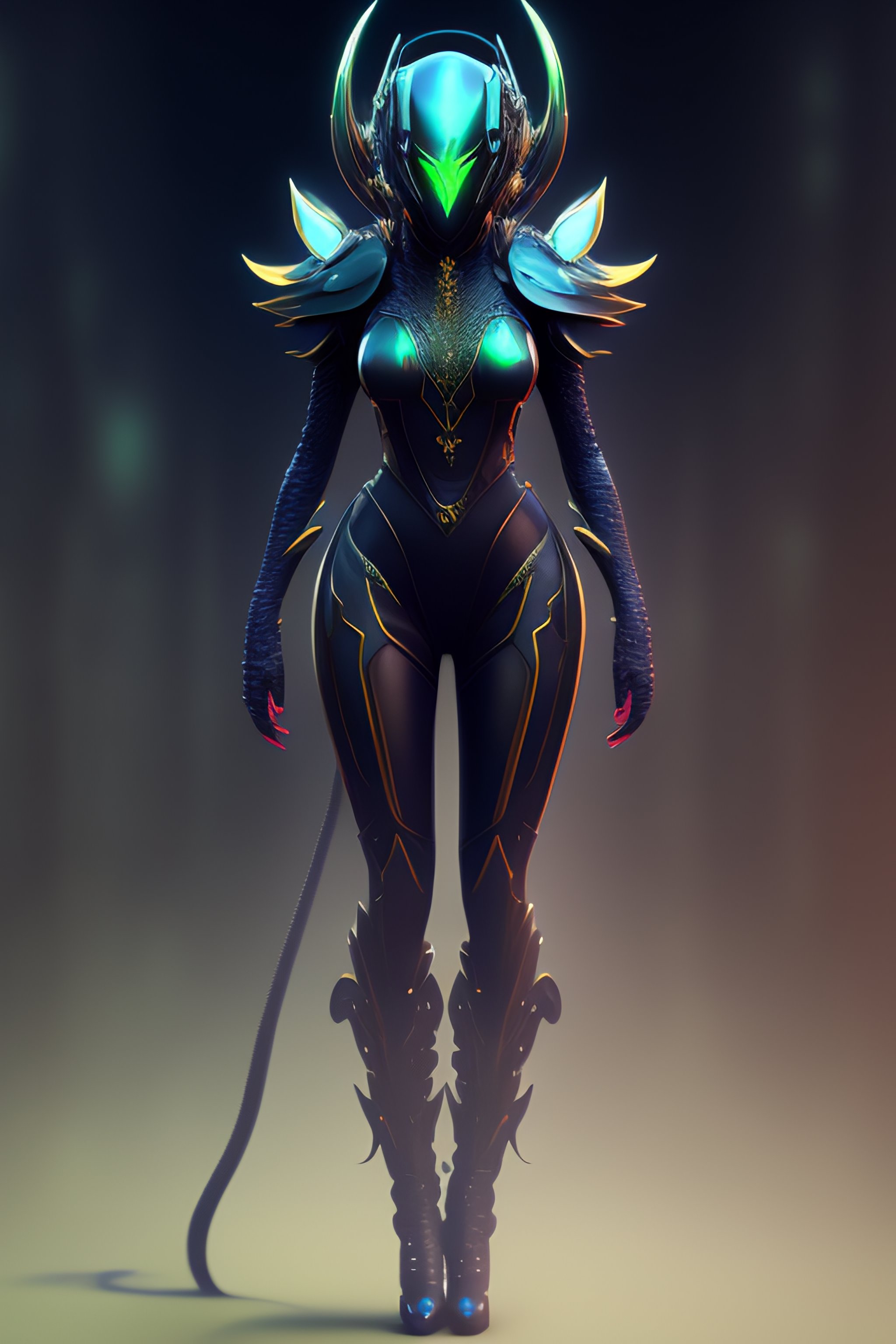 Alien female with six long spider legs, powerful jaws, beautiful and terrible, flexible body, long snake tail, luminous eyes, inspired by stellaris game and warframe, dark souls style