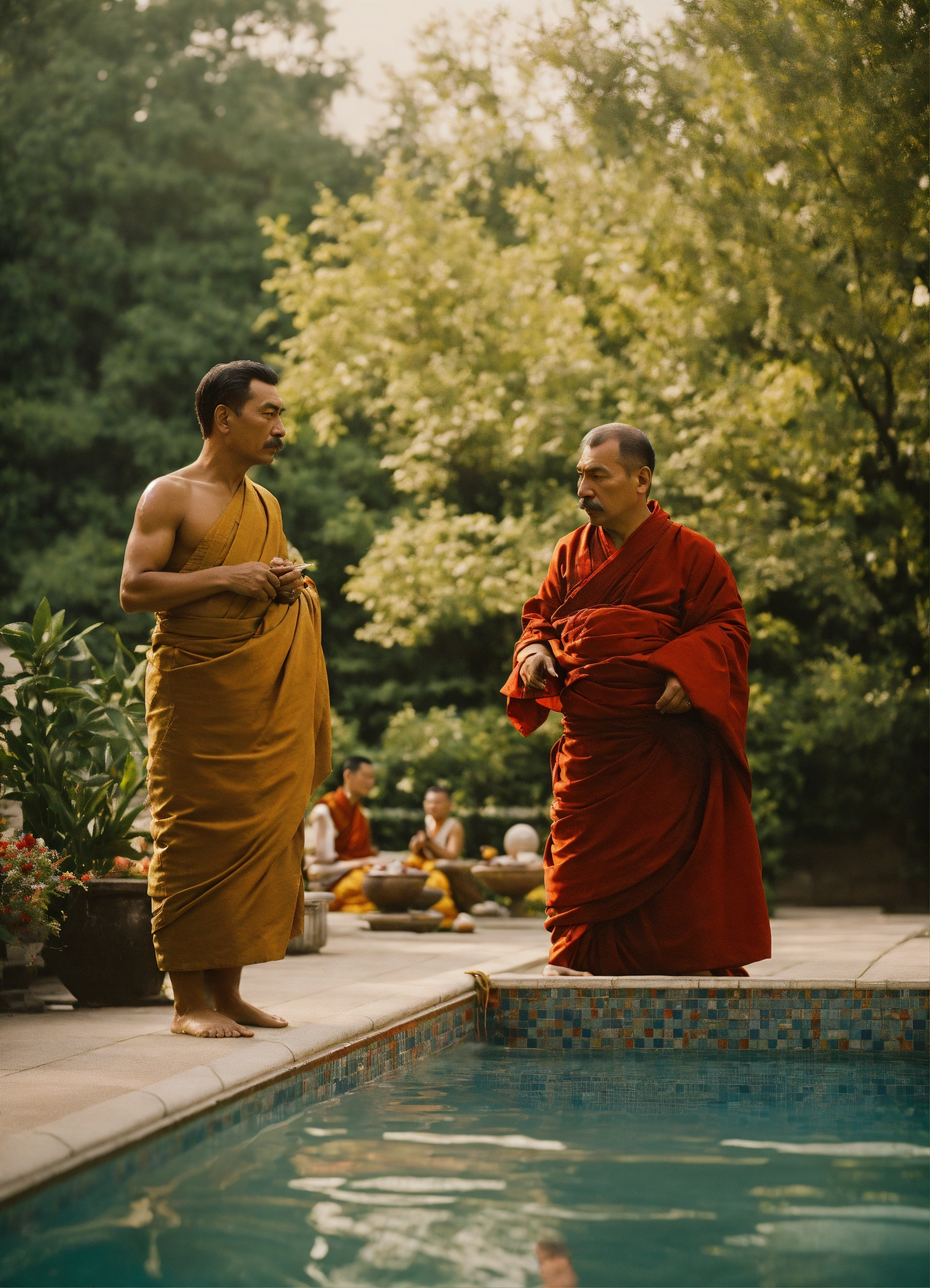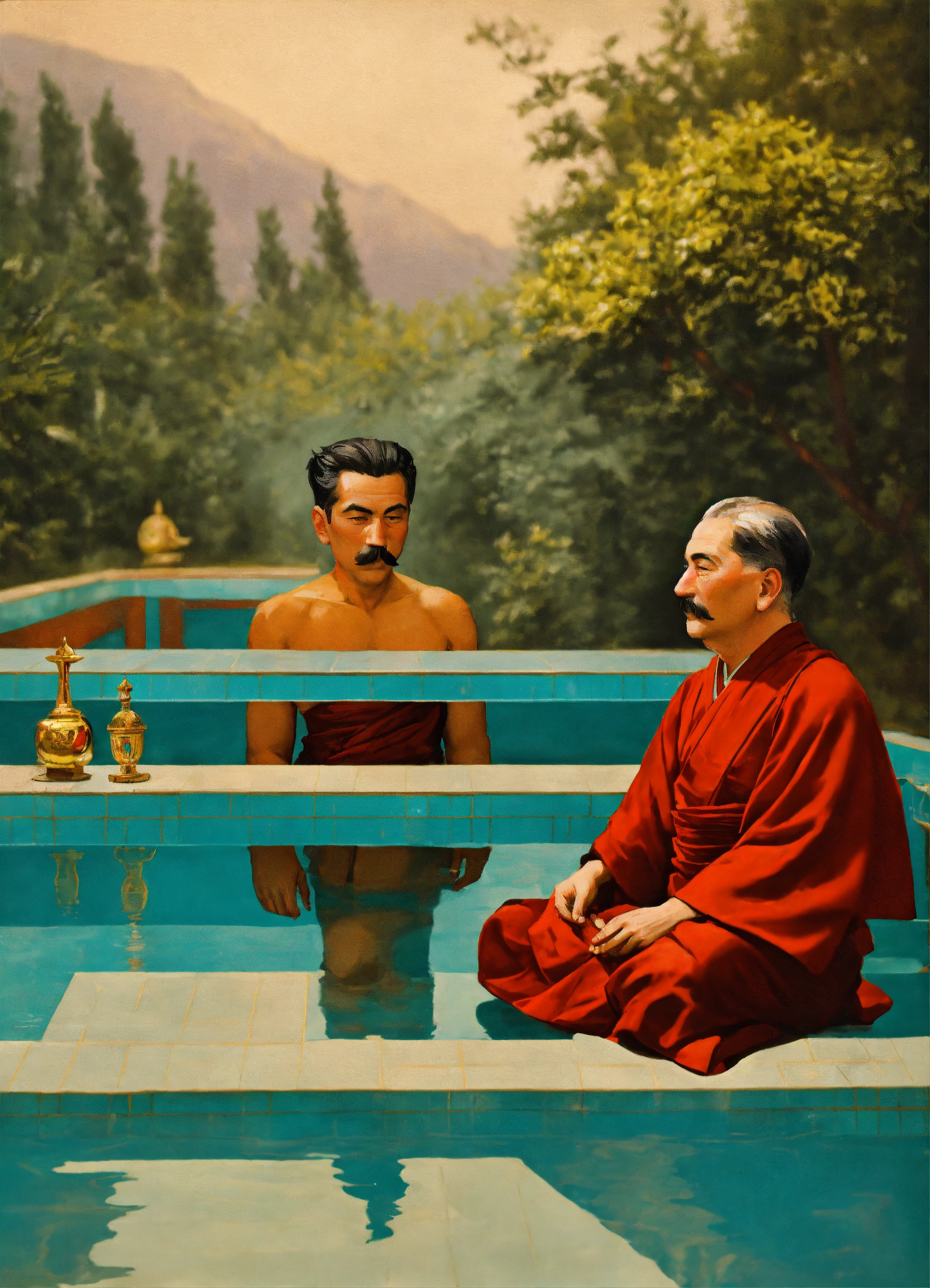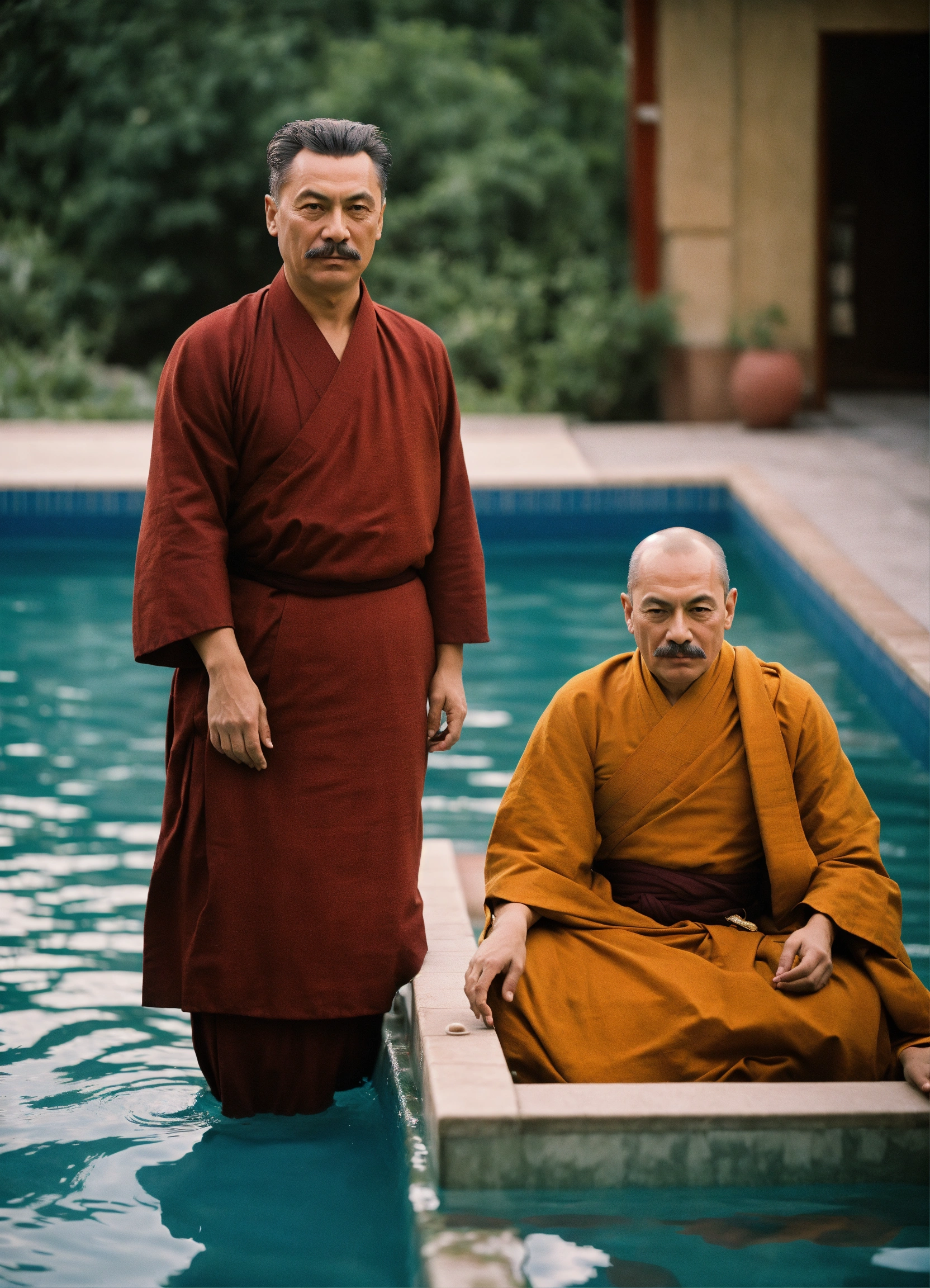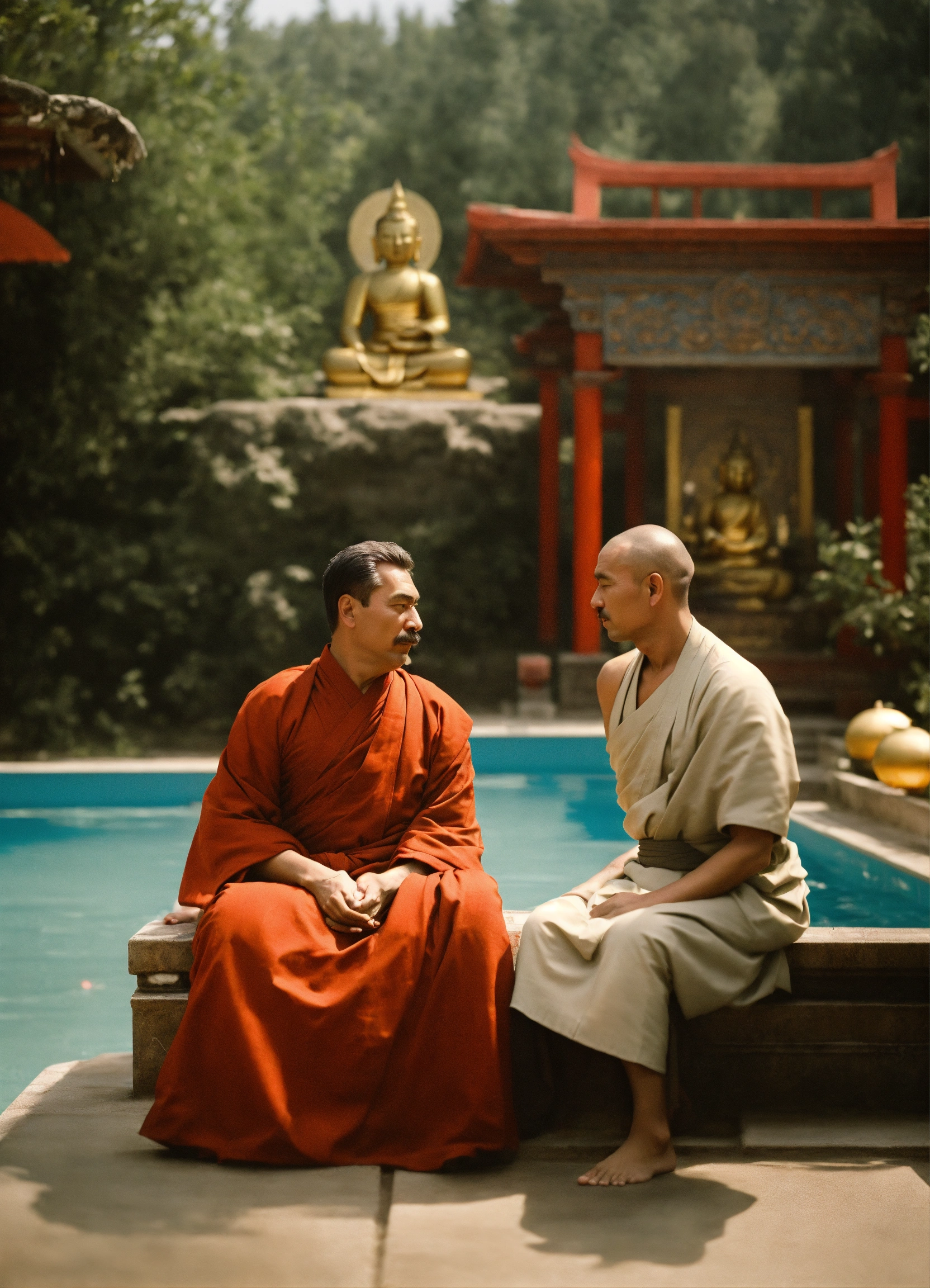 Josef stalin and a buddhist monk in a swimming pool