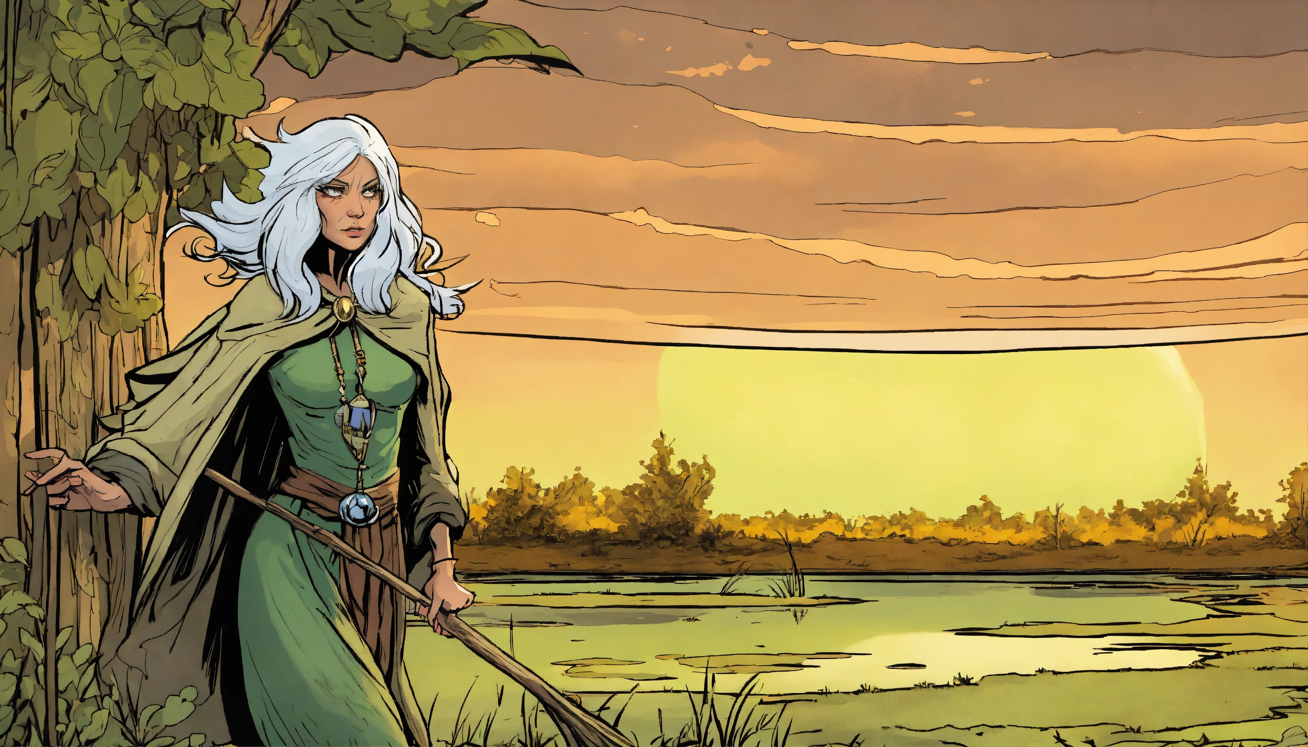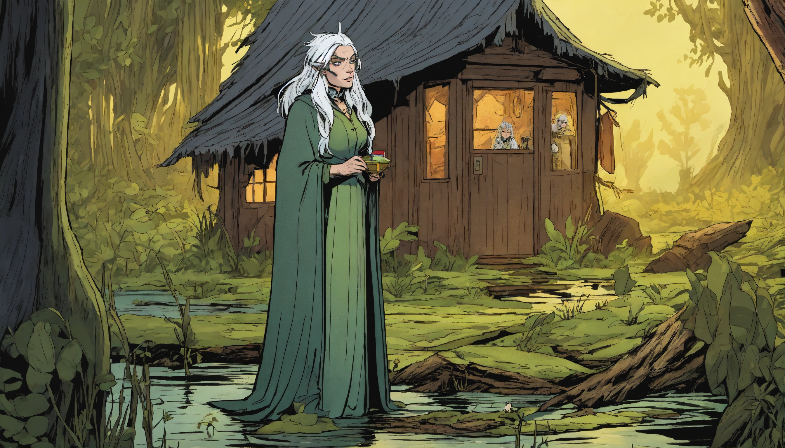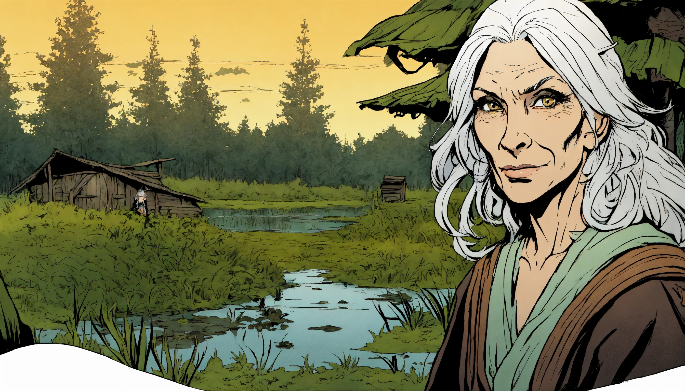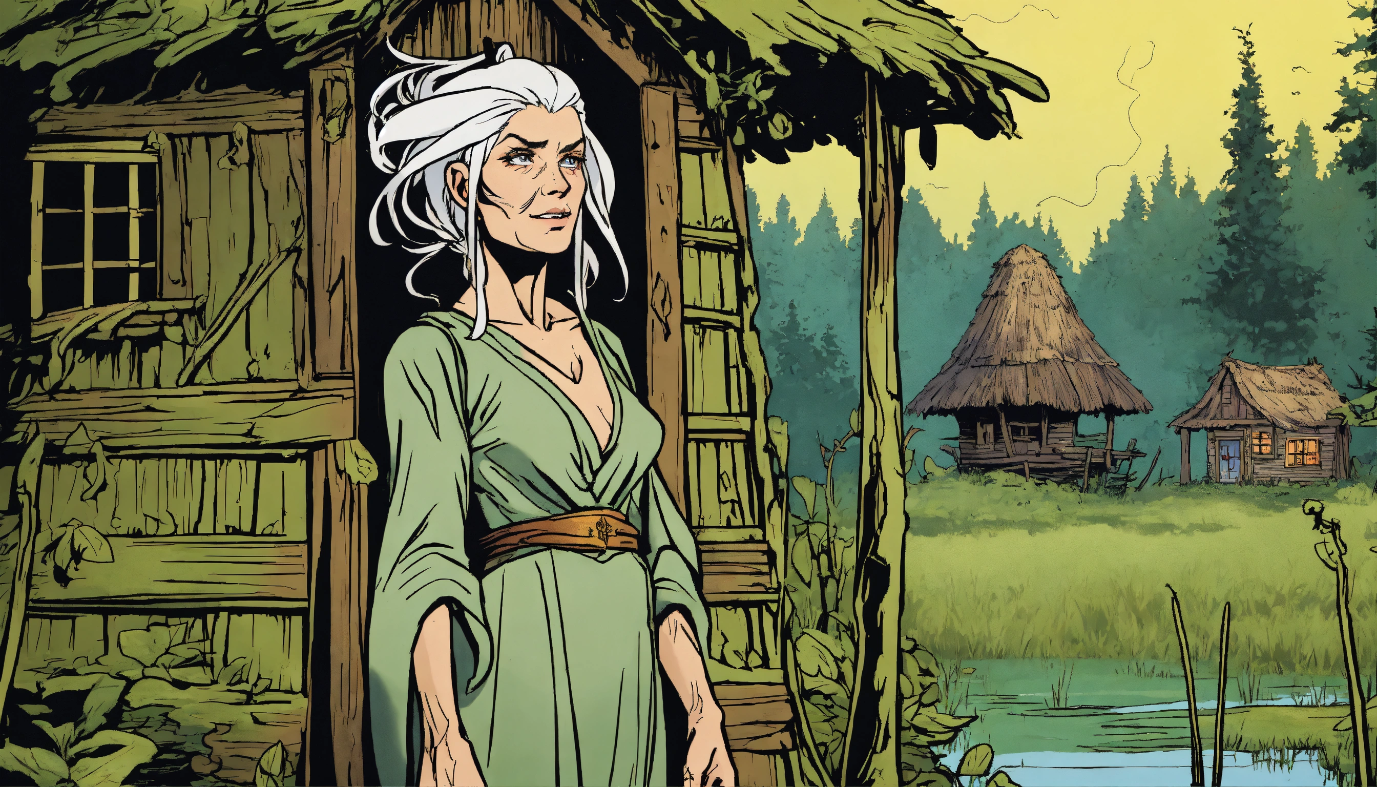 An attractive curious older fey witch that lives in the swamp, white hair, no pupils, powerful, casting a spell, swamp and hut in the background, comic book strip graphic novel art form