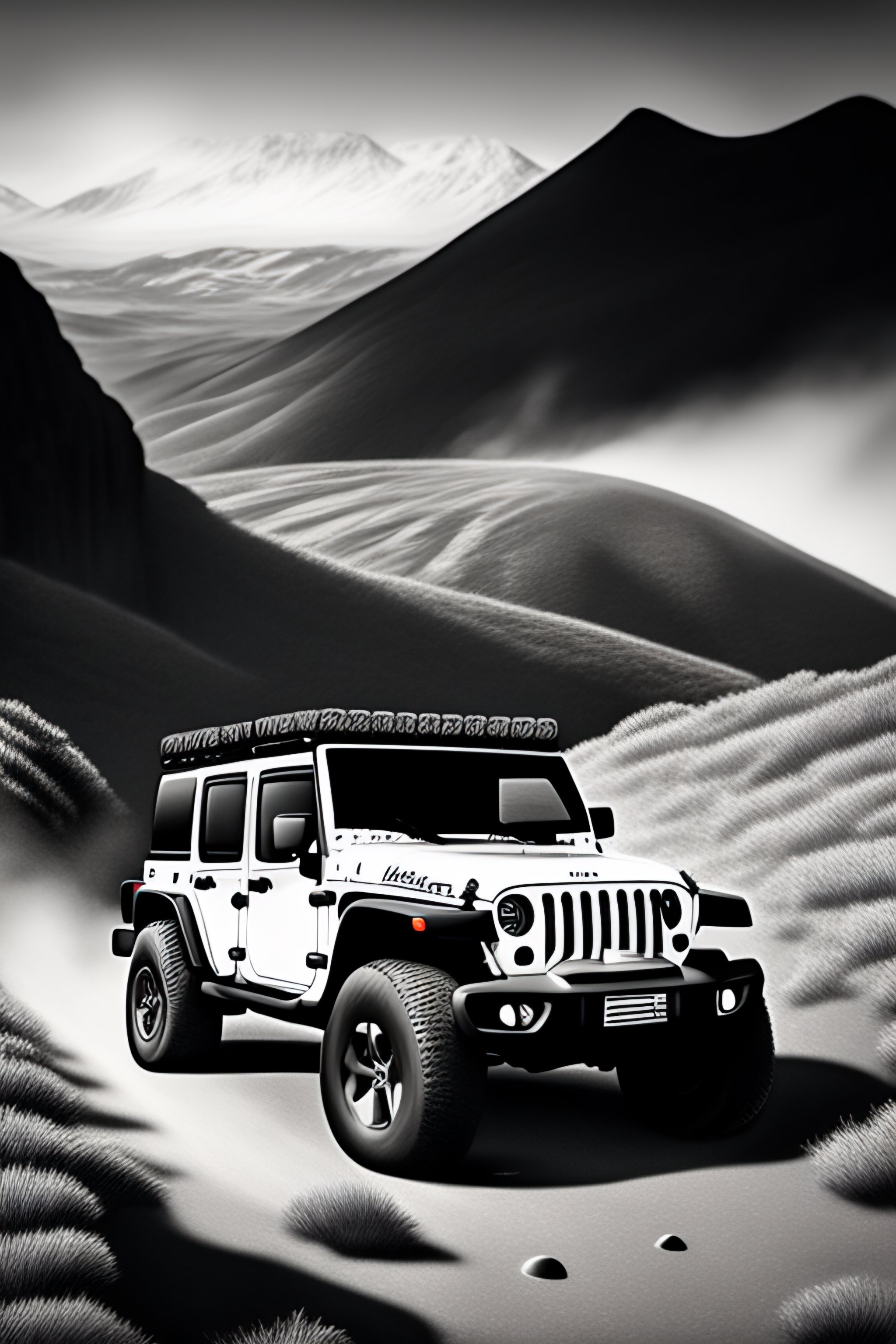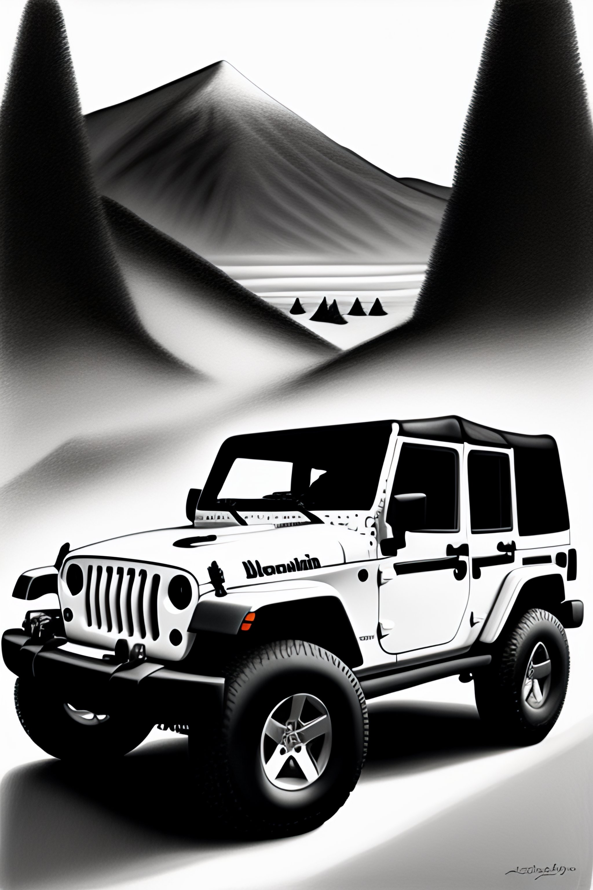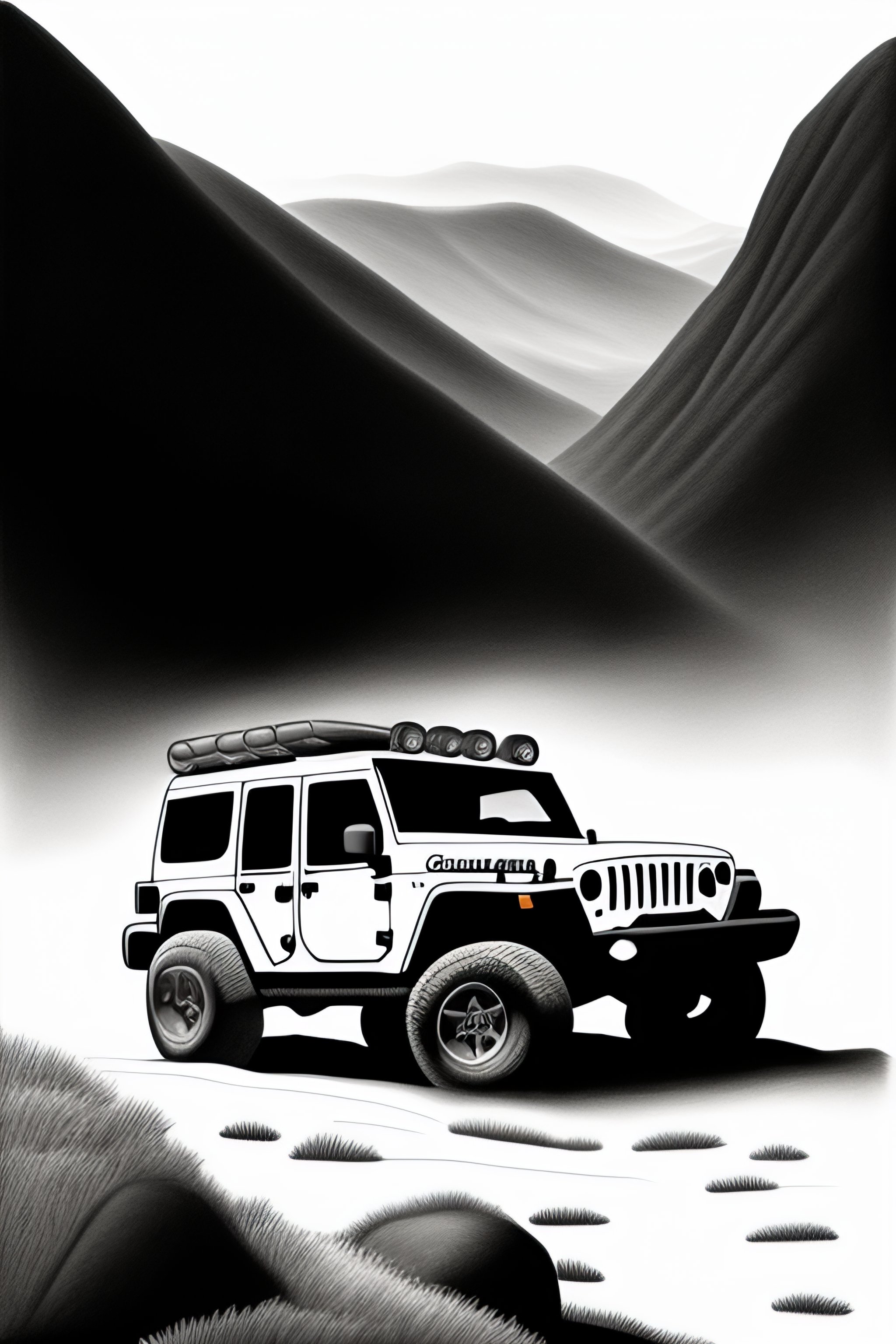 Remote control jeep cartoon drawing going over mountain terrain, black and white pencil drawing, crisp on white background