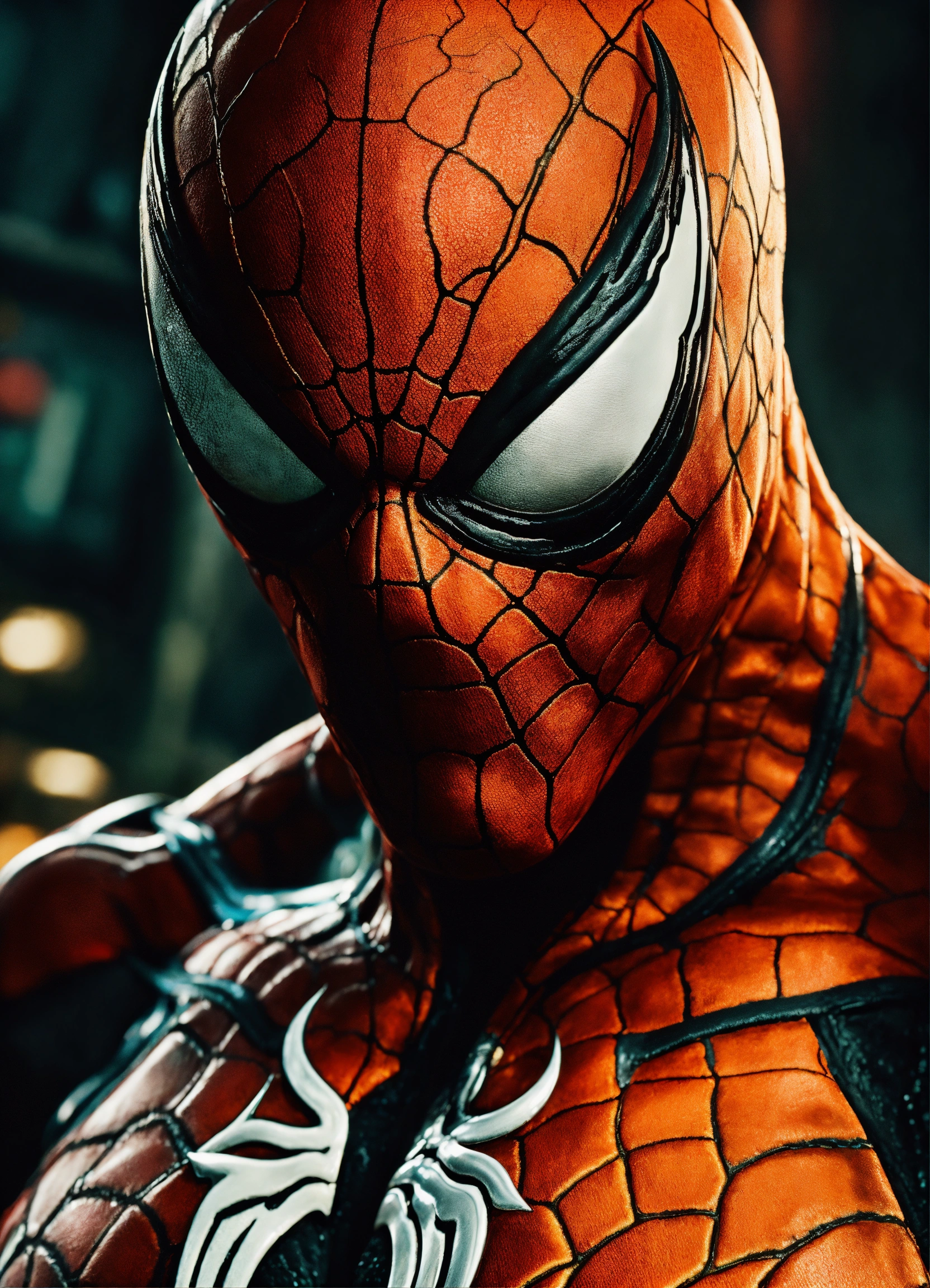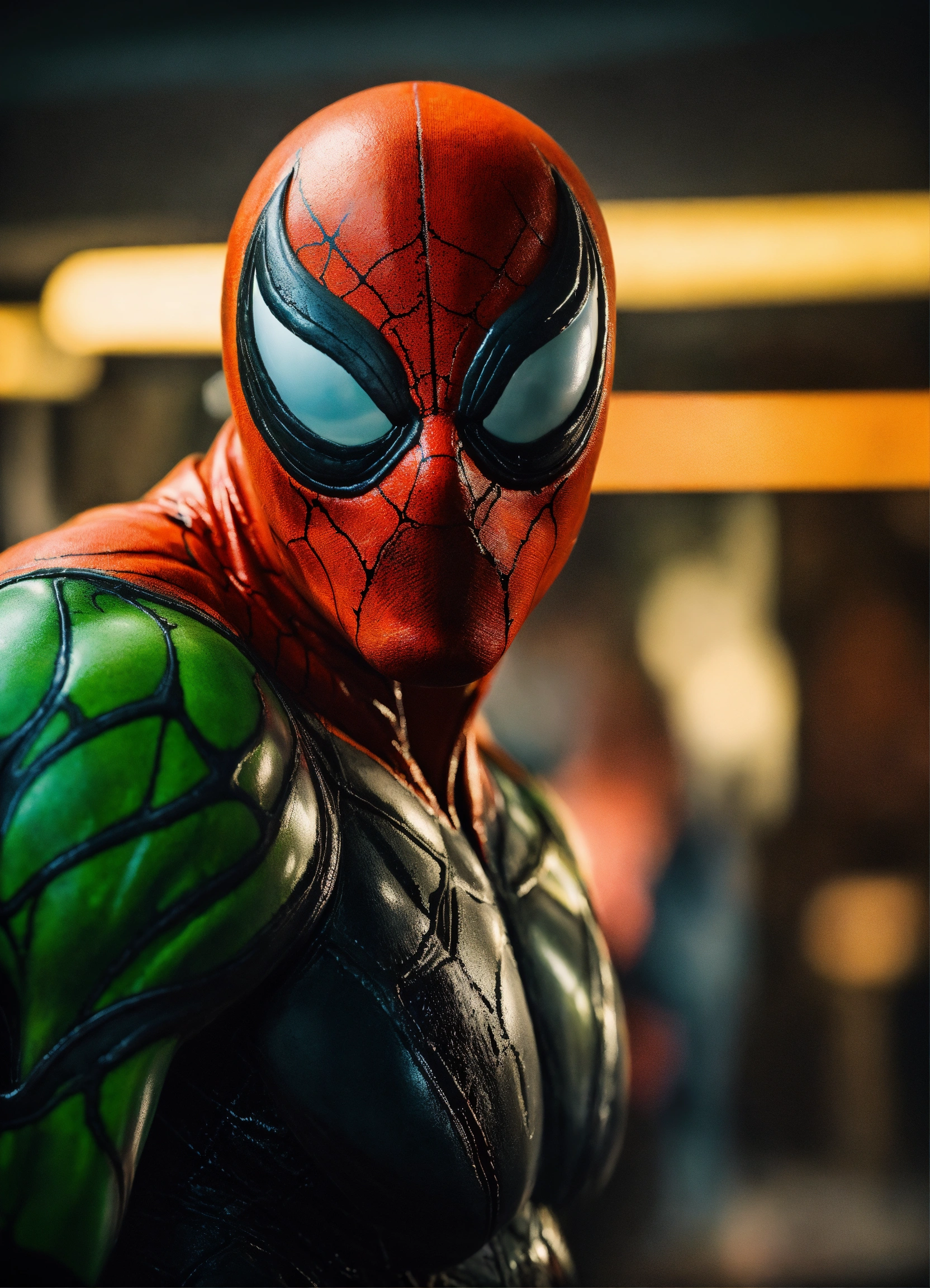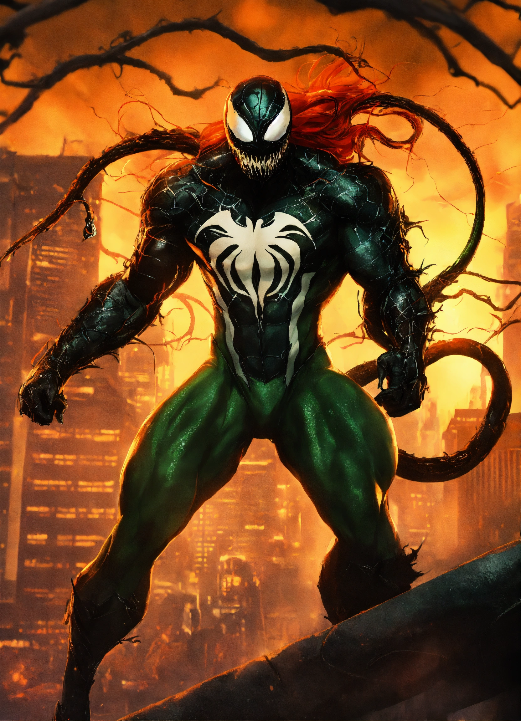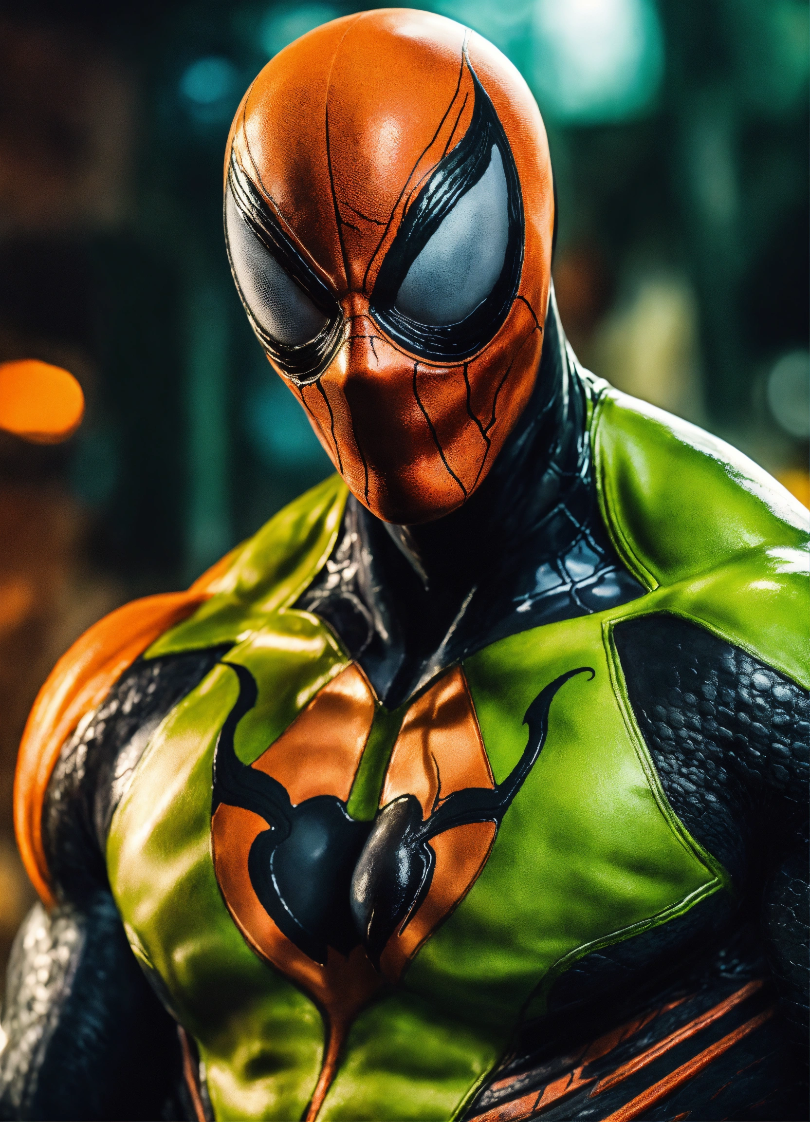 Duende verde de marvel, traje naranja, ojos rojos, venomizado con el simbionte venom, realismo total hd 8k, imagen buena resolucion