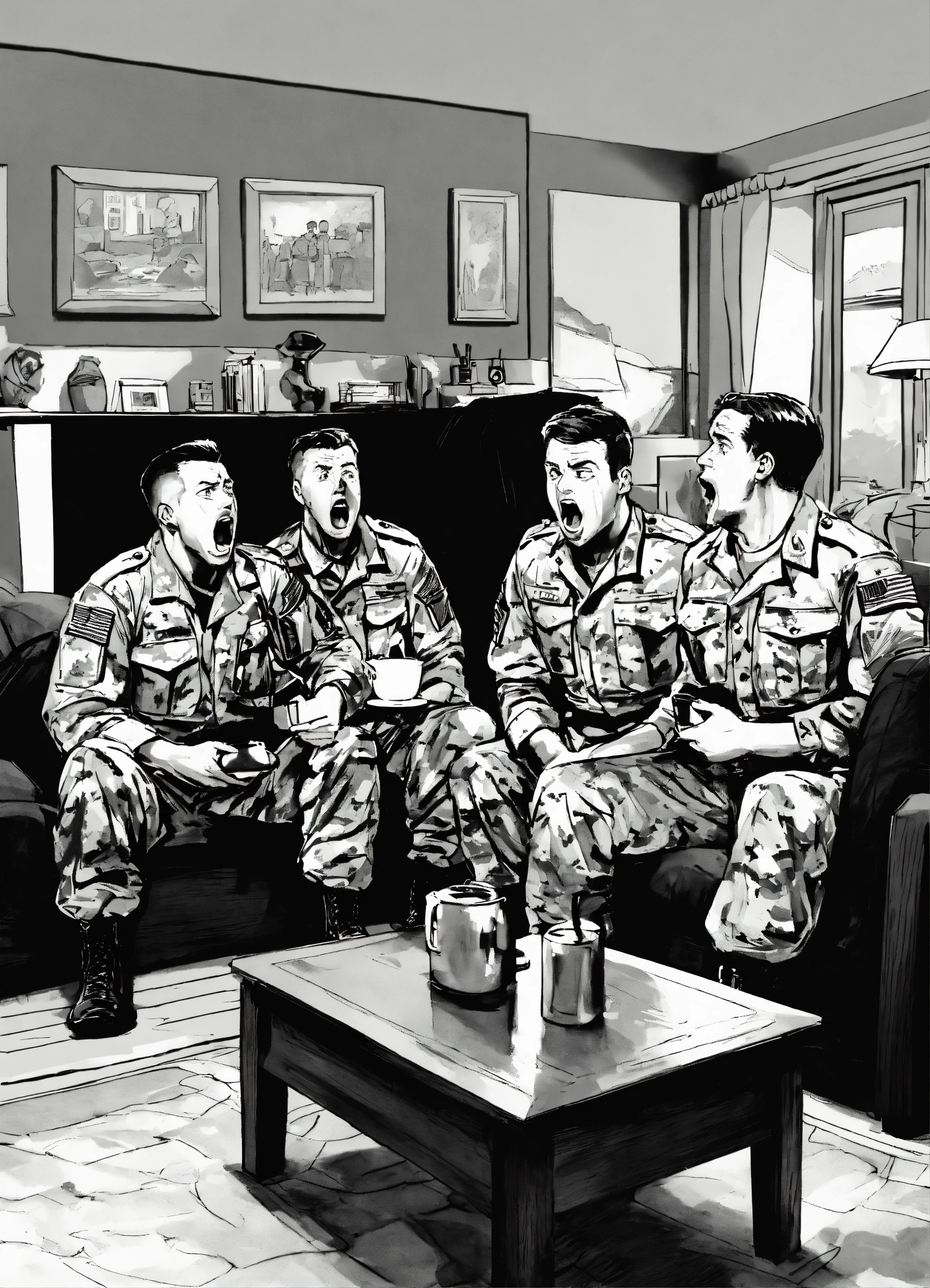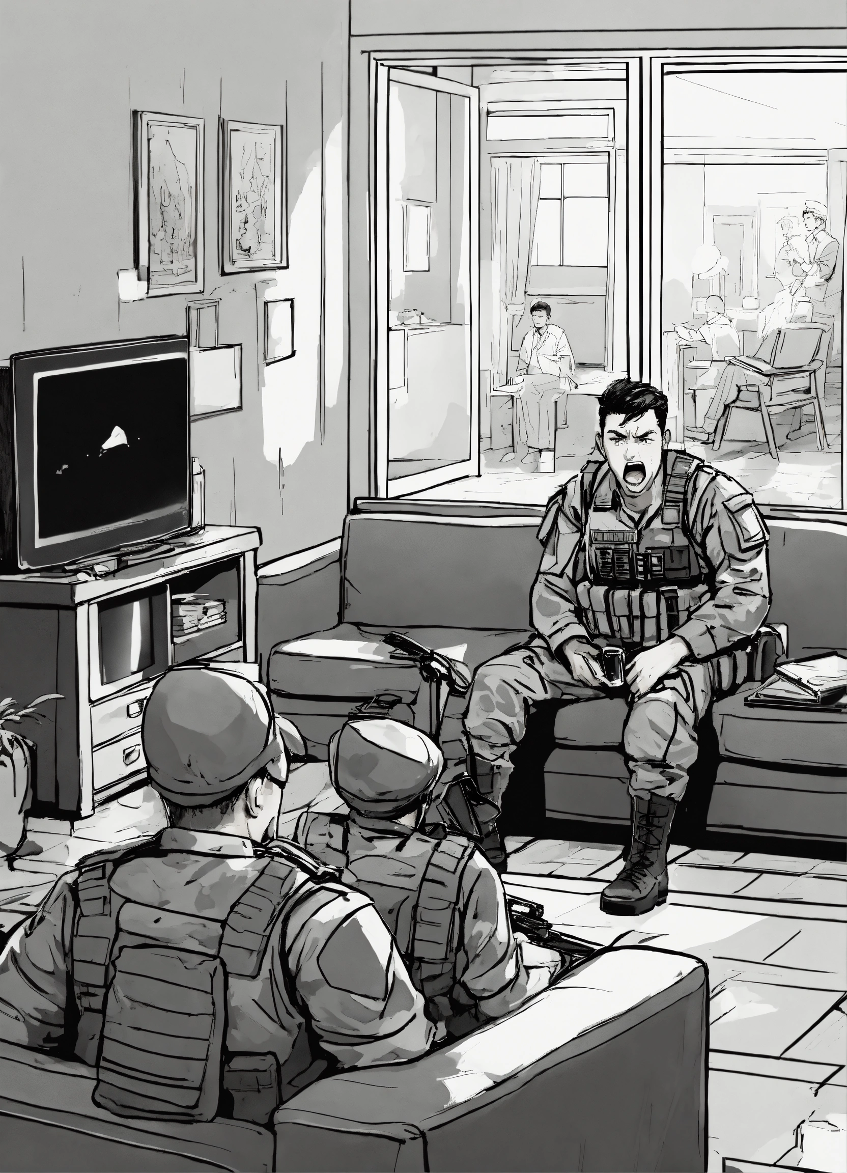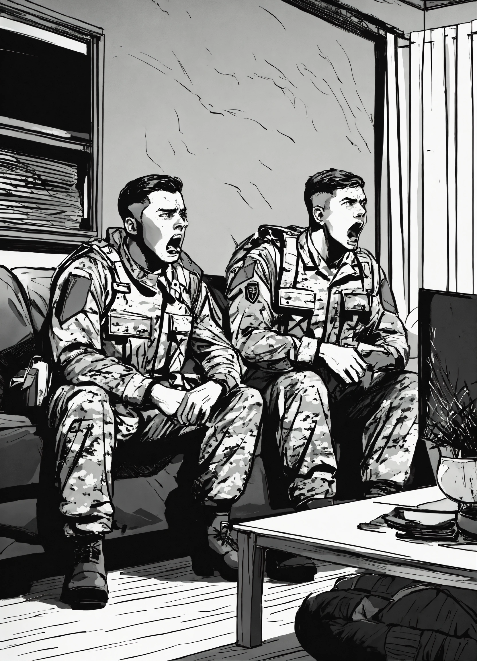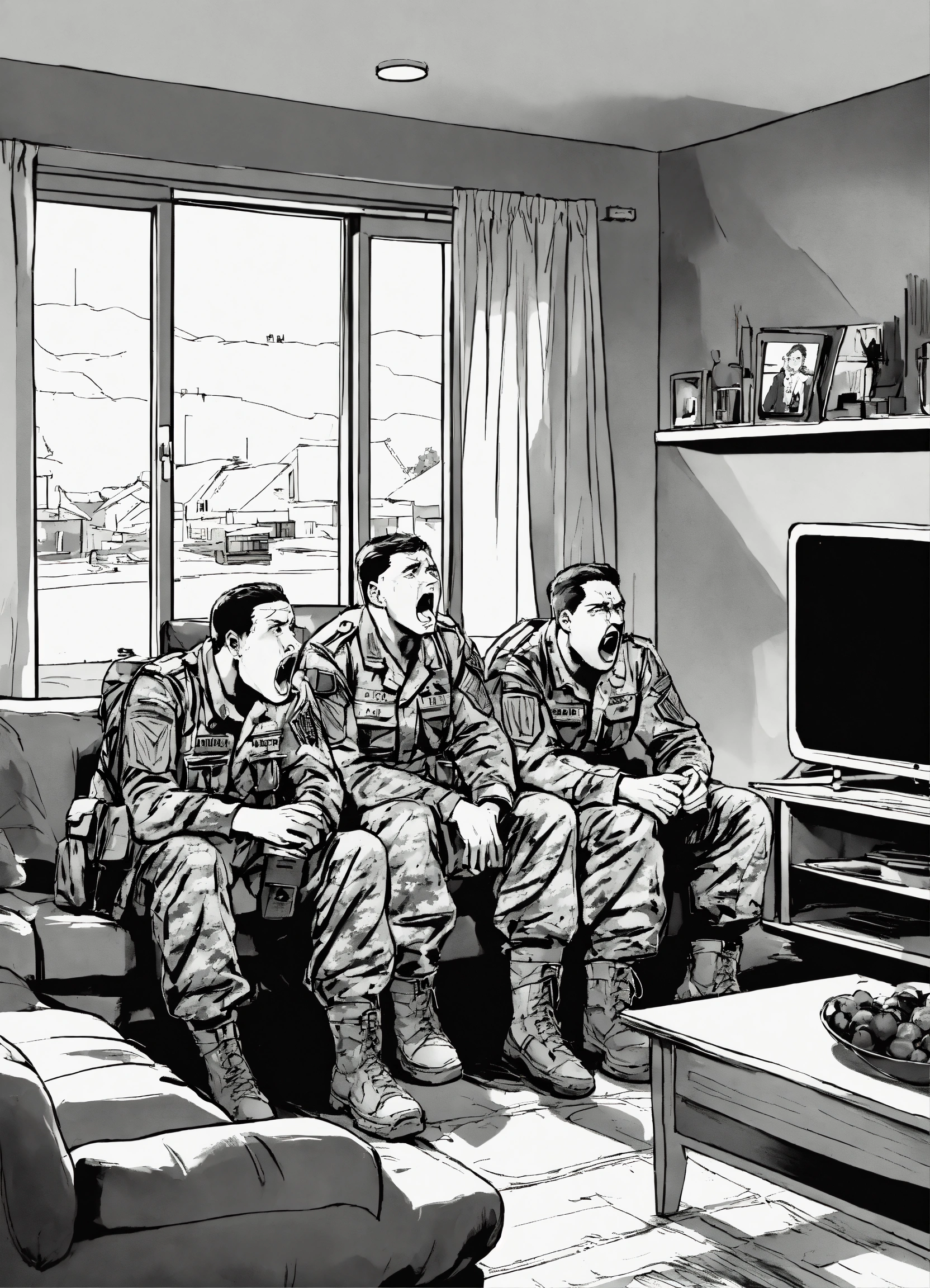Black and white illustration of male soldiers watching tv, sitting in living room, shocked, screaming, sitting and standing, enraged, emotional