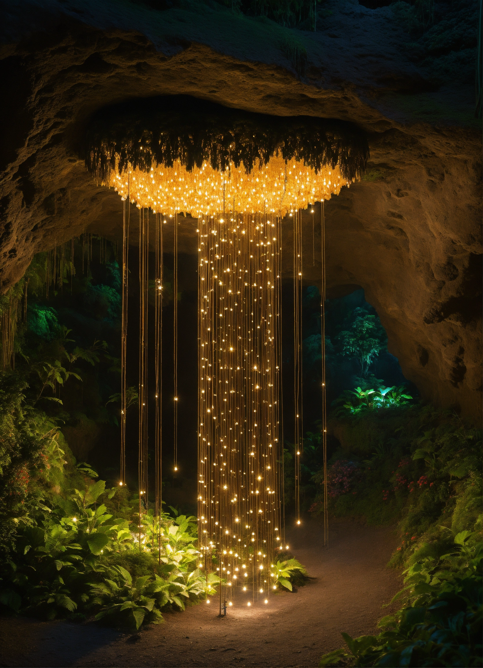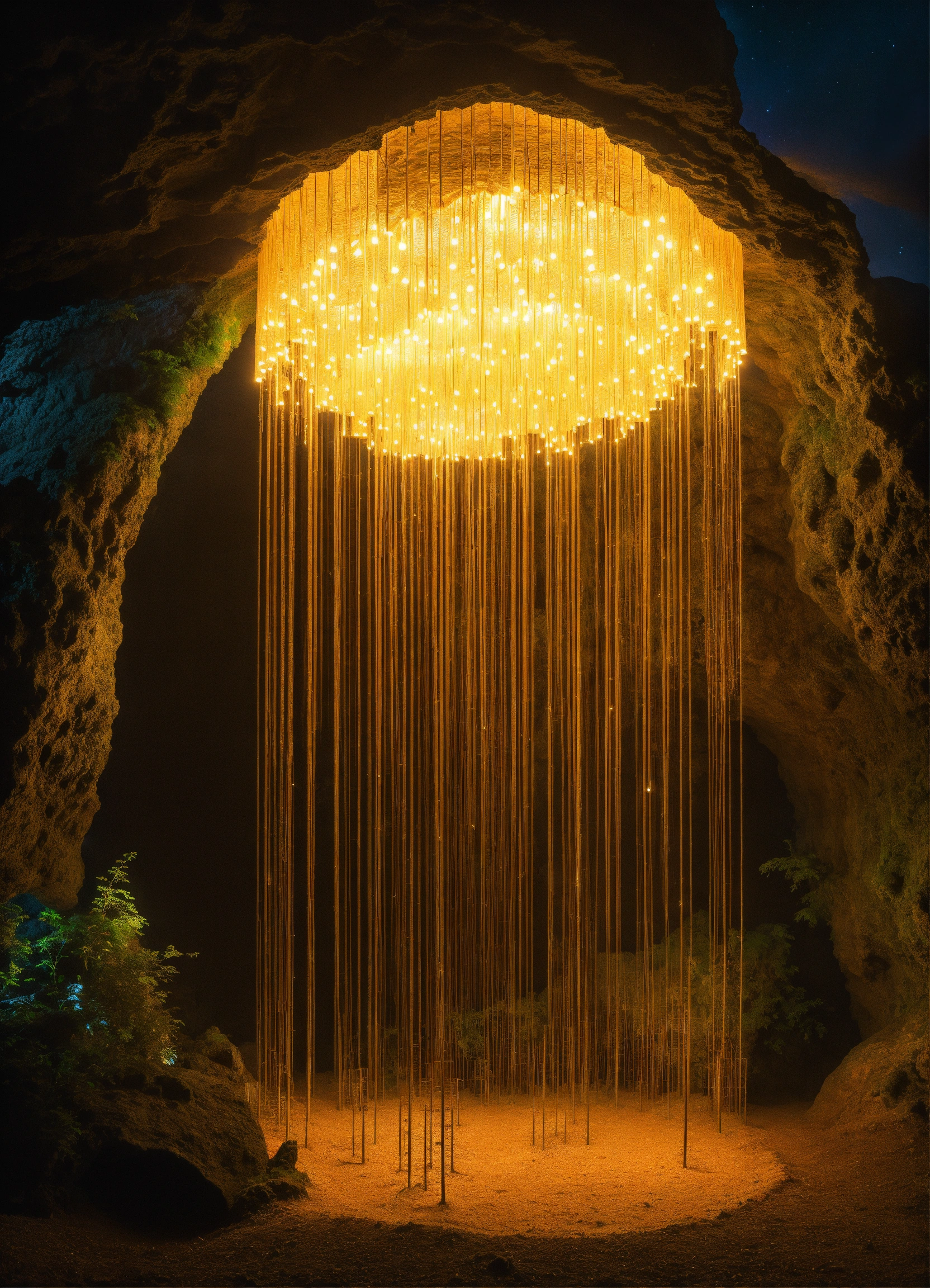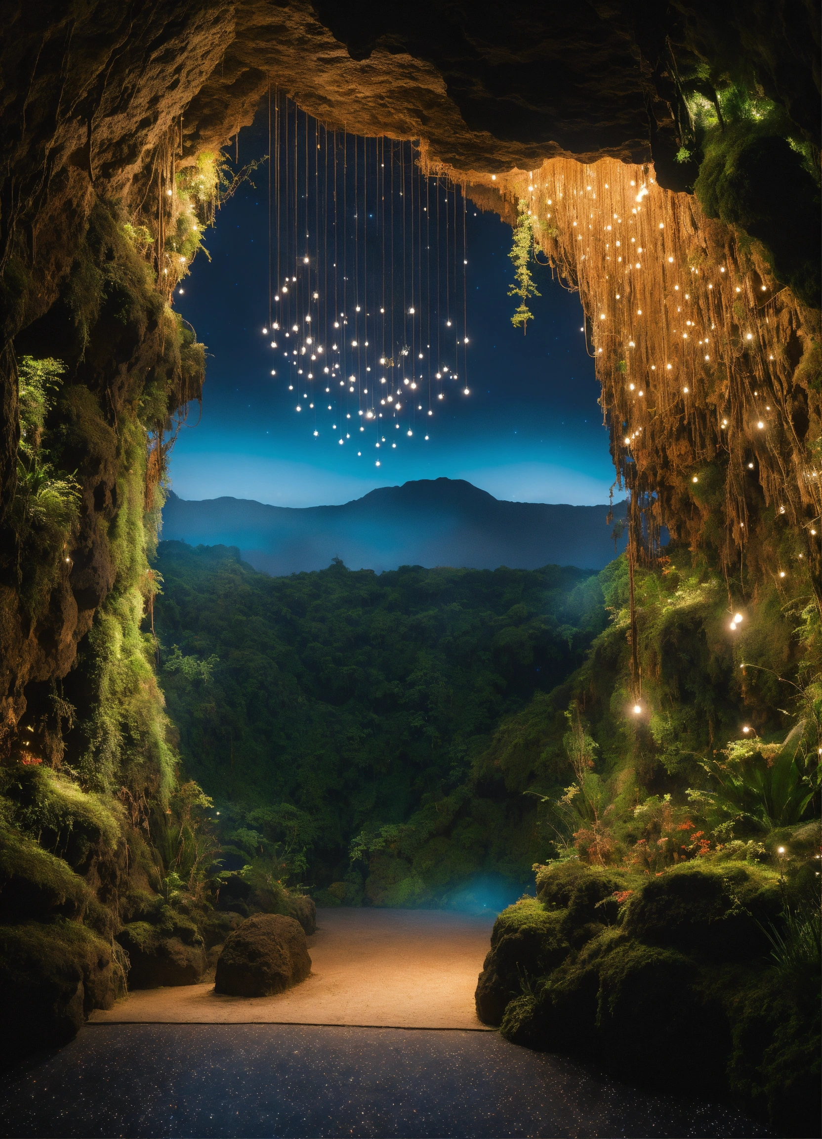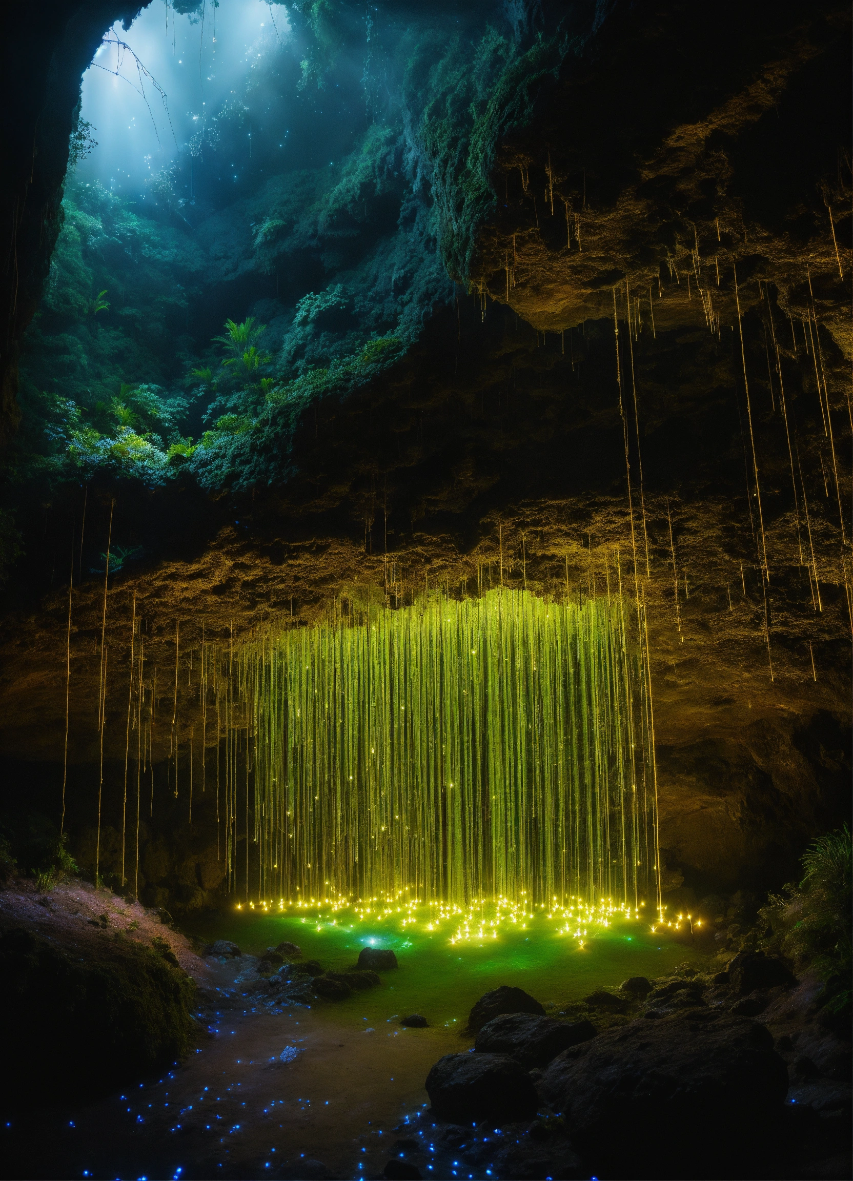 Draw the waitomo glowworm cave with a dark space and numerous glowworms shining brightly, like a stunning gigantic chandelier. create it in a hyper-realistic style, with sharp detail and lifelike precision.