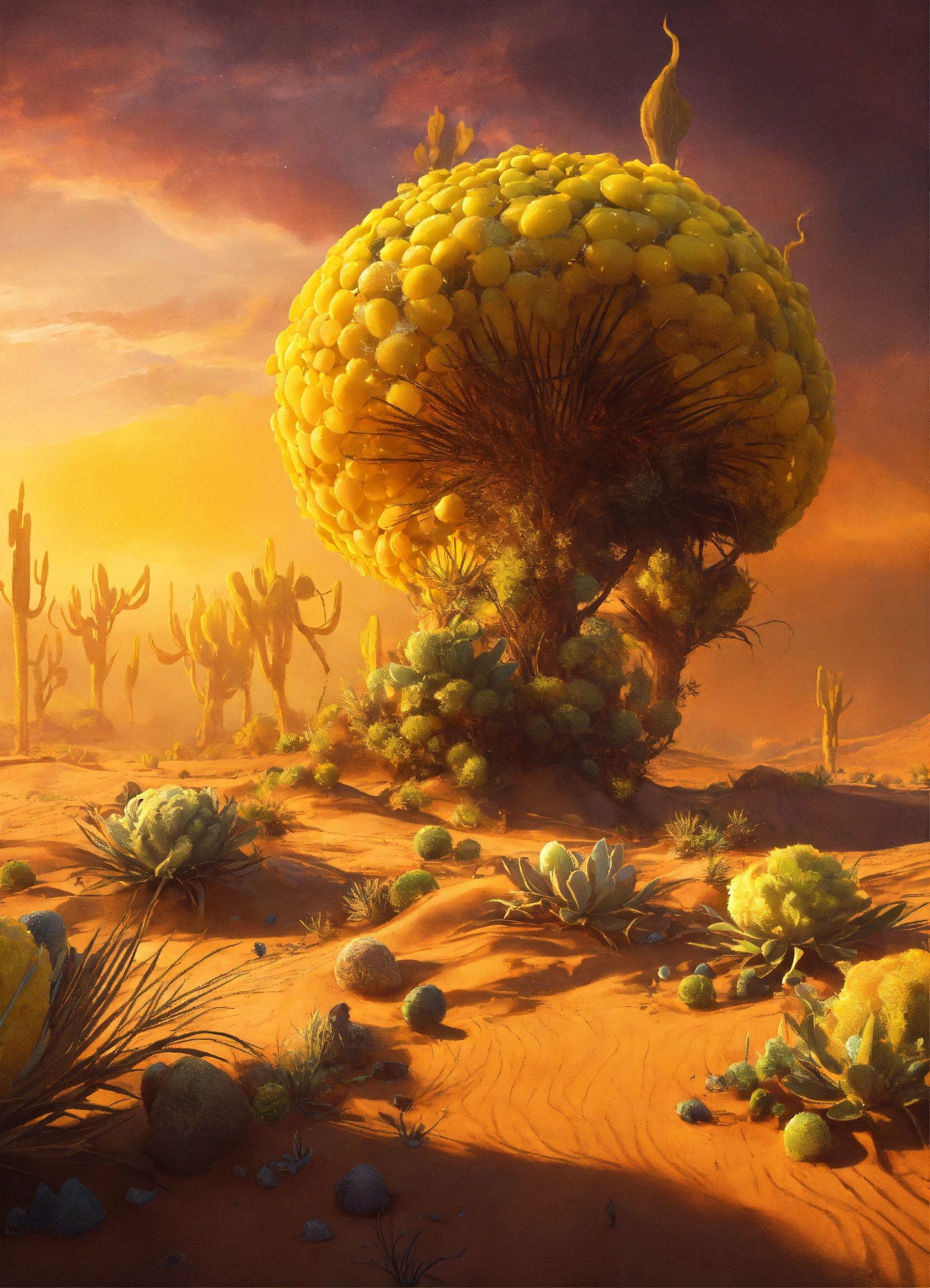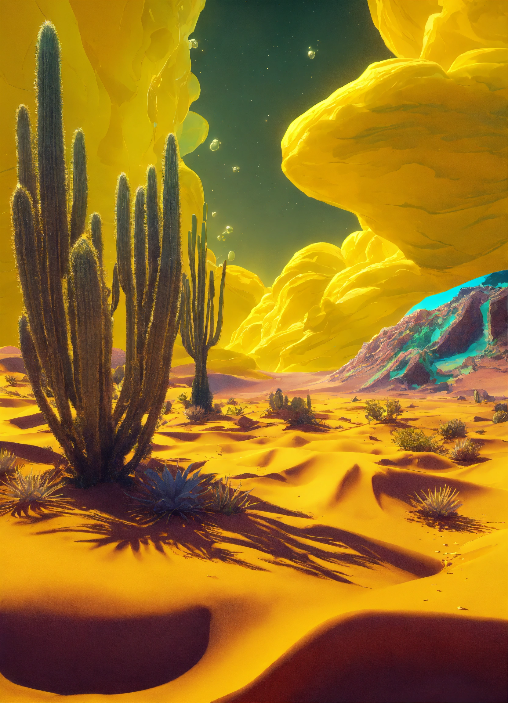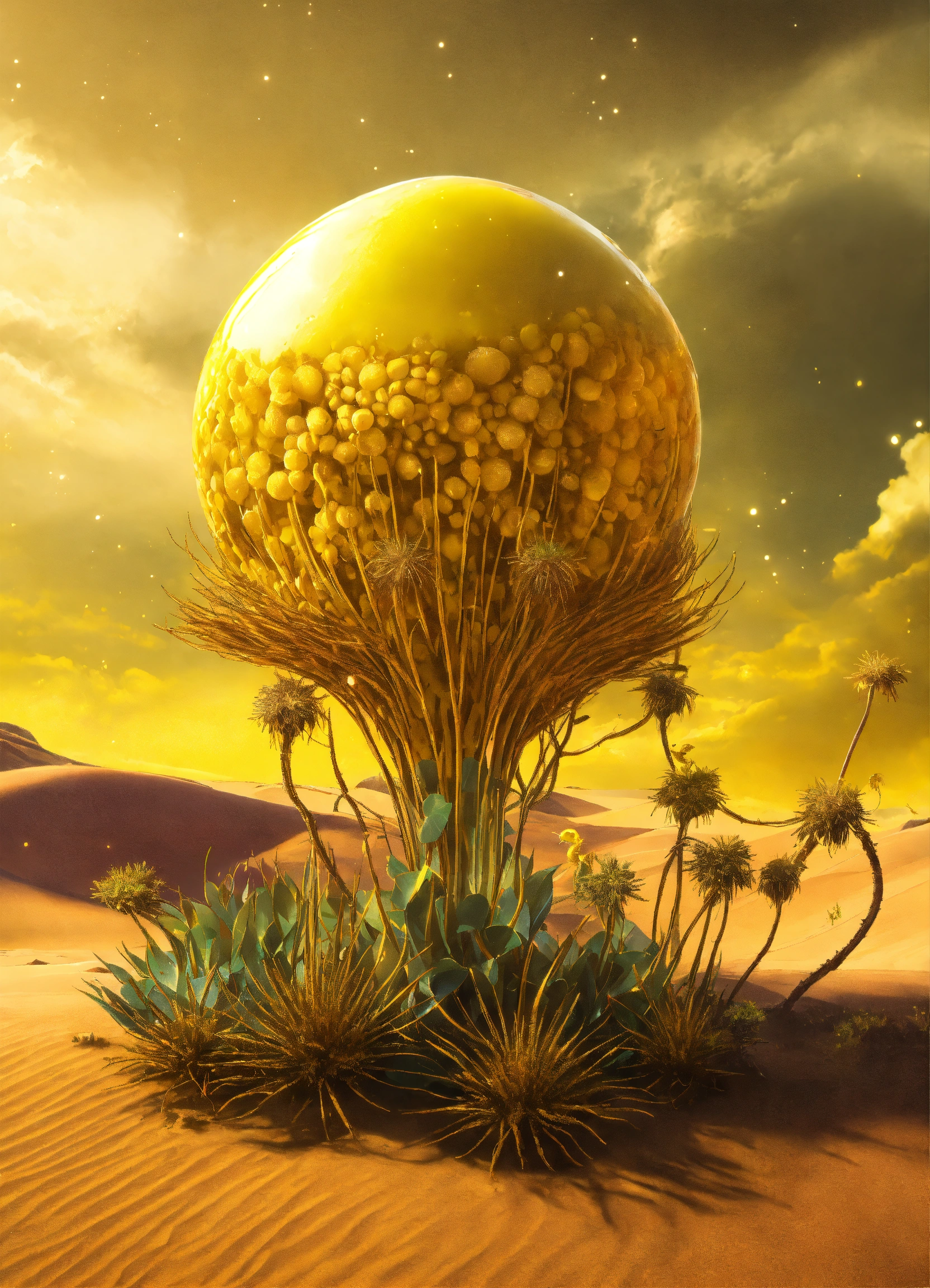 Create a surreal desert with alien plants, the plants are shaped like canary_yellow_perlwhite, are partially transparent with tentacles and spines, in the sand laying pearls, backdrop is the storm of cosmic dust and cosmic clouds the heaven is dark colored unreal engine 6 color palette knives painting oel on canvas conzeptart, high qualty, cinema_stil, wide shot