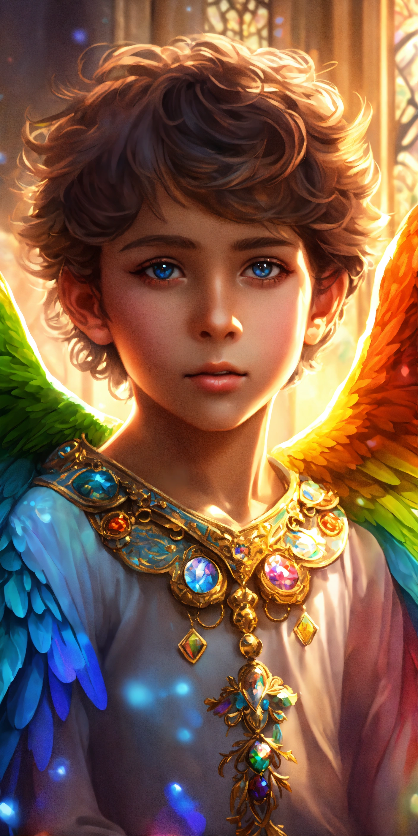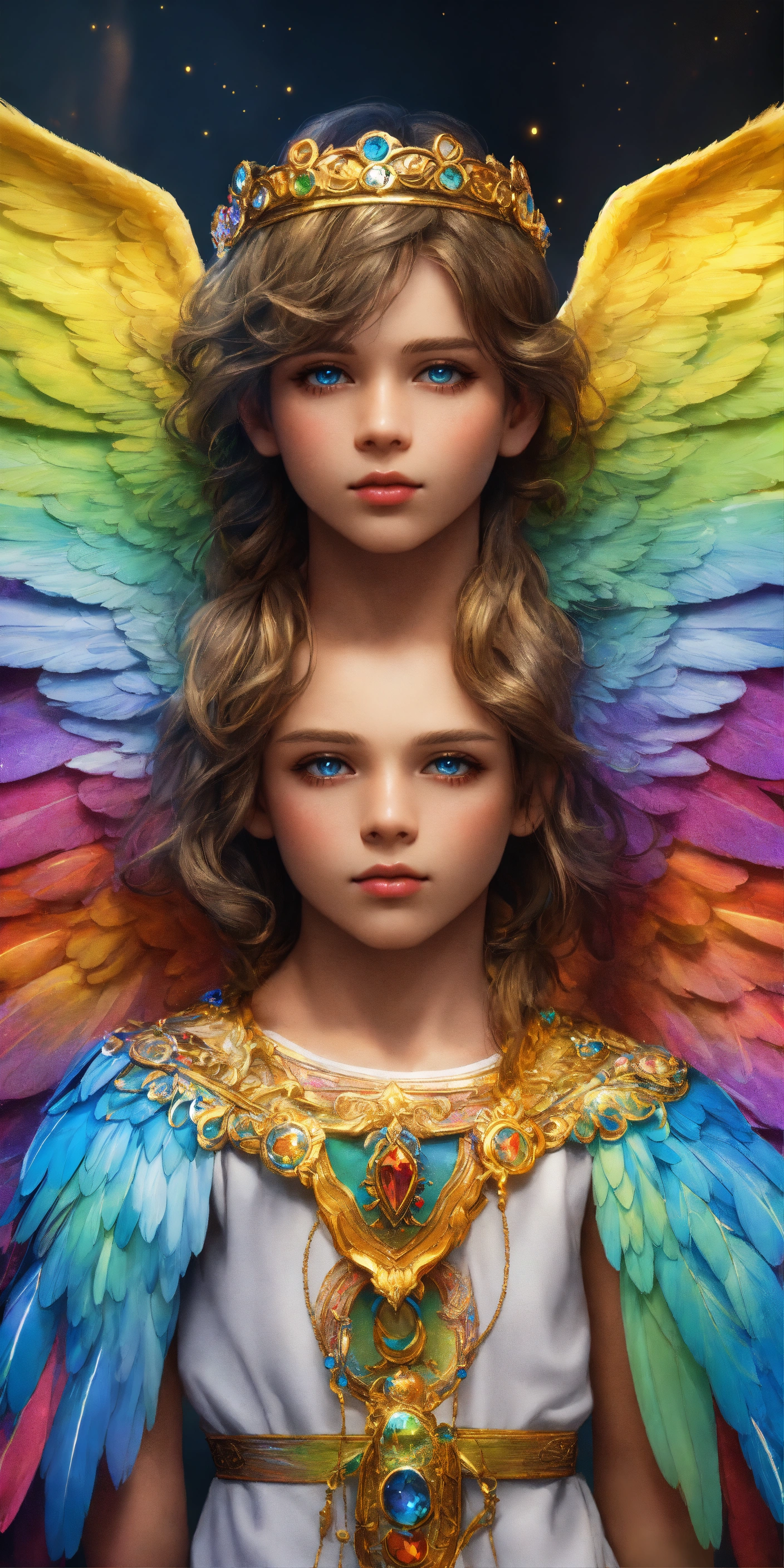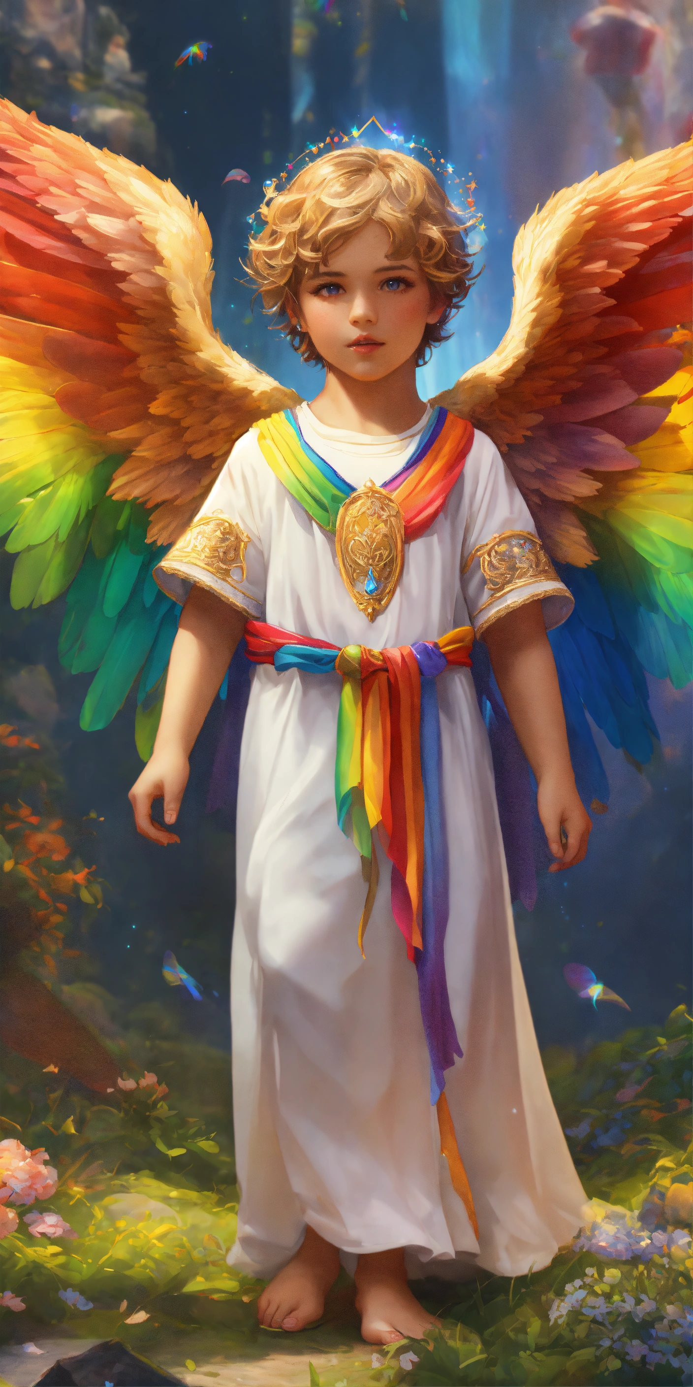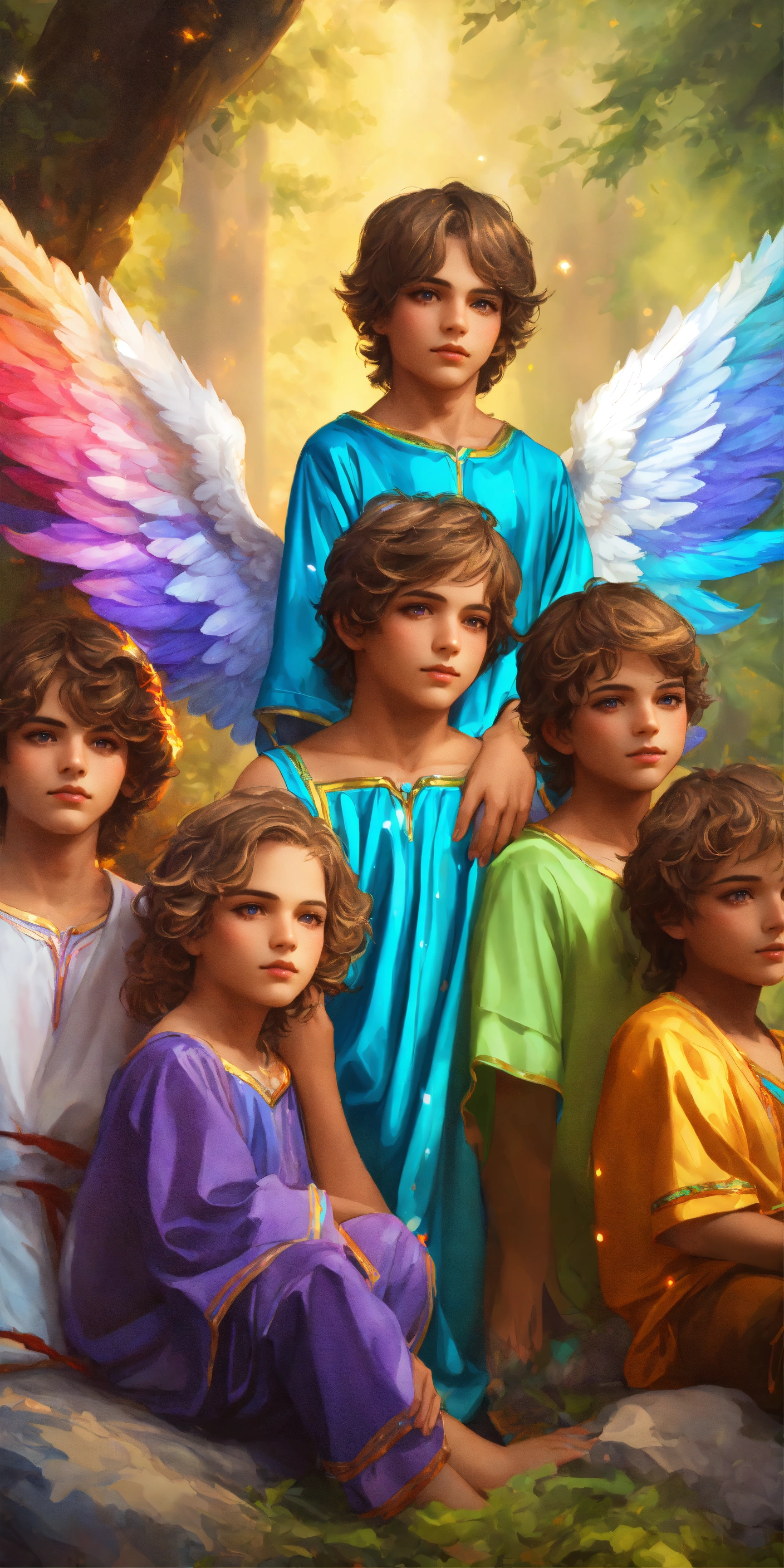 Group of 7 beautiful and perfect angel boys of 8 years with angel wings, detailed and defined rainbow colored angel wings, intricate, highly detailed, digital painting, art station, real, 3d, 7 beautiful and detailed angel boys of 8 years old, all 7 children have colored wings, rainbow wings with luminous sparkles, large and detailed wings, clear eyes and deep gaze, faces perfect in beauty and detail, colored tunic and rainbow details, sacred, mystical, sharp focus, cinematic lighting, 8k, 3d, hd, digital illustration, art by artgerm and greg rutkowski, alphonse, cgsociety, high quality and resolution, hyper realistic