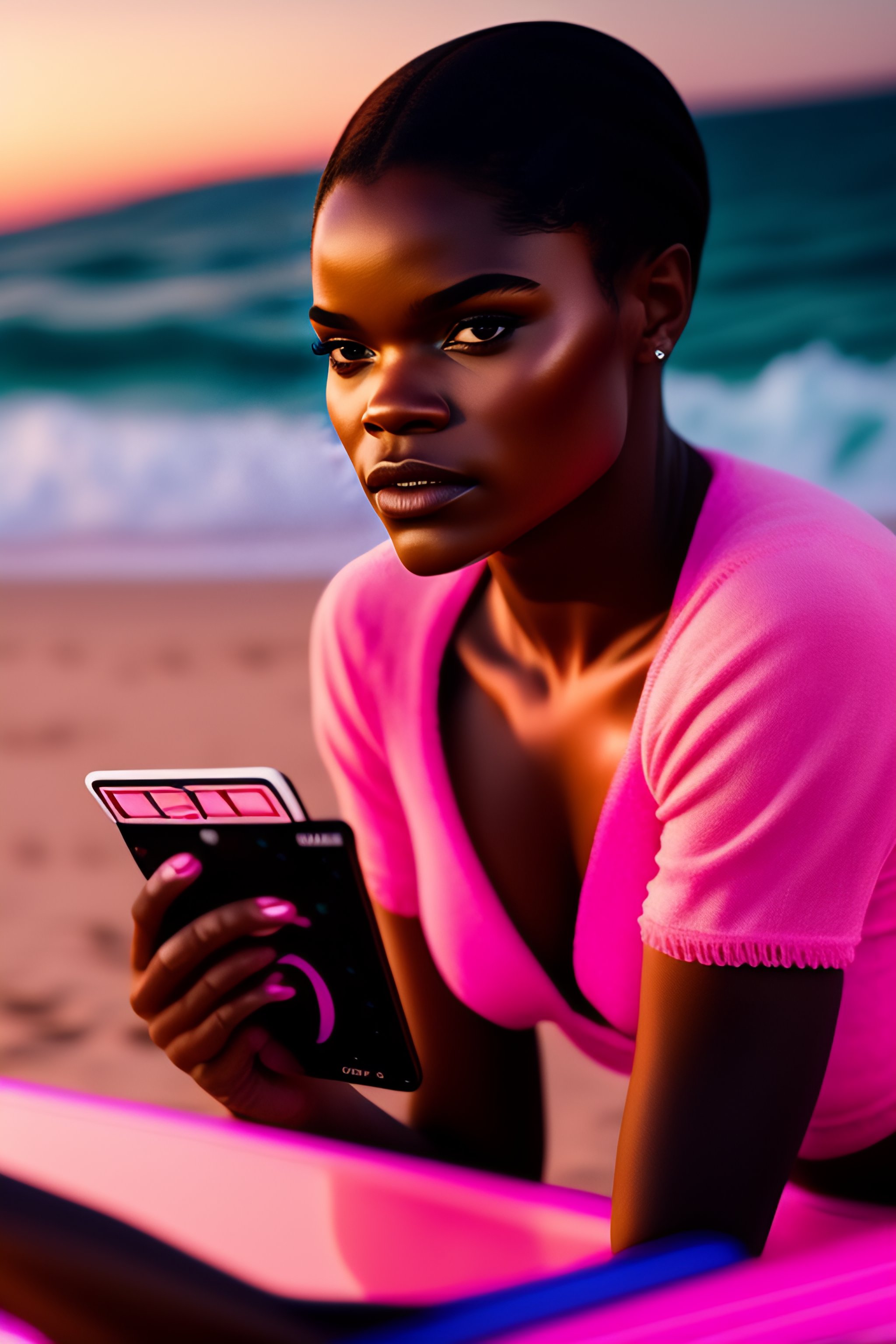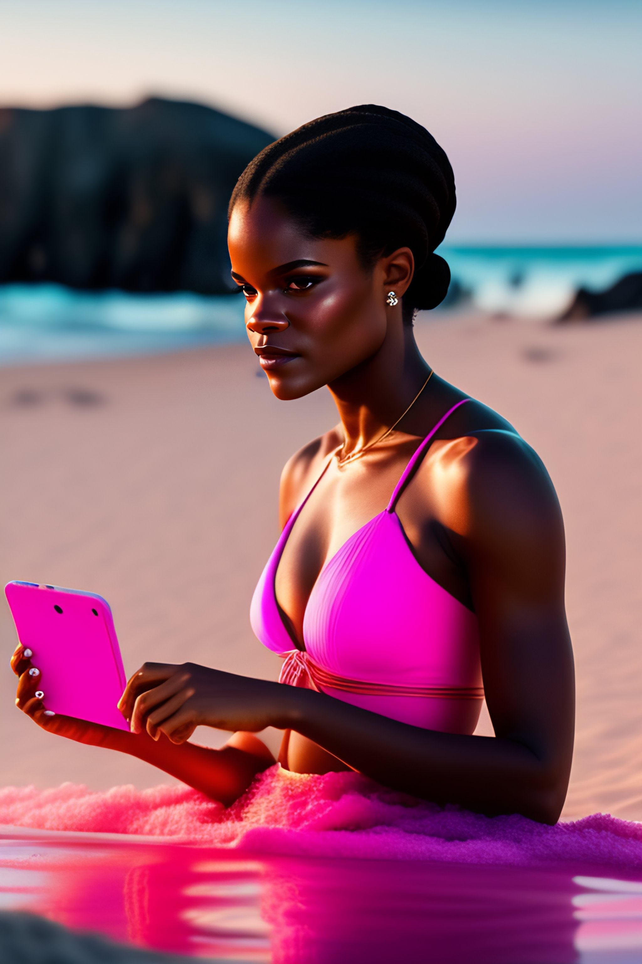 Dream foto of a very beautiful letitia wright playing uno on the beach in a pink bikini, highly detailed, cinematic, dramatic lighting