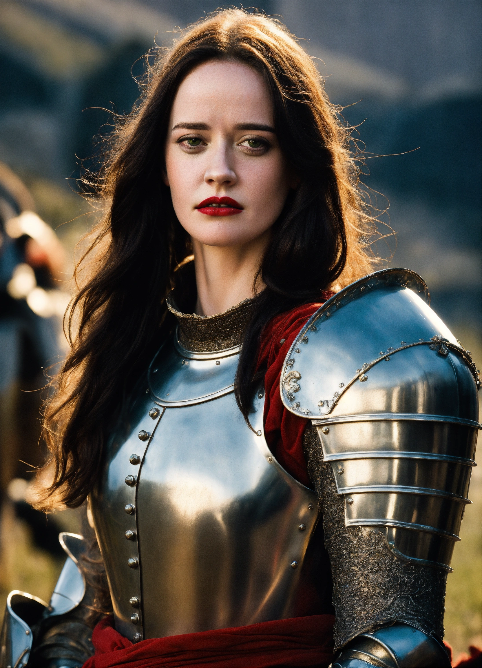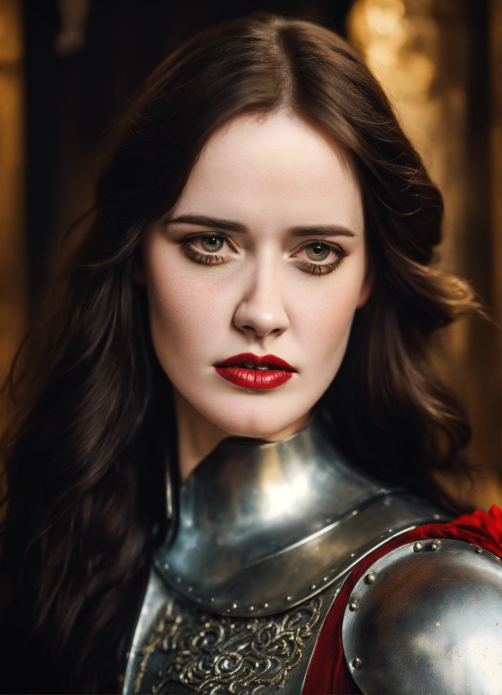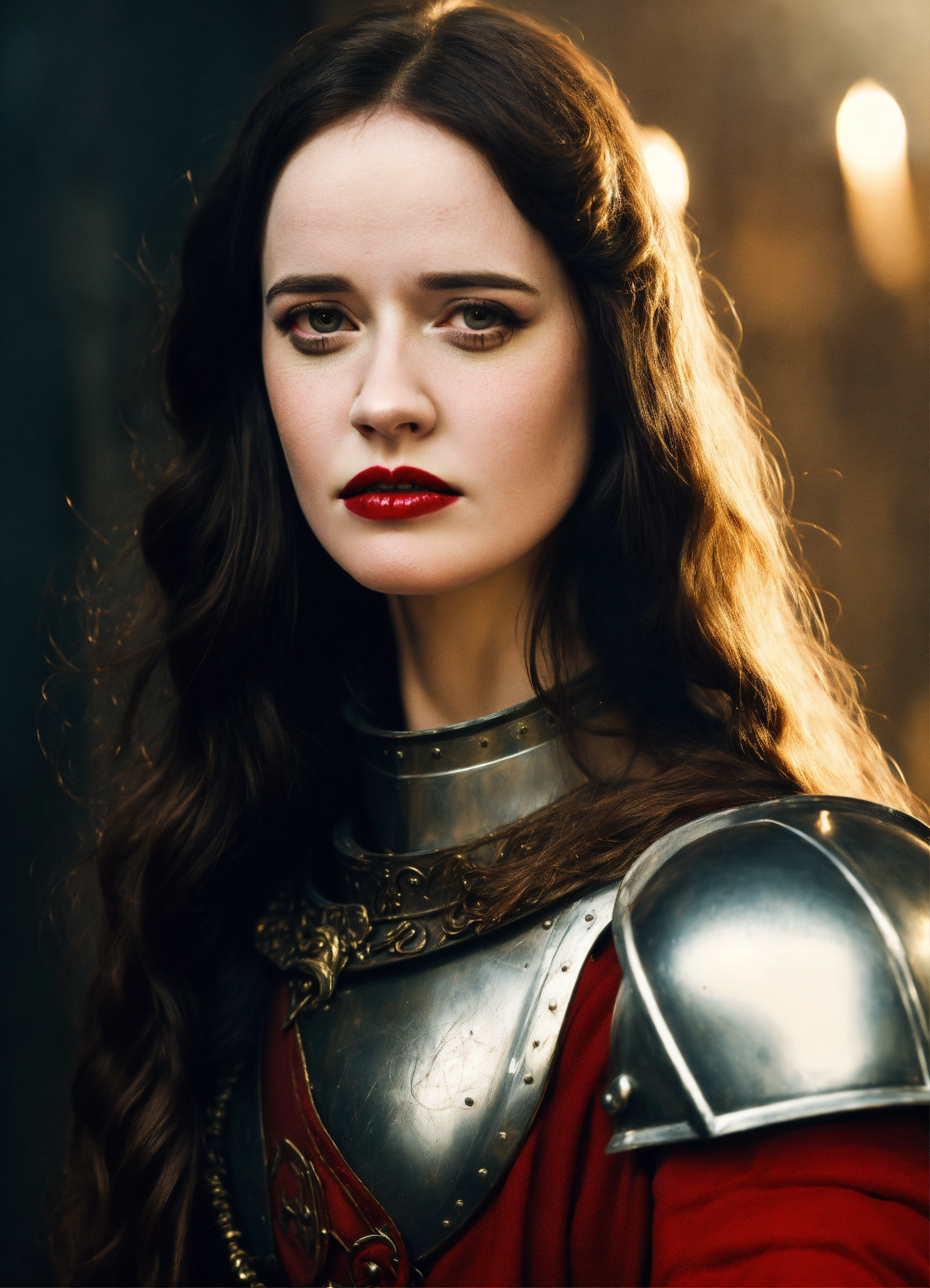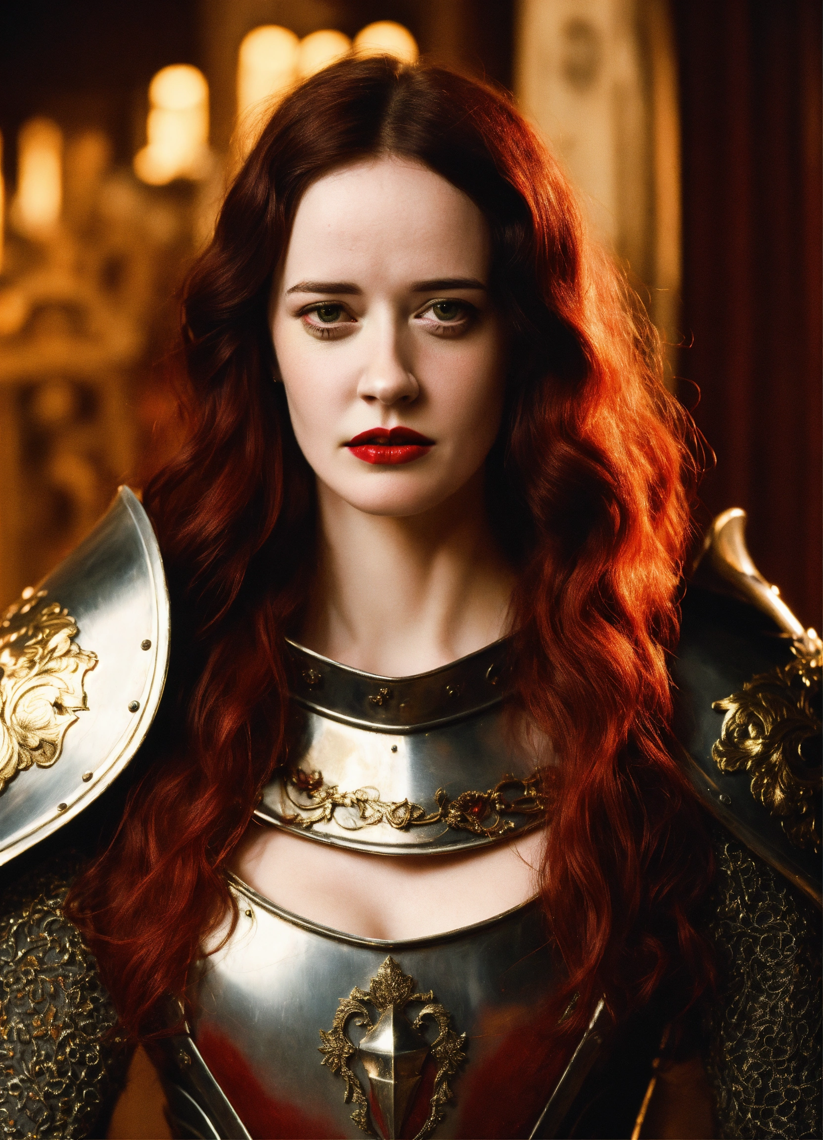 Photo quality portrait of young beautiful eva green as a mediaeval knight in shining armor with flowing hair, red lips and a stern expression