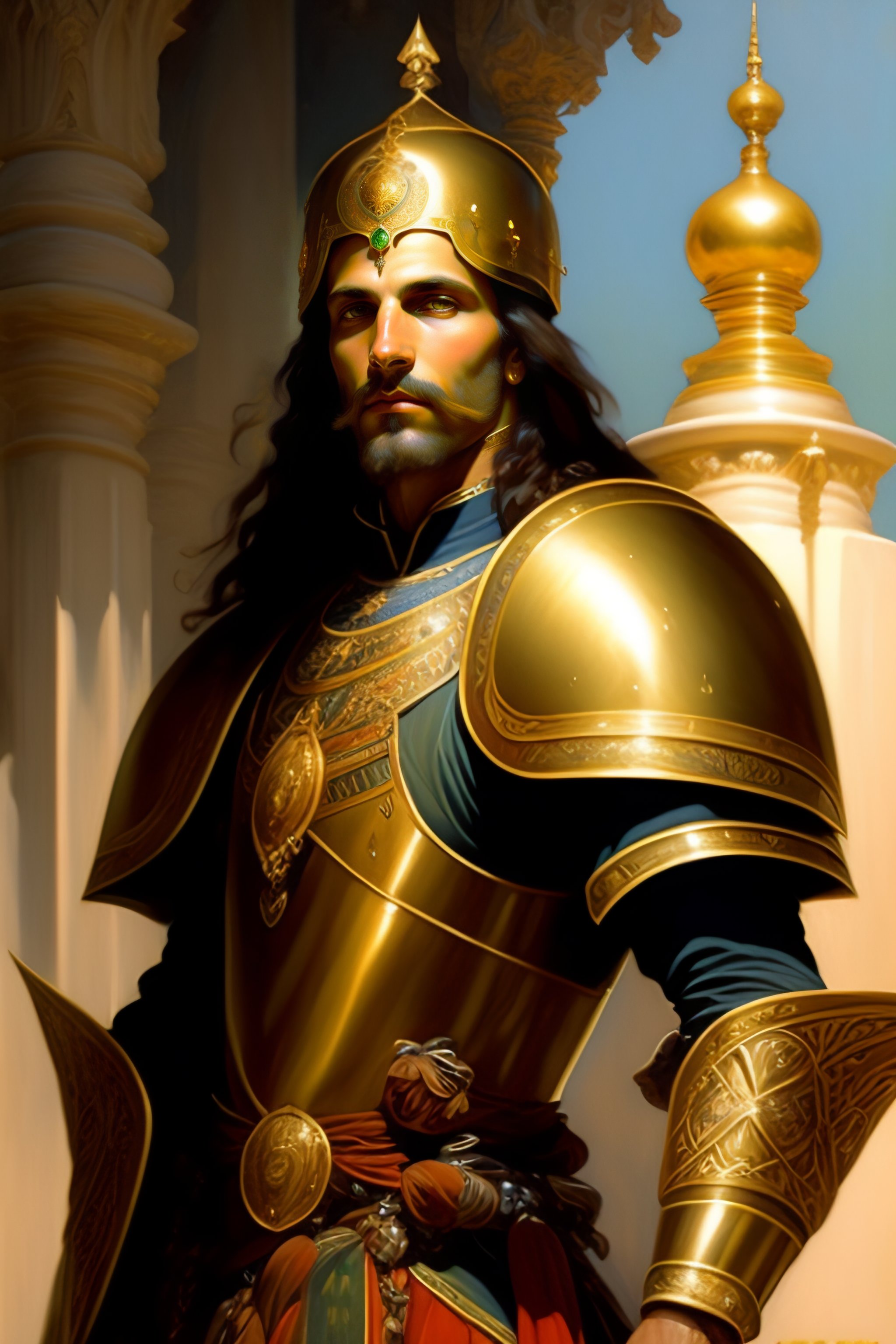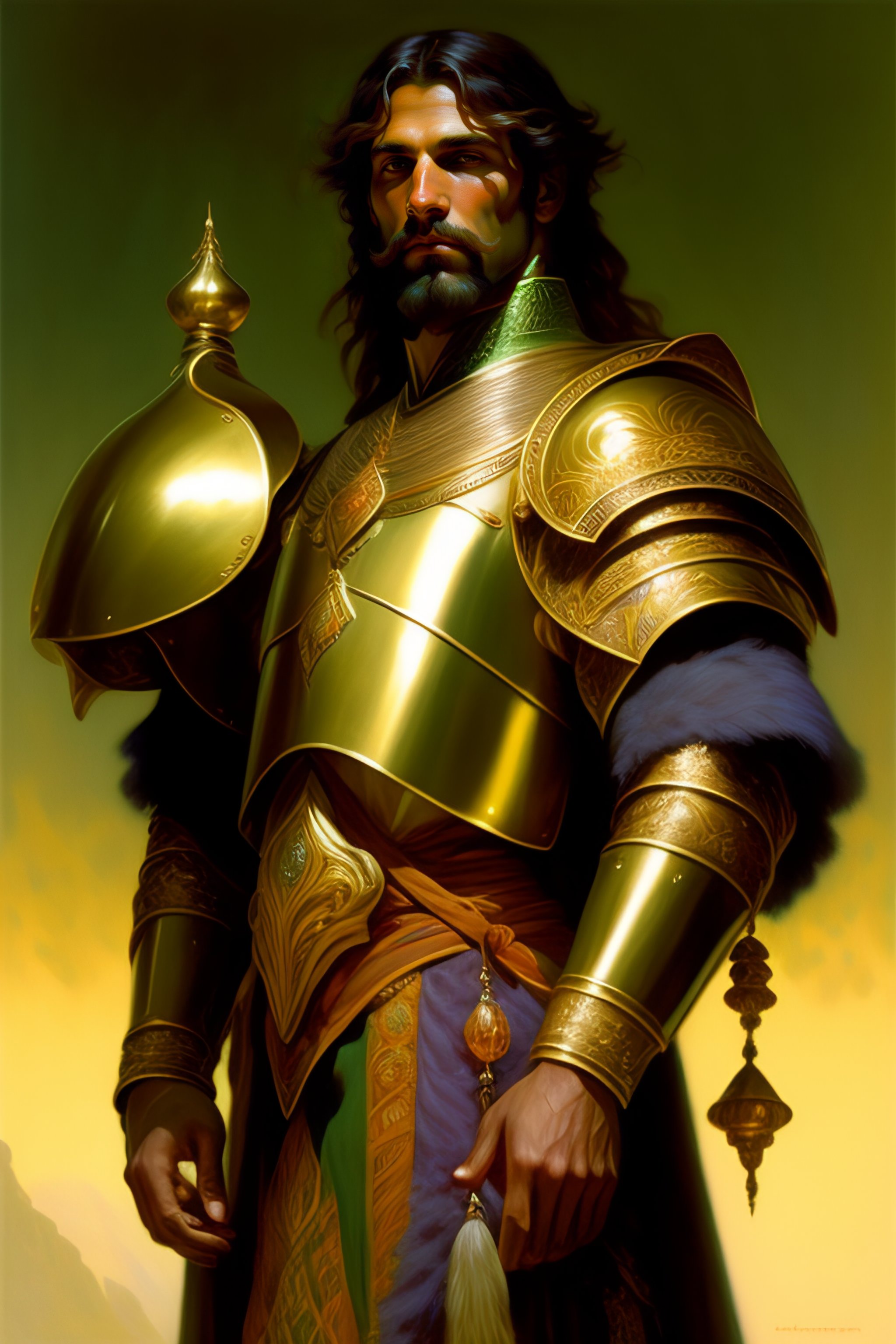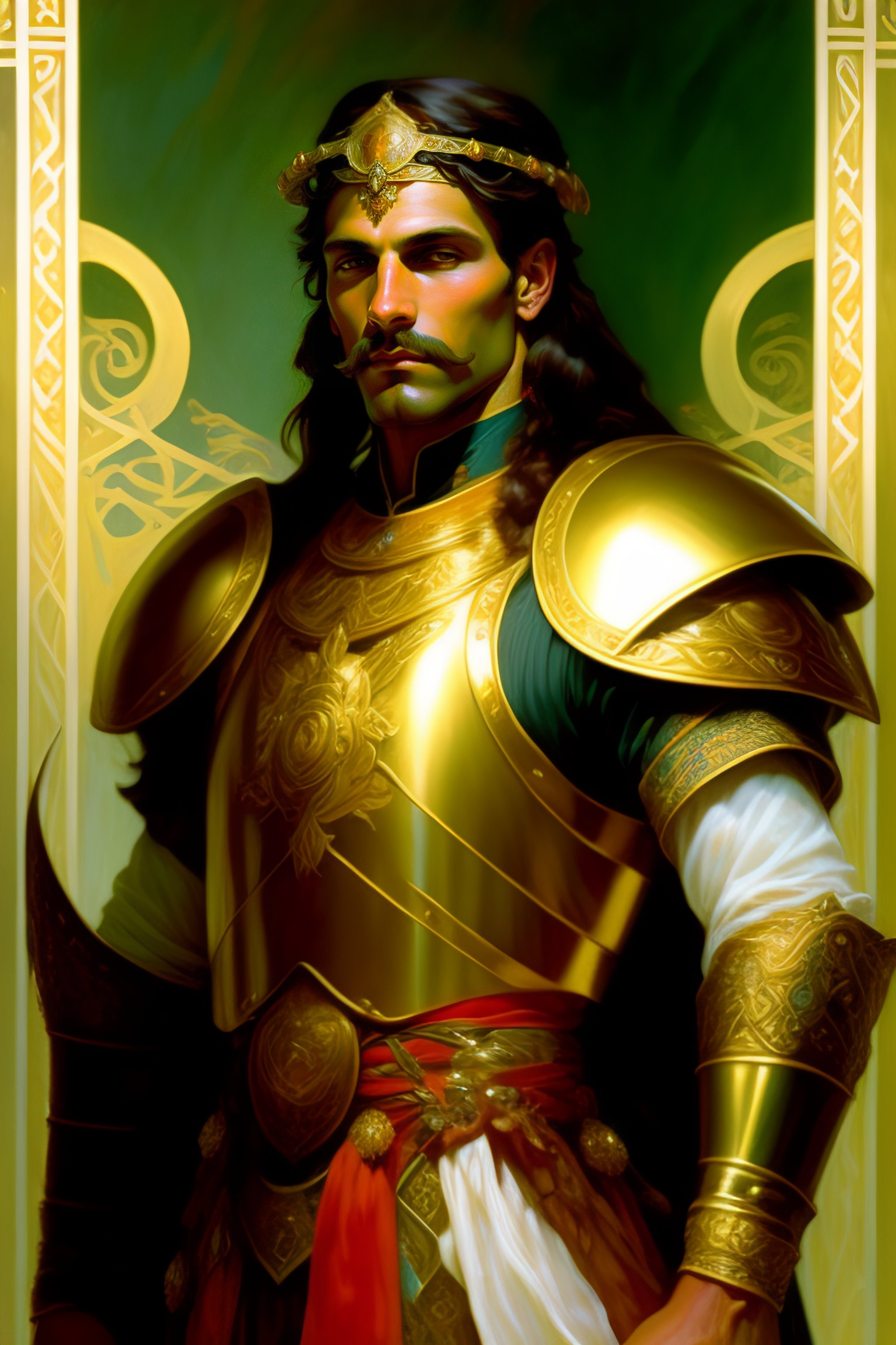 Full body portrait of a male israeli warrior medium length brown hair and a very highly detailed face wearing elegant golden plate mail armor with green and white accents, holding a tall tower shield and a long flintlock pistol, highly detailed, digital fantasy painting, artstation, cgsociety, character concept art, sharp focus, illustration, art by michael komarck and greg rutkowski and alphonse mucha