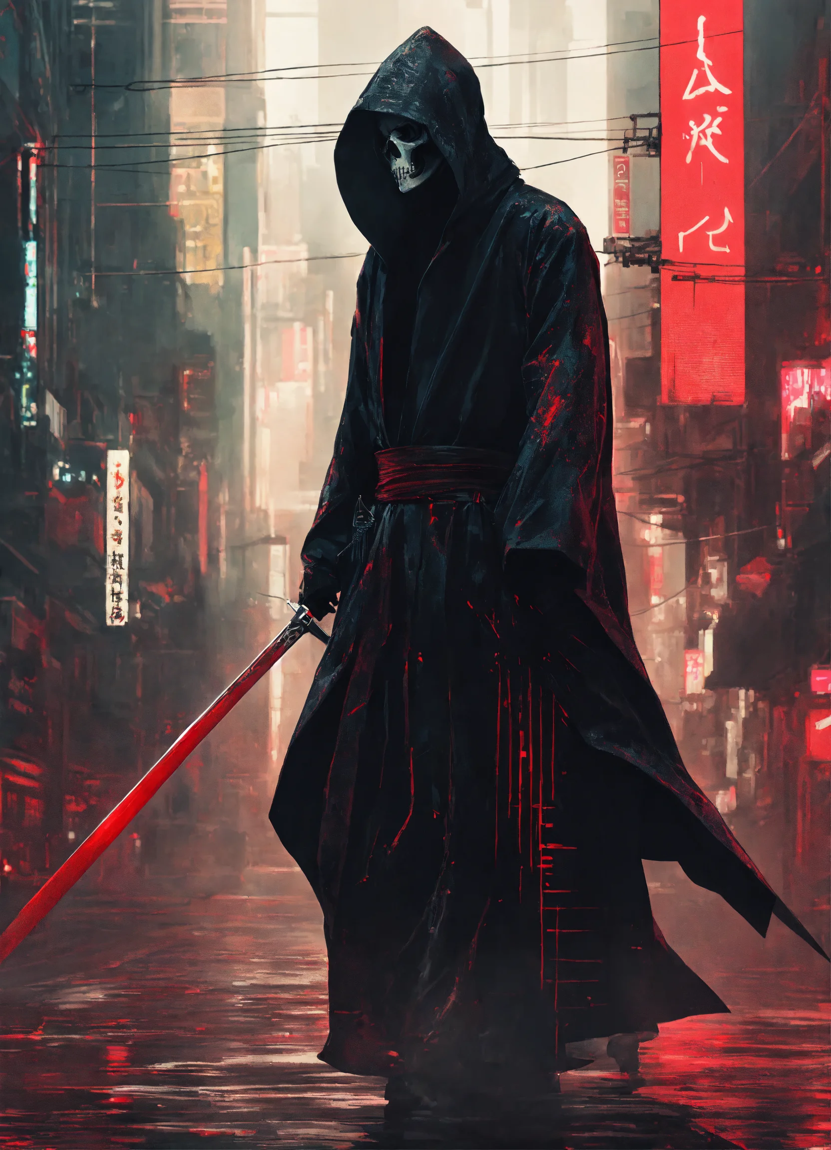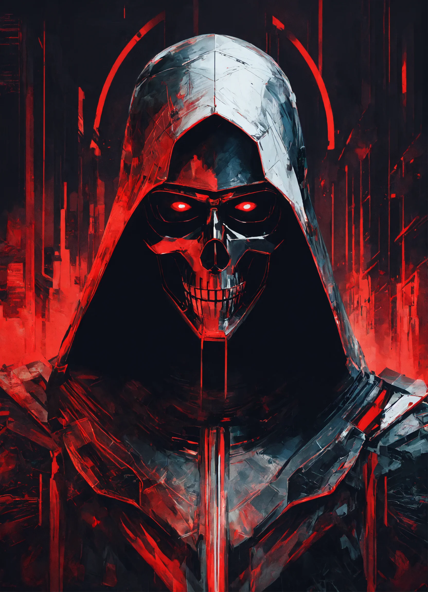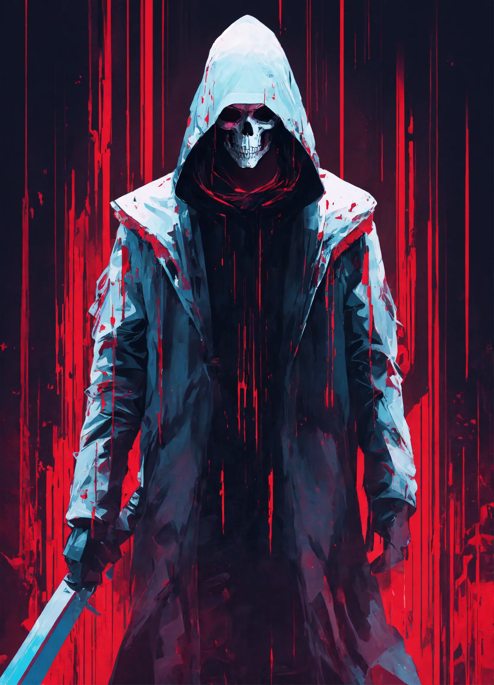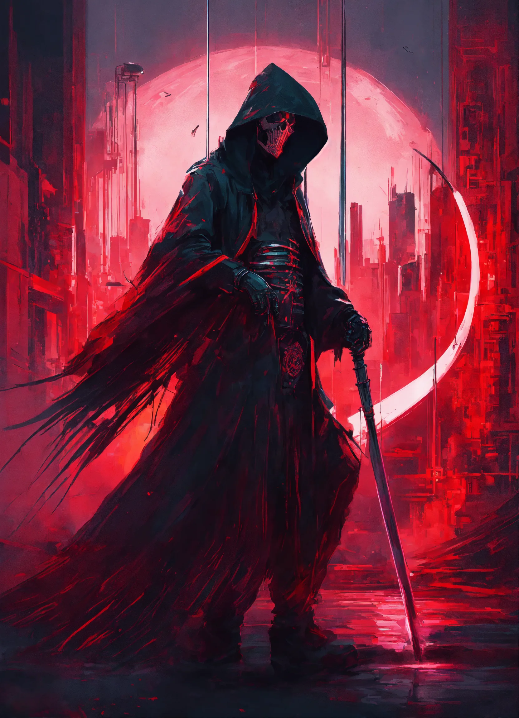 Dark illustration of a grim reaper, style of glitch art, cyberpunk layered imagery with subtle irony, light white and red, angura kei