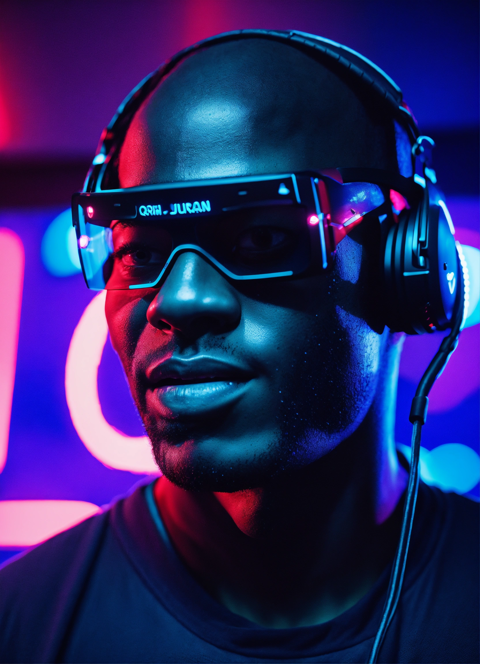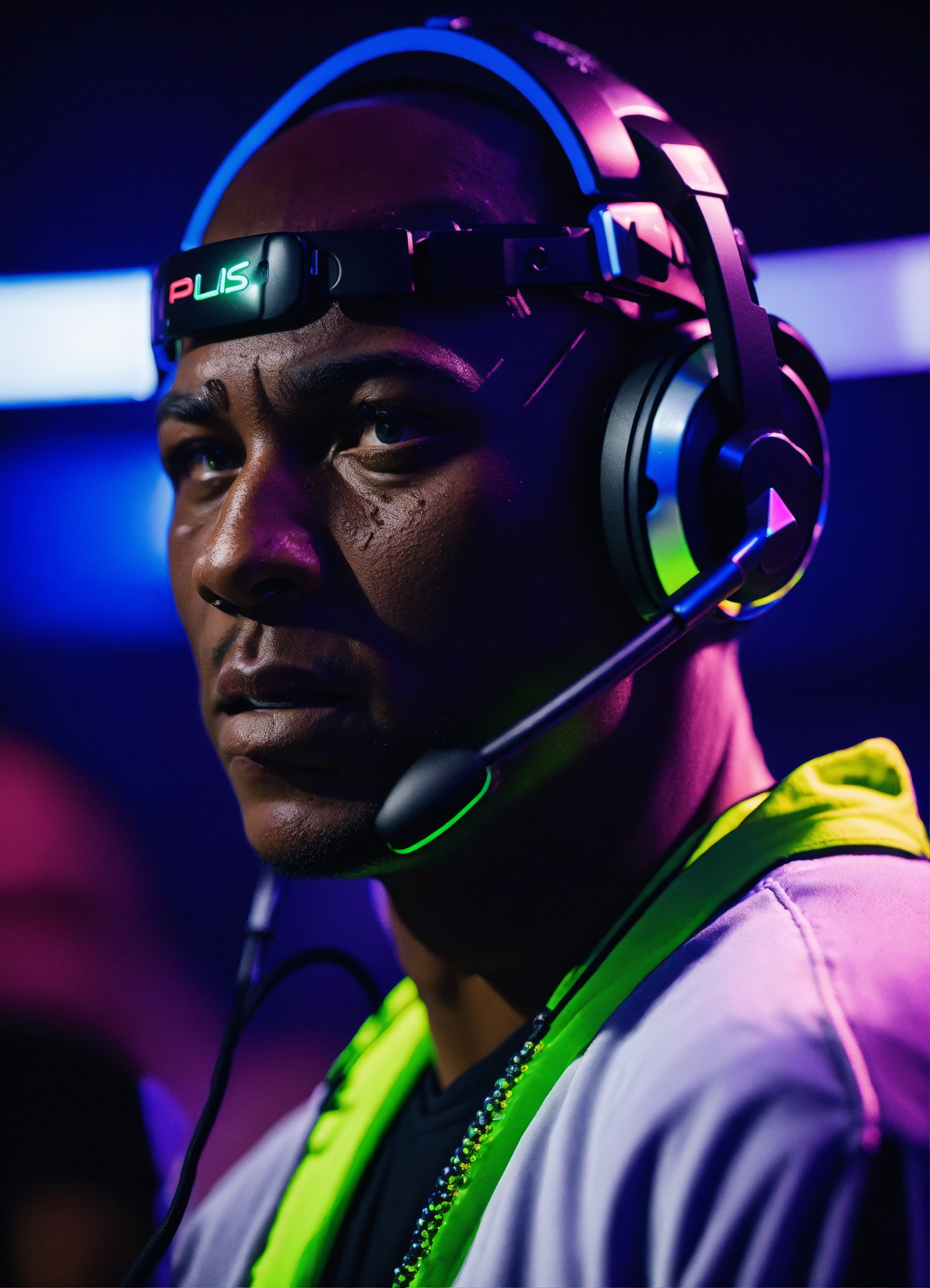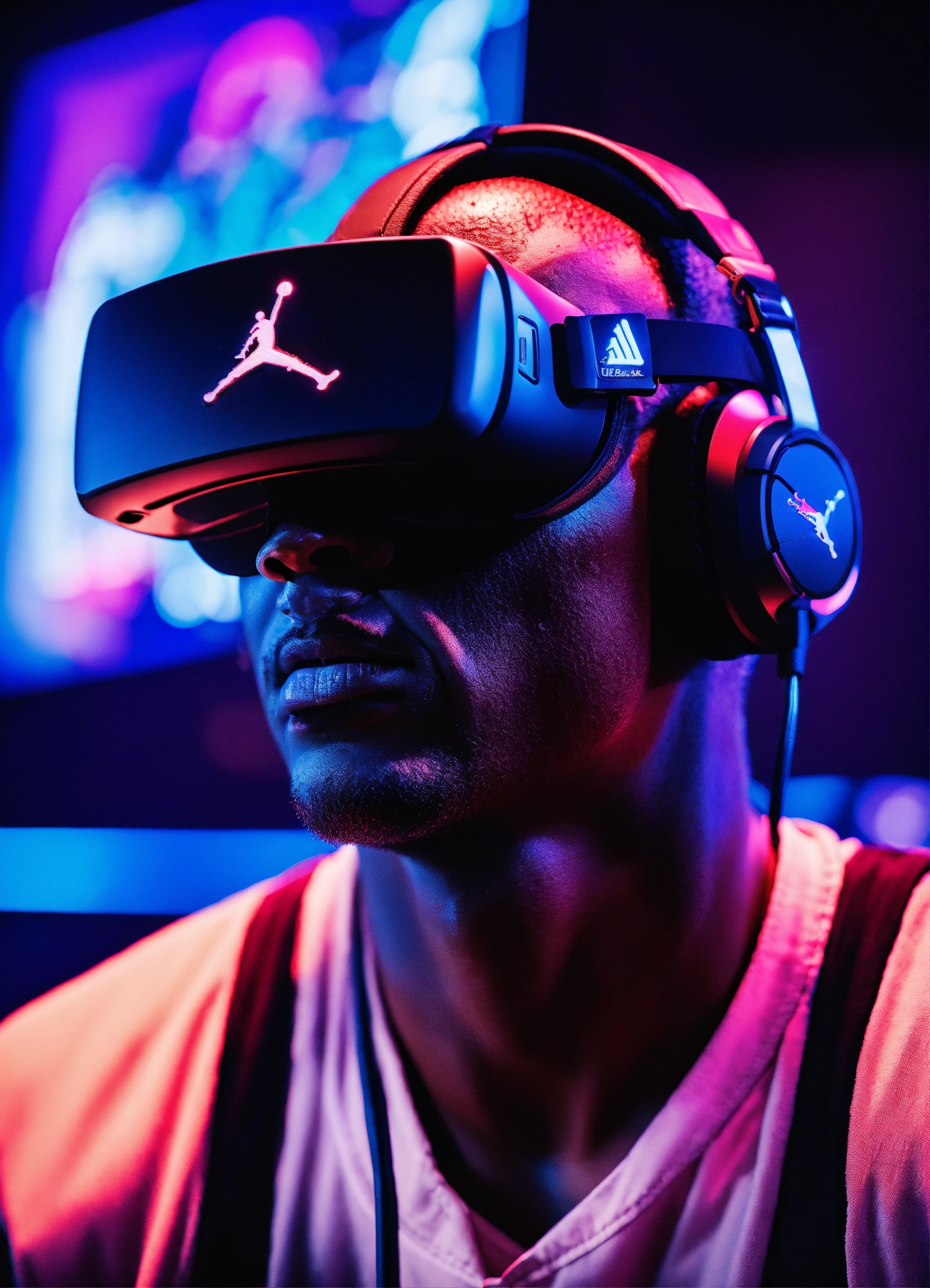 Close-up of michael jordan's face, eyes focused, as he engages in a vr esports match. sweat beads on his forehead, capturing the intensity of the moment. medium ultra-detailed photography. style a blend of sports documentary and futuristic gaming aesthetics. lighting dramatic side-lighting highlighting the contours of his face. colors deep blues and purples, with pops of neon green from the vr interface. composition captured with a nikon d850, 85mm lens, 45.7-megapixel resolution, f/8, iso 100, shutter speed 1/125, with a depth-of-field focusing on jordan's face and the vr headset. --ar 169 --v 5.1 --style raw --q 2 --s 750