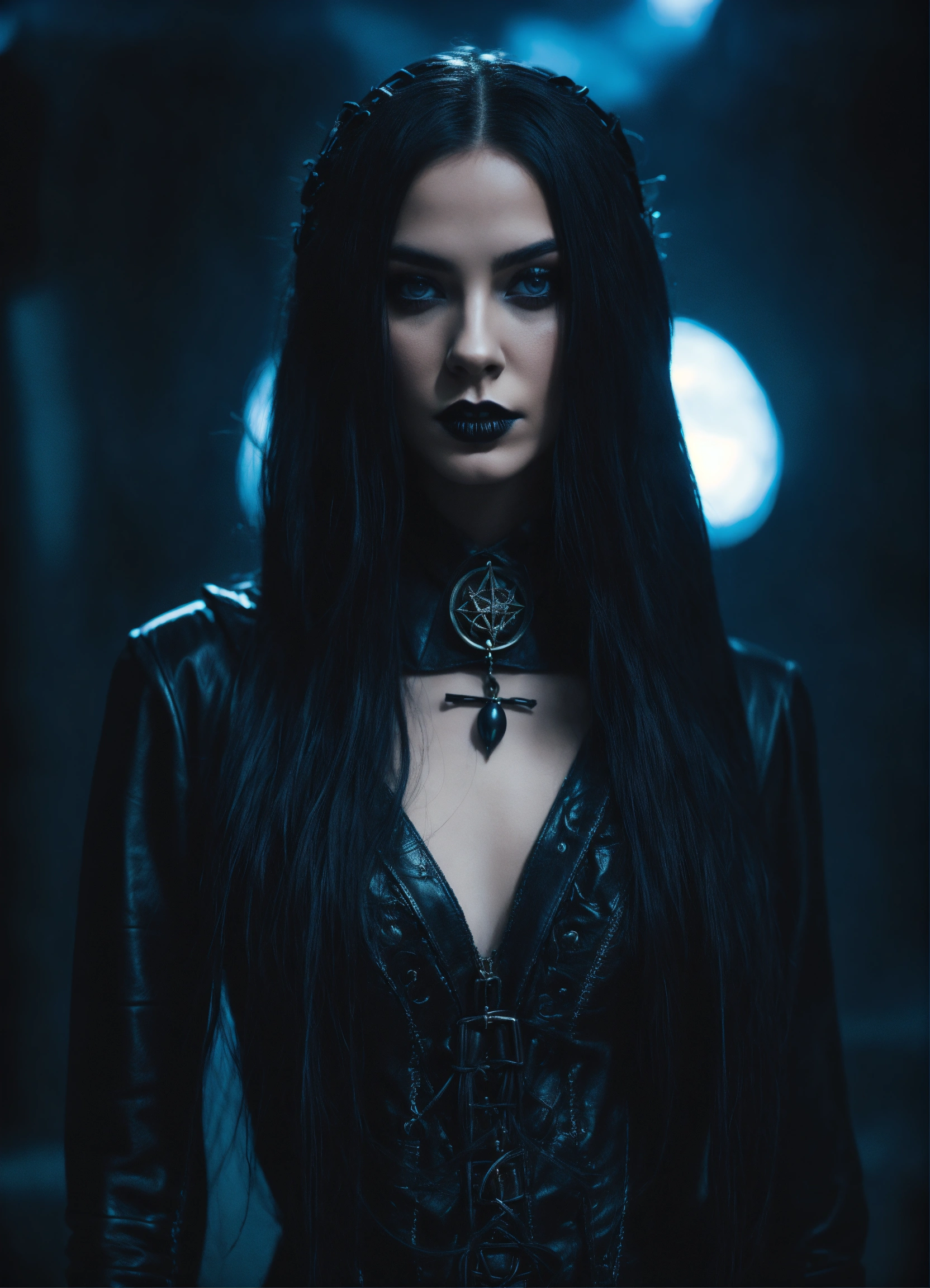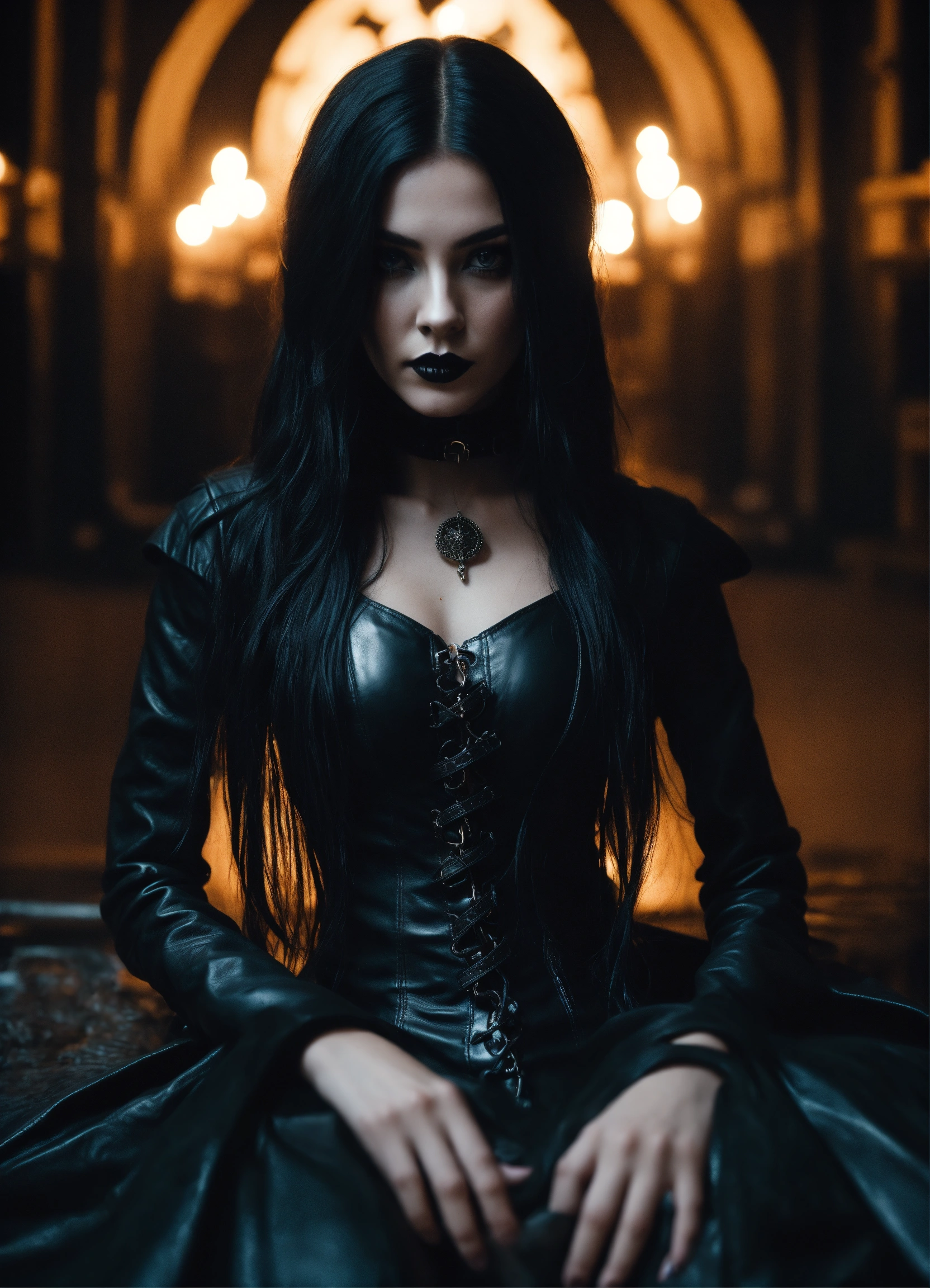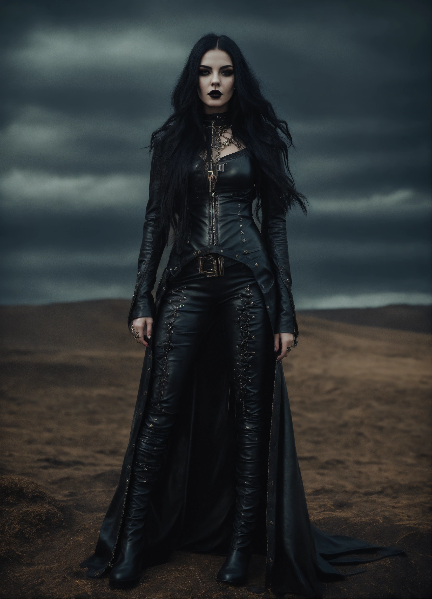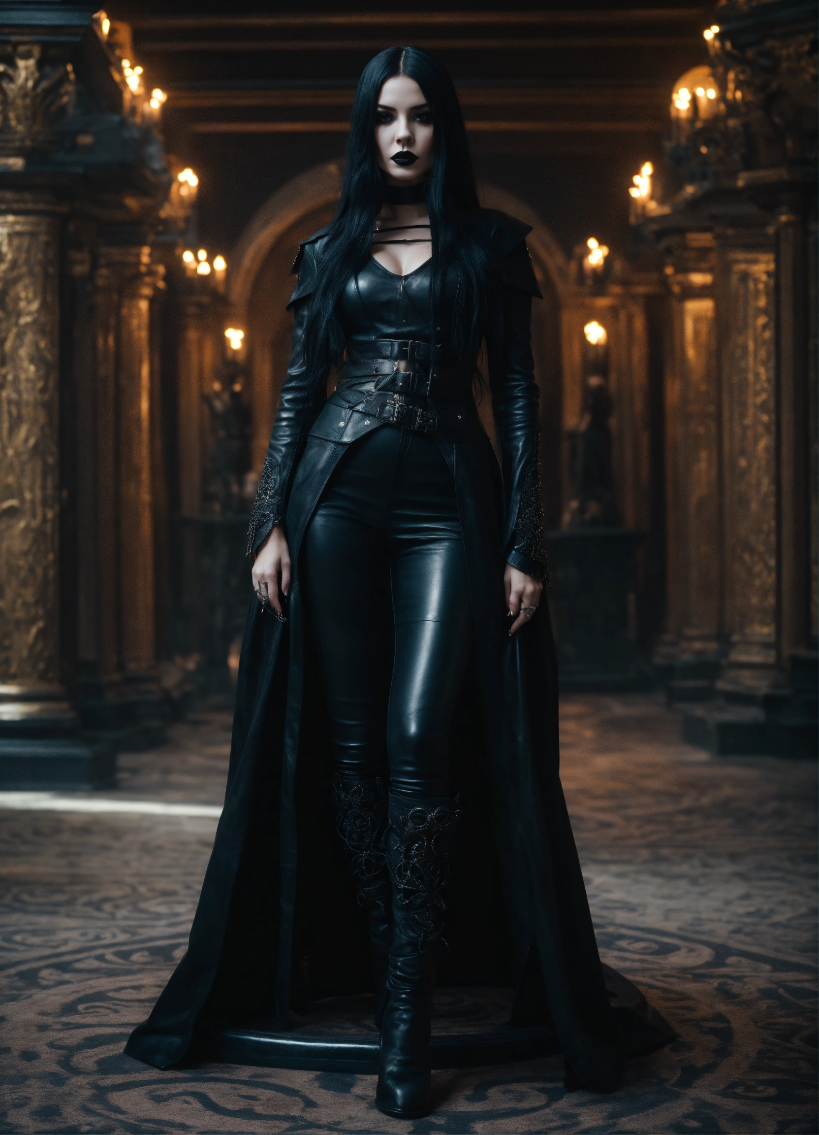 Beautiful extremely goth model young girl wearing black leather, hypnotizing, long hair. dark sorceress who rules the universe all realms & all dimensions, full body, 8k, cinematic light, super sharp