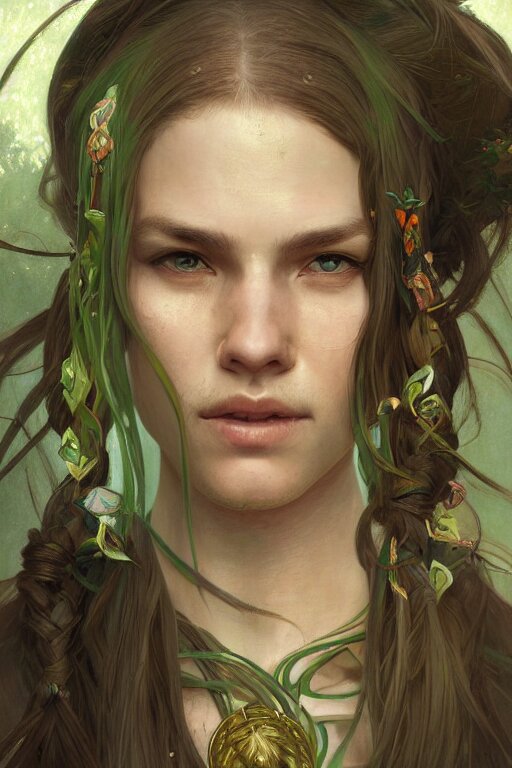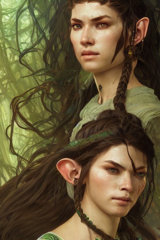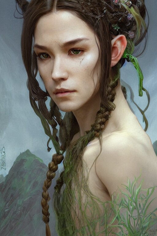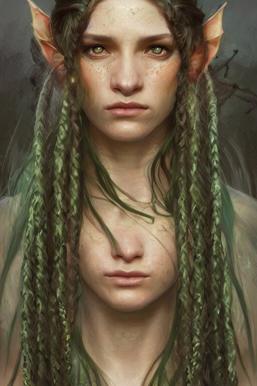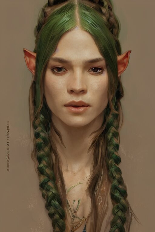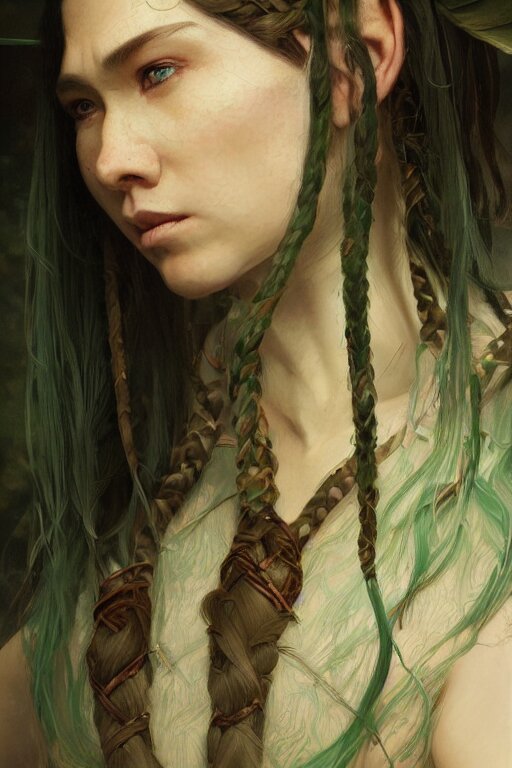 A highly detailed portrait painting of a beautiful healer elf female male, long brown hair with braids and green highlights, long elf ears, asian decent, facial tribal markings, by greg rutkowski and alphonse mucha, sharp focus, matte, concept art, artstation, digital painting