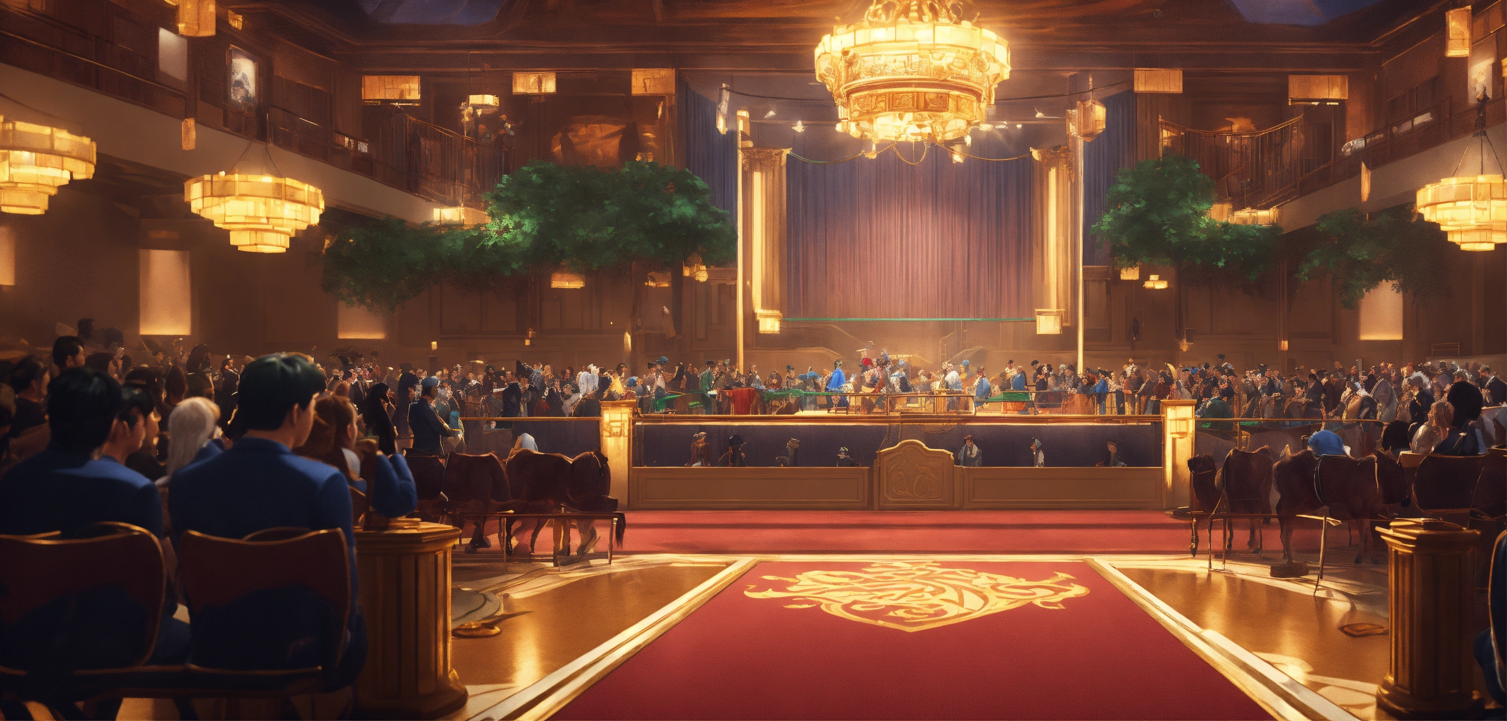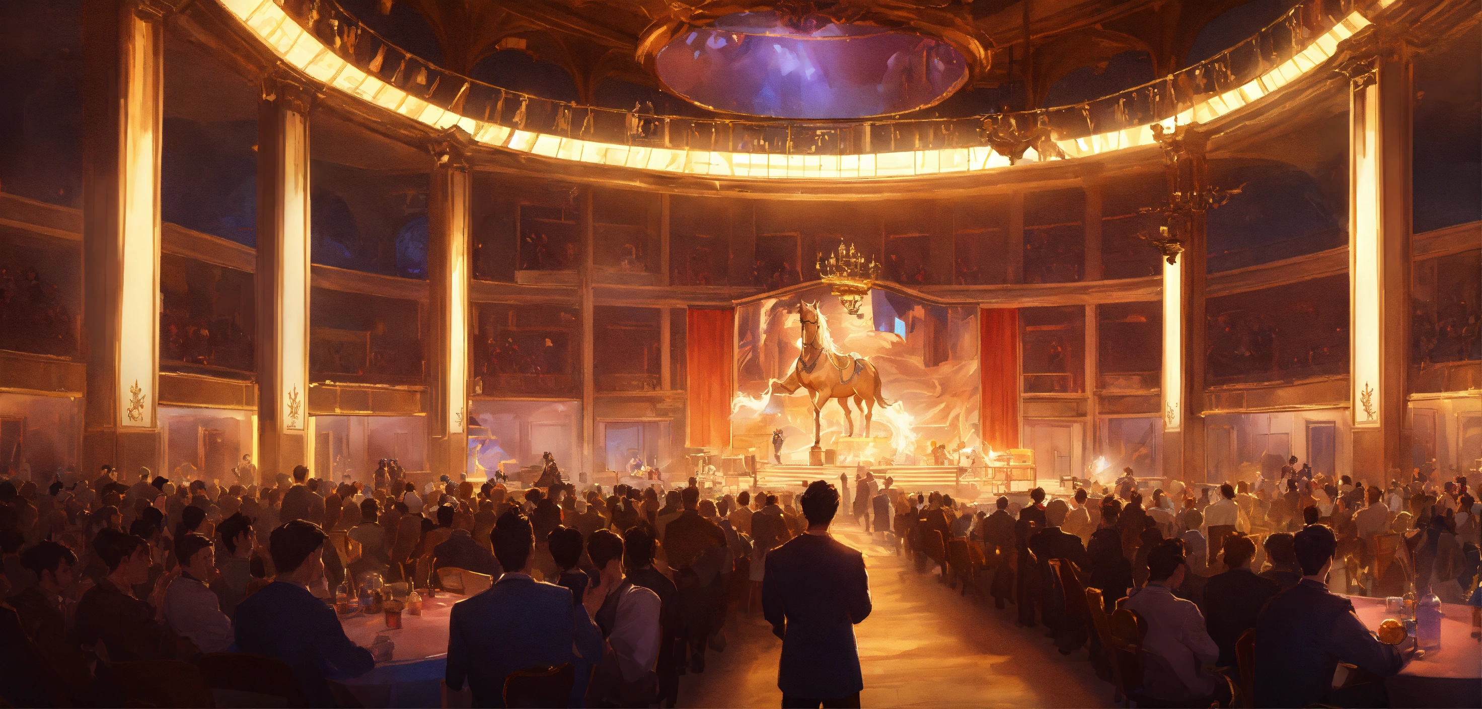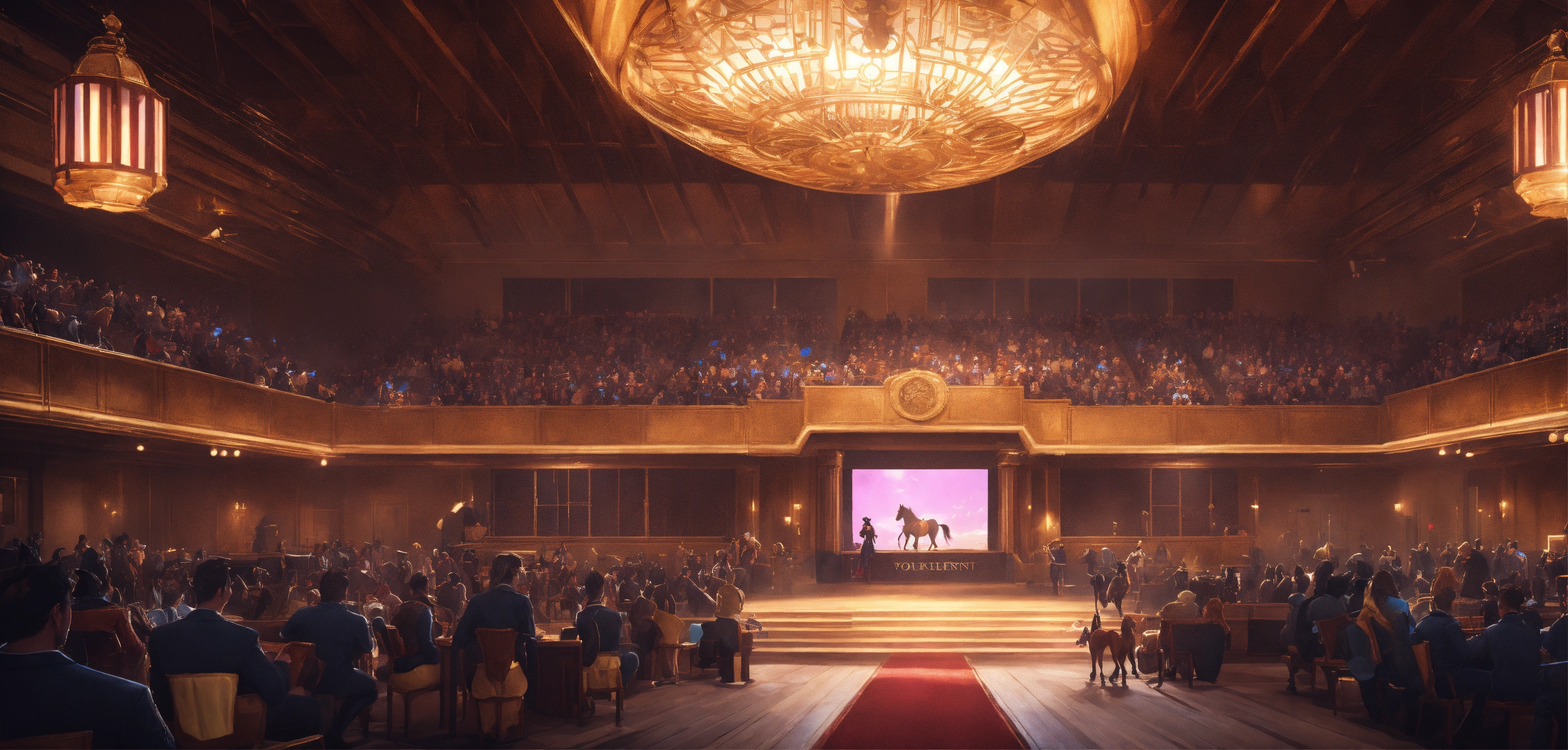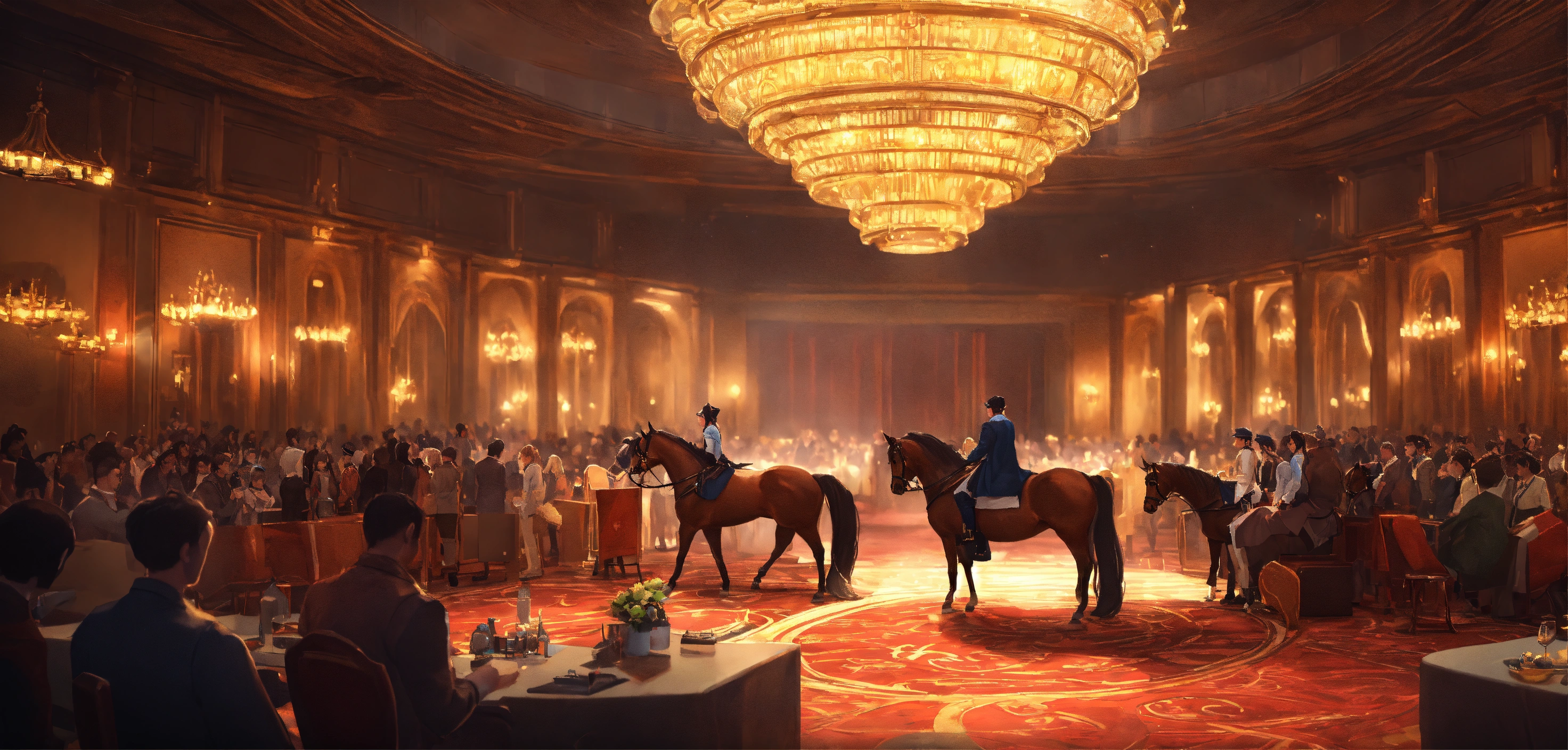 A highly detailed league of legend dynamic illustration of the horse auction in little modern event hall by artgerm, by huyy nguyen, by cj xander, by jennifer wuestling, by diep duong van, by huyy nguyen, by grafit studio, volumetric lighting, 3d render, 4k resolution, trending on artstation, masterpiece, close up frame, cinematic shot, sport competition, inside hall with stands, lot of armchairs with people, one horse in centre only, evening, hall without windows, a windowless hall with a horse on the stand