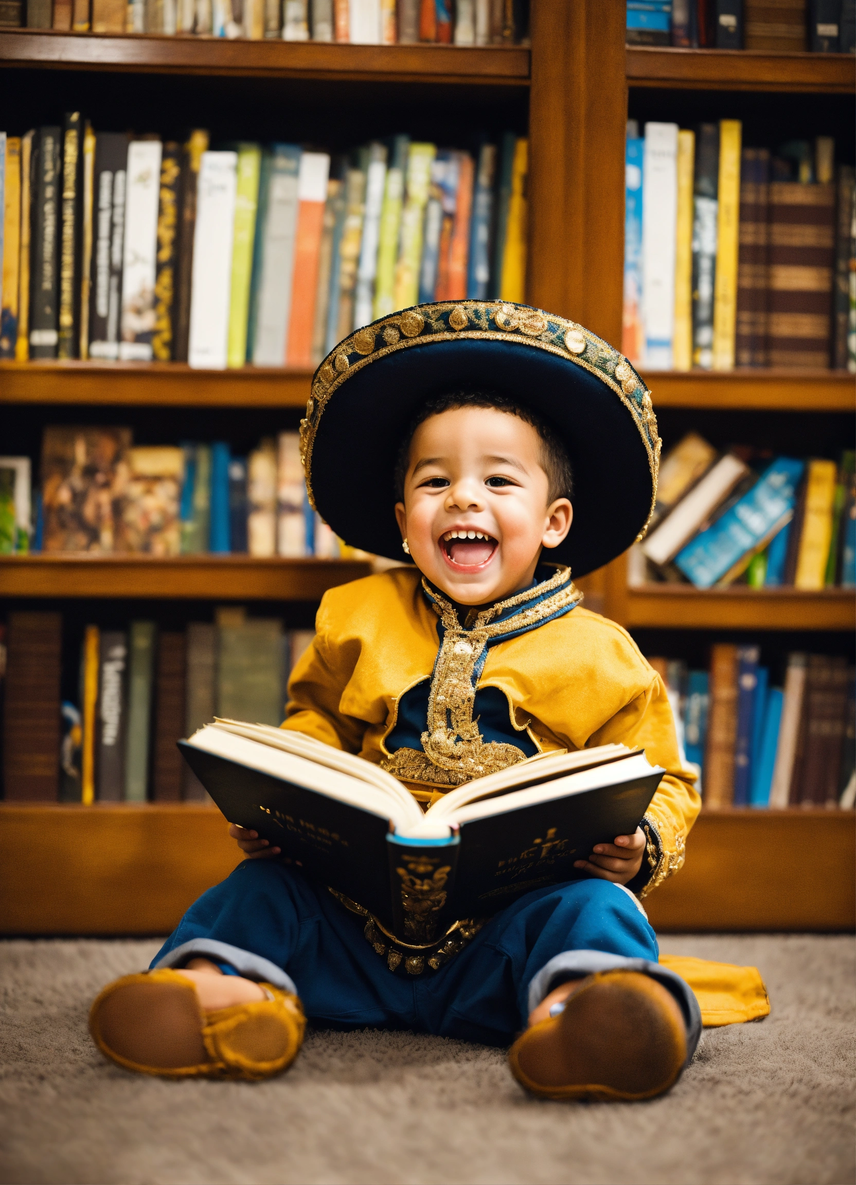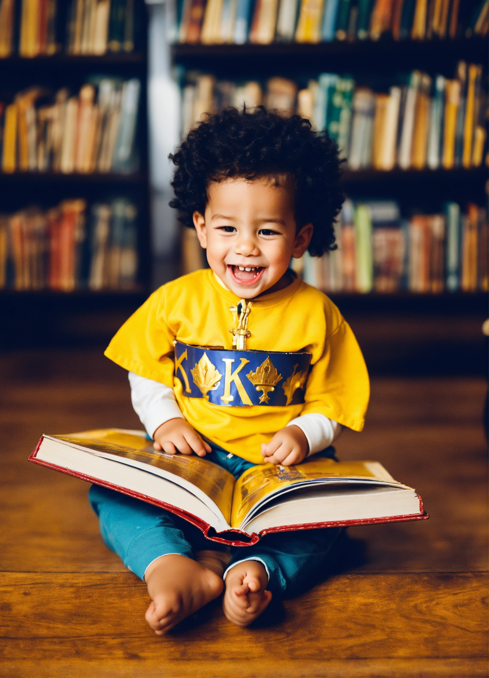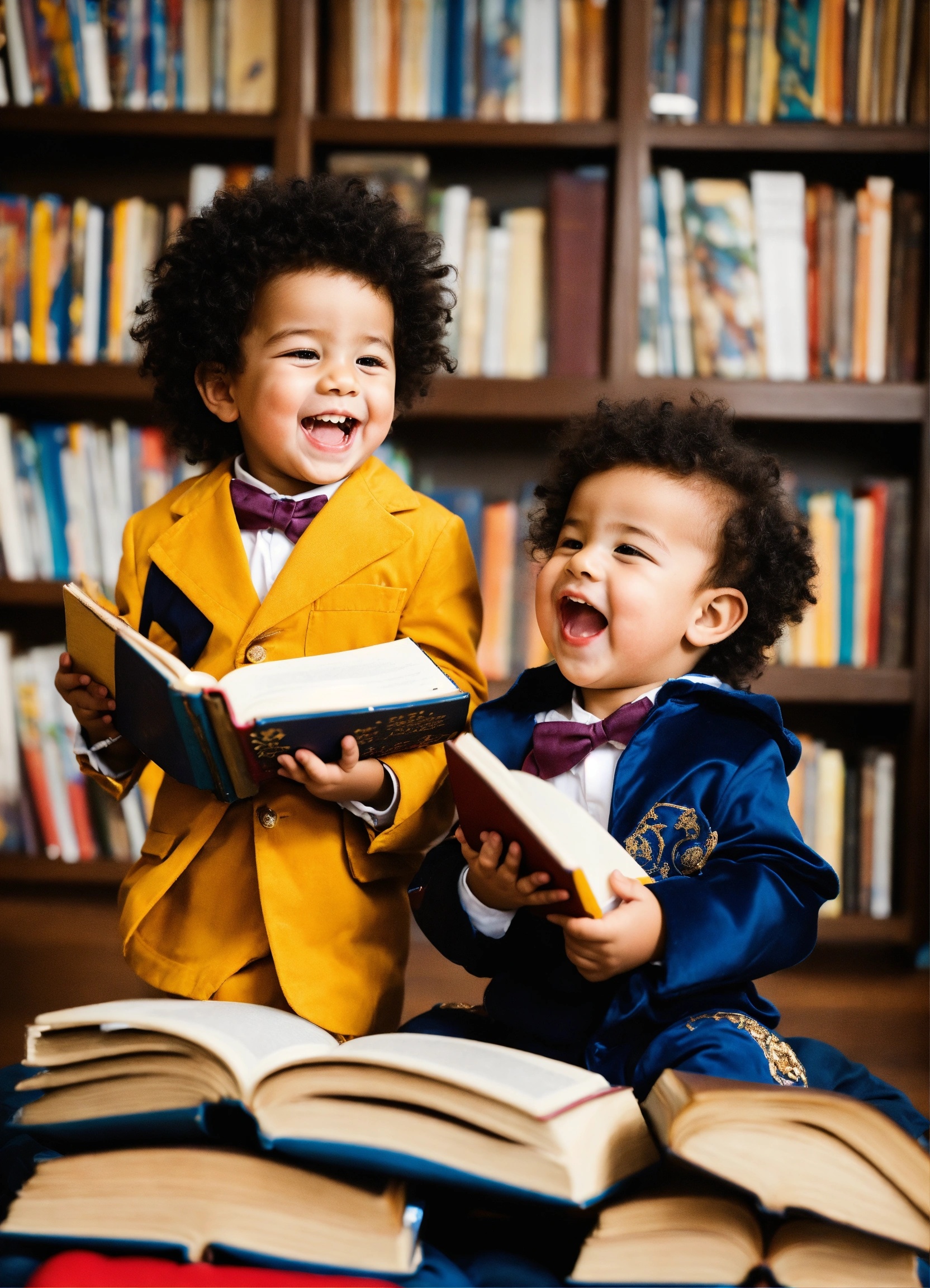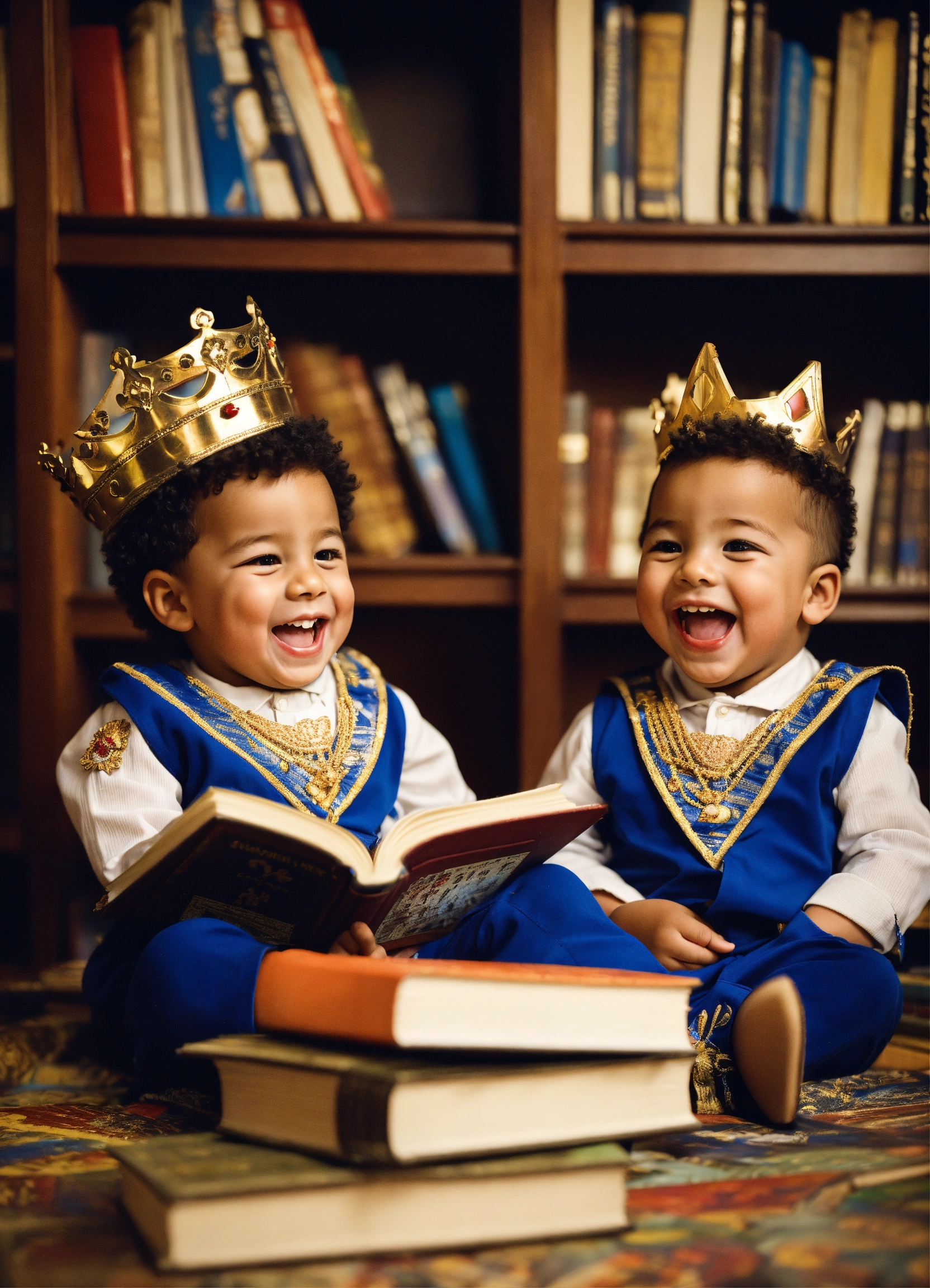 Very beautiful mixed race toddler boys dressed as kings roaring with laughter with books all around them in a library