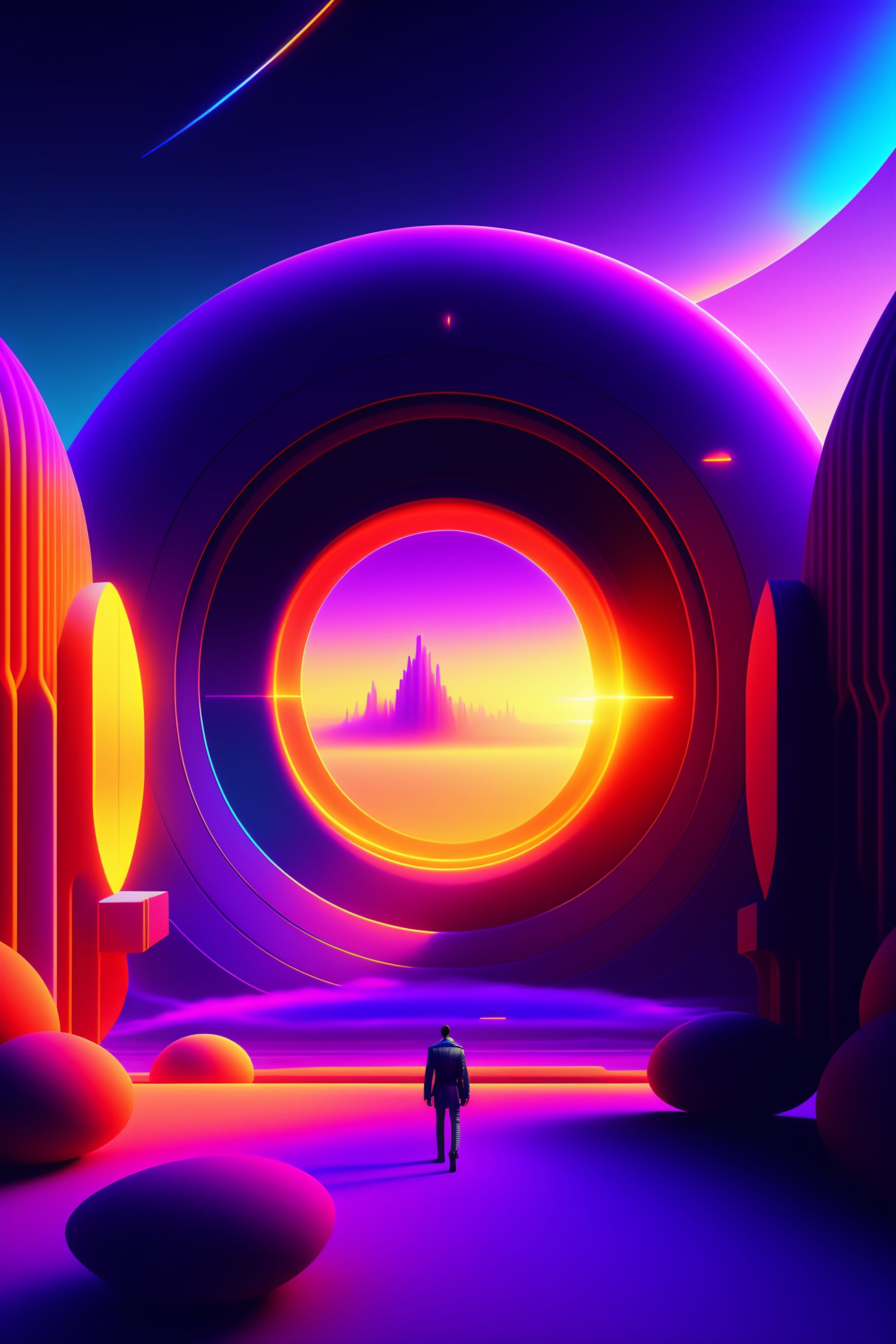 Entrance to mainframe ethereal realm, ai sentient, octane render, central composition, symmetrical composition, dreamy colorful cyberpunk colors, 6 point perspective, fantasy landscape with anthropomorphic terrain in the styles of igor morski, jim warren and rob gonsalves, intricate, hyperrealistic, volumetric lighting, neon ambiance, distinct horizon