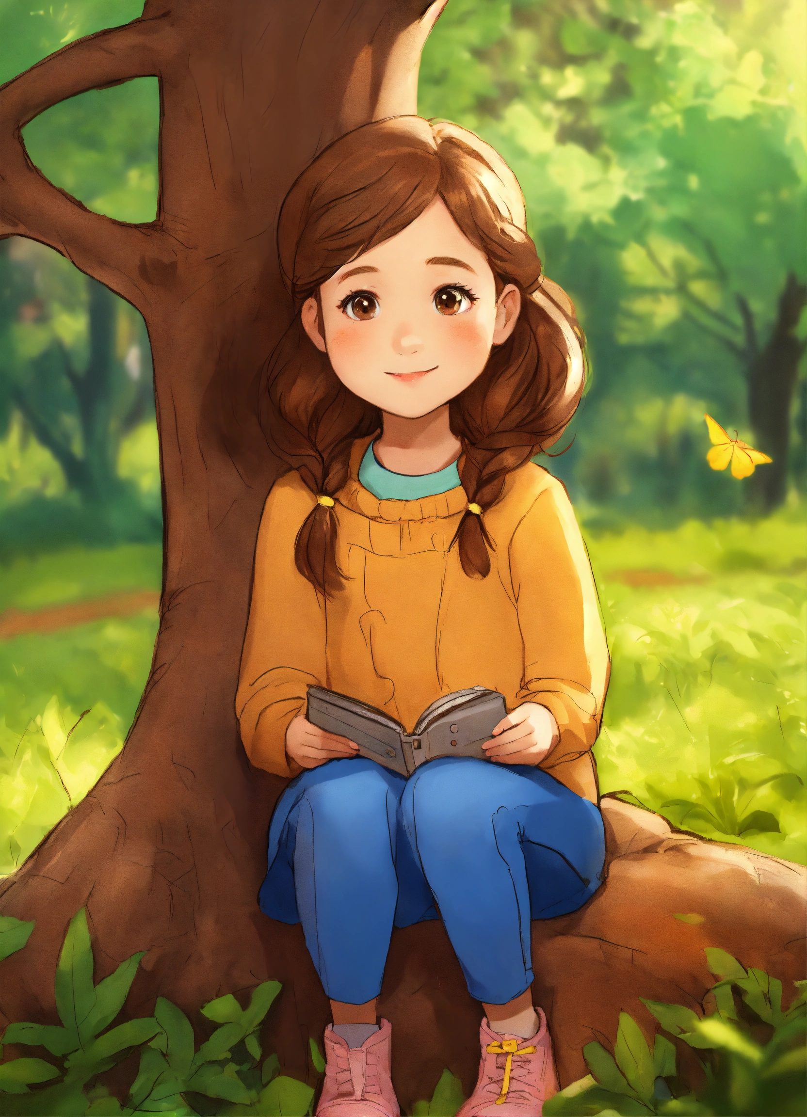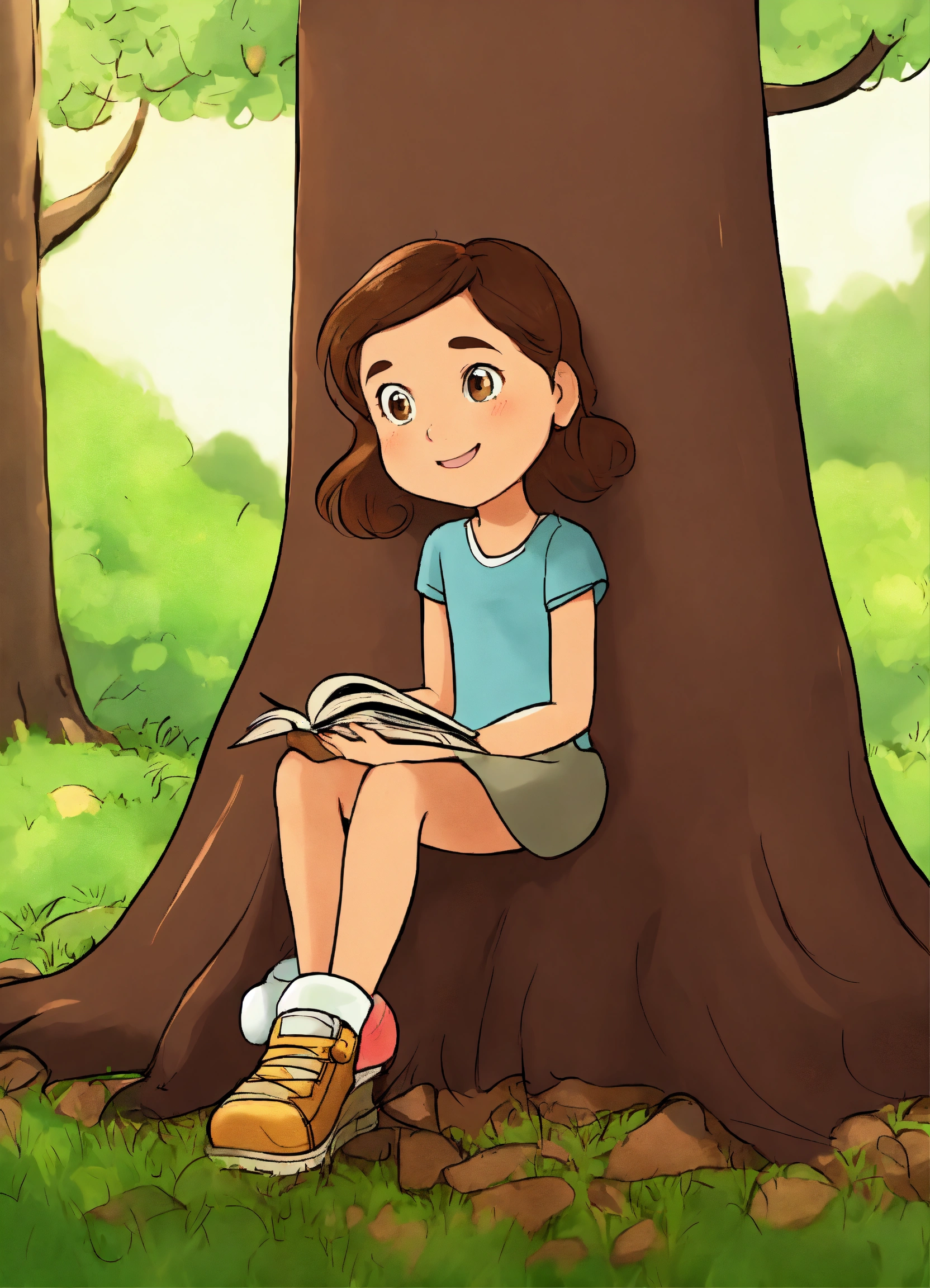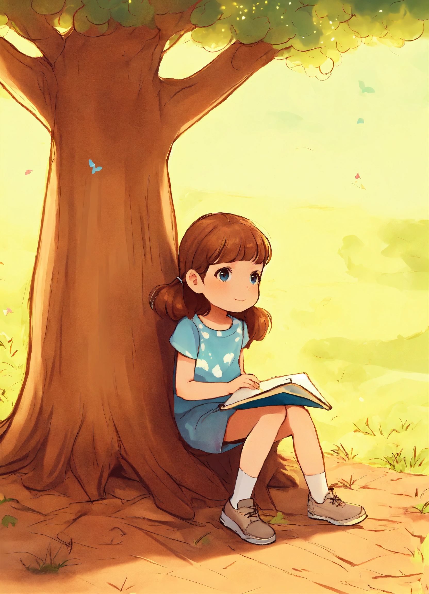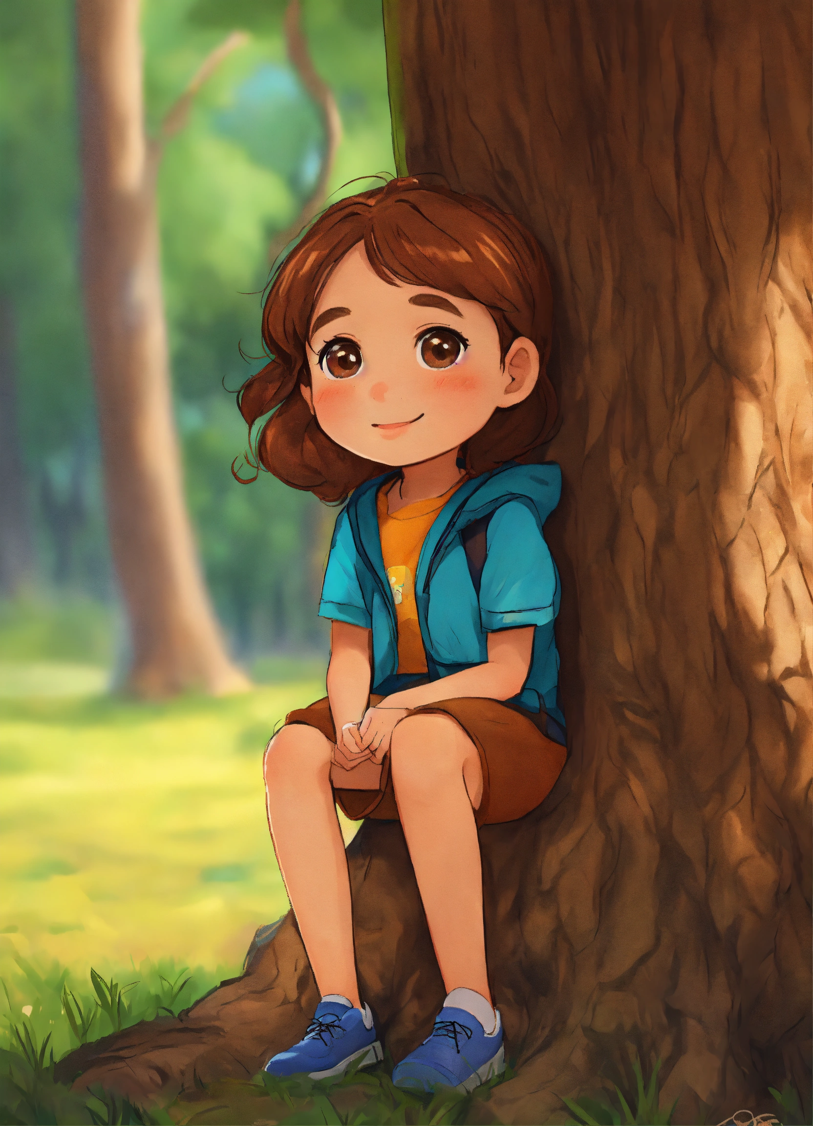 A girl (6 years old, brown hair) who sitting next to the tree, like pixar. draw a tree so you can see it
