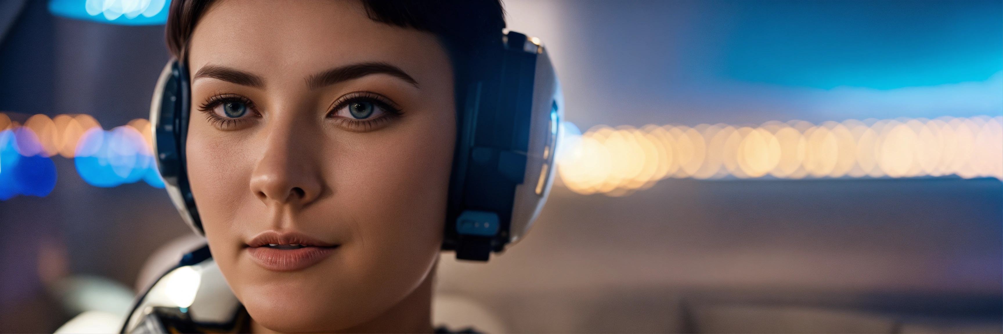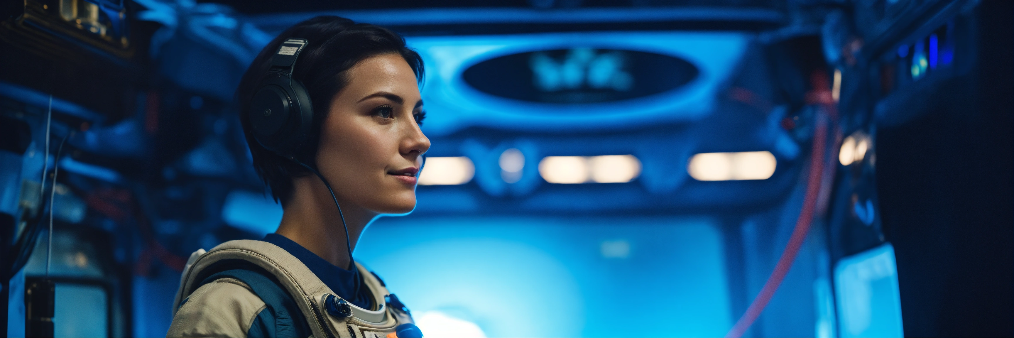 Perfect photo portrait of a white woman with friendly gentle look, short dark hair, front view, blue lighting, casual, committed to space exploration, convey the idea of space exploration, photo shoot, hyper realistic, canon eos r