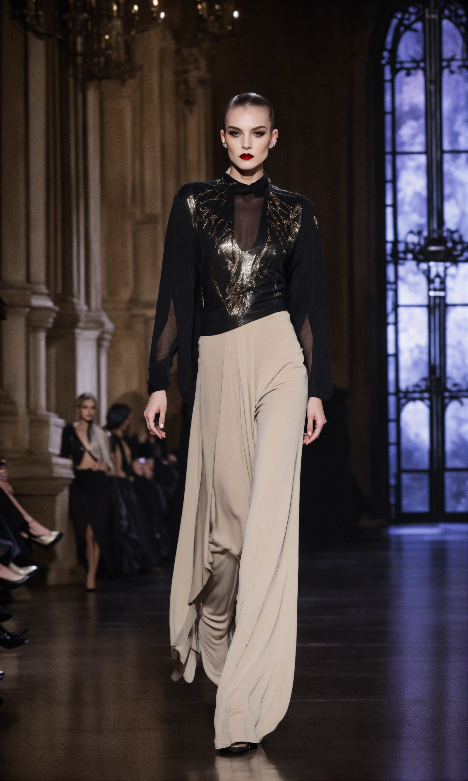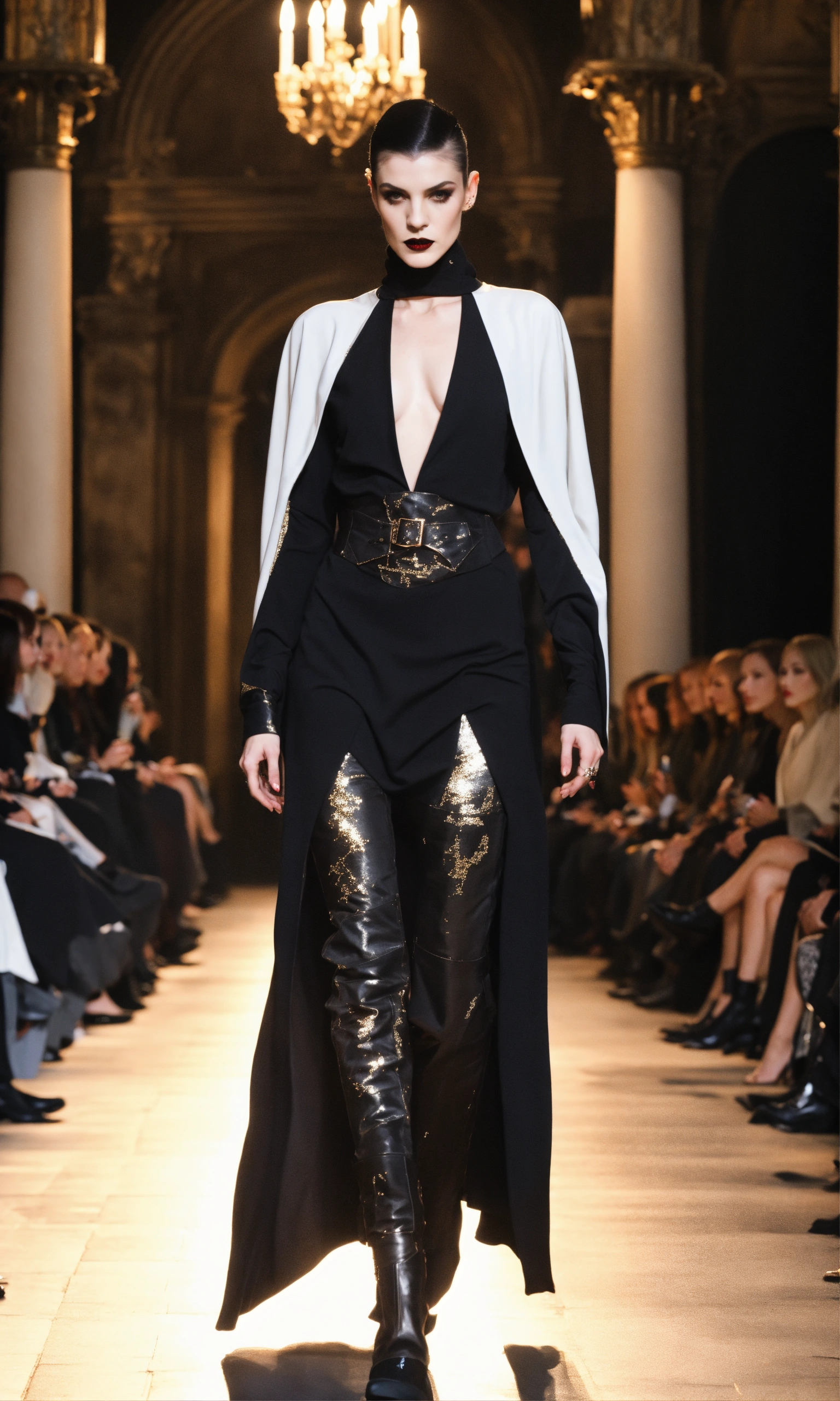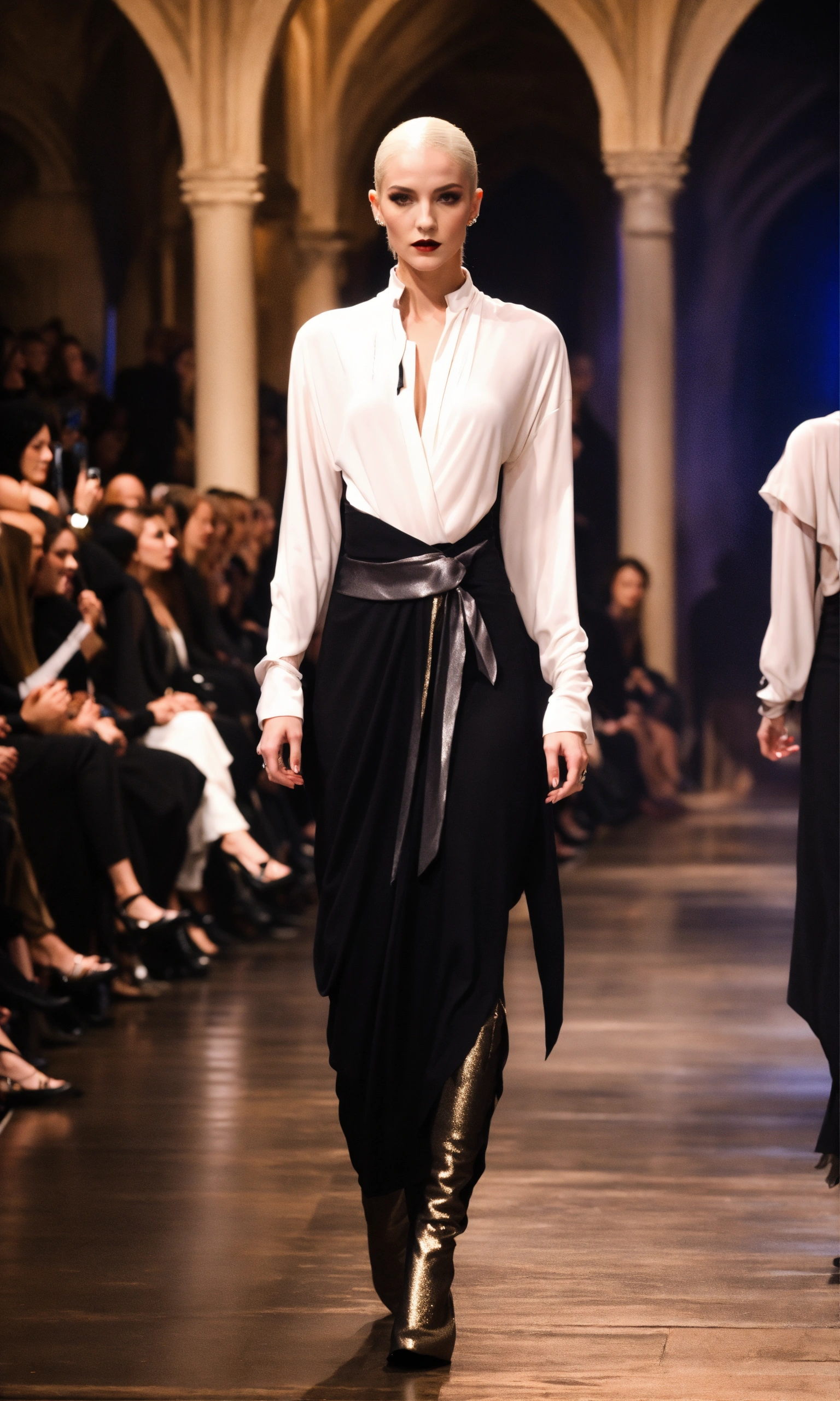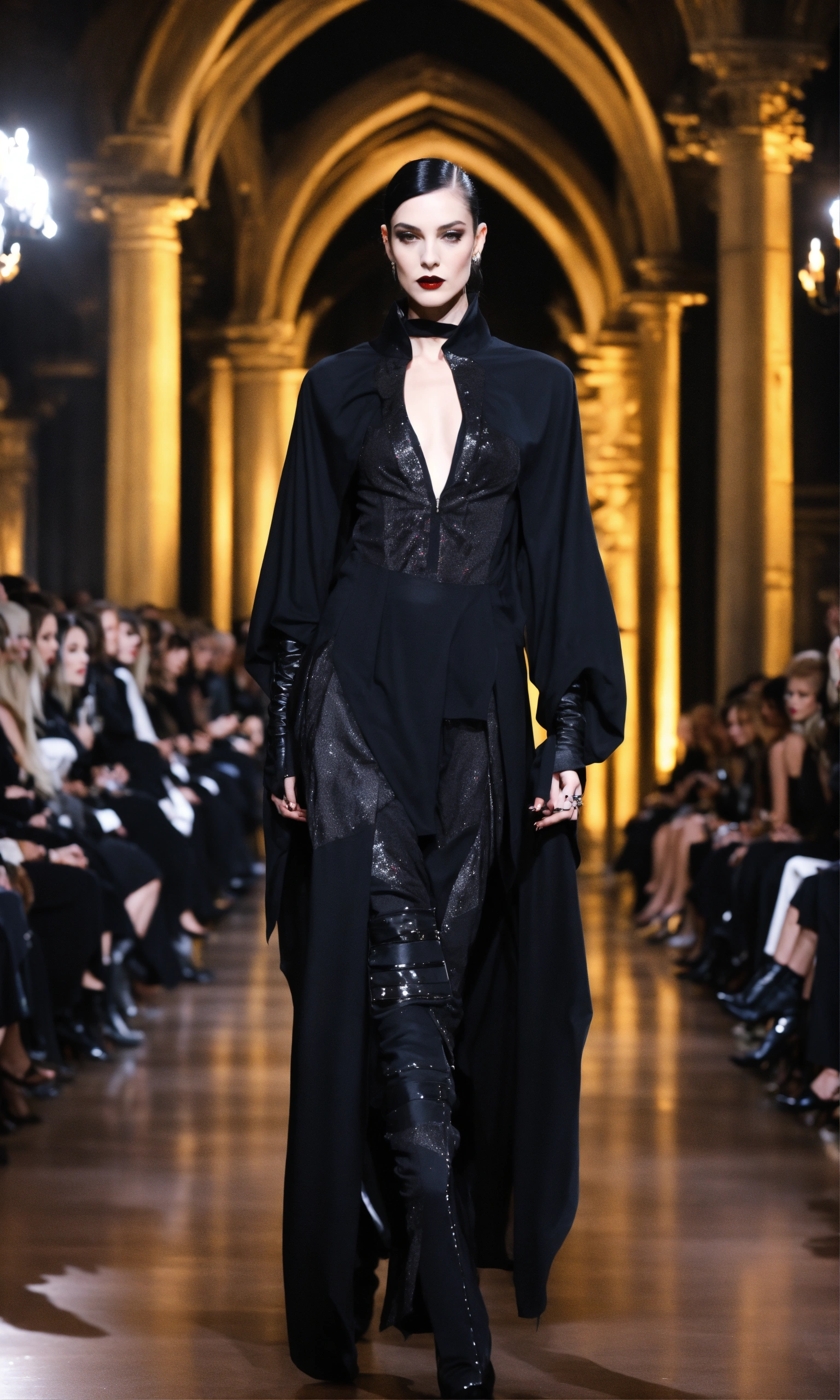 Lothlorien androgynous royal vampire walking runway during vamp fashion week wearing dolman sleeve dark donna karan vamp fashion in black, white, grey, beige, stone, metallics, shimmer walking runway in a dark goth castle