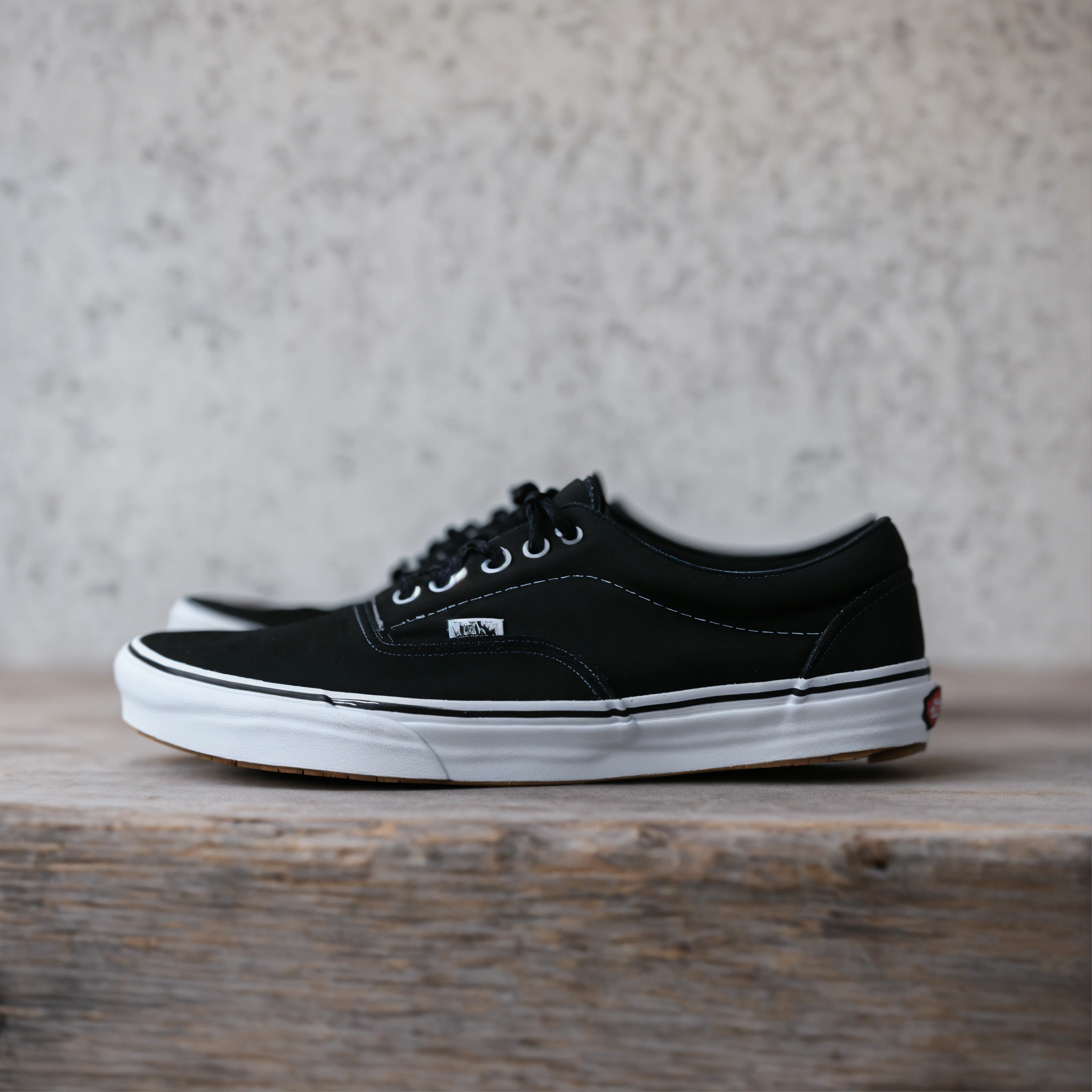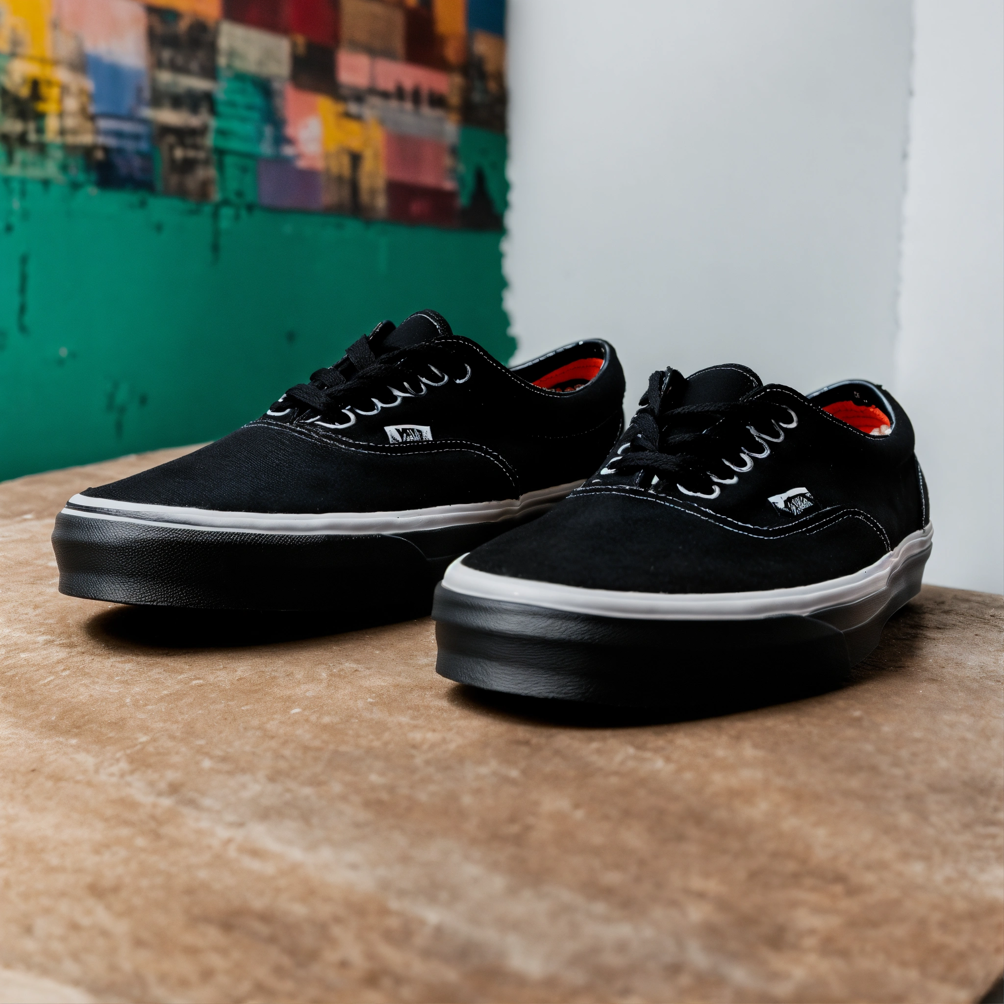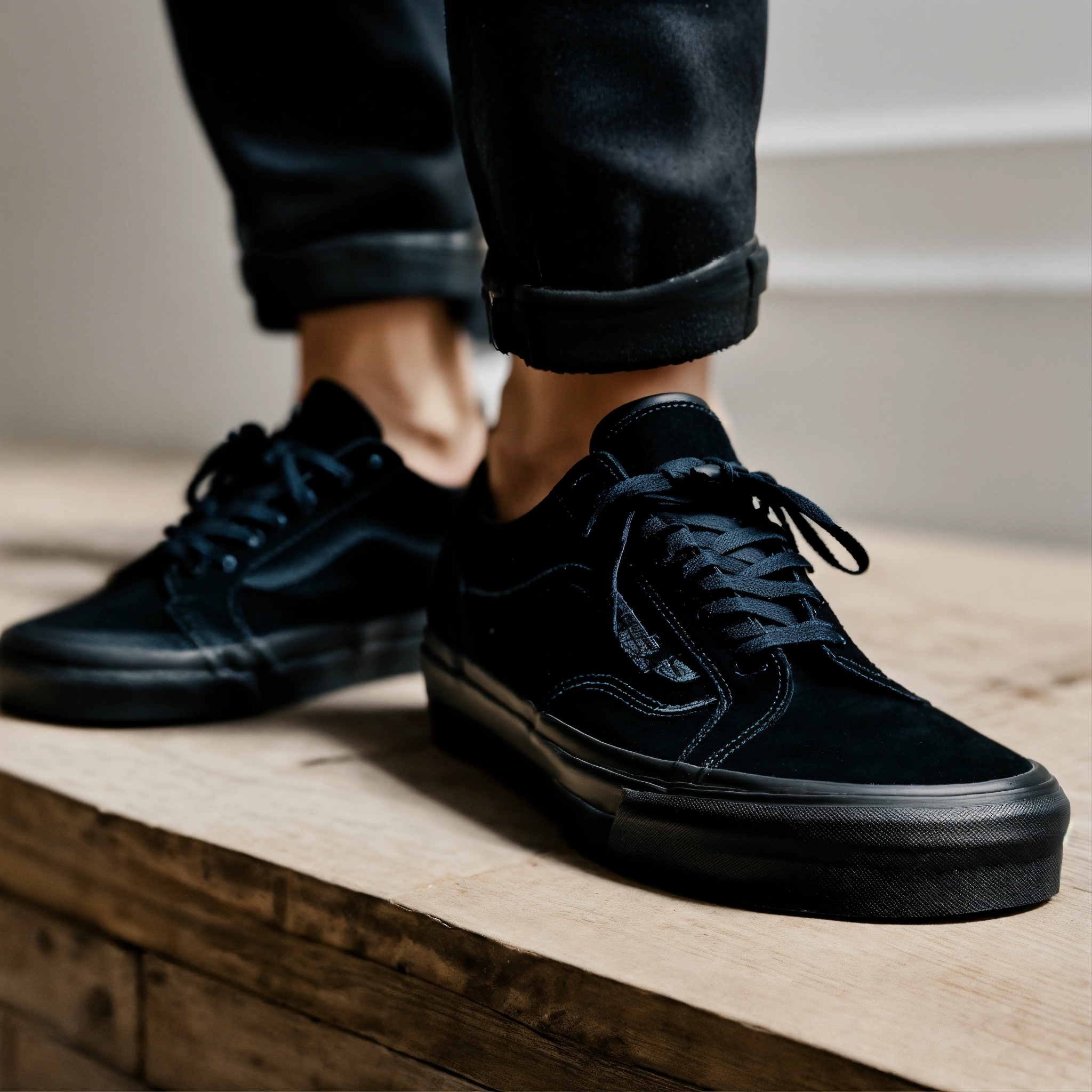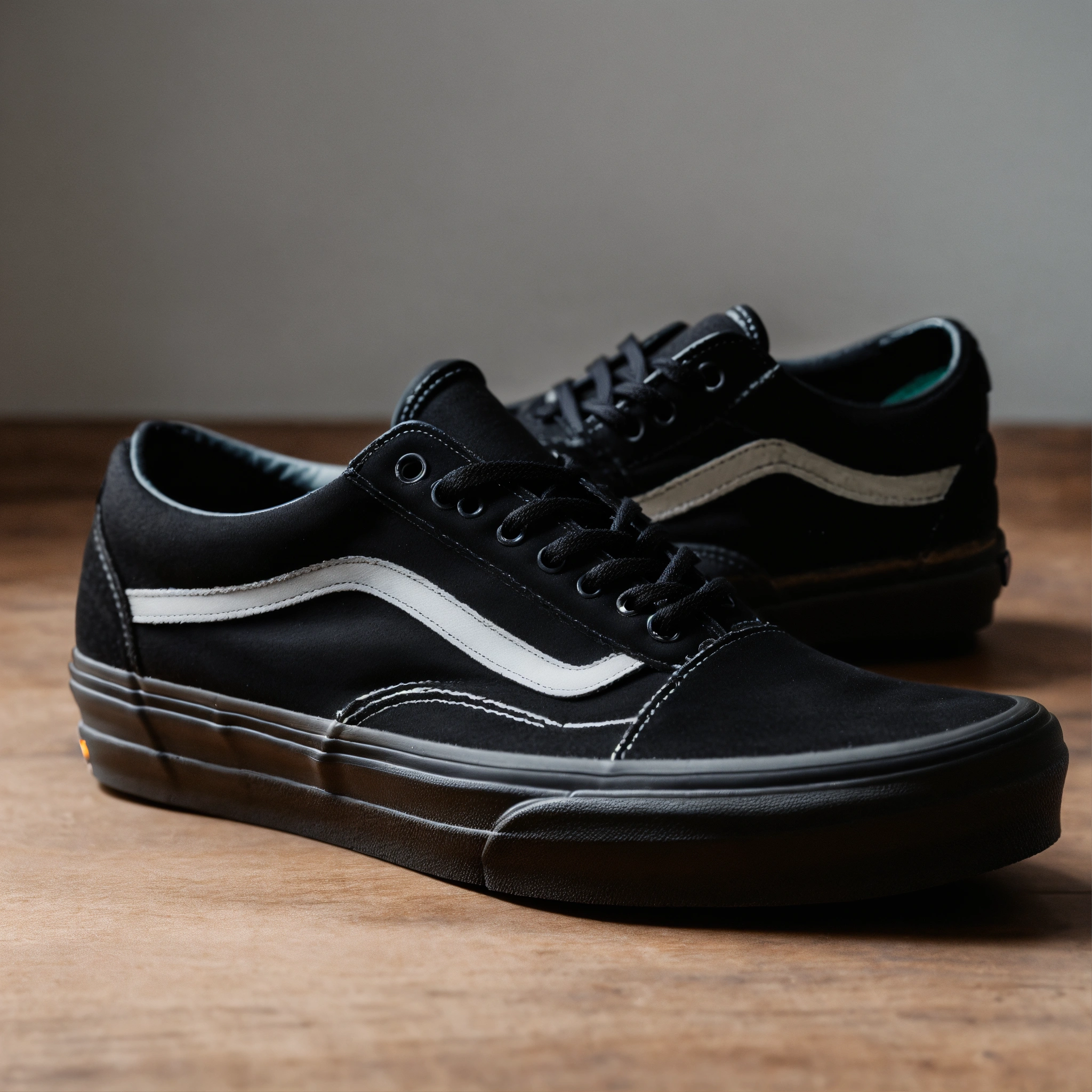 A photo of a pair of black vans shoes, the shoes are new and have never been worn, the background is a plain white wall