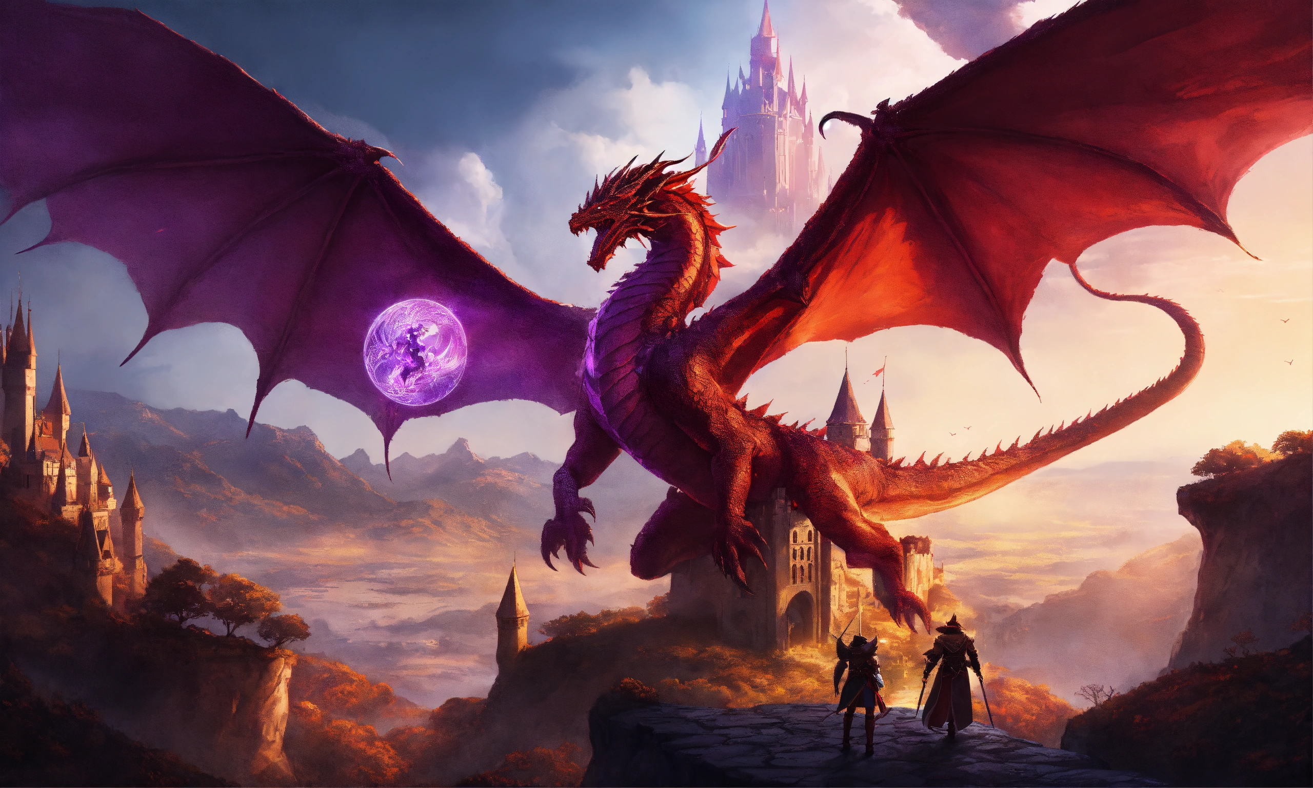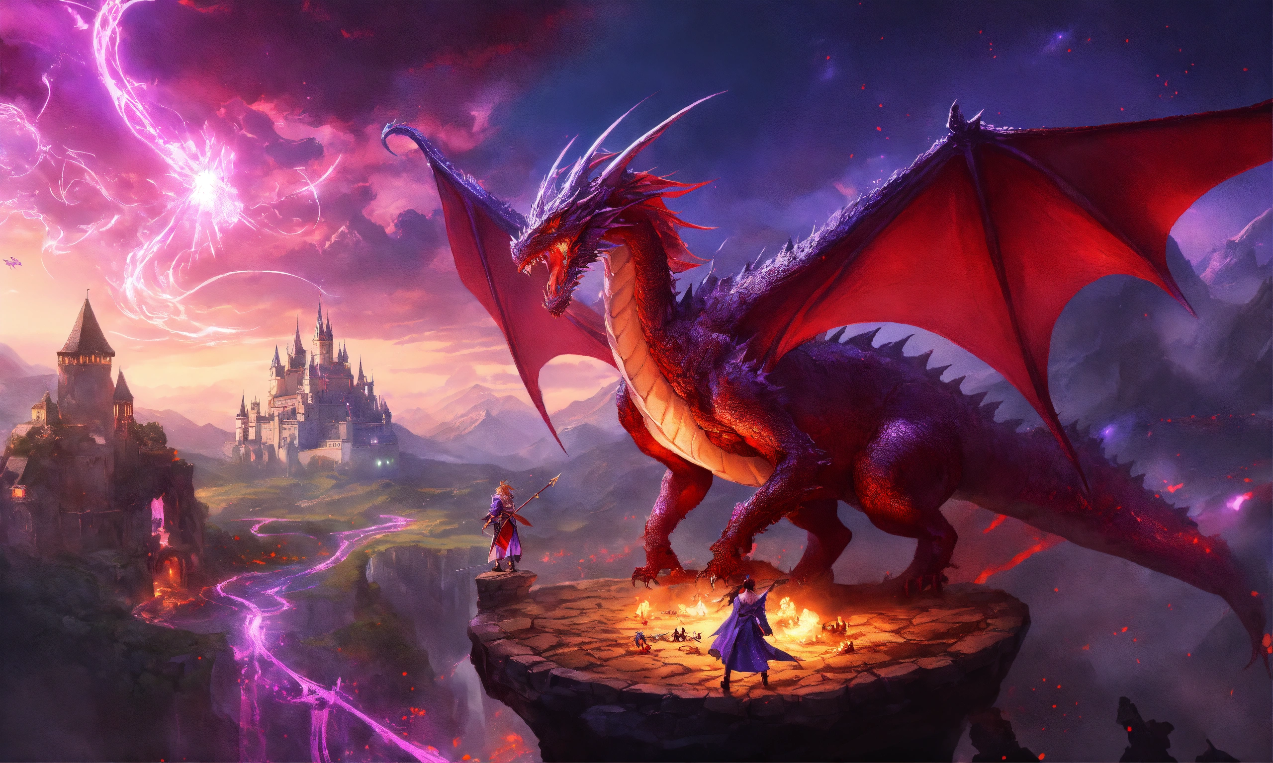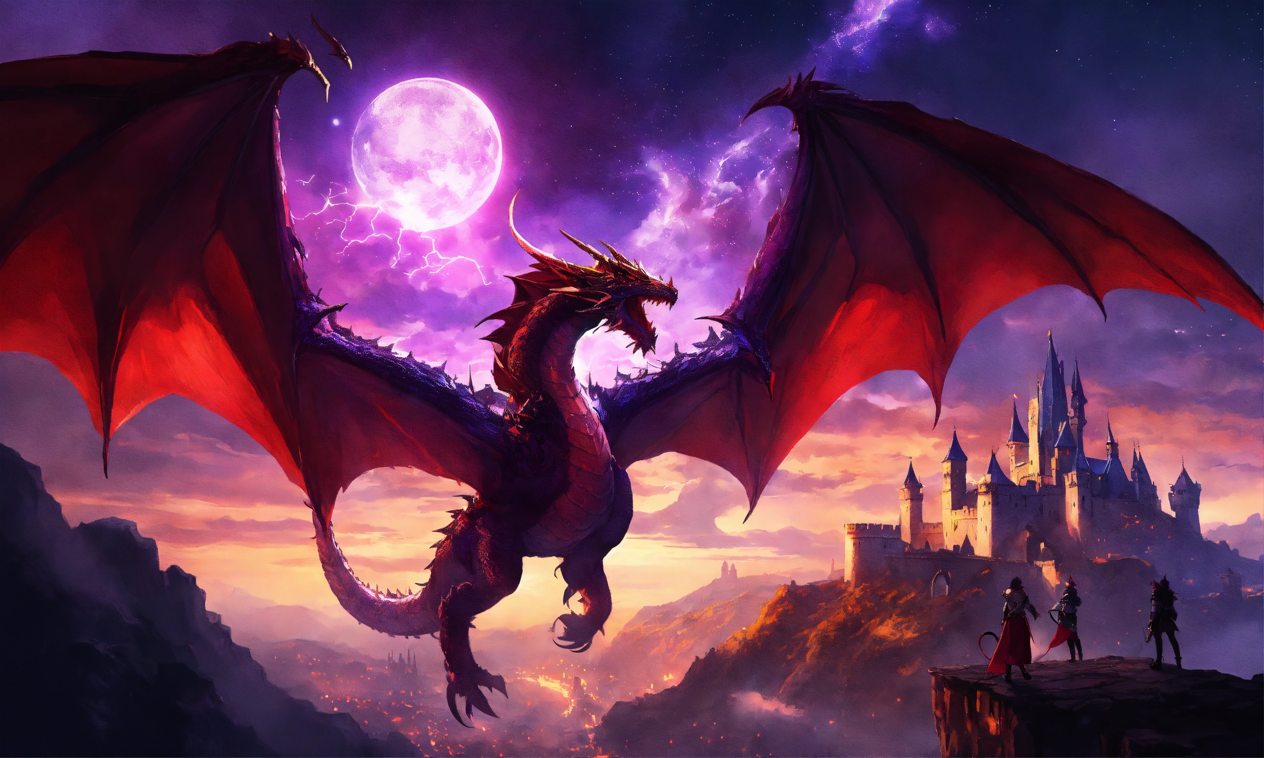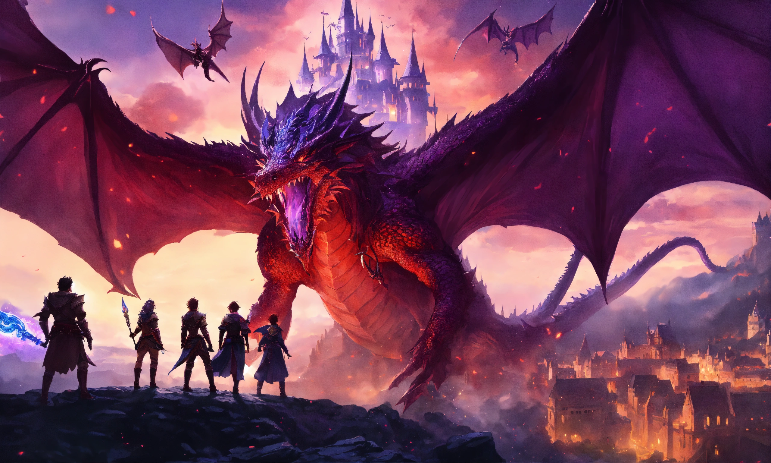 Anime, five fantasy heroes fighting a dragon, different d&d classes, facing a purple and red dragon with 4 wings, in a gorgeous realm, magic cast, nigh sky, castle in the background