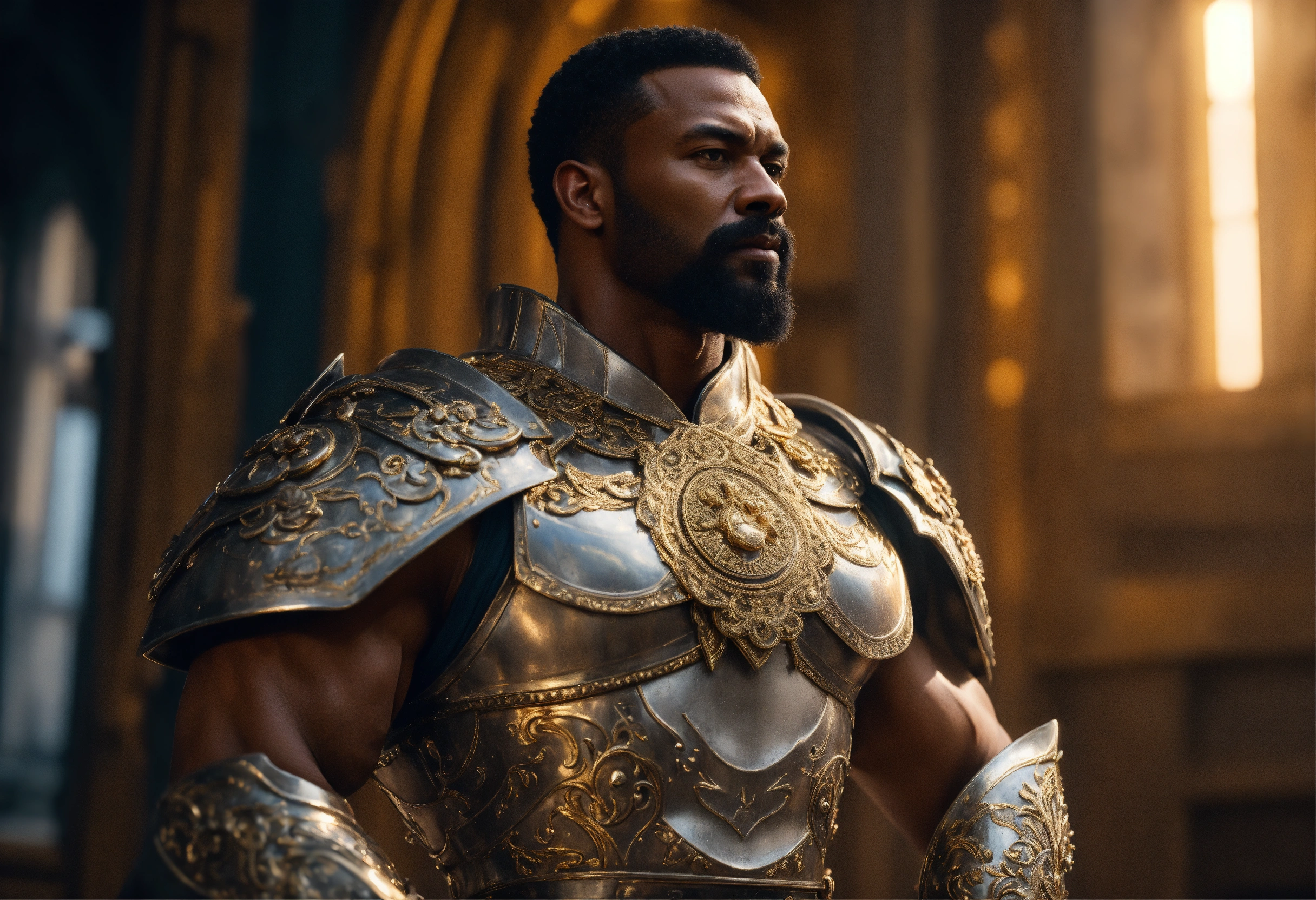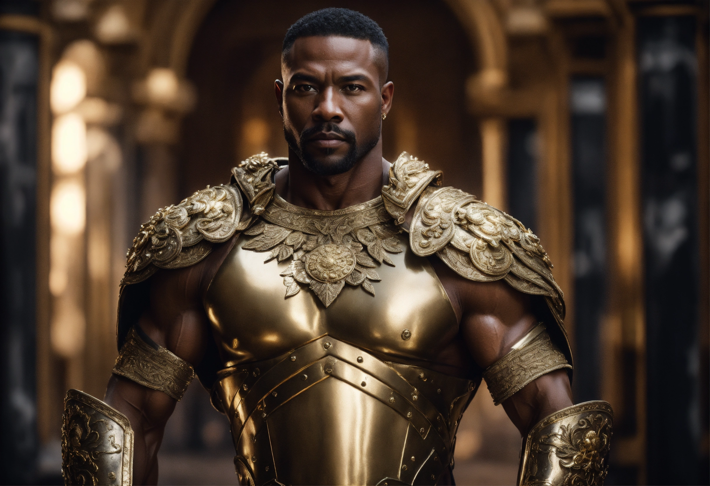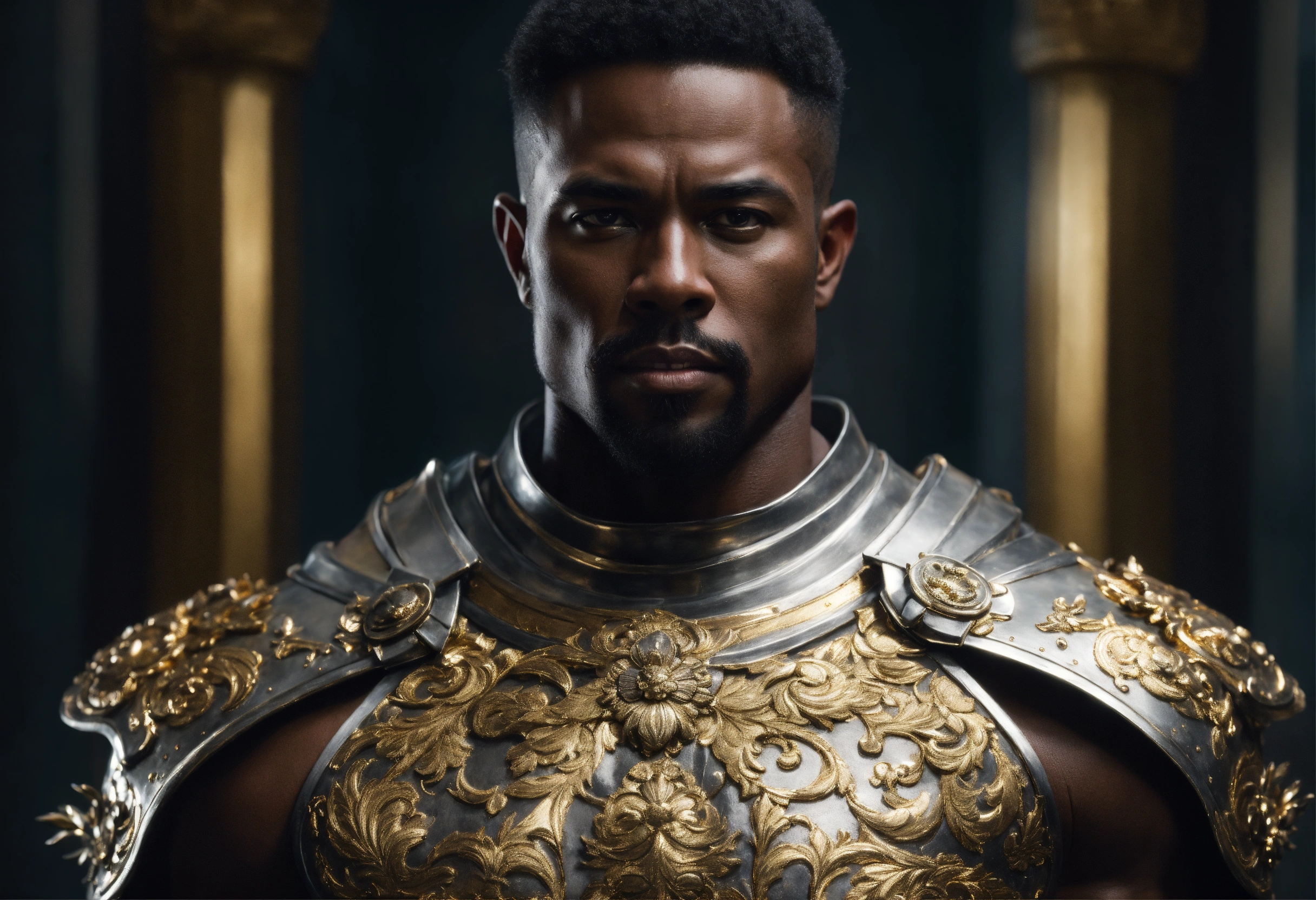 Full body shot of a stunningly handsome middle age black warrior in soft light, mister olympia anatomy, broad muscle legs, big delts, ripped, intricate, elegant, depth of field, zeiss lens, detailed, symmetrical, centered, fashion photoshoot, by annie leibovitz and steve mccurry, david lazar, jimmy nelsson, breathtaking, 8 k resolution, extremely detailed, beautiful, establishing shot, artistic, hyperrealistic, beautiful face, octane render, in ornate silver and gold armor and fur