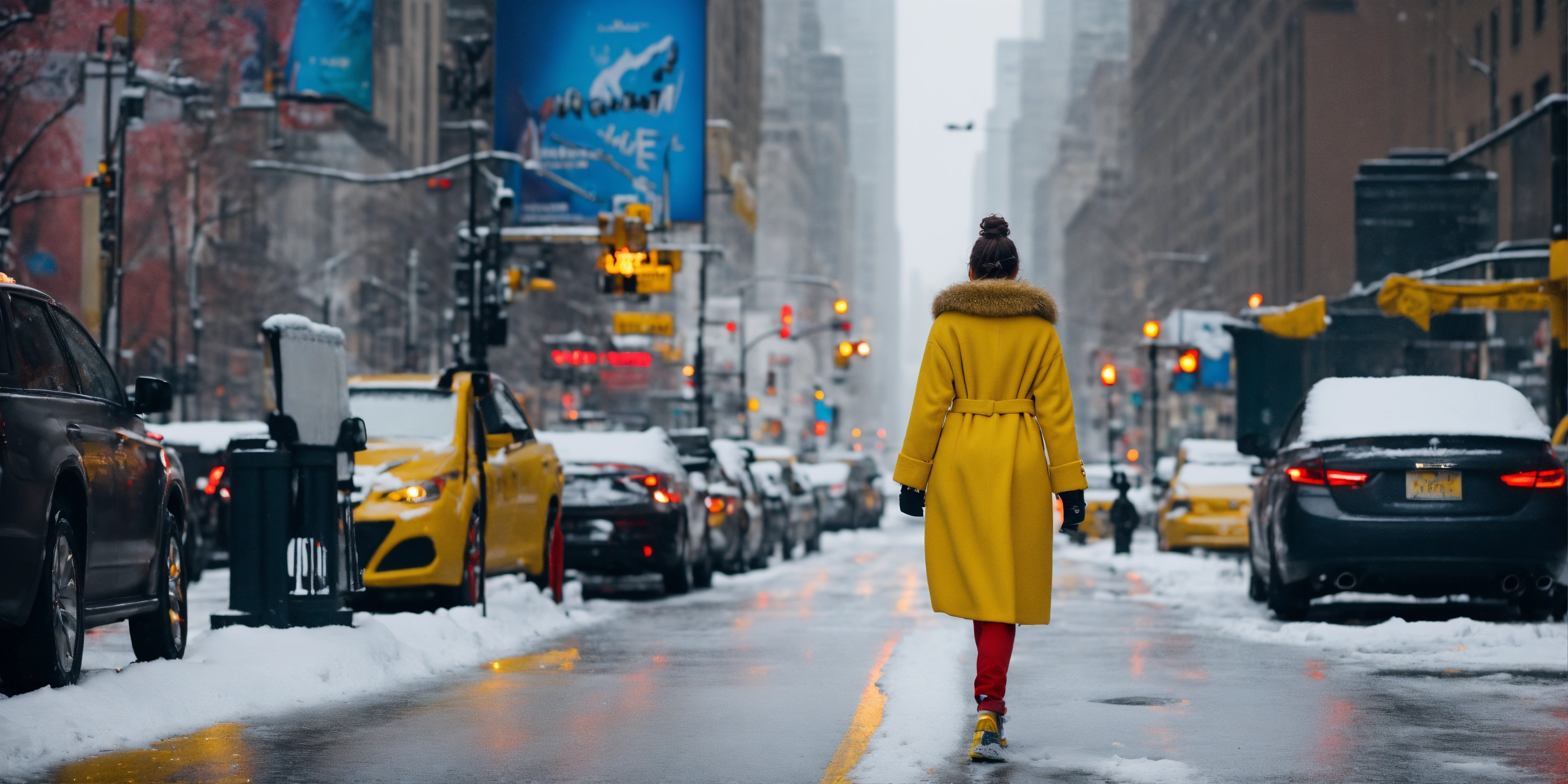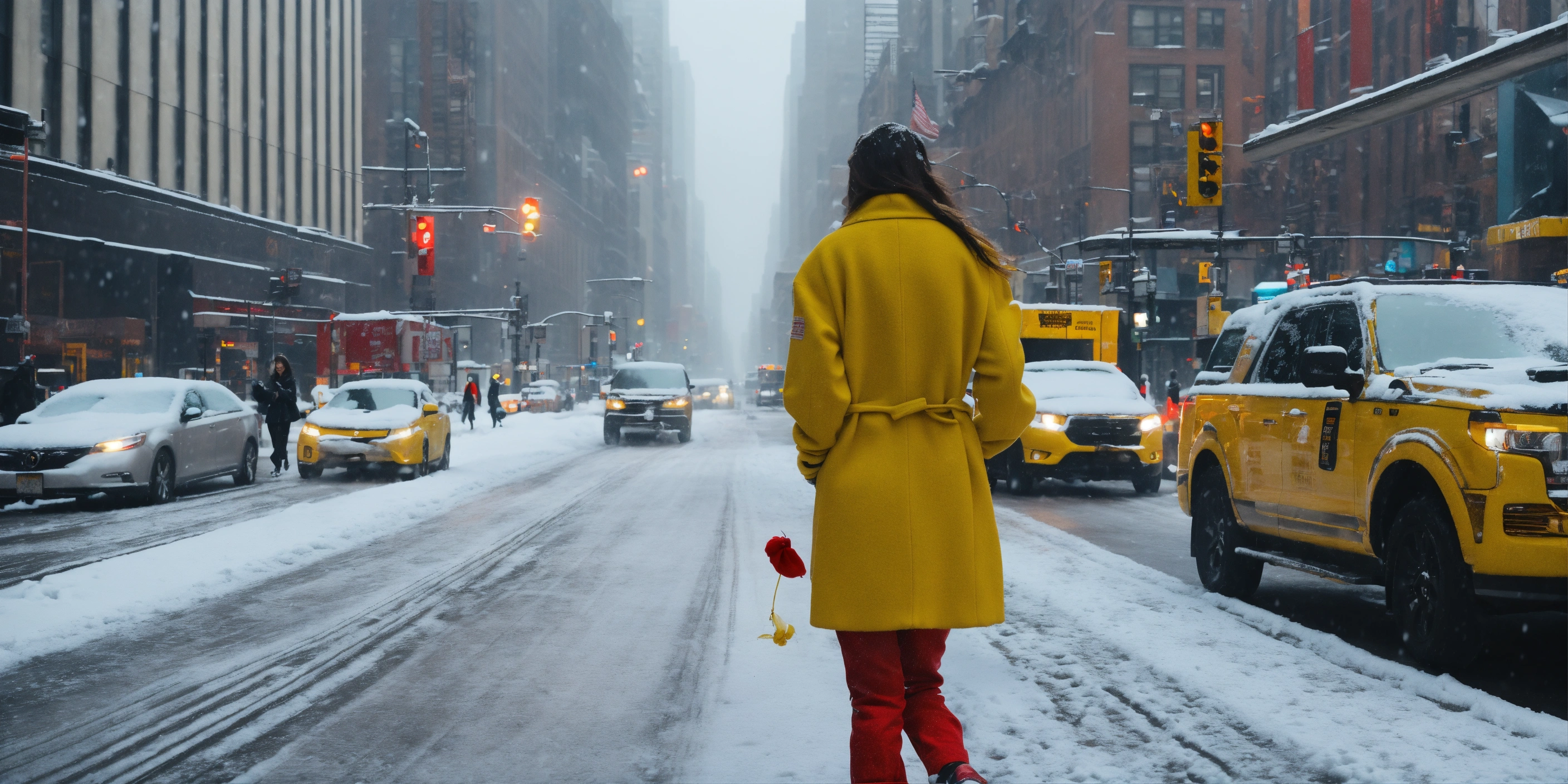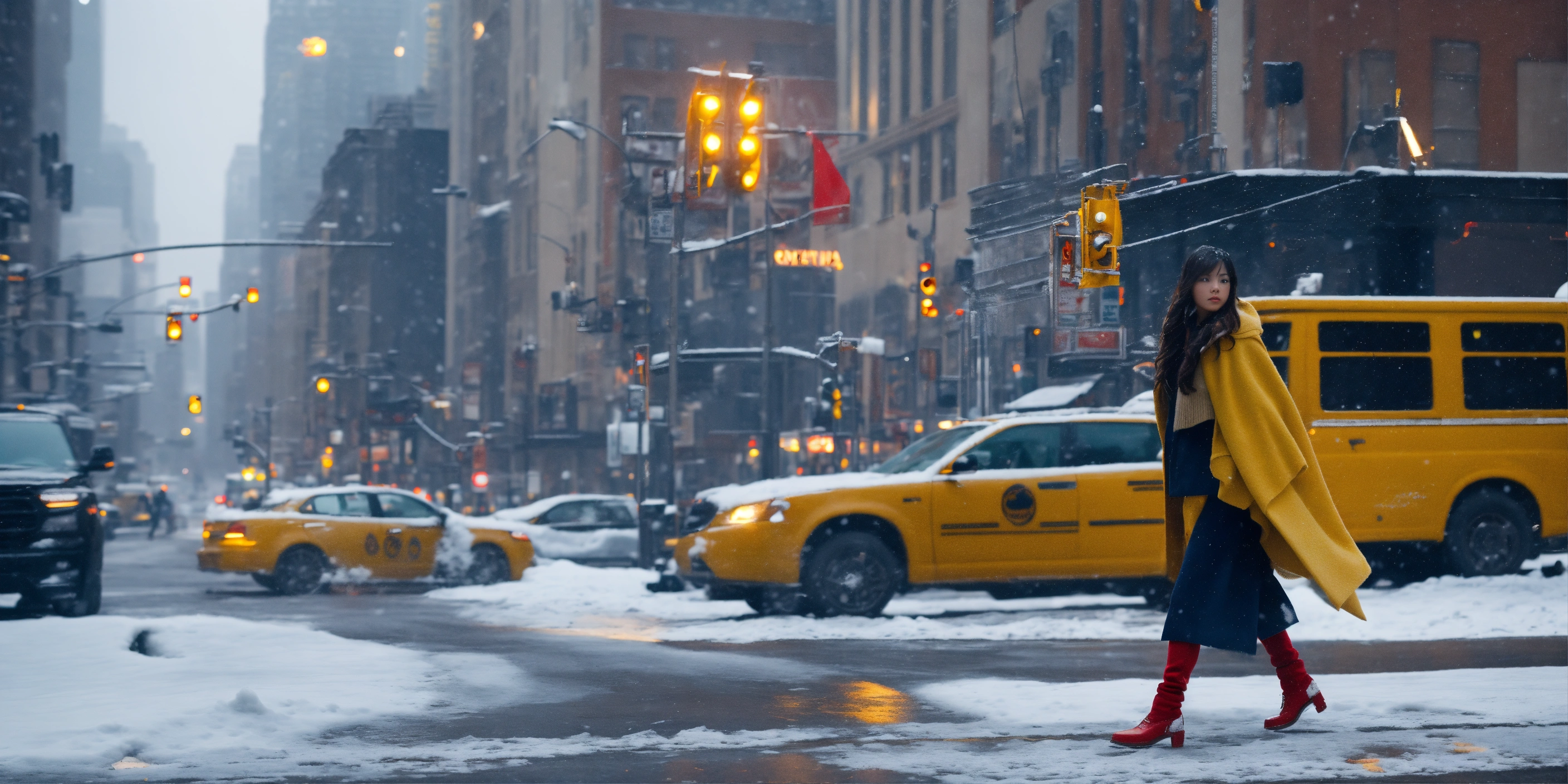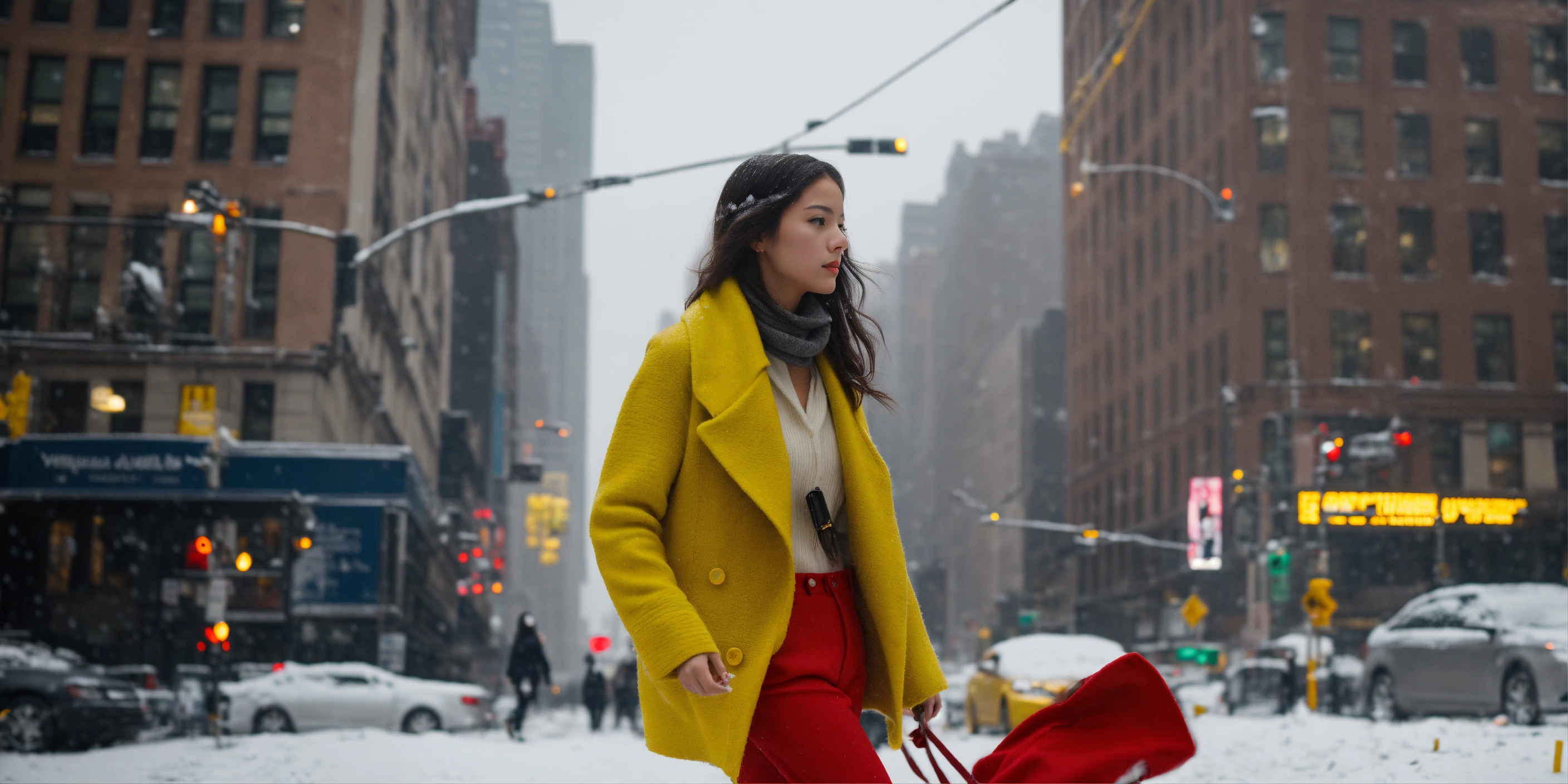 Cinematic image of a girl walking across the new york street in on a snowy day, girl should wear white woolen cloth and a red pant and yellow shoes