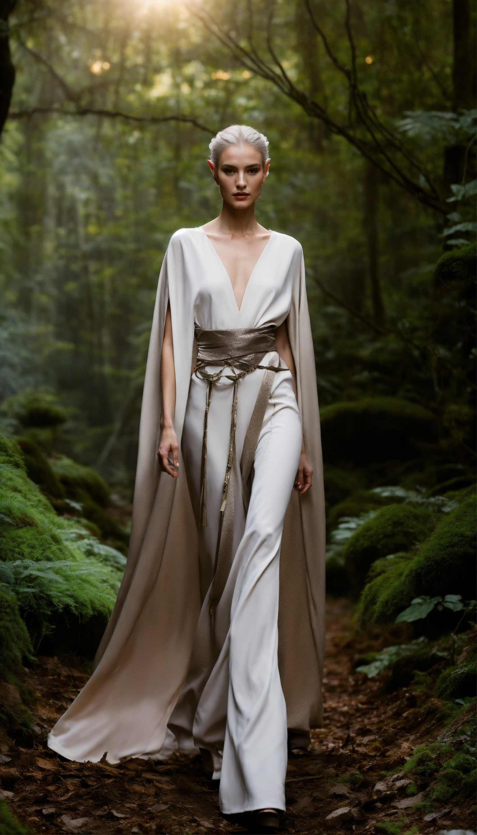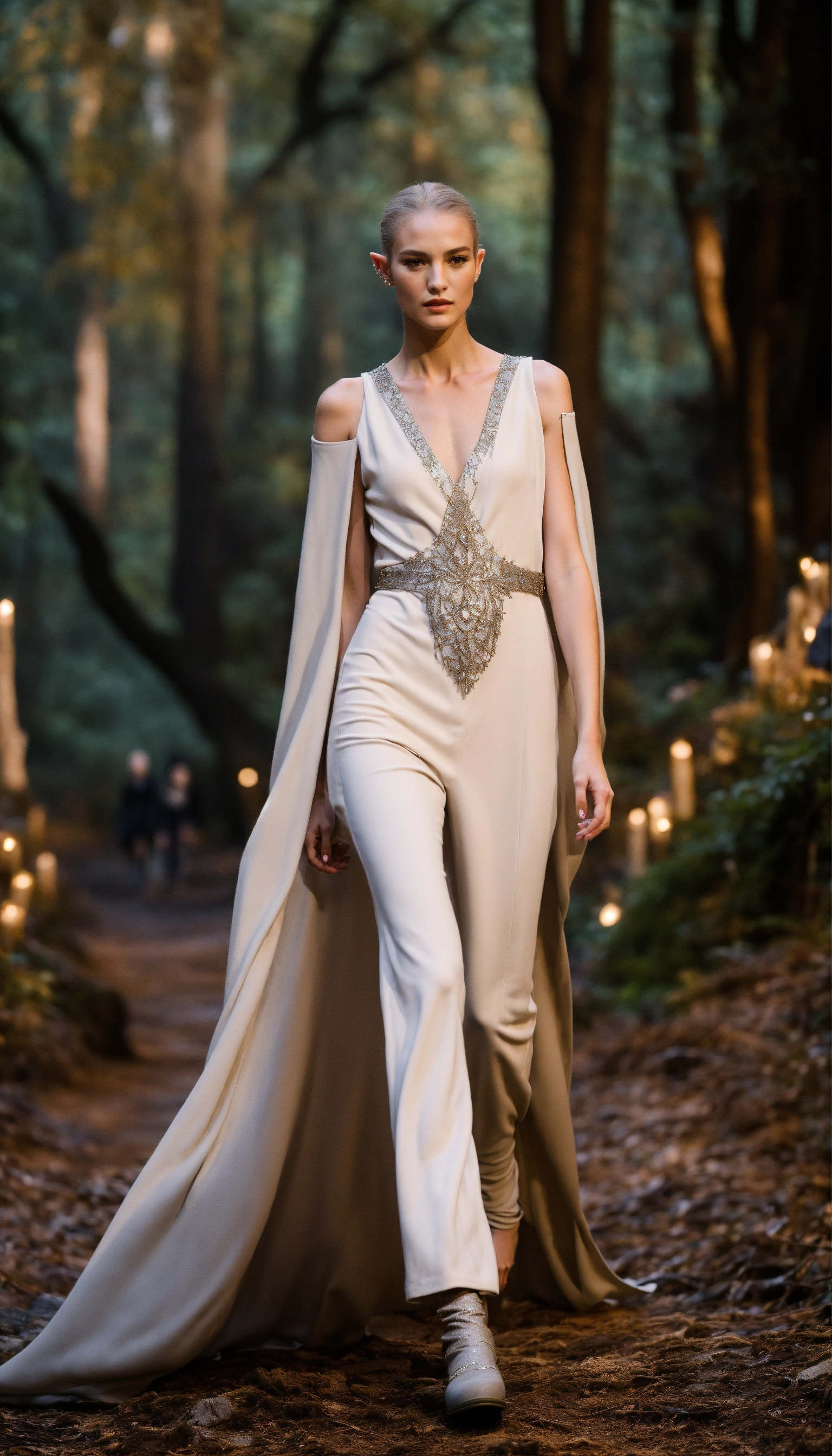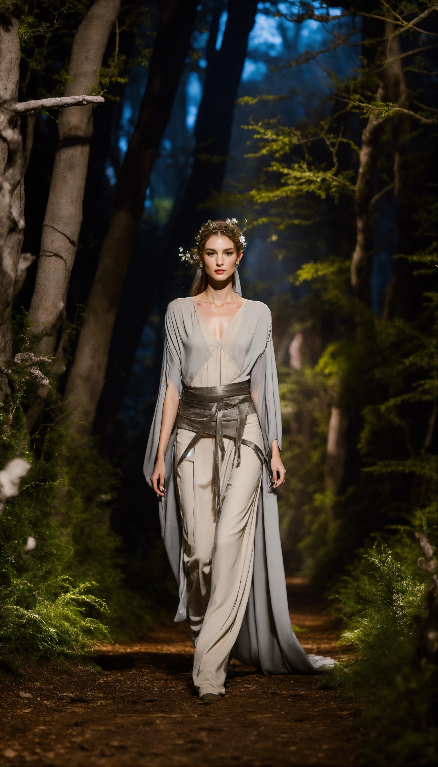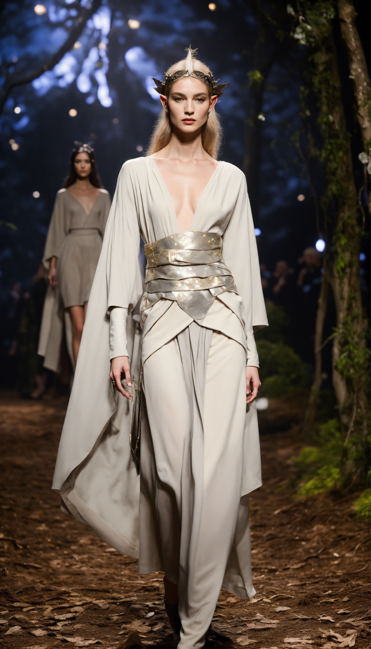 Lothlorien androgynous elves walking runway during elvin fashion week wearing dolman sleeve elvish donna karan fashion in black, white, grey, beige, stone, metallics at an enchanted forest runway under the starry sky