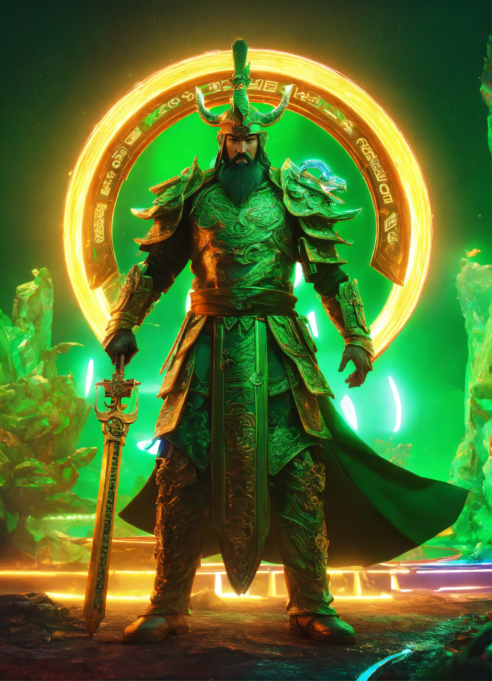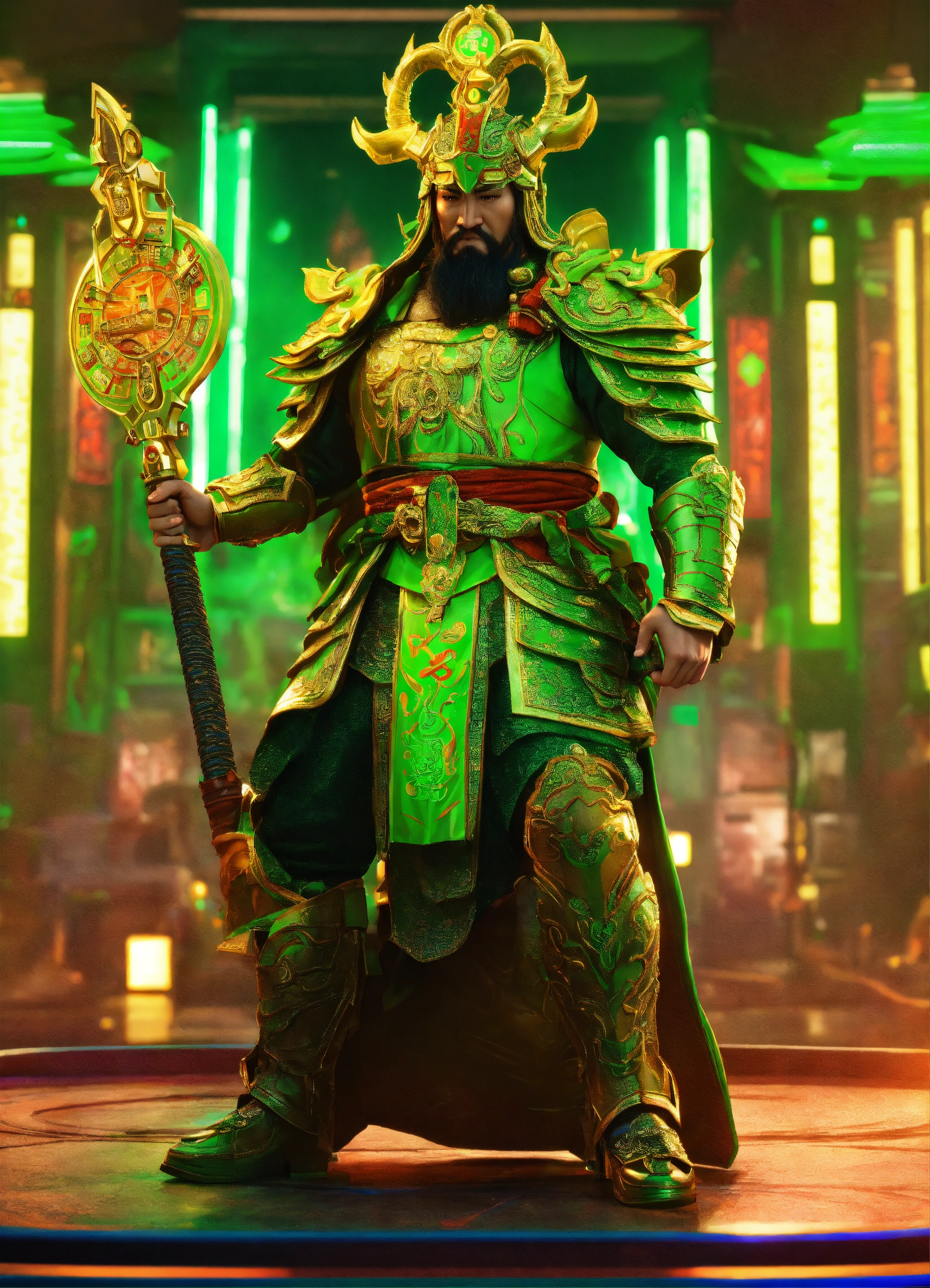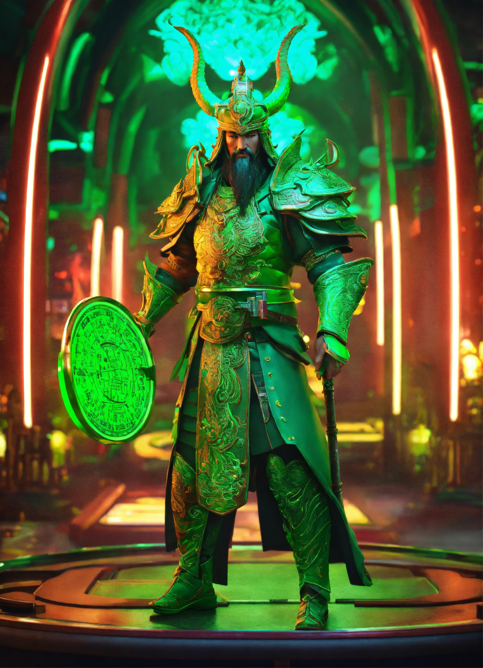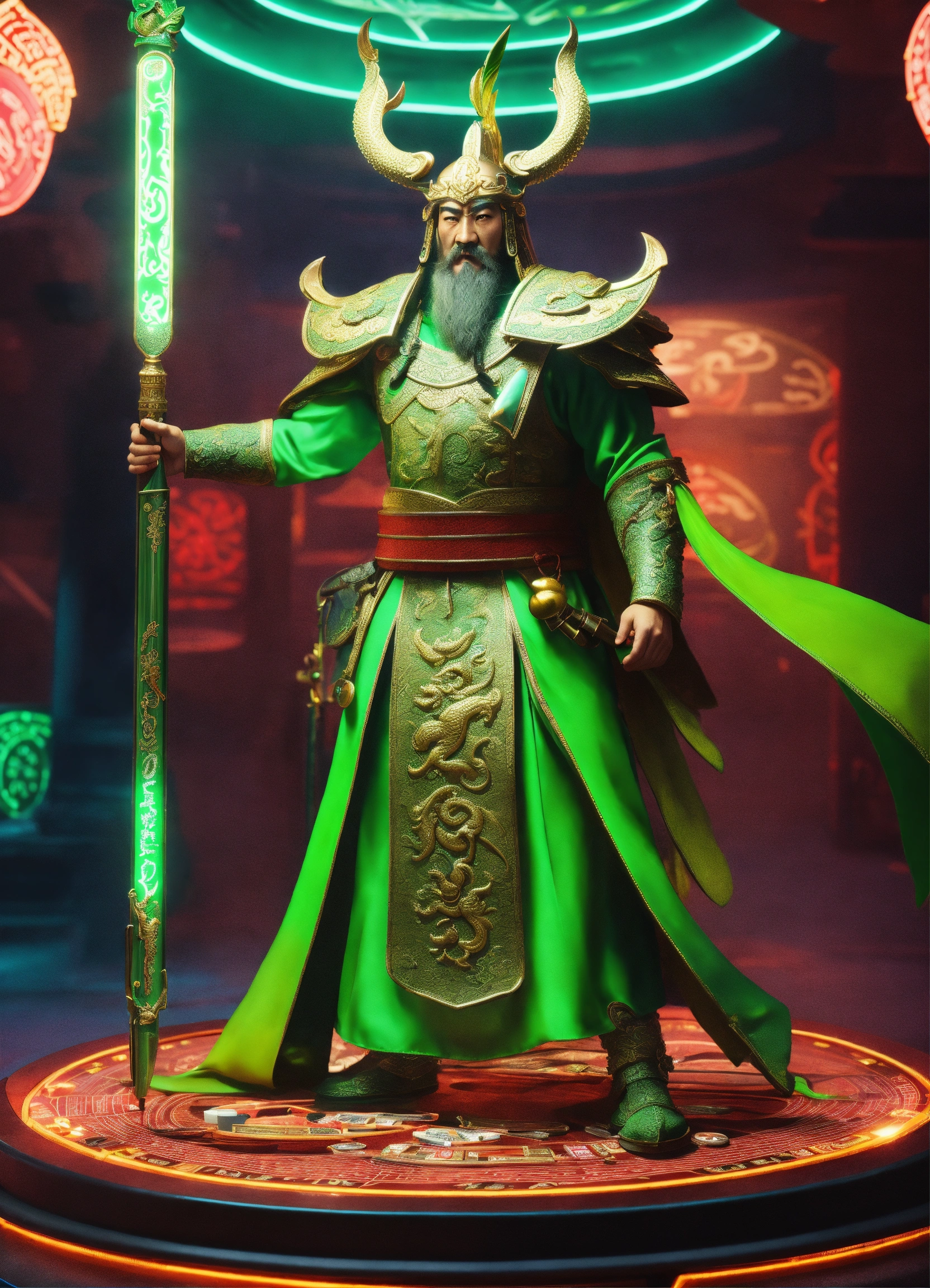 3d realistic guan yu is the god of war, futuristic, the green dragon crescent blade with hand, futuristic casino with slot machine location, 8k and neonlight