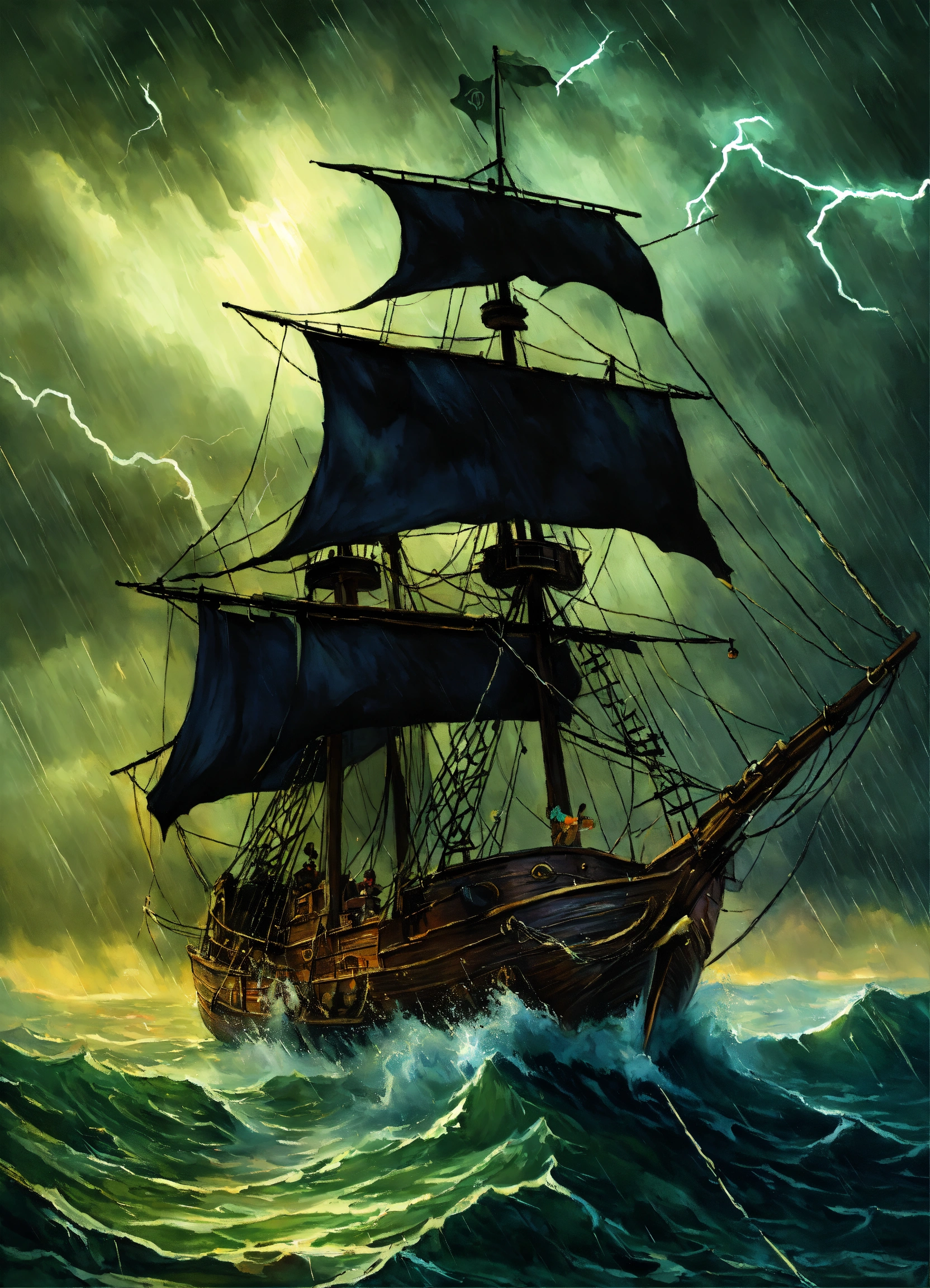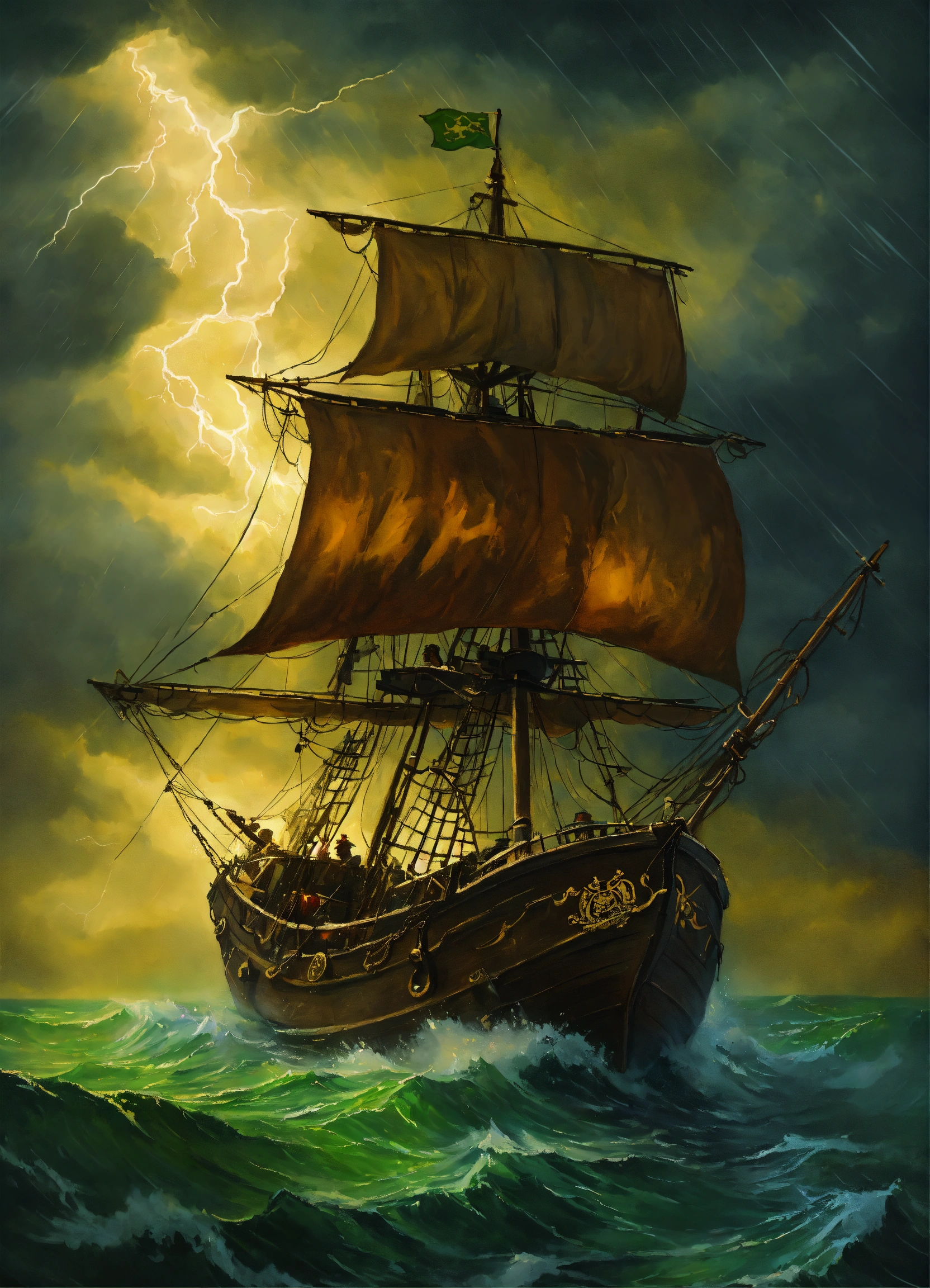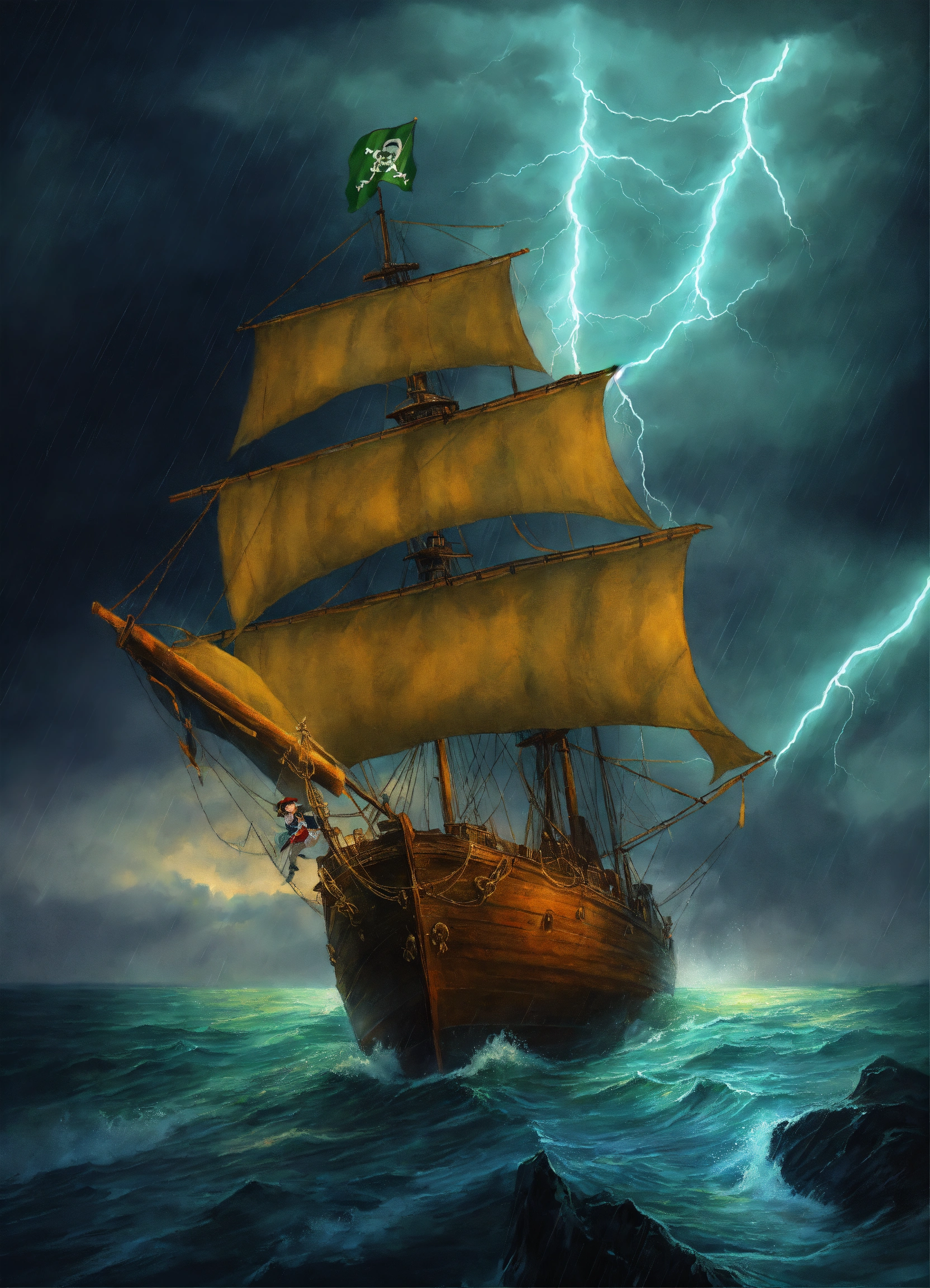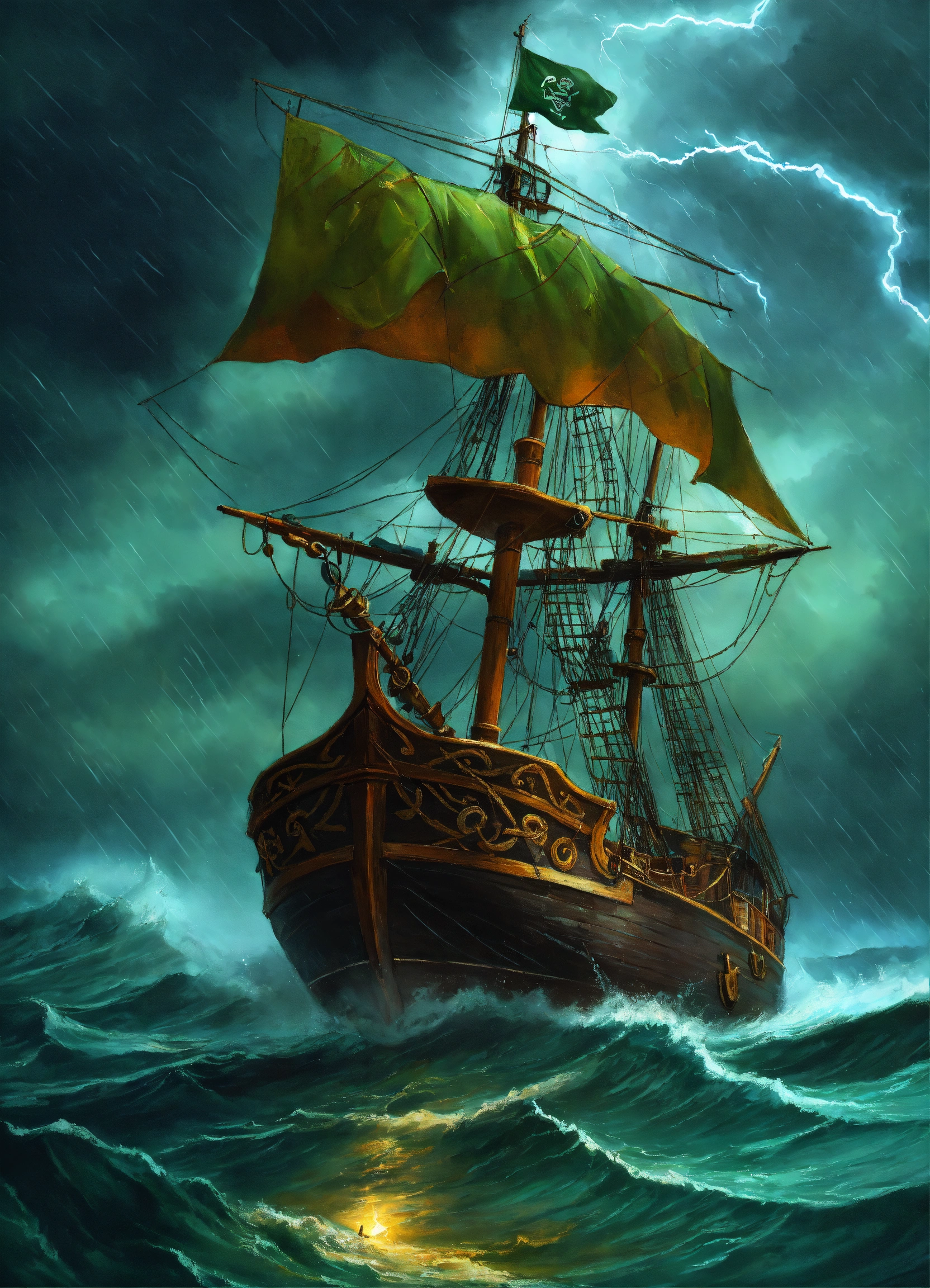 A painting of a celtic pirate during a storm. irish, celtic trinity knot pirate flag, pirate, rain, lightning