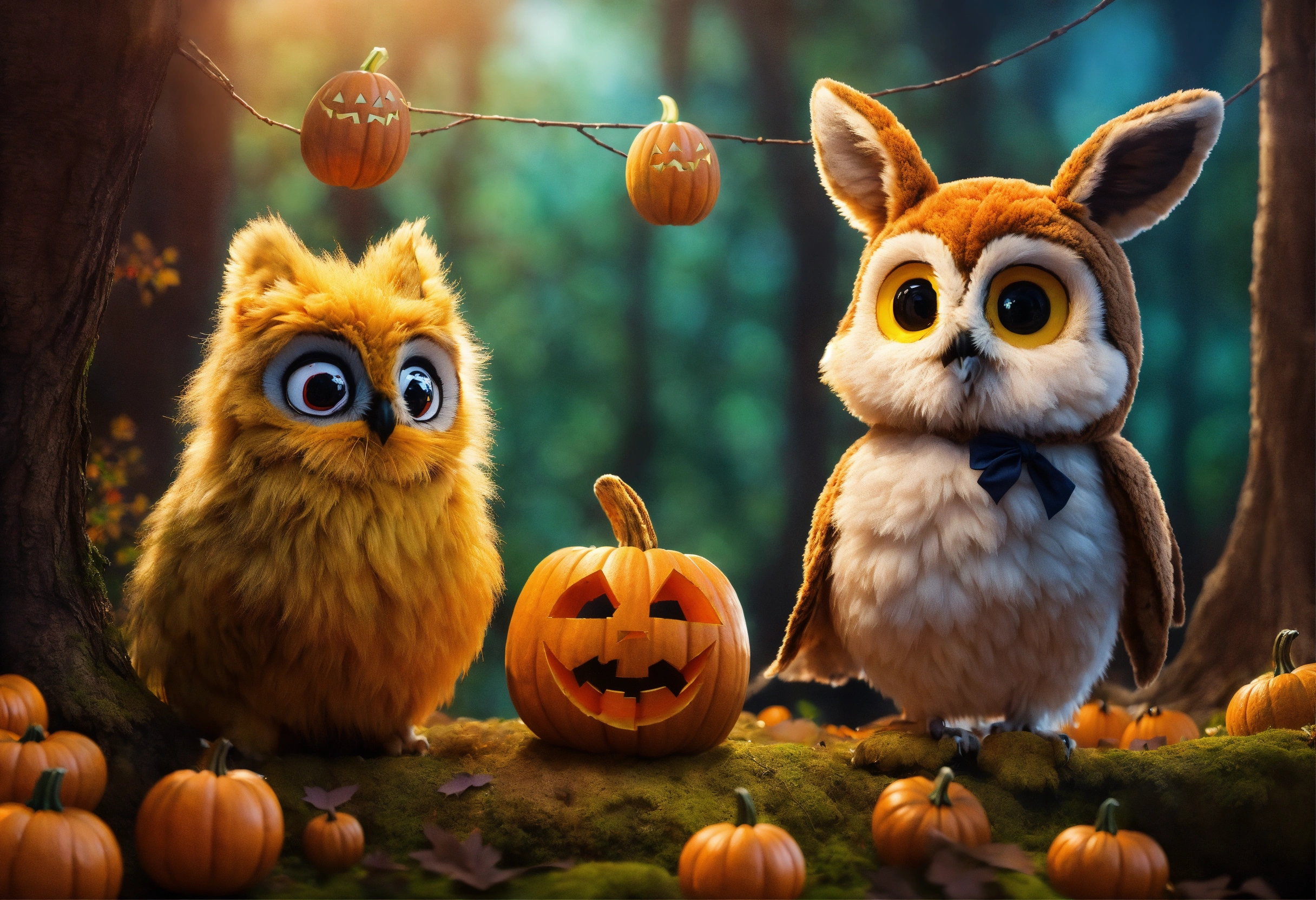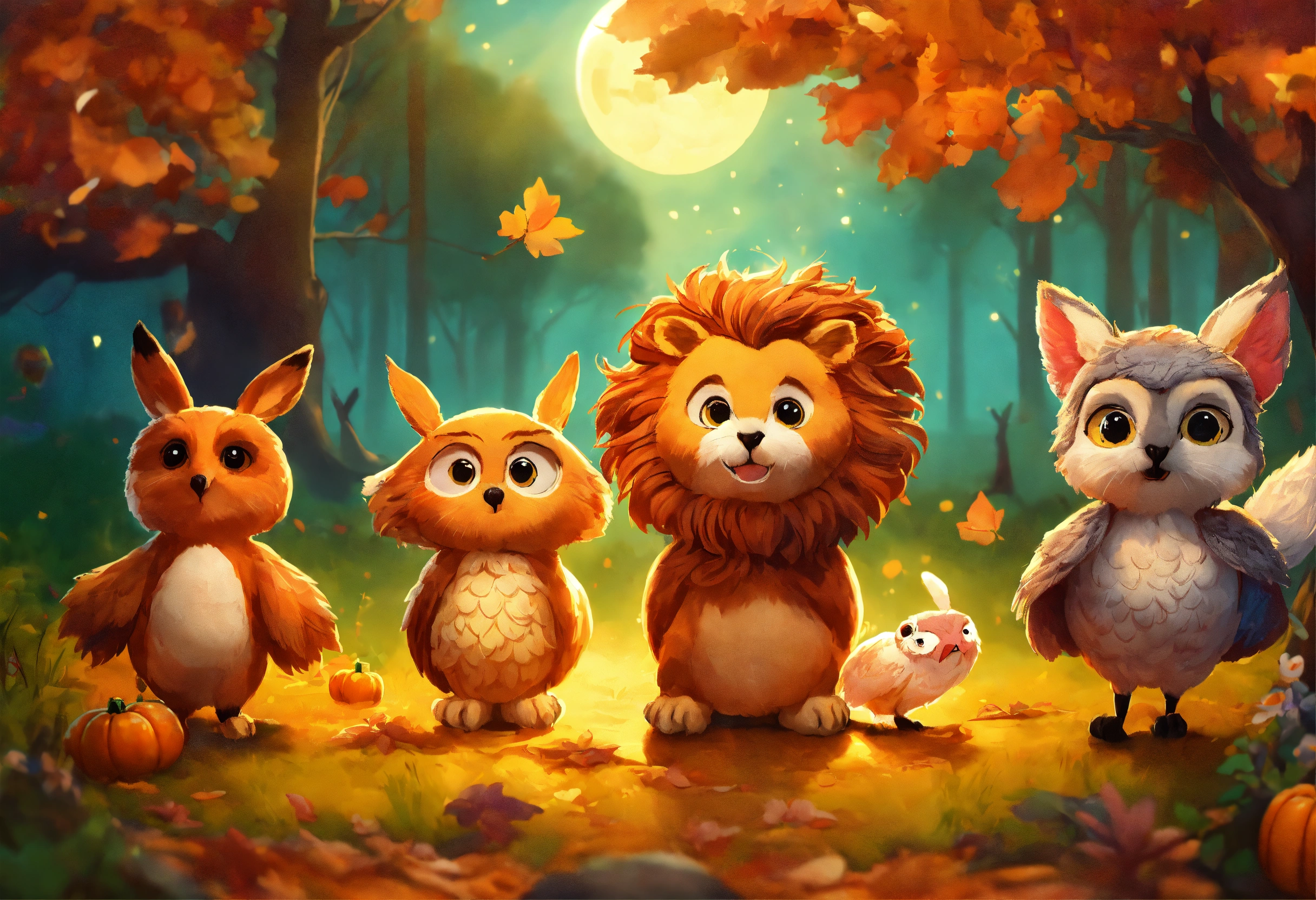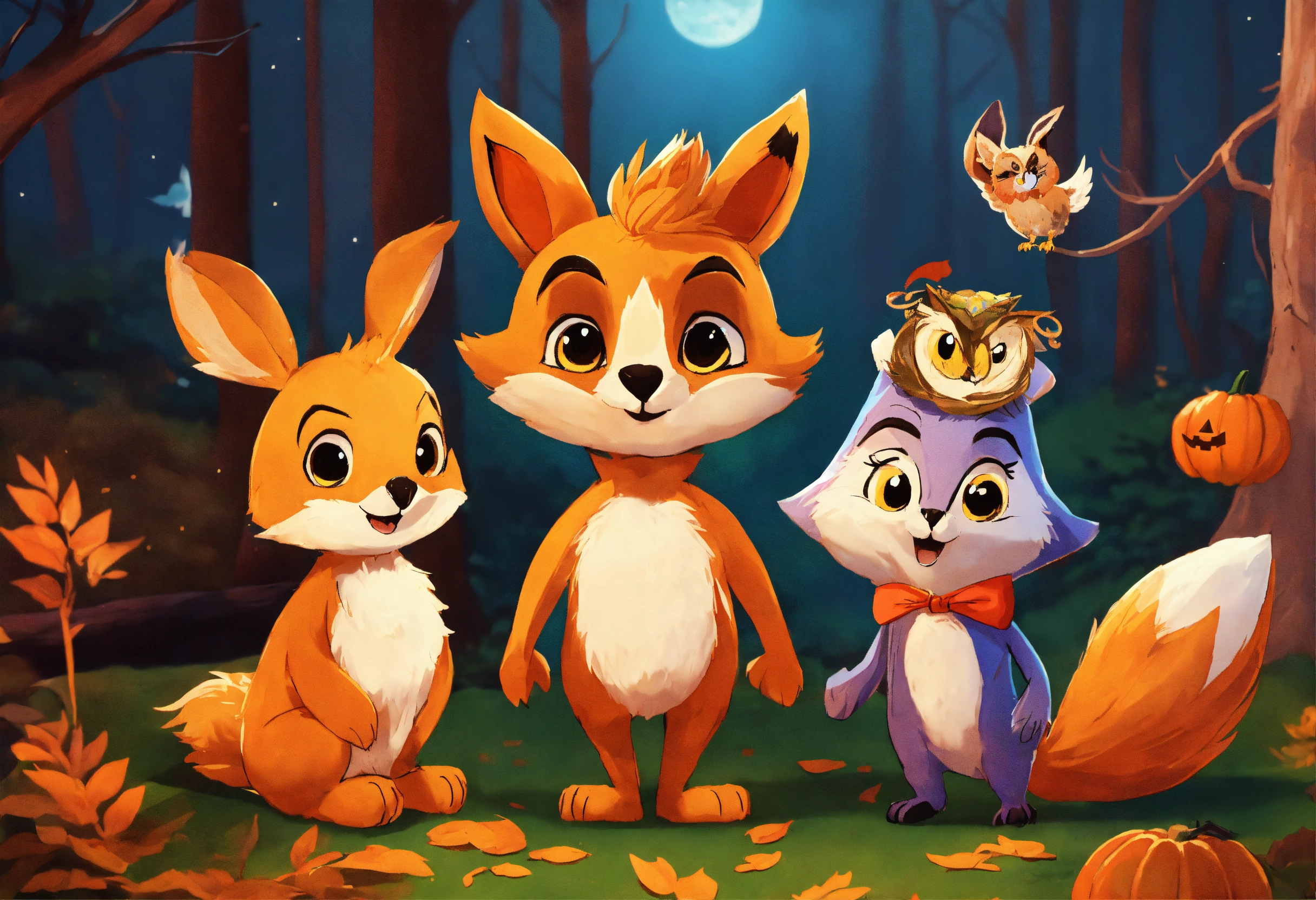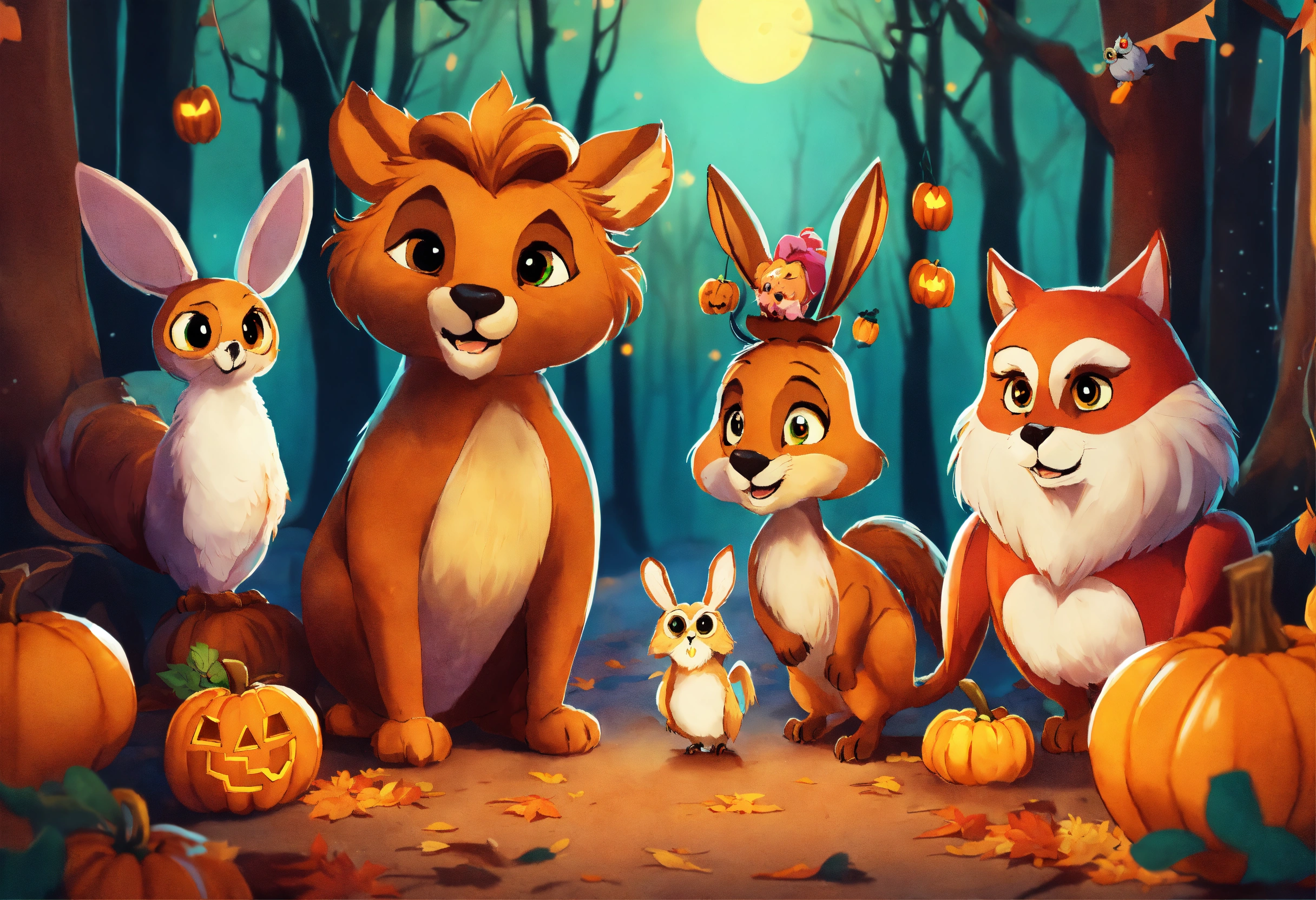 Leo the lion, olivia the owl, felix the fox and rosie the rabbit all happy together in a halloween forest