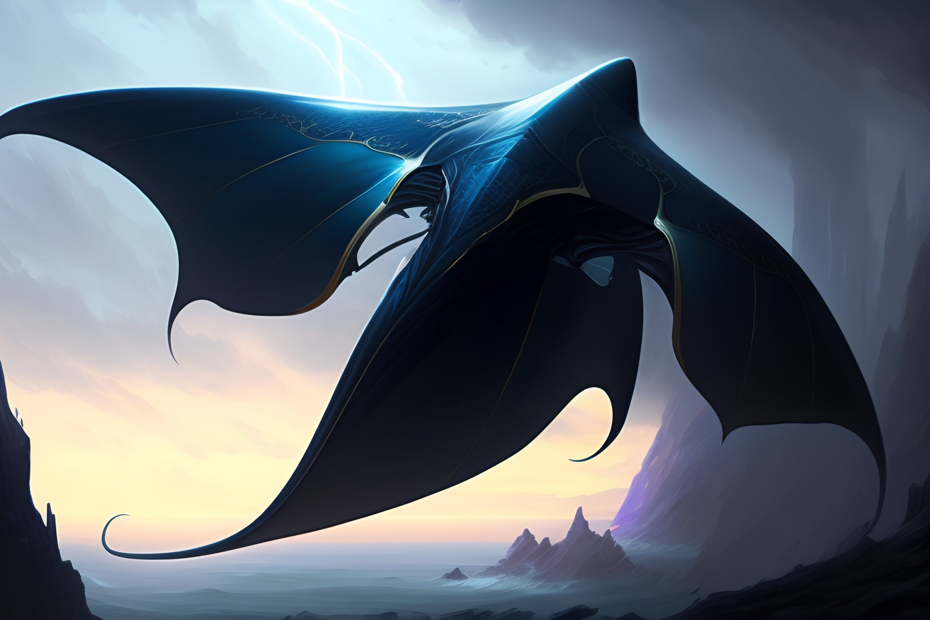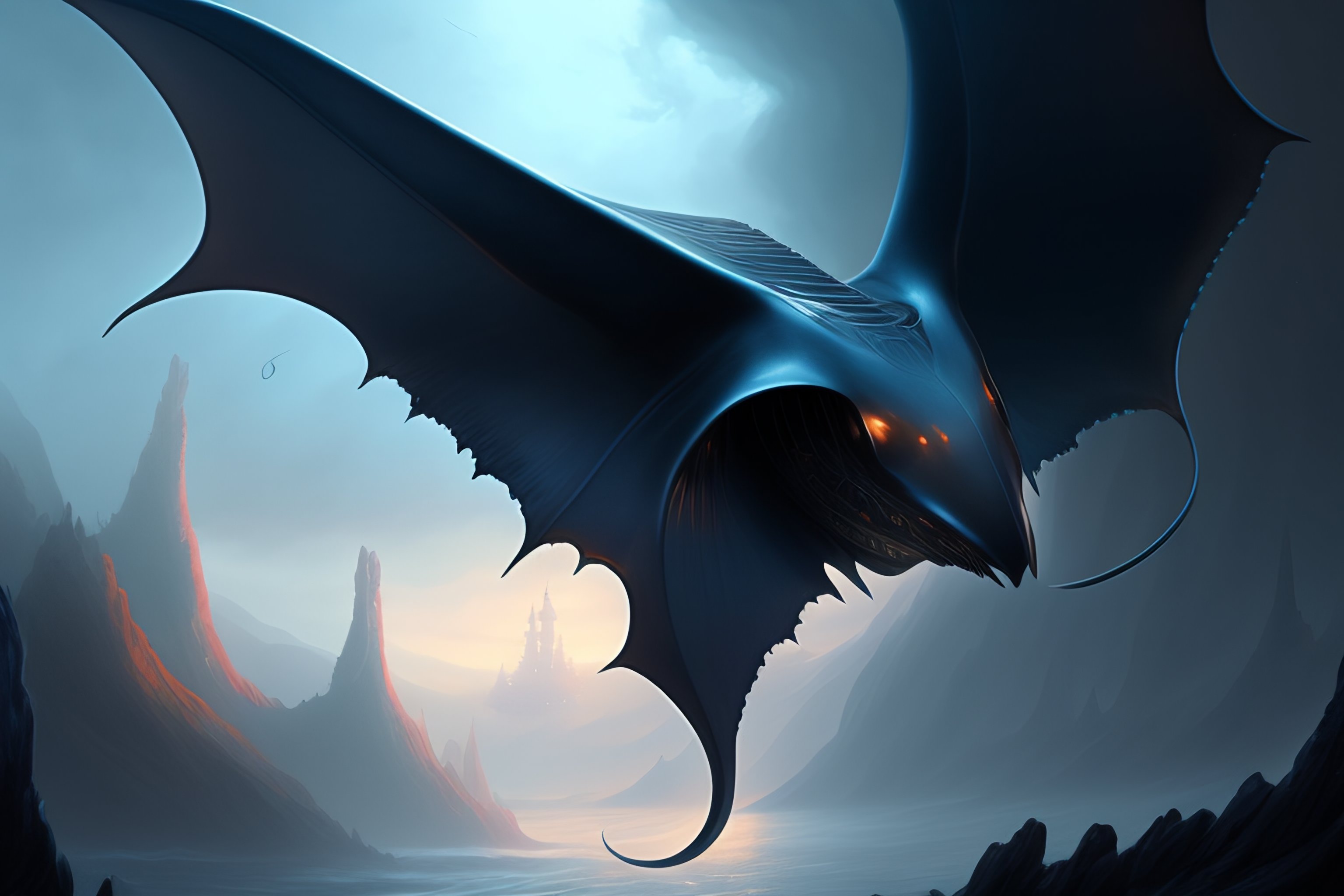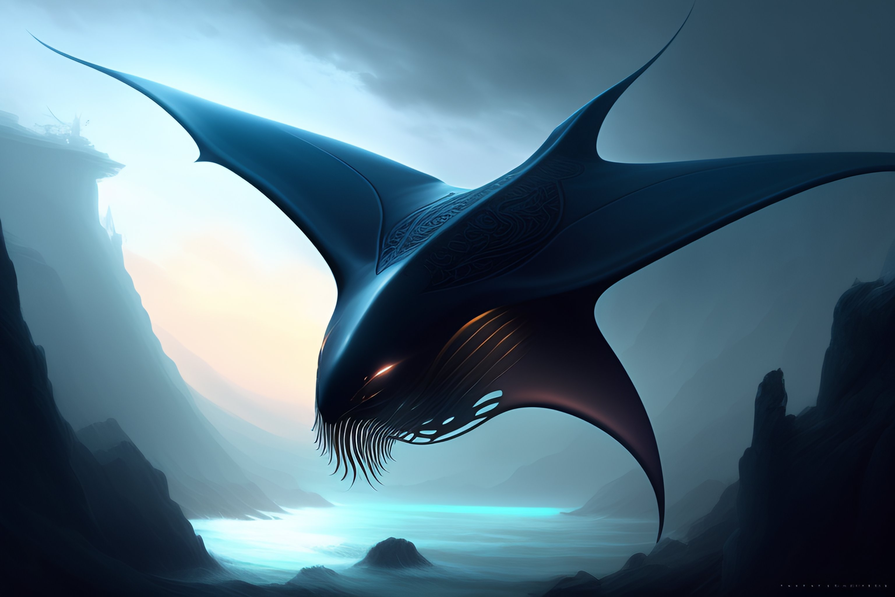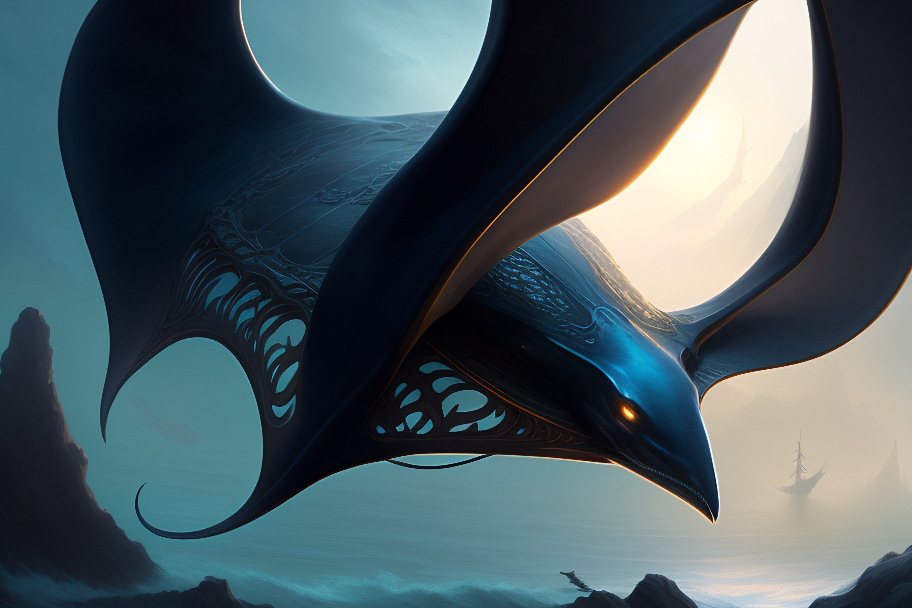 Establishing shot of a fantasy spectral dementor manta ray with a savage rib cage for a skull with extremely long thin tentacle hair attached to its skull floating in an endless dark void of complete darkness, dnd dungeons and dragons, fantasy character art, trending on artstation, by ross tran greg rukowski