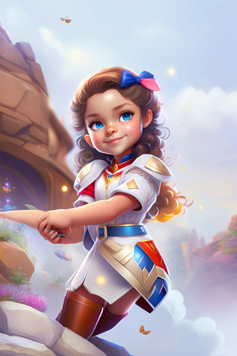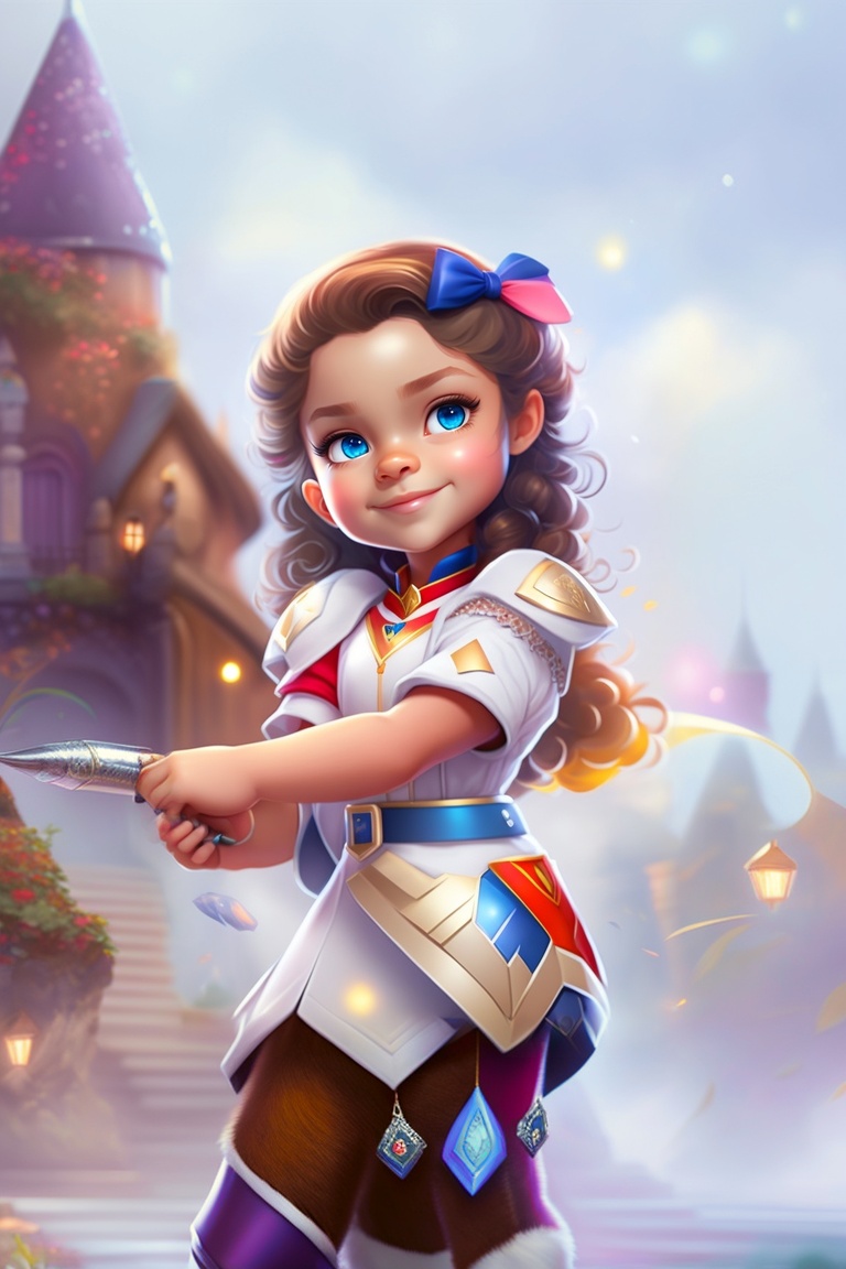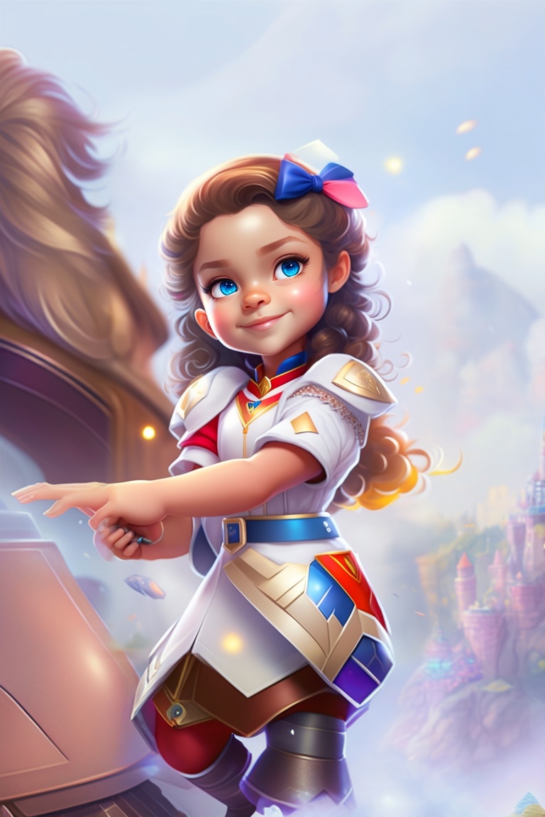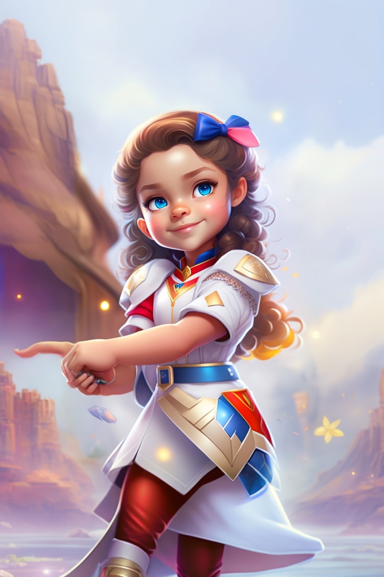 Super heroine, girl, dark blue eyes, light brown curly hair, brazilian, 8 years old, white skin, with colorful clothes, cartoon, 4k, vibrant colors, disney, trending on artstation, with a lion mascot, cute, realistic, a magical forest in the background, cinematic, high details