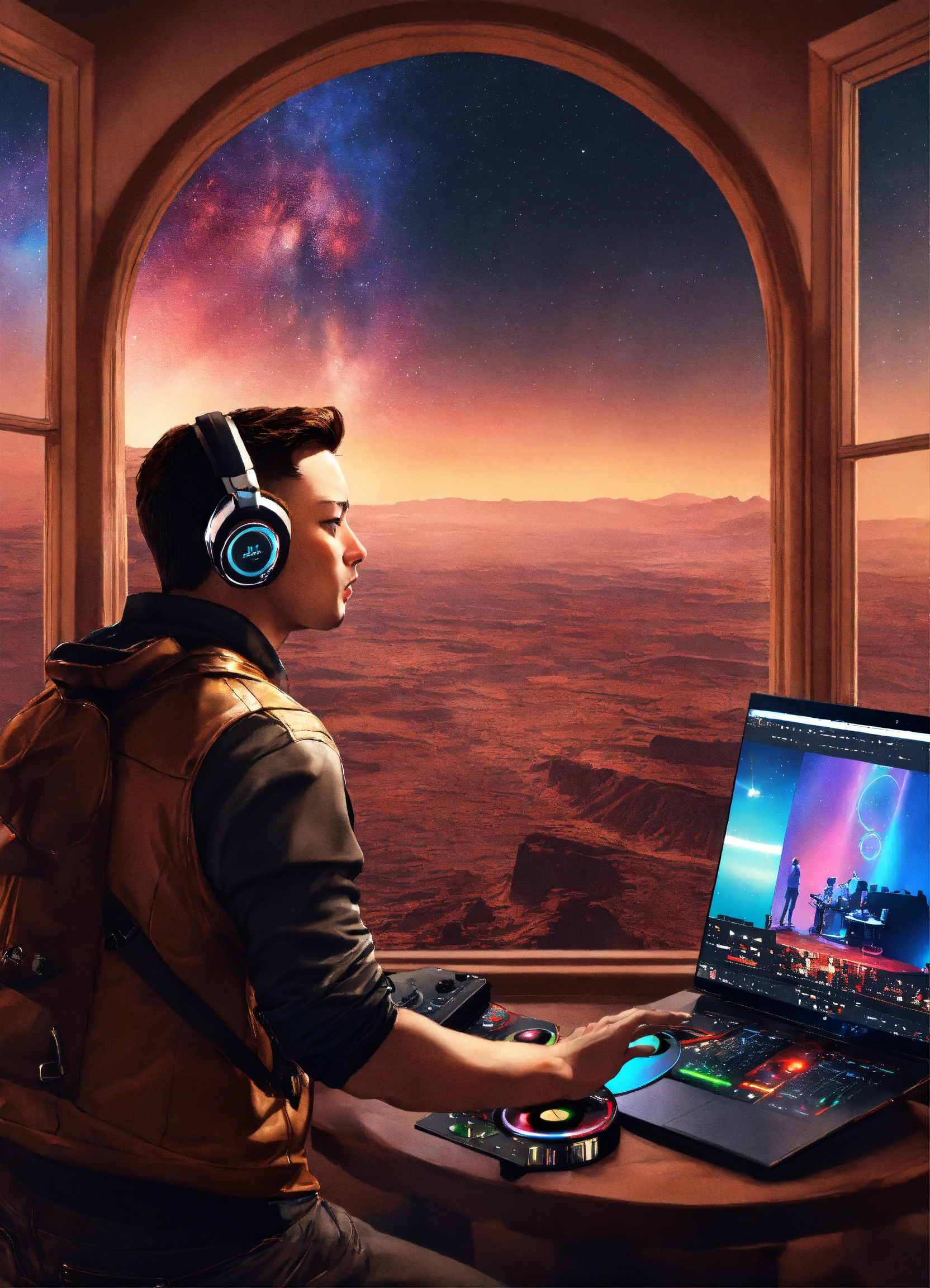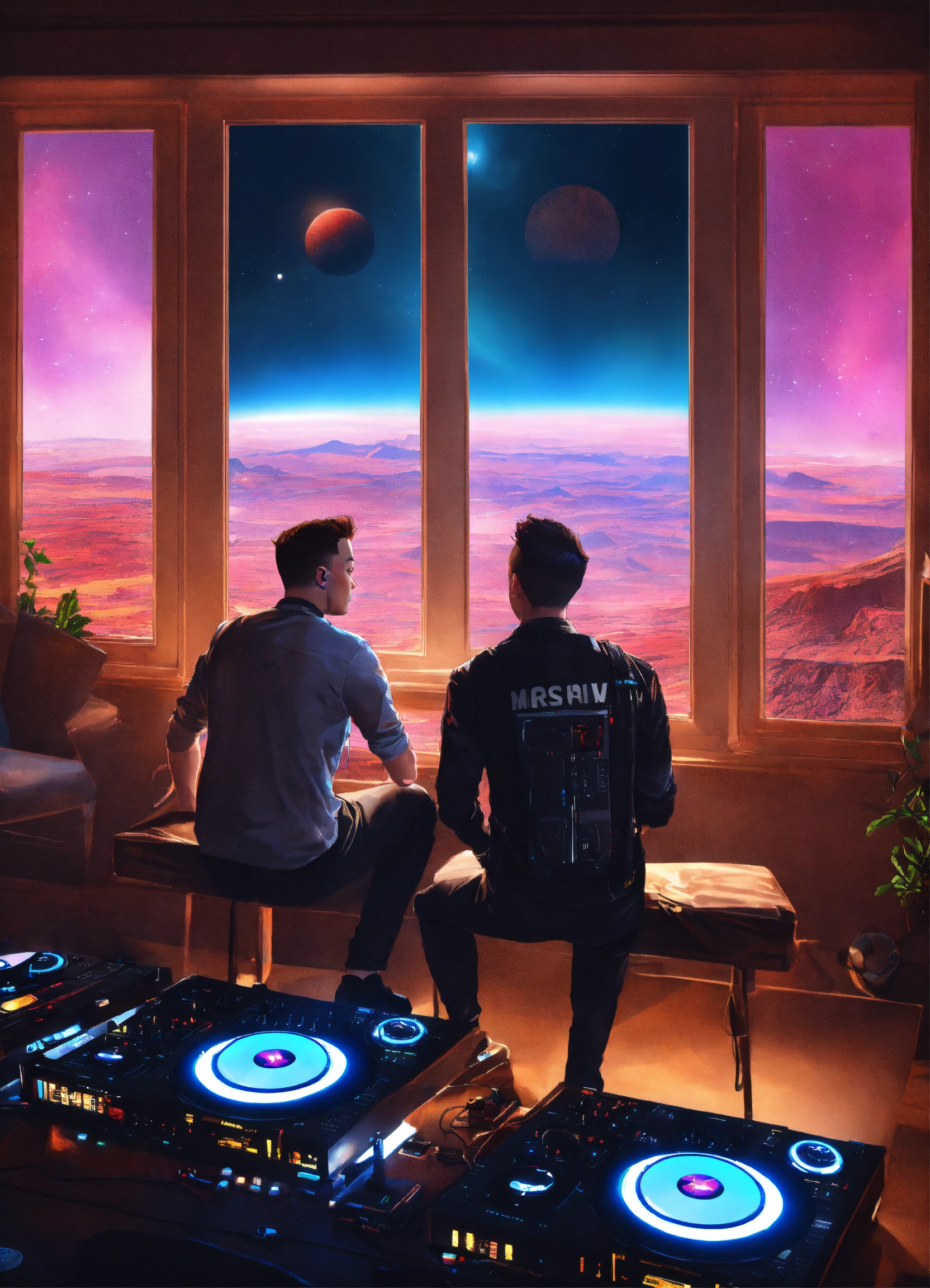 Dj at concert with a window at his back with mars view 4k realistic and elon musk next to dj