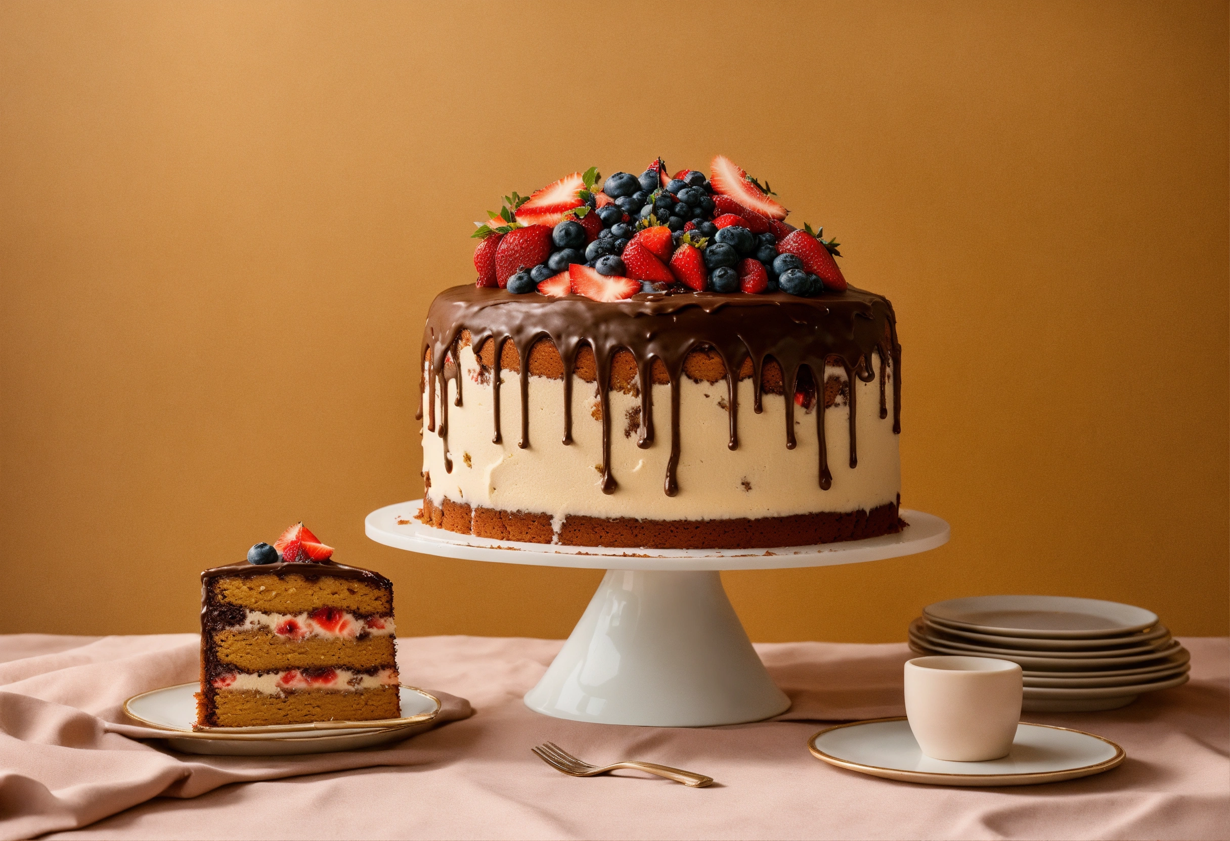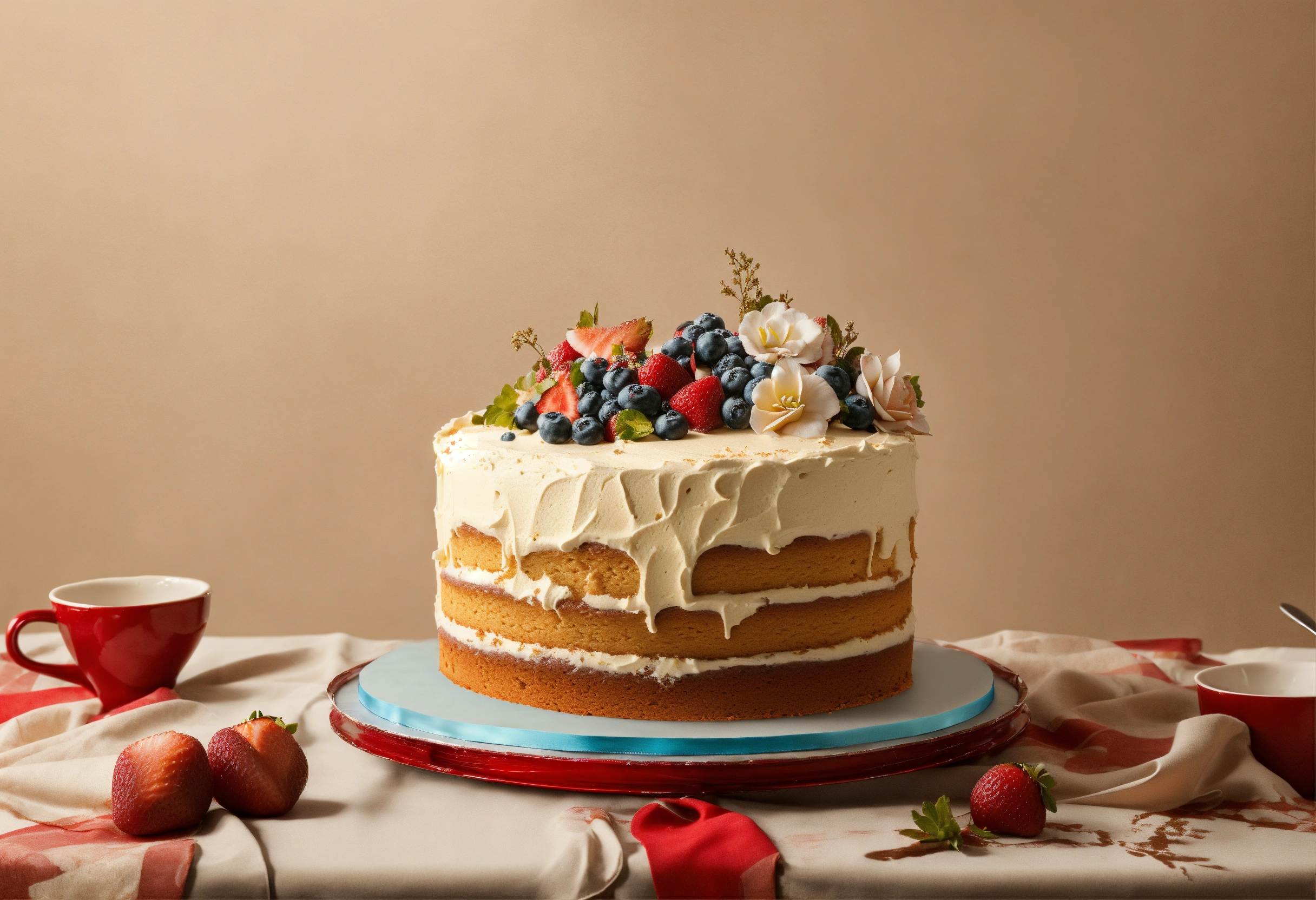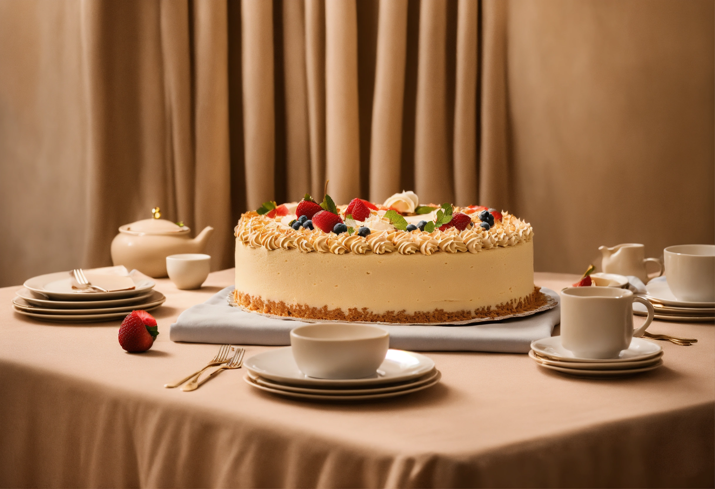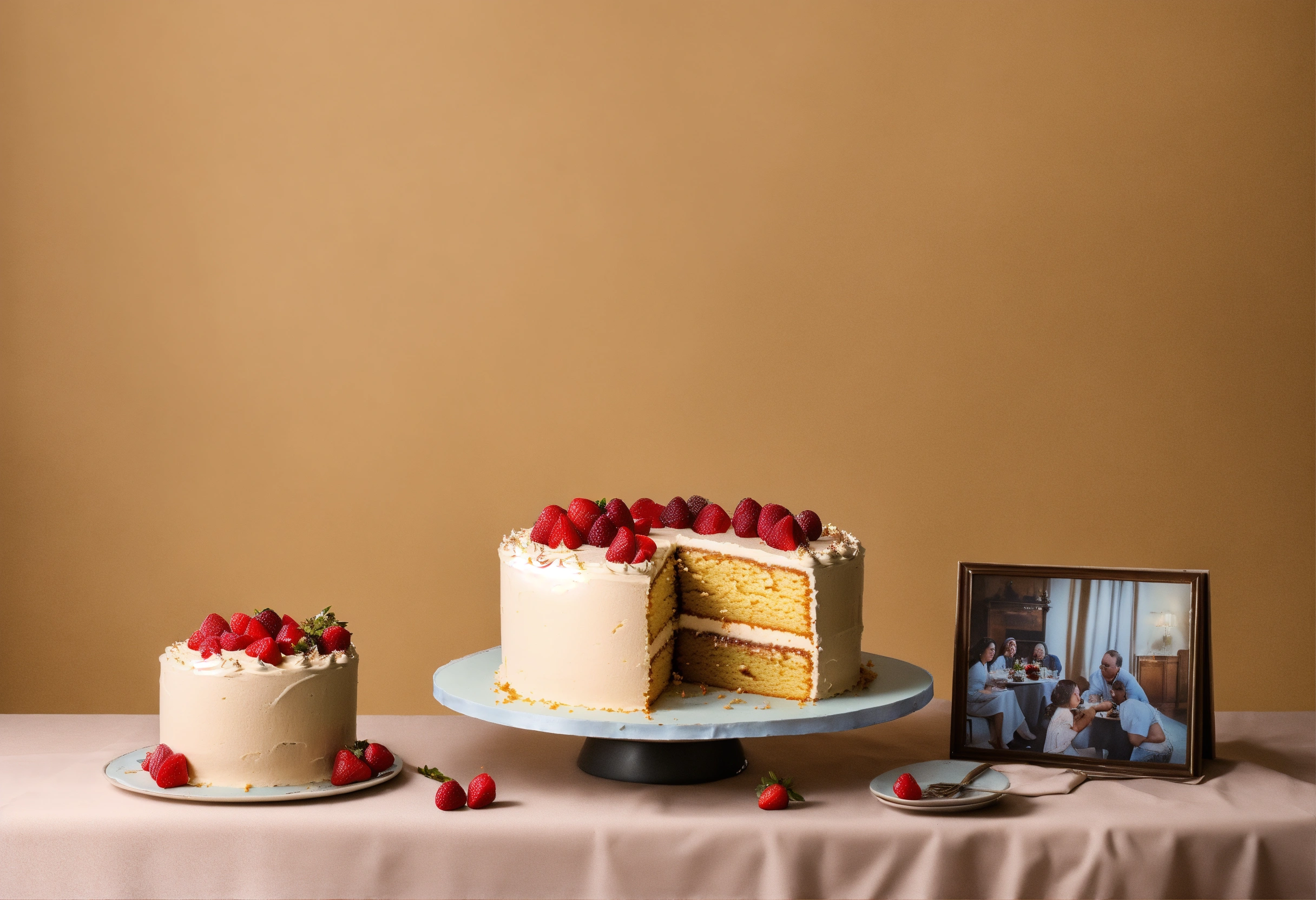Light beige background; just a cake on a table with a tablecloth; photos of people stuck on the cake; no frills