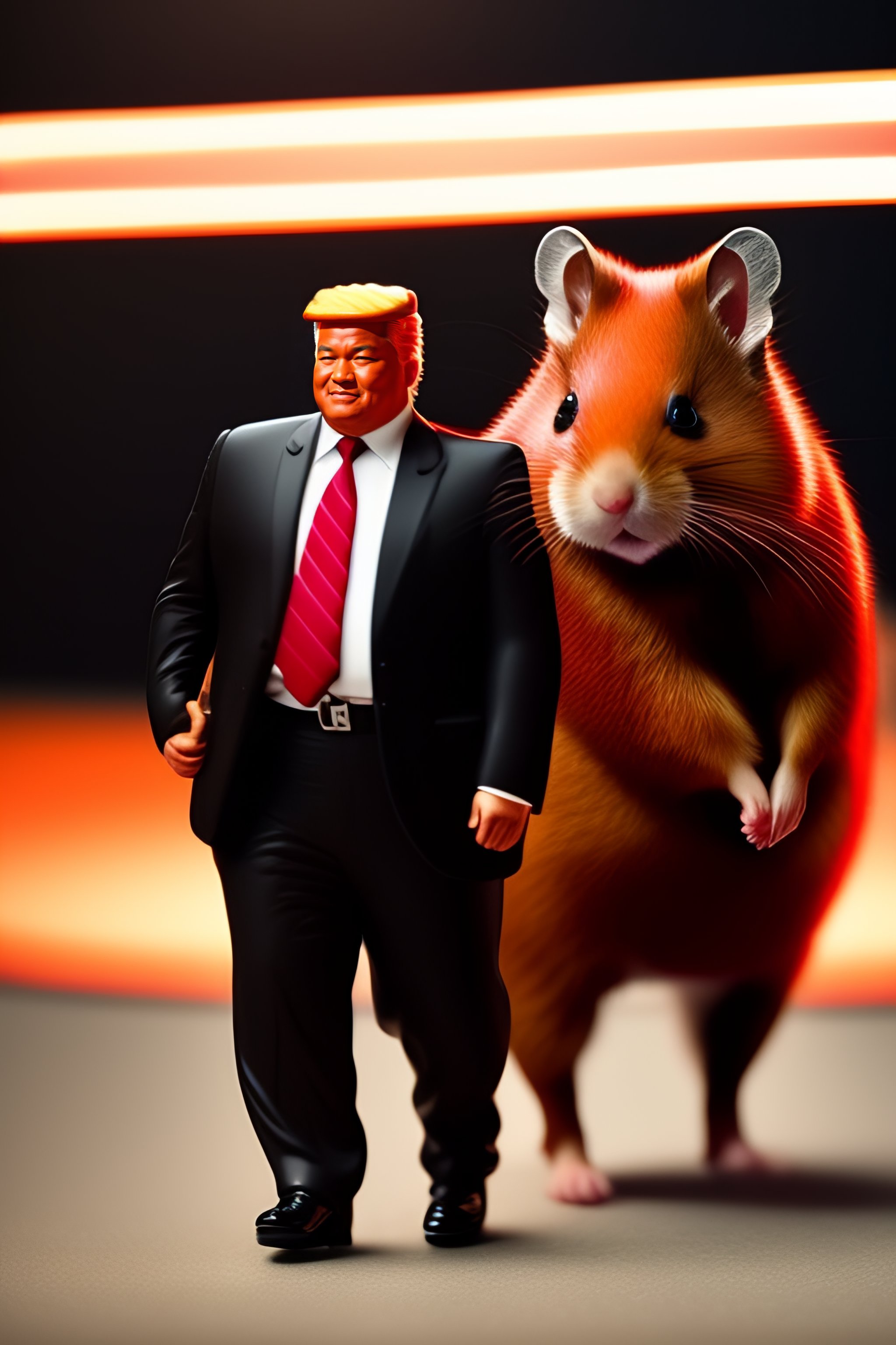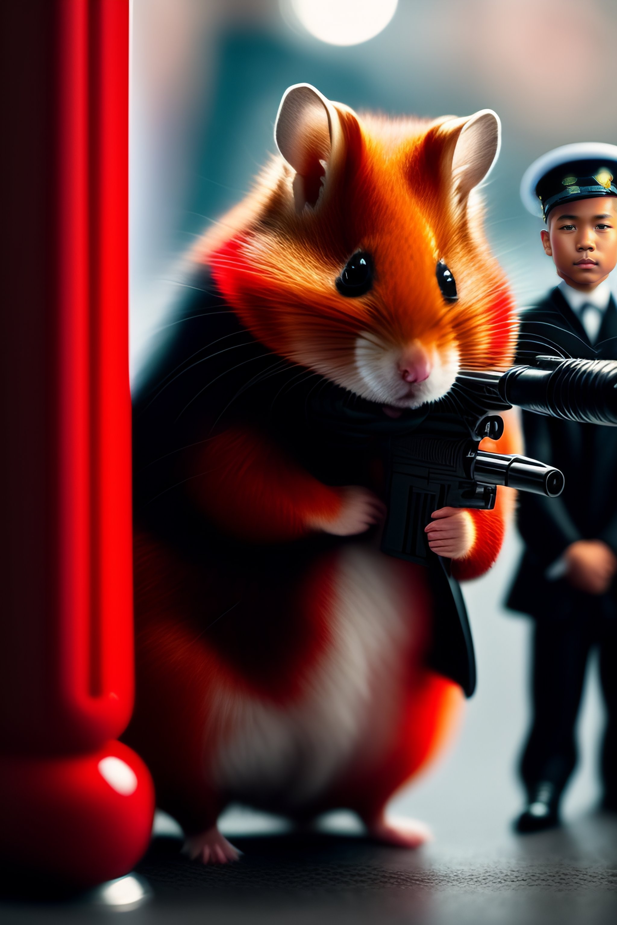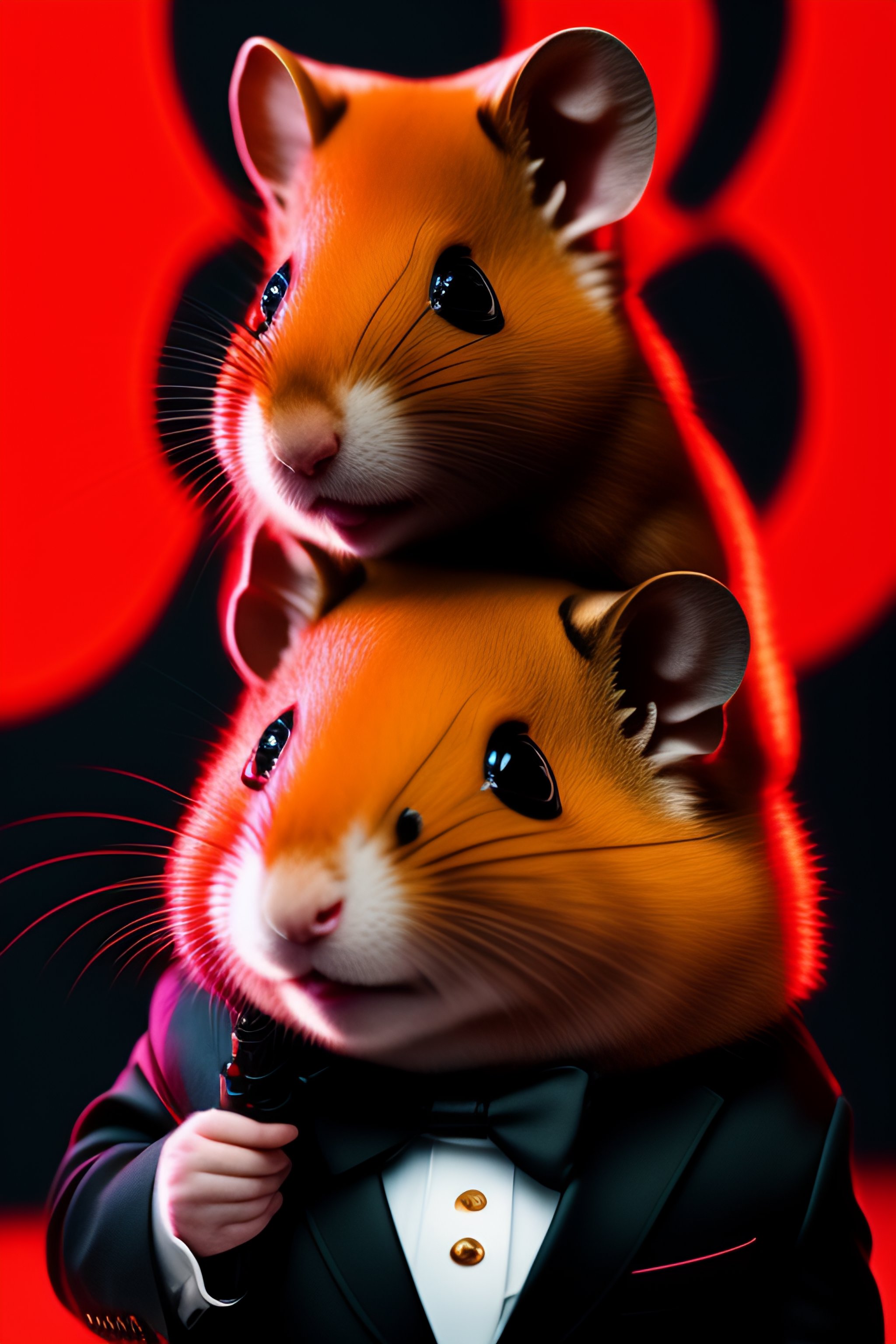 Anthropomorphic red hamster in a bodyguard black suit with bazooka