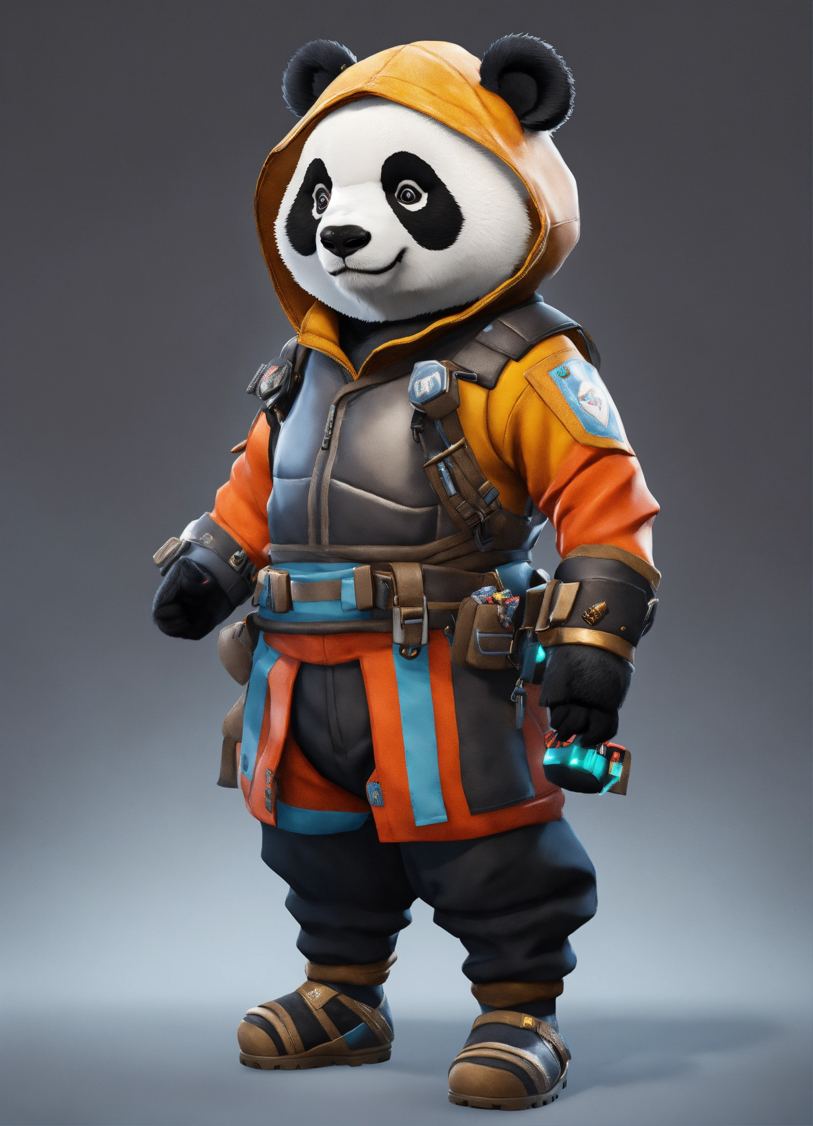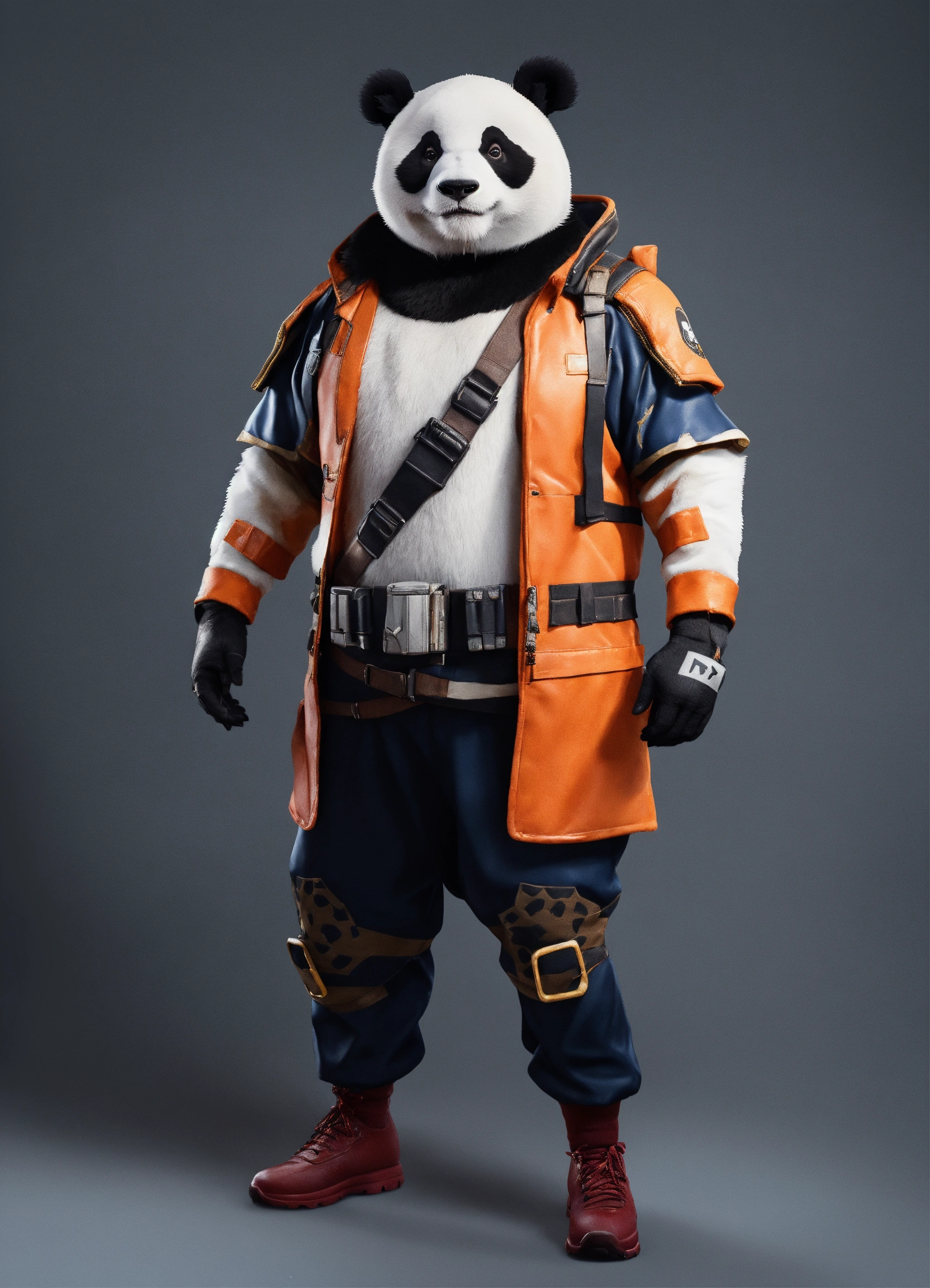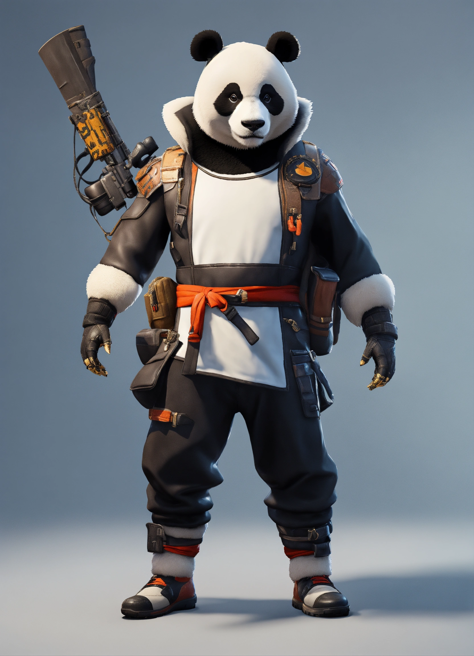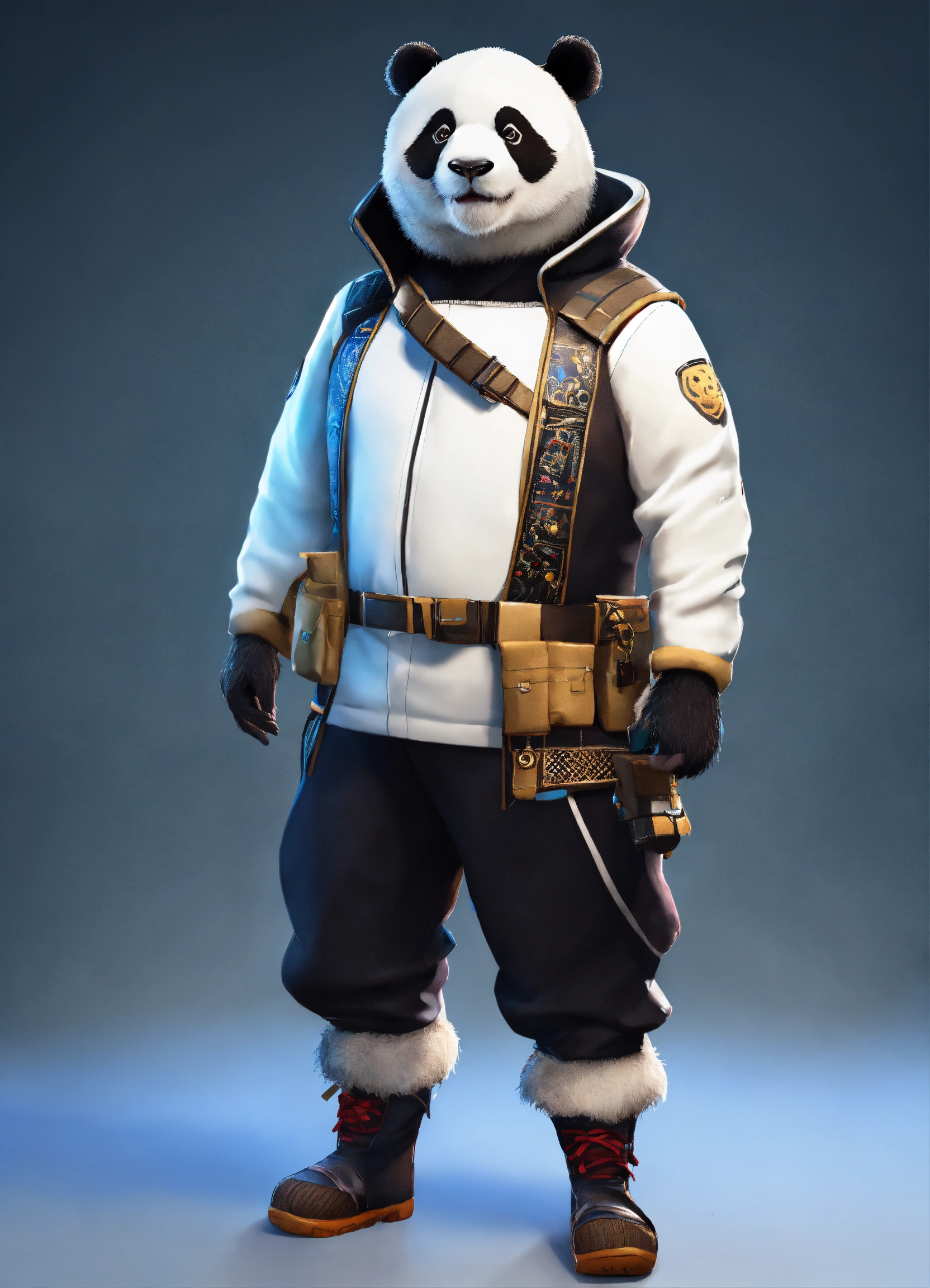 A photograph of a costume of a panda for a male character with fortnite style, male costume, white background, turnaround, full body