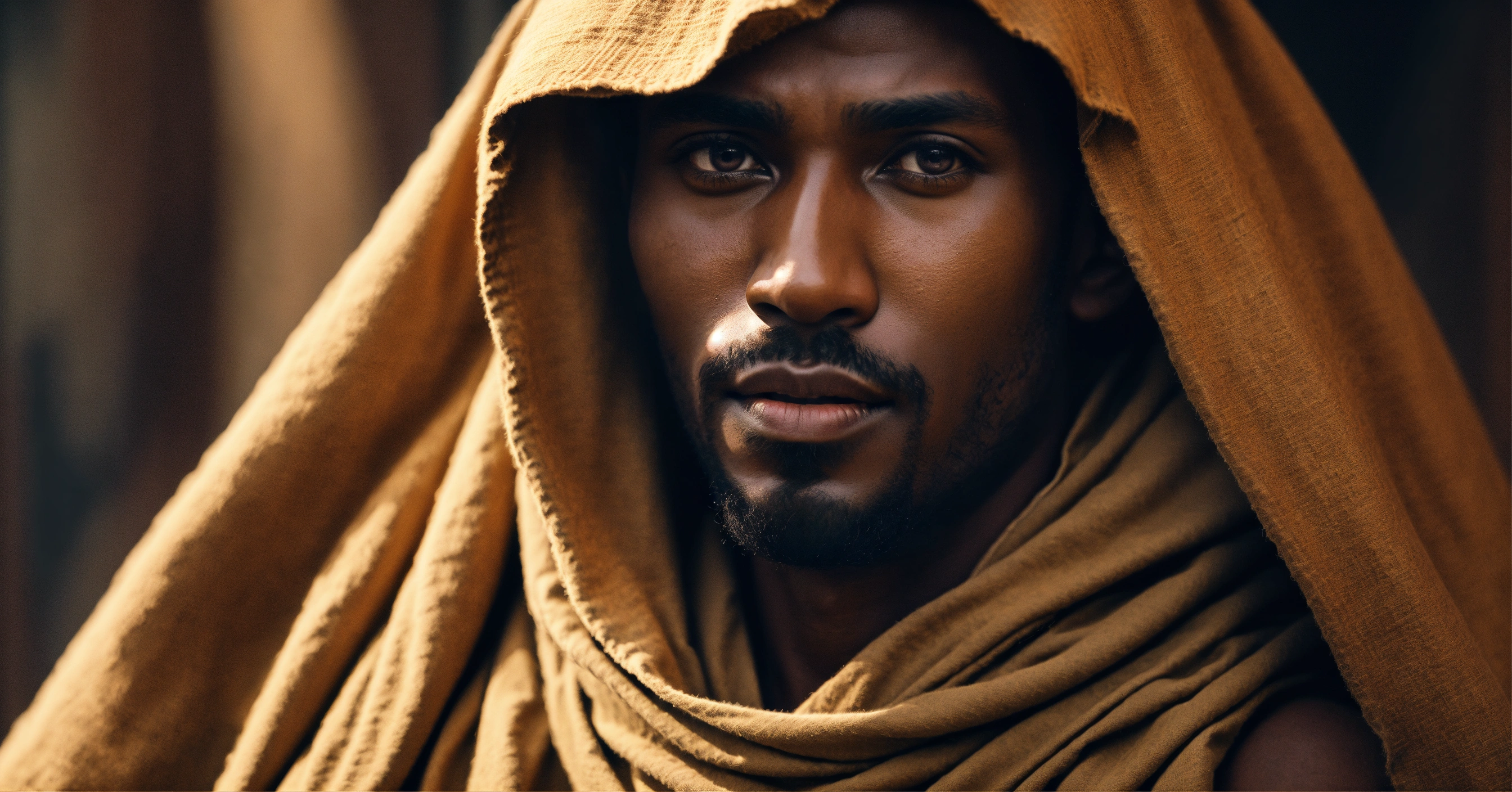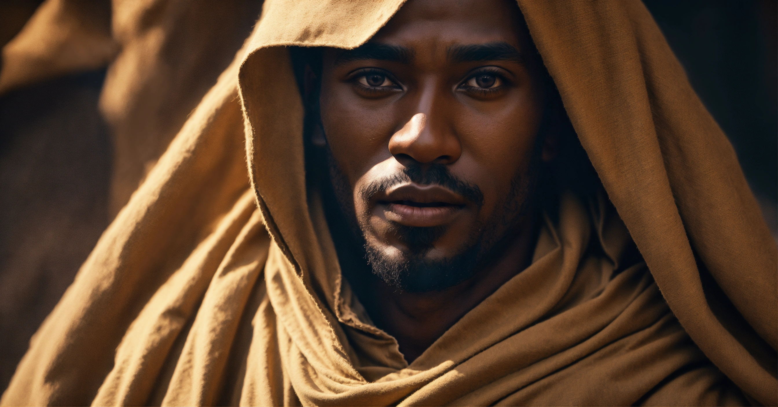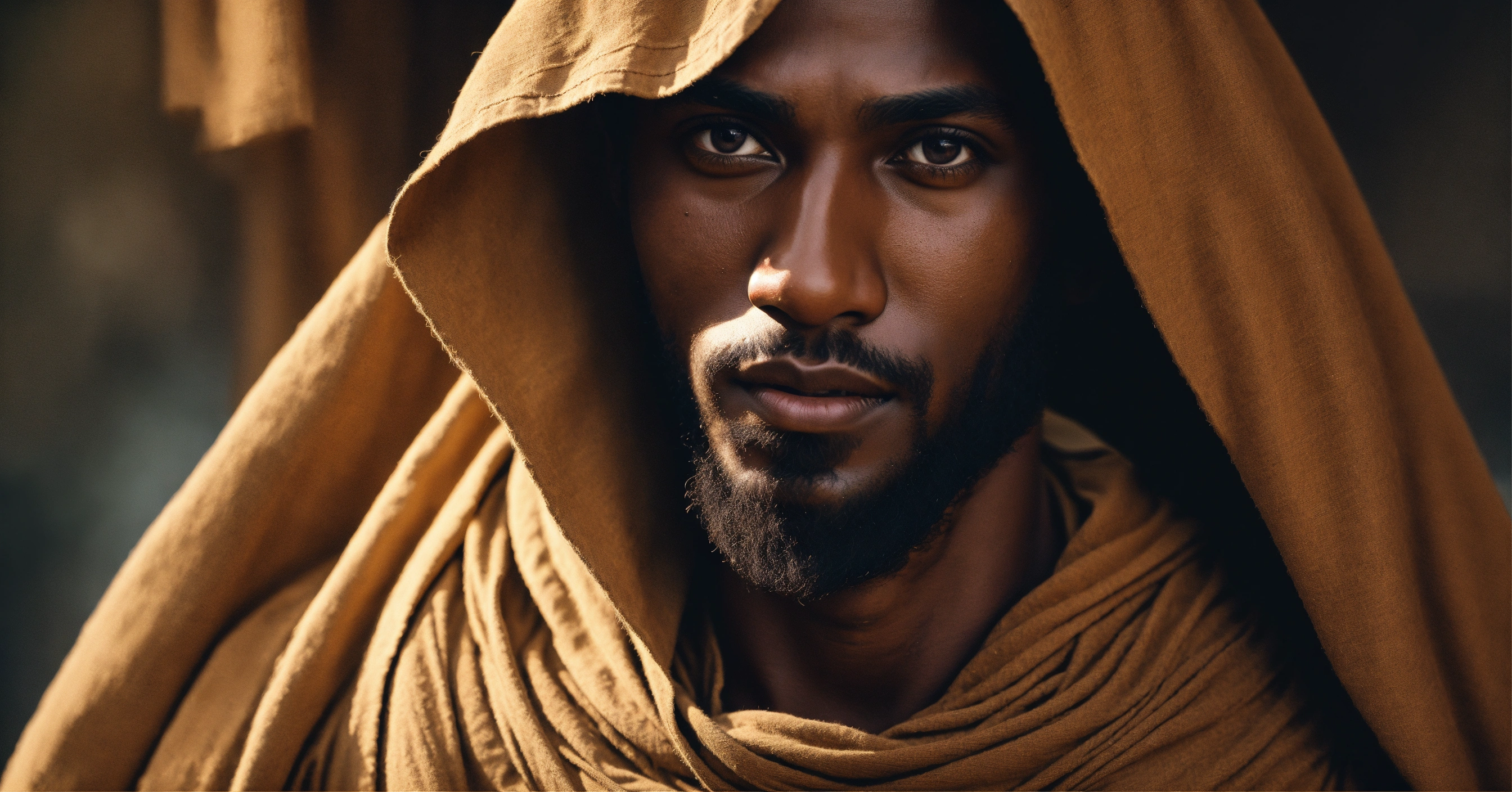 Illustrate a view of a handsome, strong, broad-shouldered ethiopian man. he is wearing a long tan robe of rough sackcloth. he is very dark-skinned. there is a look of peace and safety on his face. head-to-toe view. fantasy. photorealistic 8k