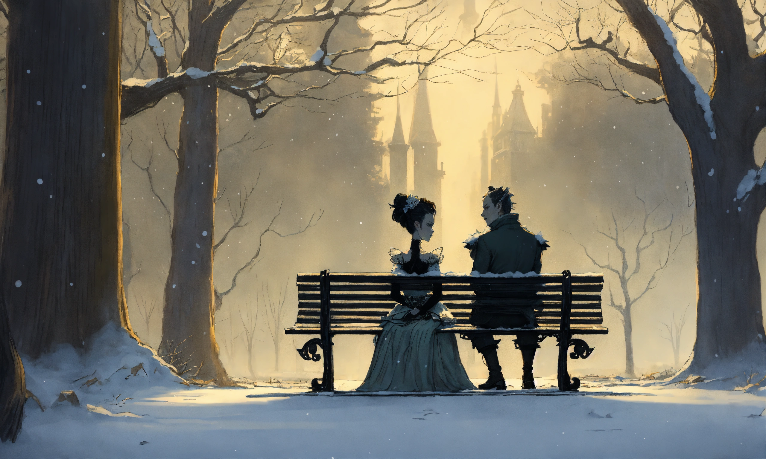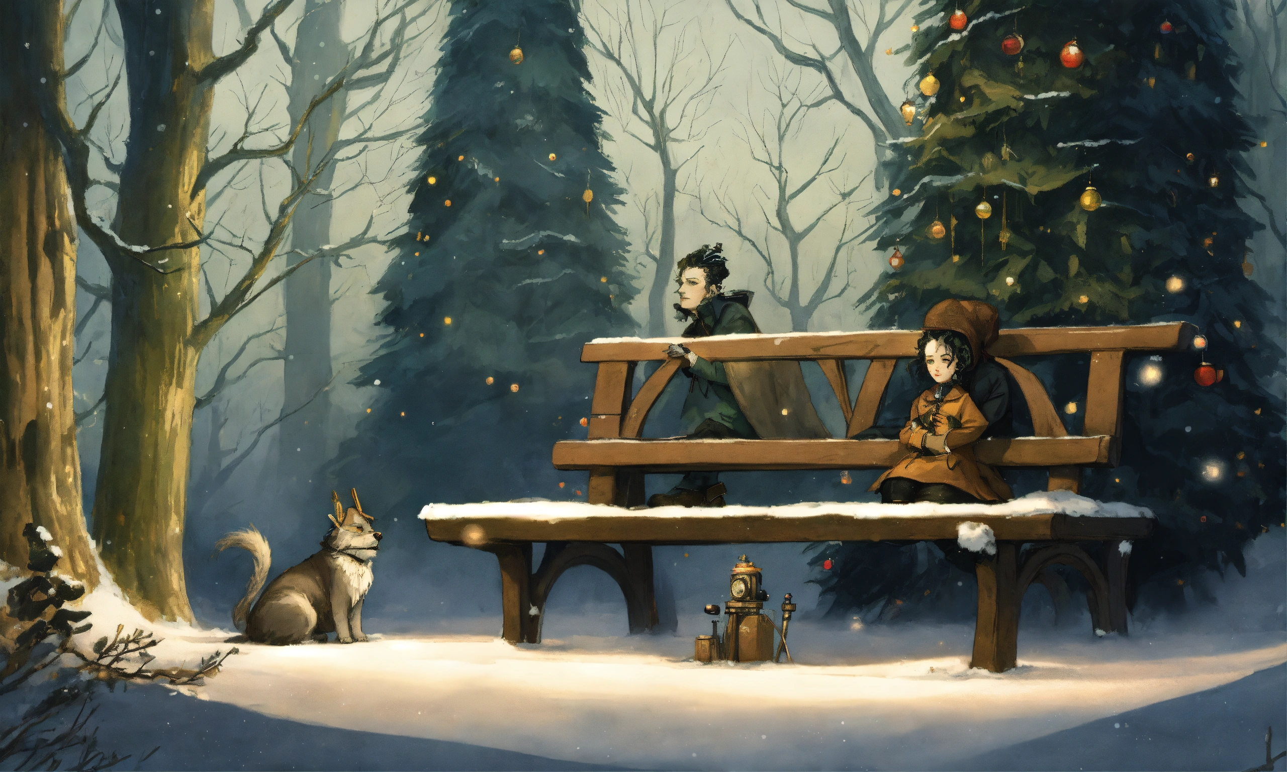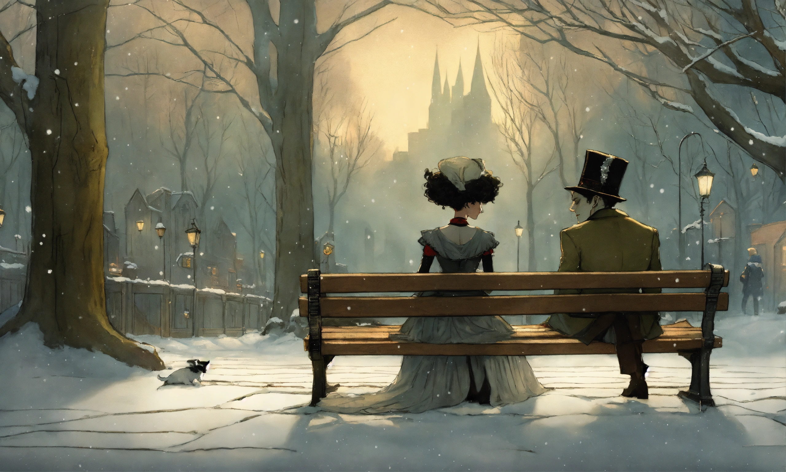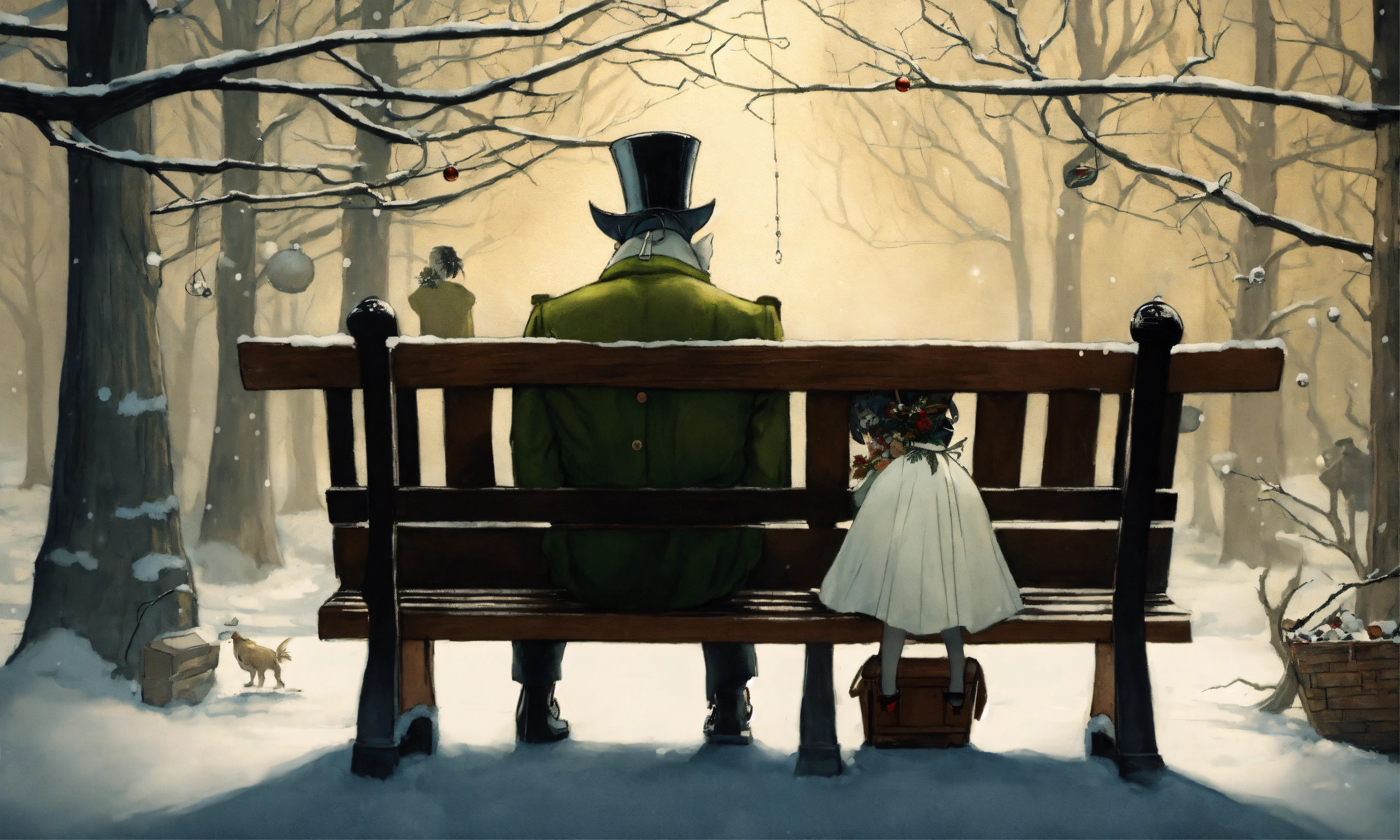 By gris grimly, maurice sendak, frankenstein and bride of frankenstein sitting on a park bench at christmas, snow, ice, pine trees in the style of jean-baptiste monge, tim burton, remedios varo, juni ito, giorgio de chirico 8k resolution concept art trending on artstation hyperdetailed medium shot, vignette 8k resolution hyperdetailed intricate liminal eerie precisionism dslr filmic, cinematic, sharp focus, brightly lit.
