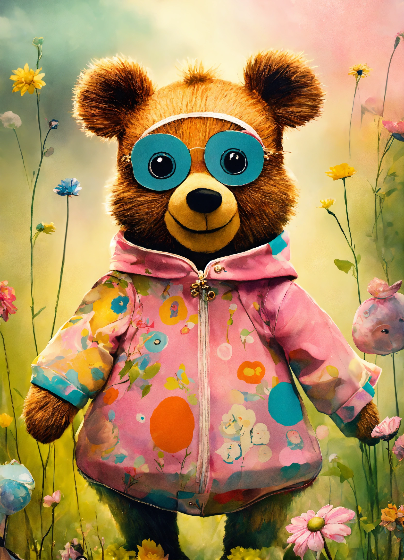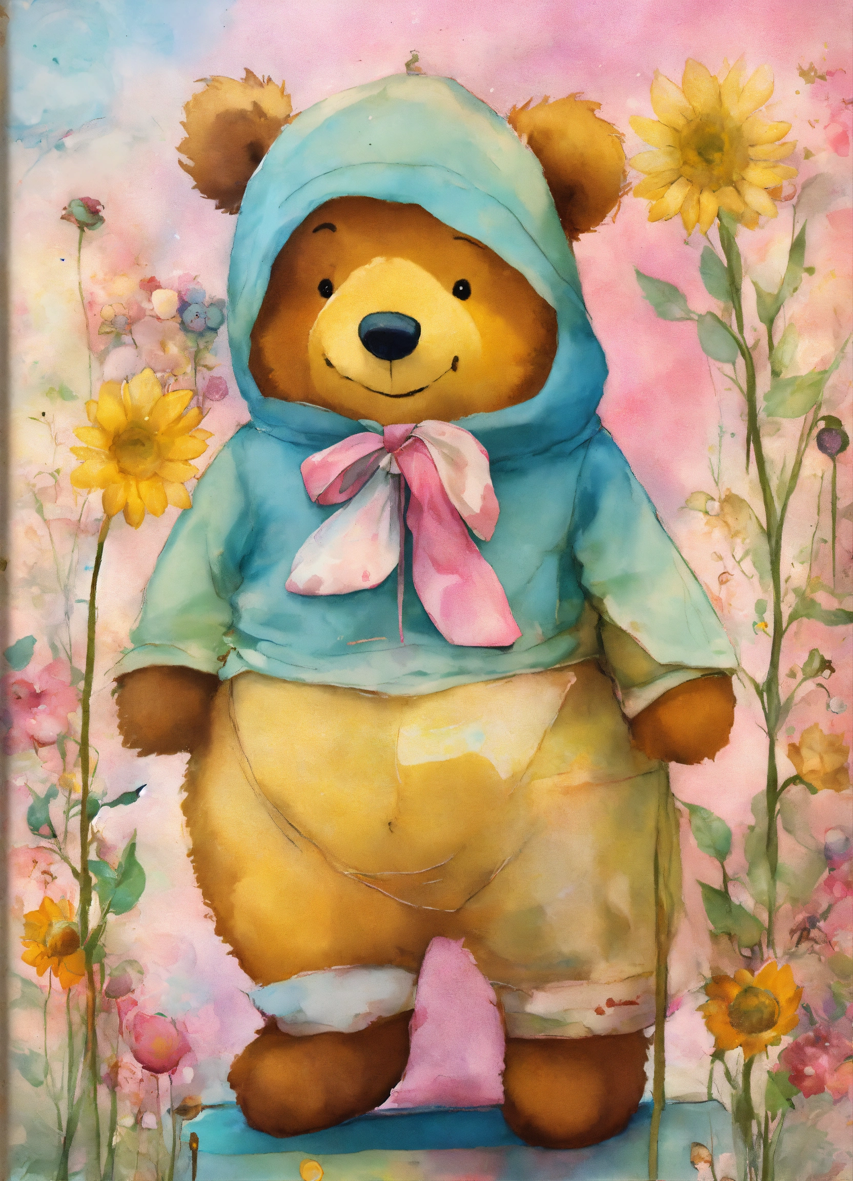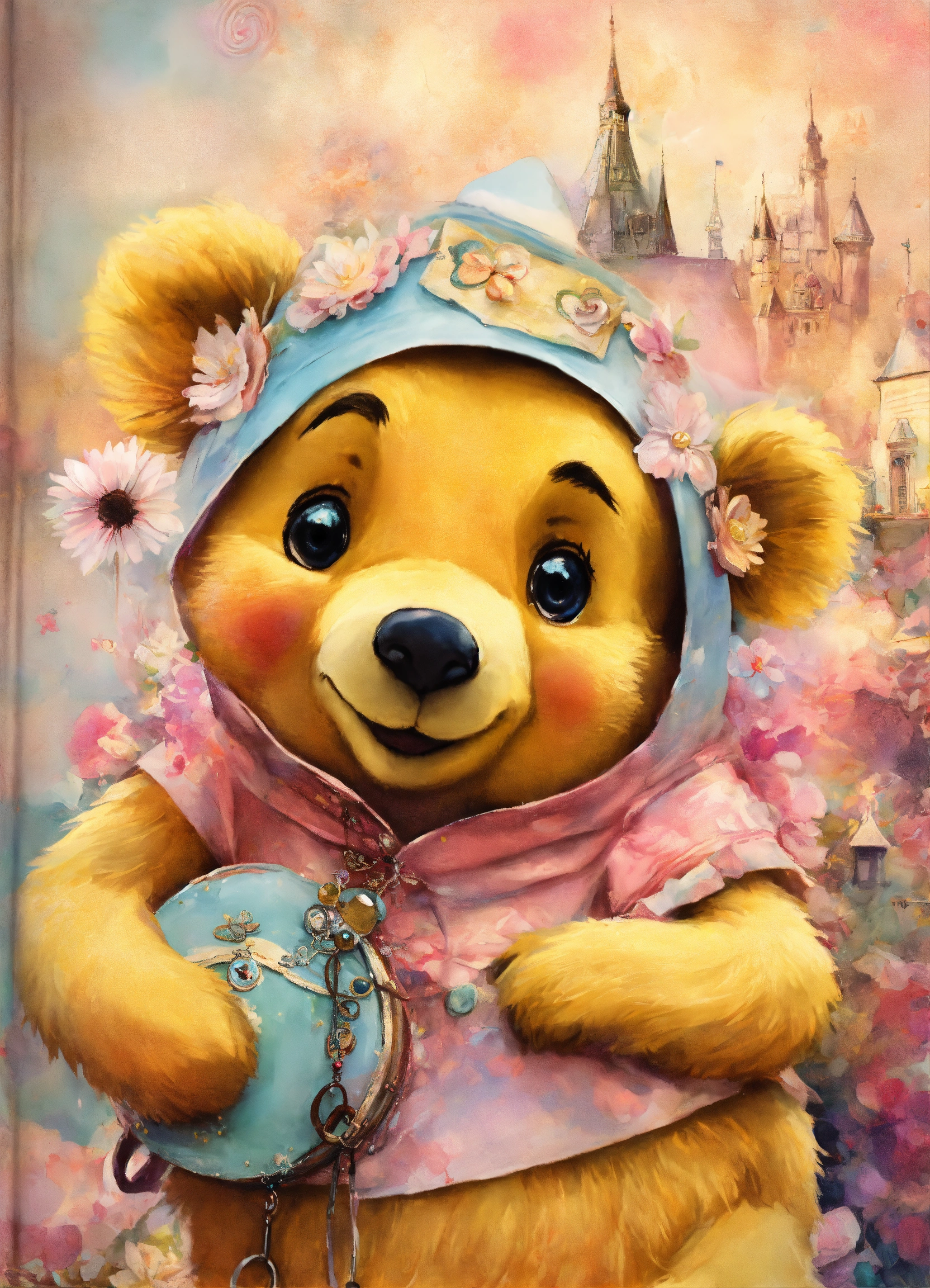 Shabby chic dreamy mist pastel junk journals whimsical cute quirky winnie the pooh bear with big eyes in odd clothings, tamara laporte style, swirling magical fairytale abstract art style