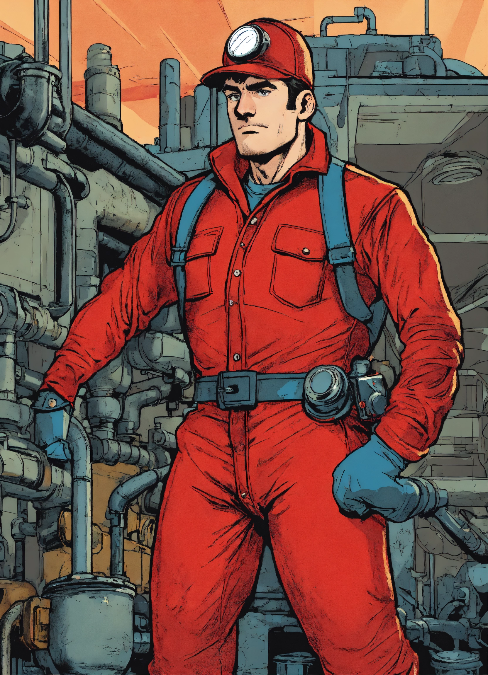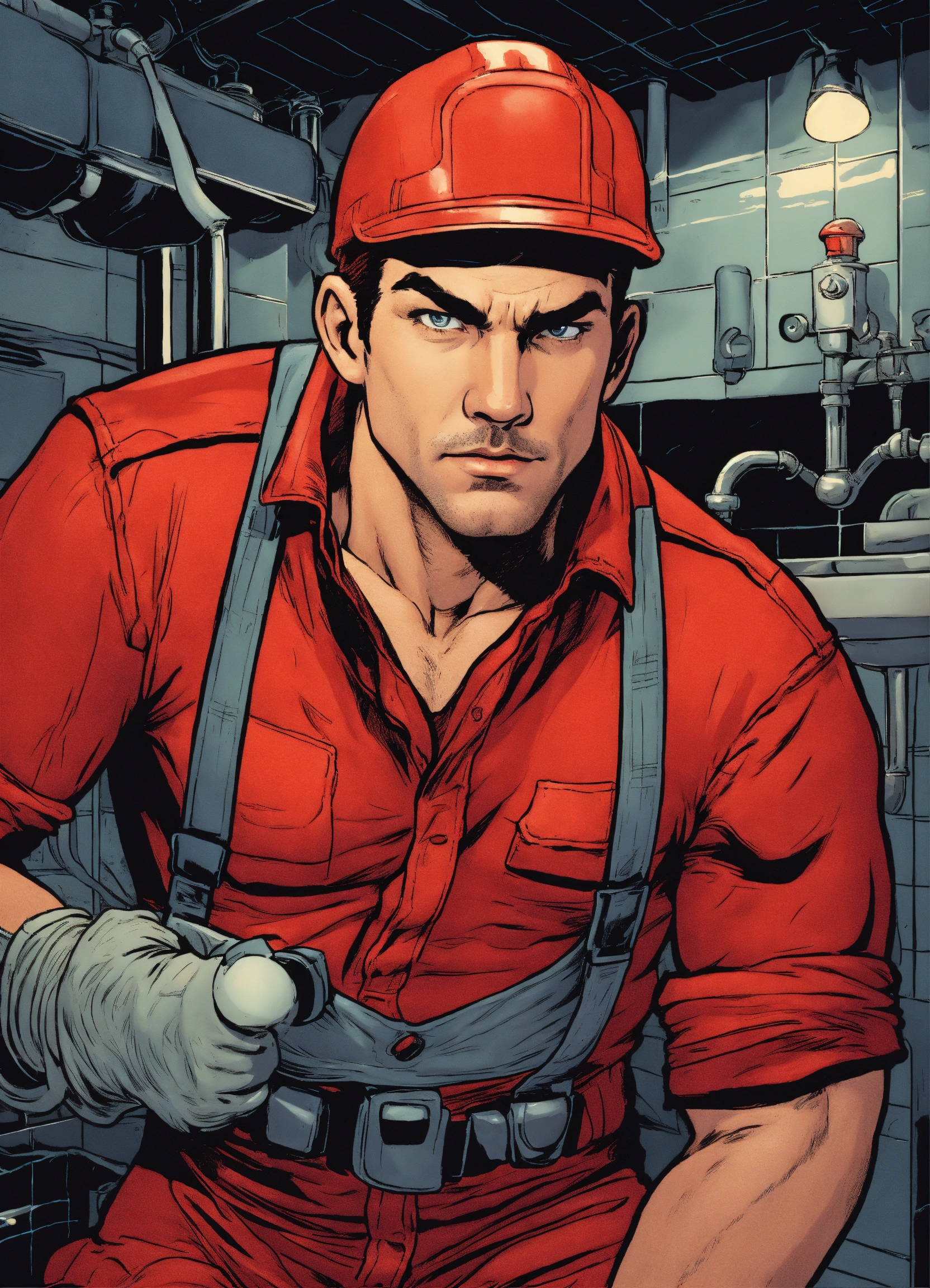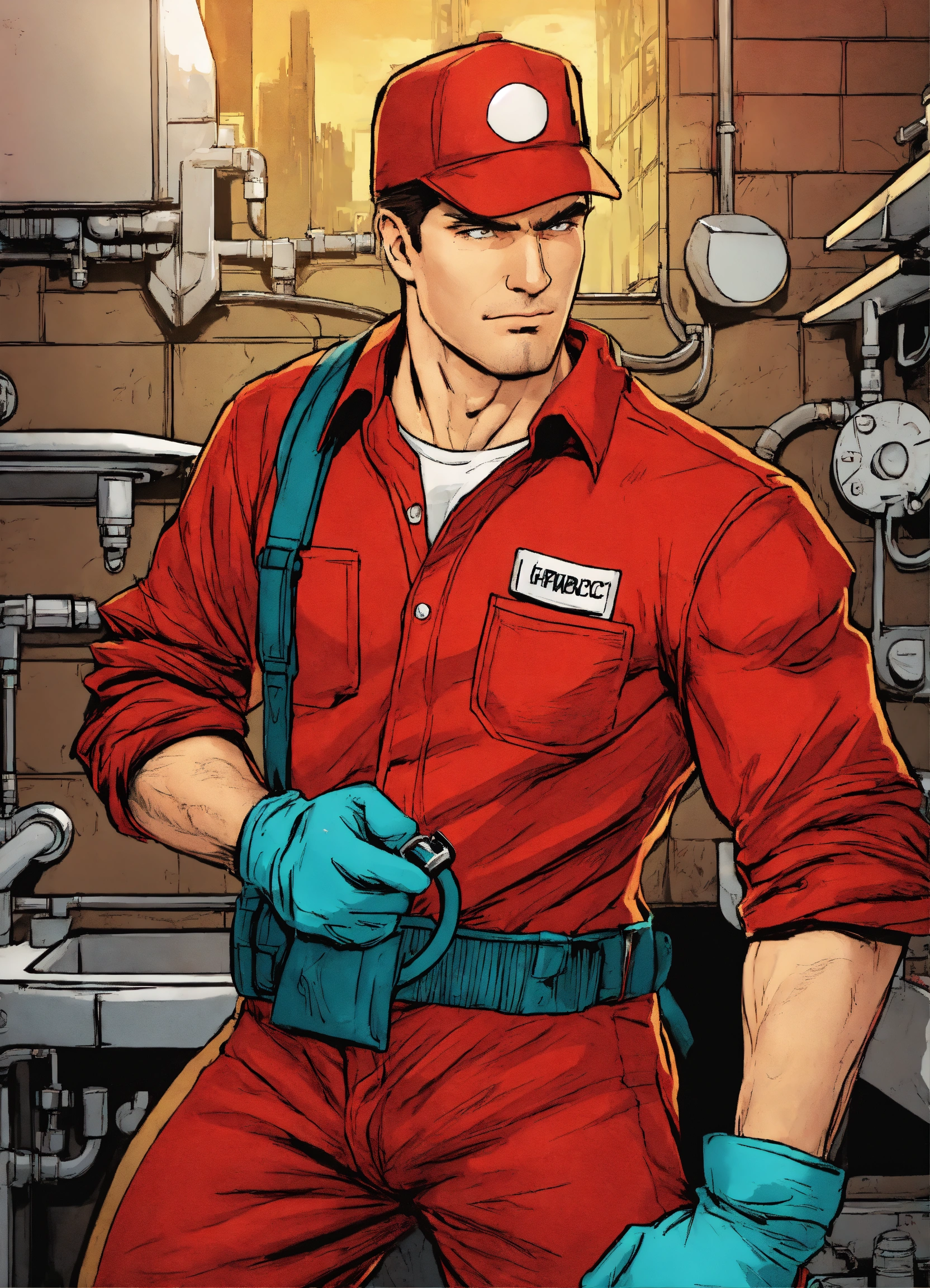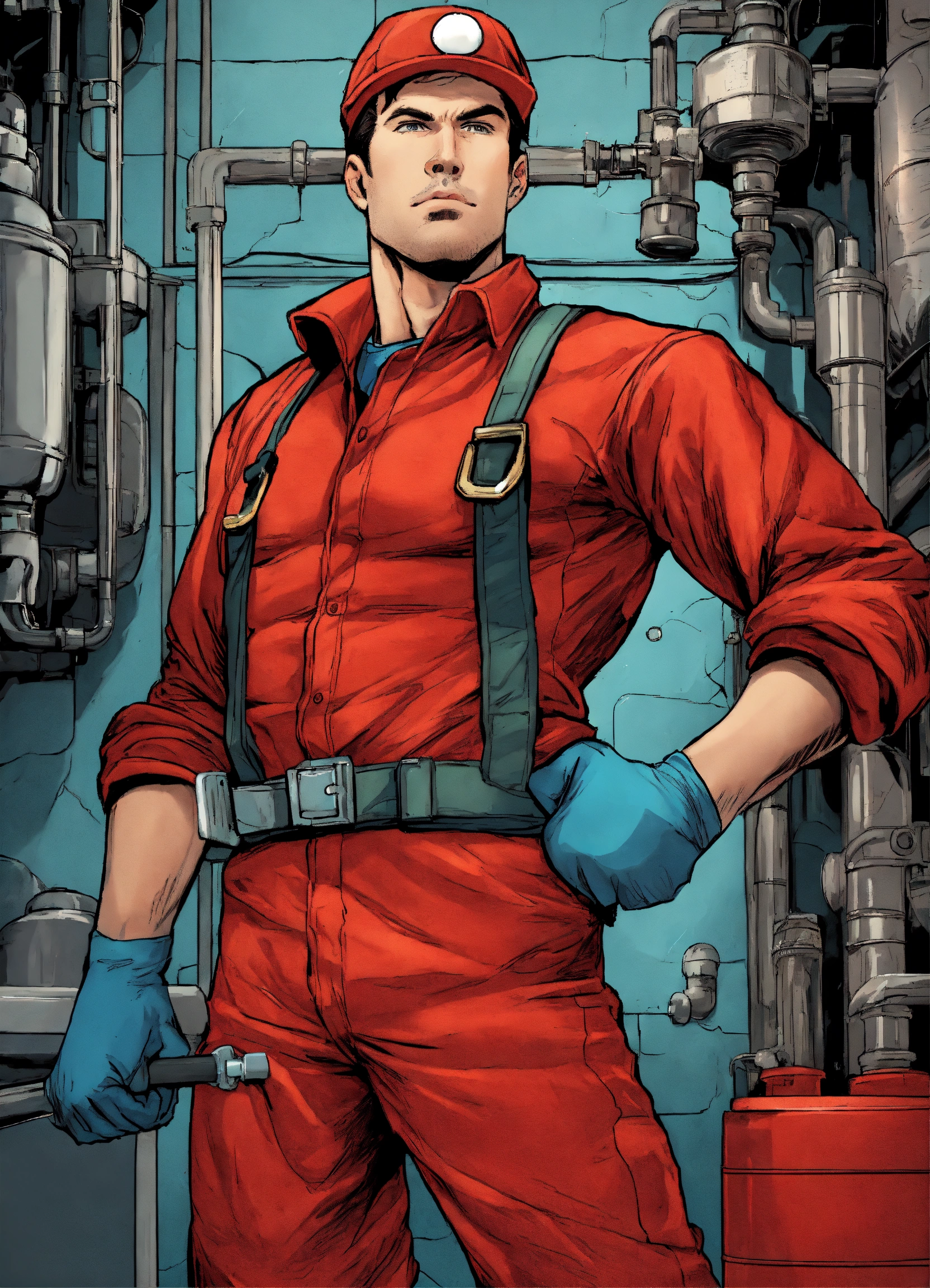Close up of a heroic plumber in a red outfit