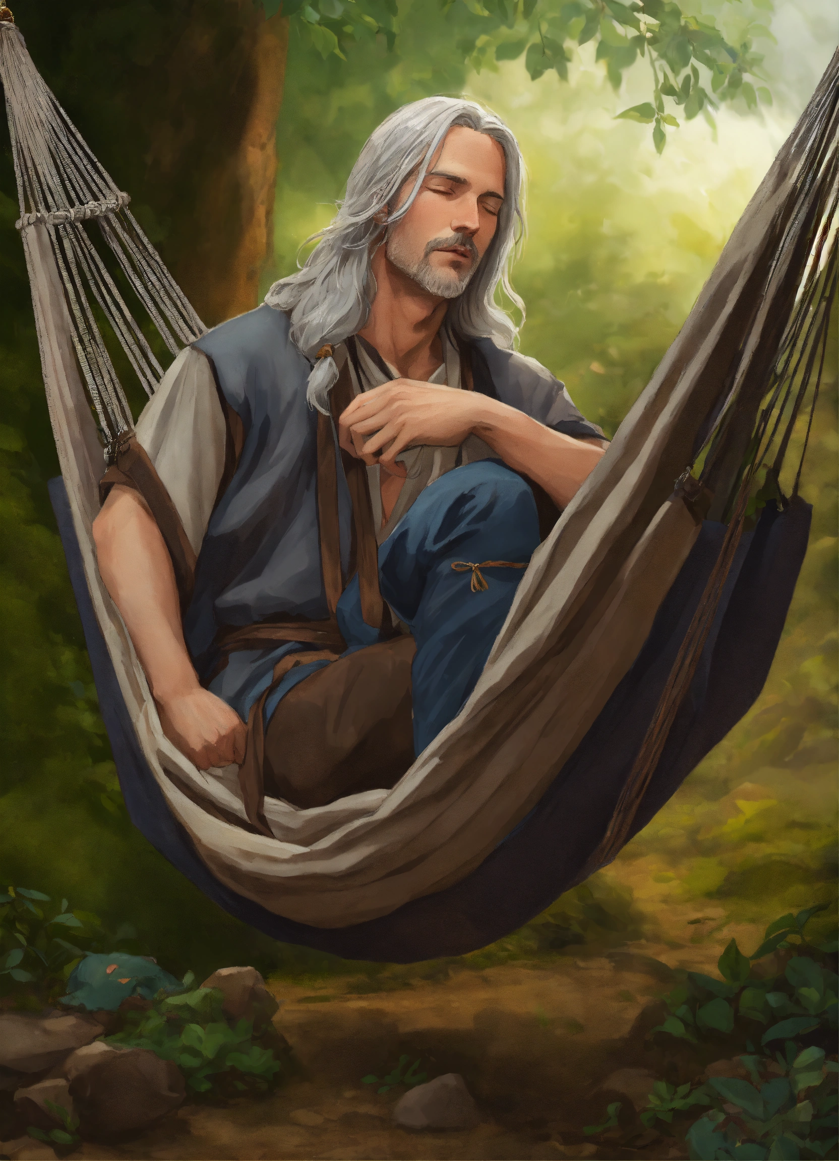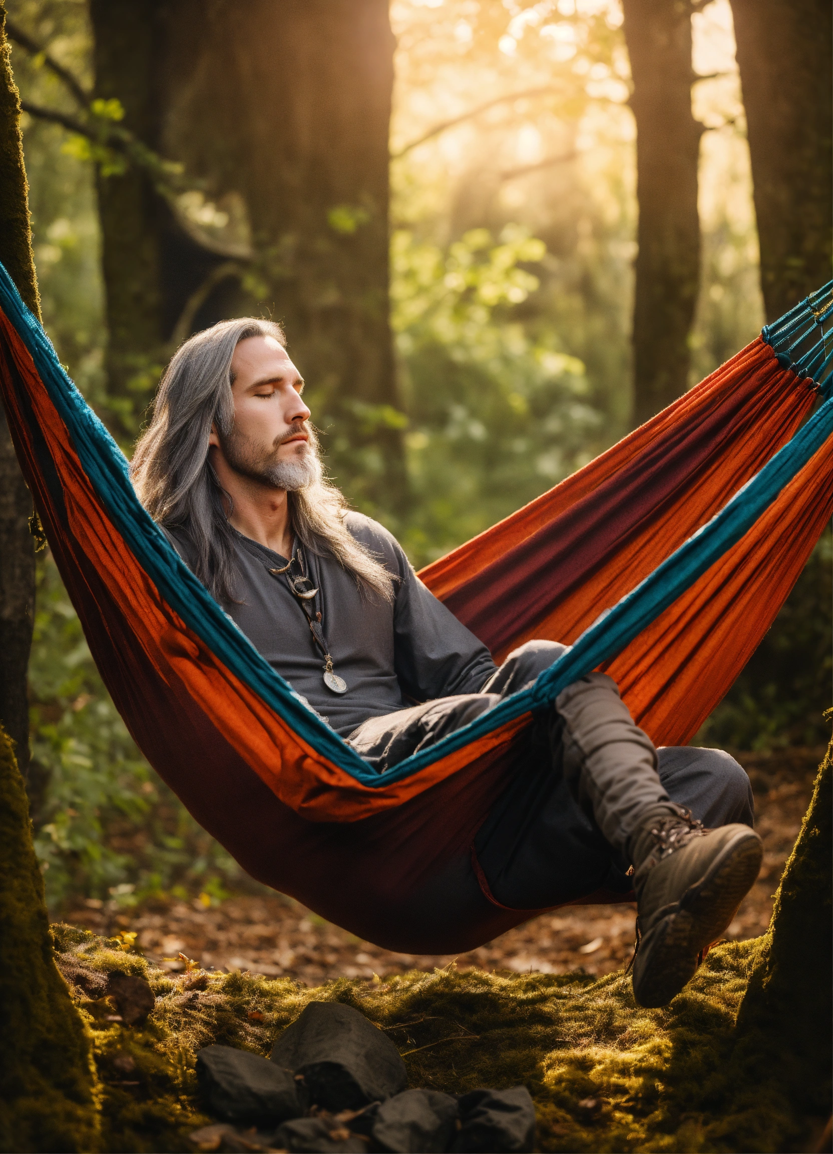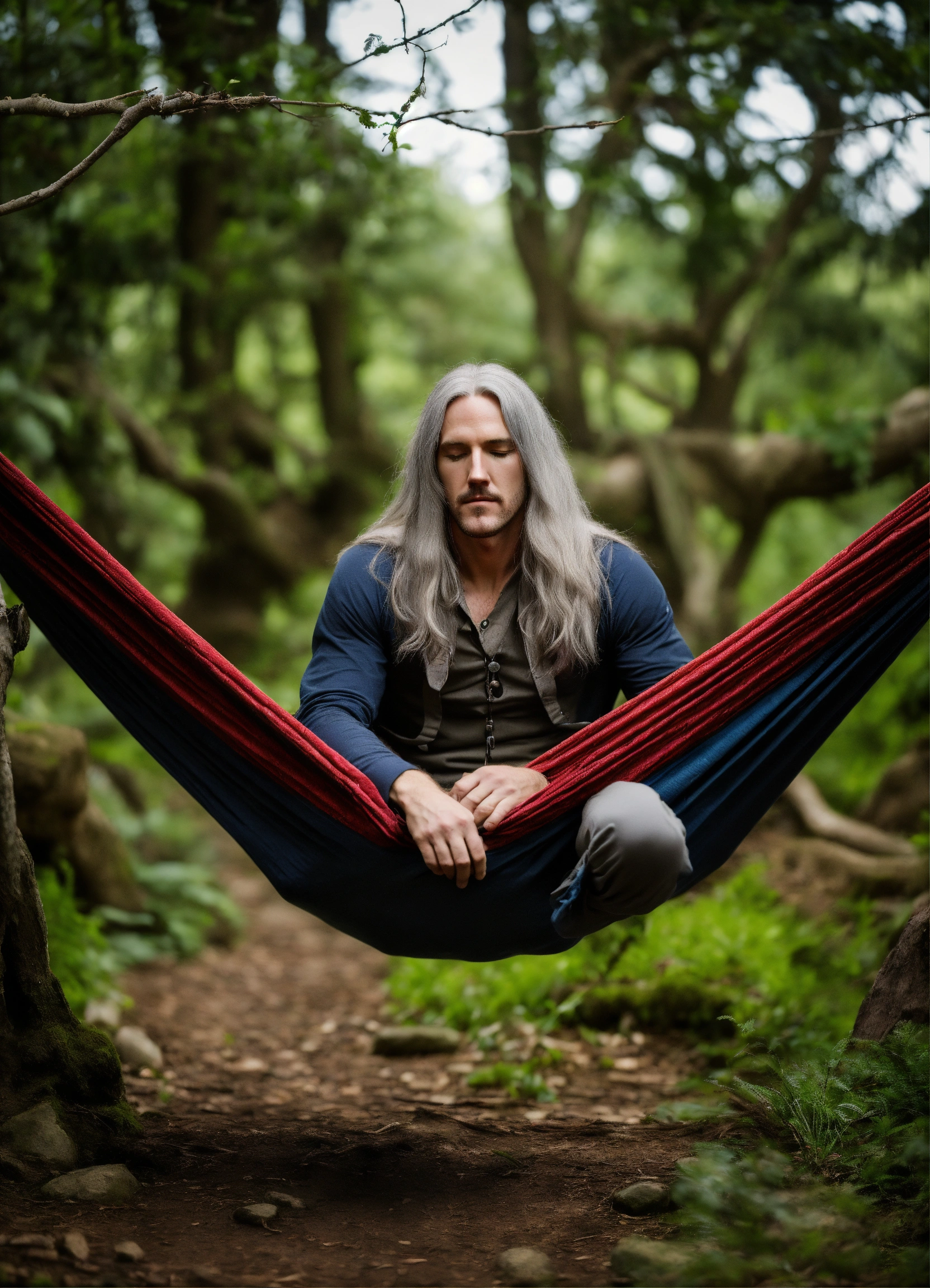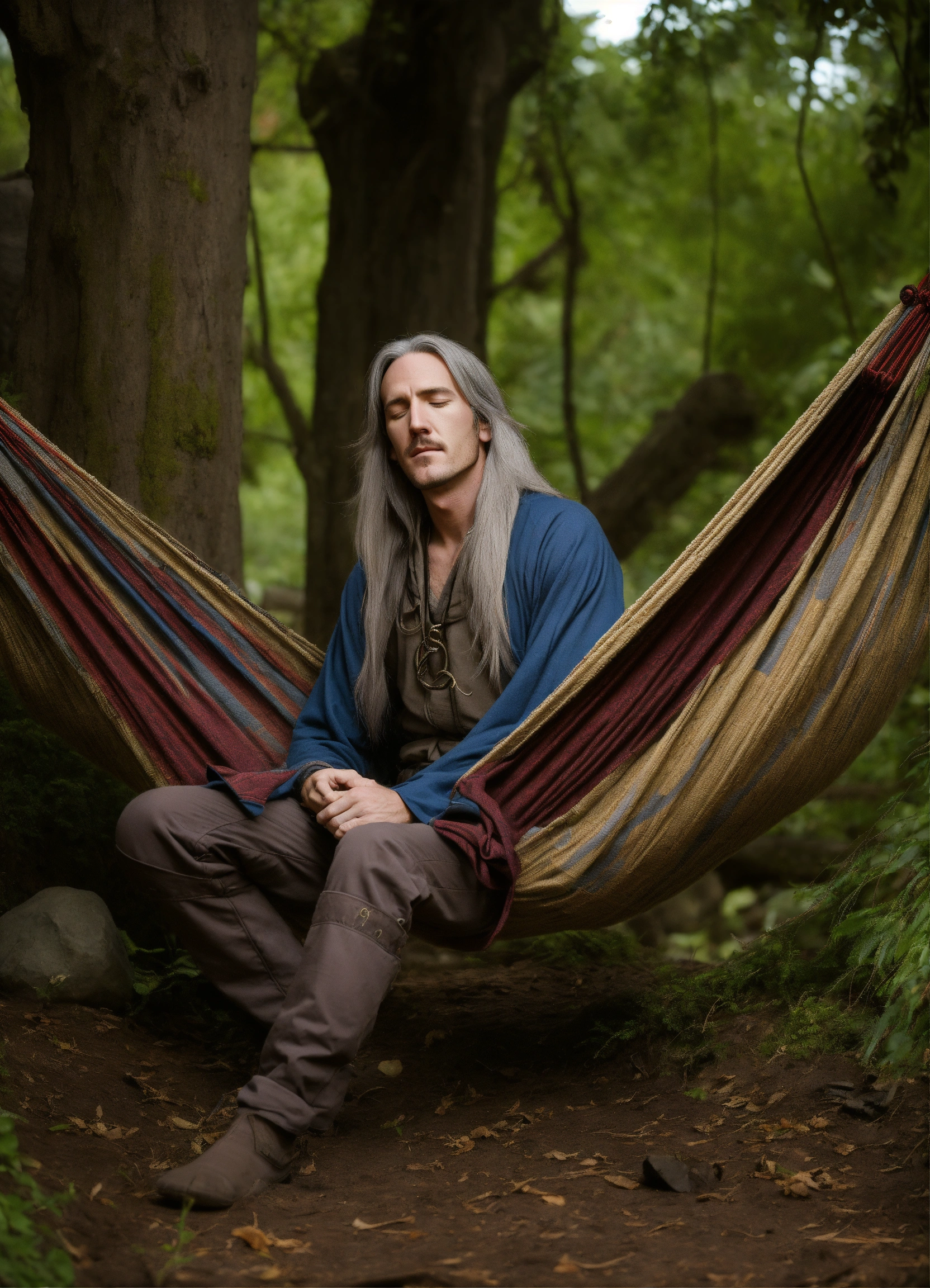 In photographic style matt mercer as a tall long distance runner with long straight gray hair wearing hermit clothes asleep in a medieval hammock