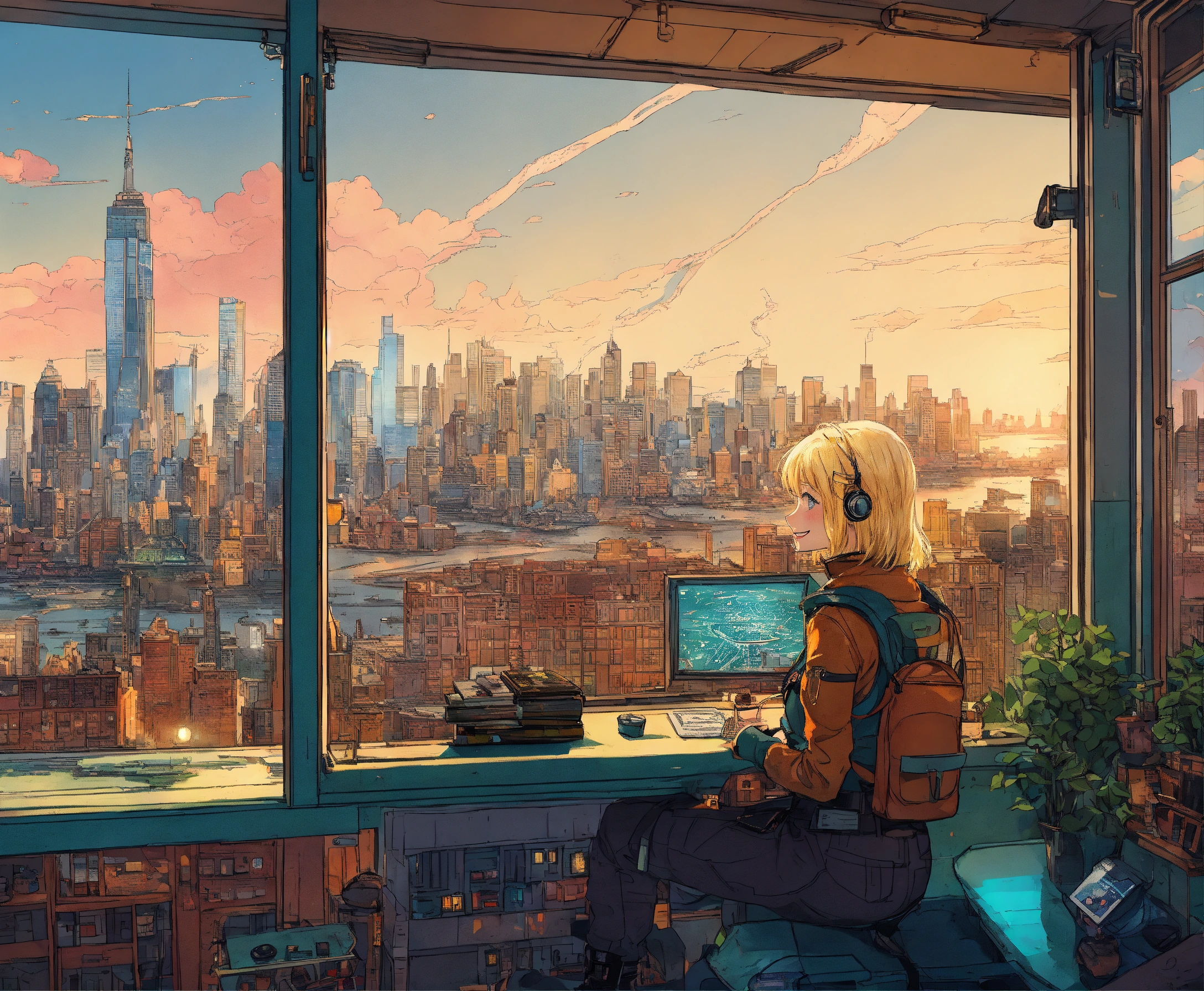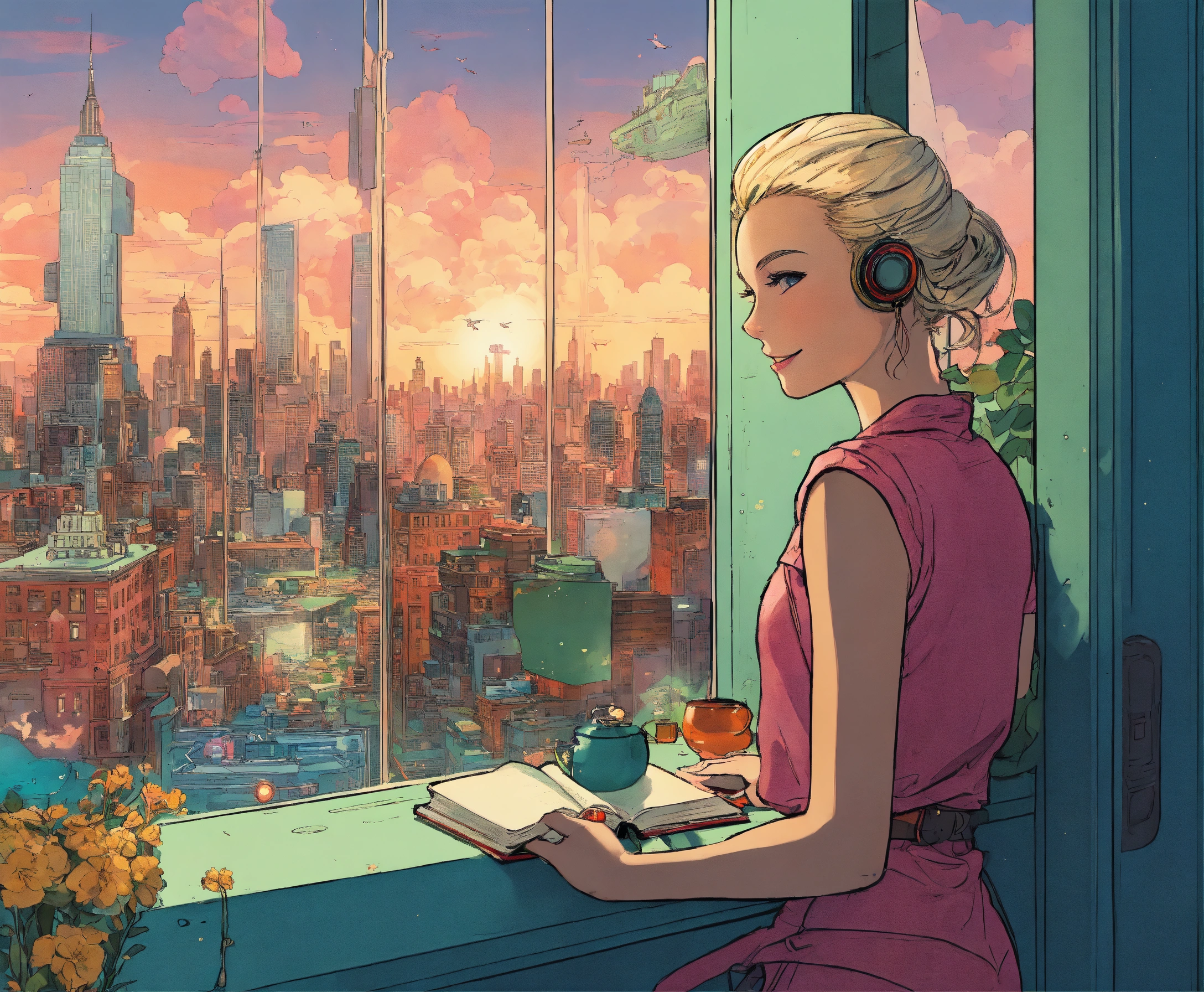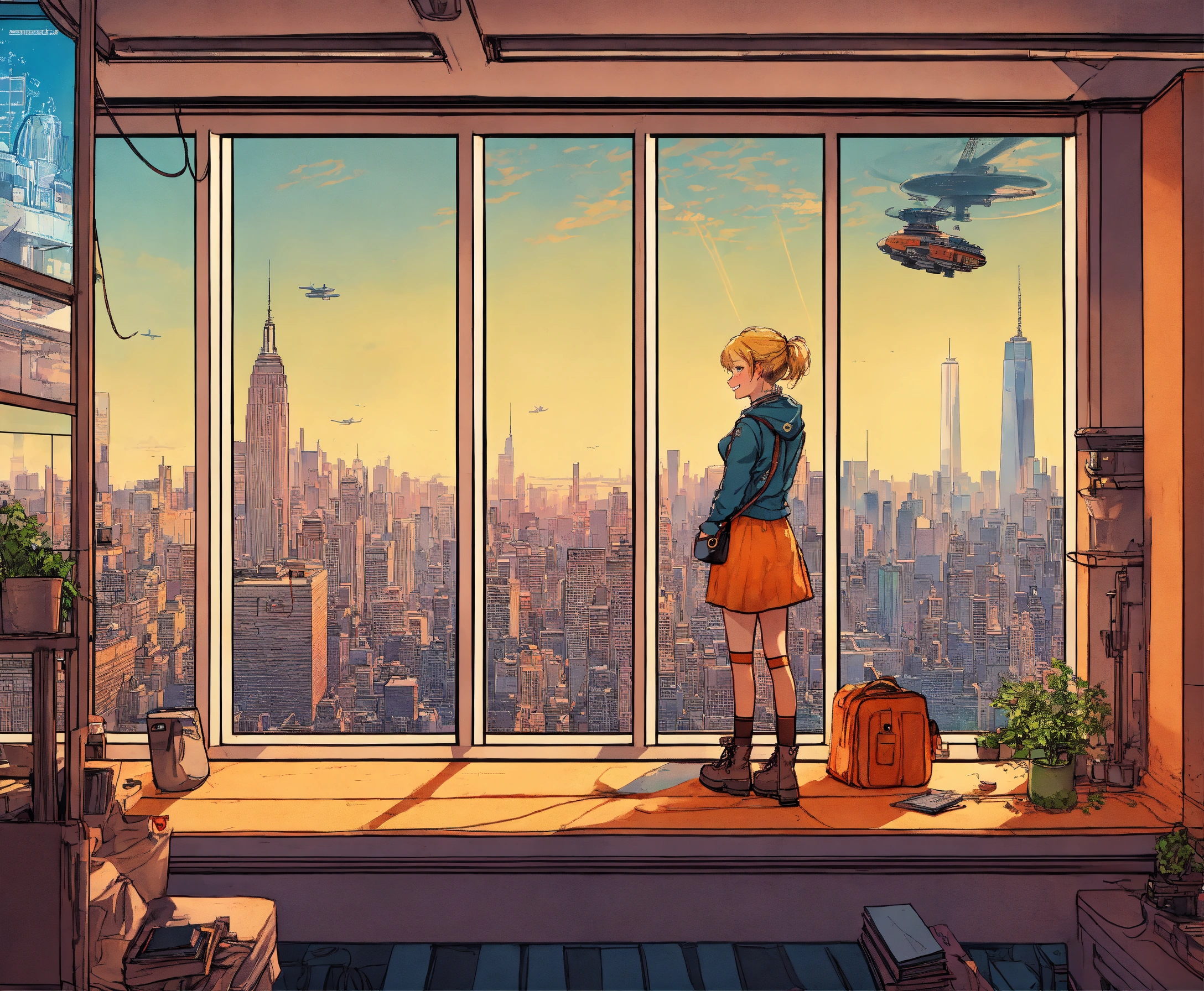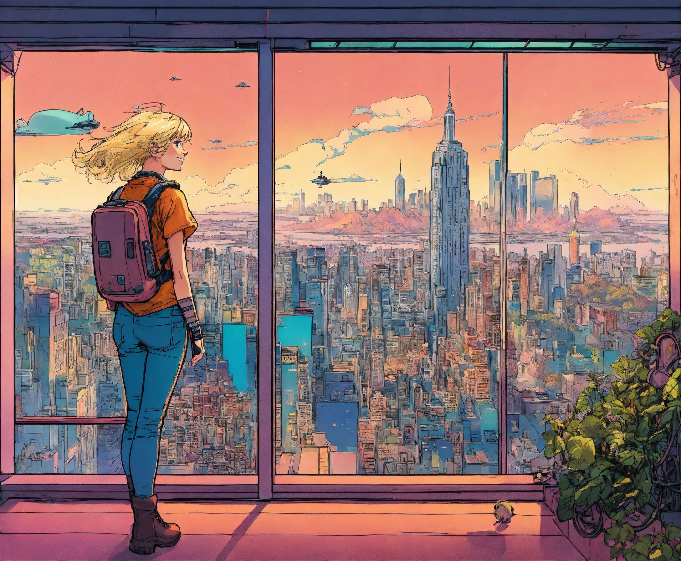 Create a book cover page. futurepunk style young lady with blond hear smiling. the view outside of the huge window is overlooking neo new york. the atmosphere is filled with a sci-fi ambiance, with bright and saturated colors creating an otherworldly feeling. by mattias adolfsson.