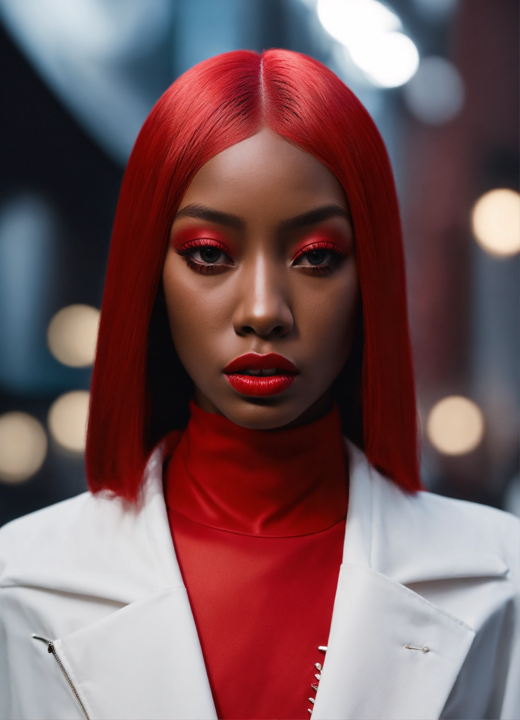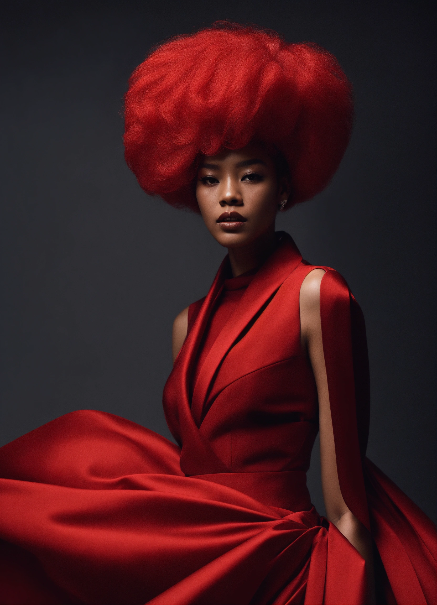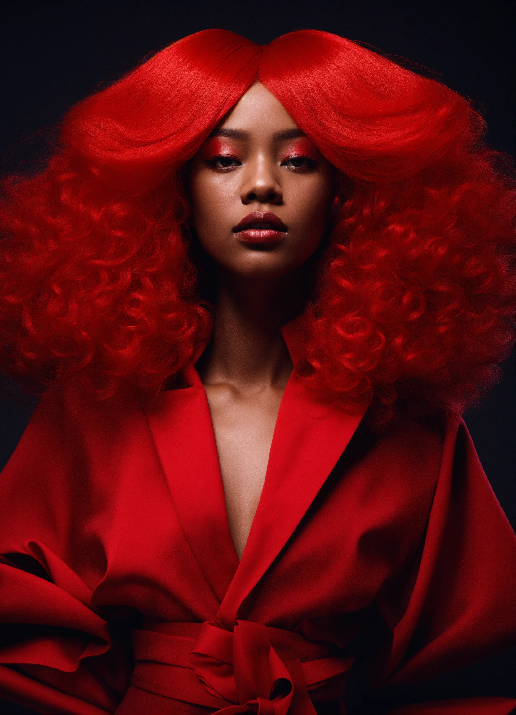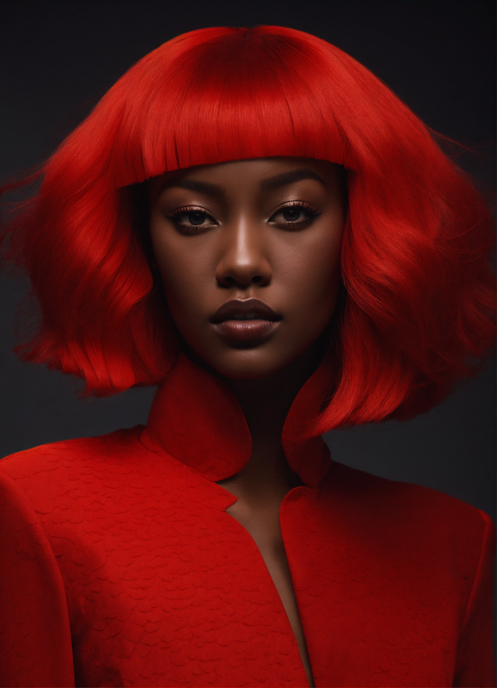 Minimalistic and sleek, hyperrealistic, black woman female model in vera wang extremely dramatic inspire garments, white bob paper made wig as hair, dressed in red, regal and edgy, intricate fashion styling, oversized flowing red hair, hd, subsurface scattering