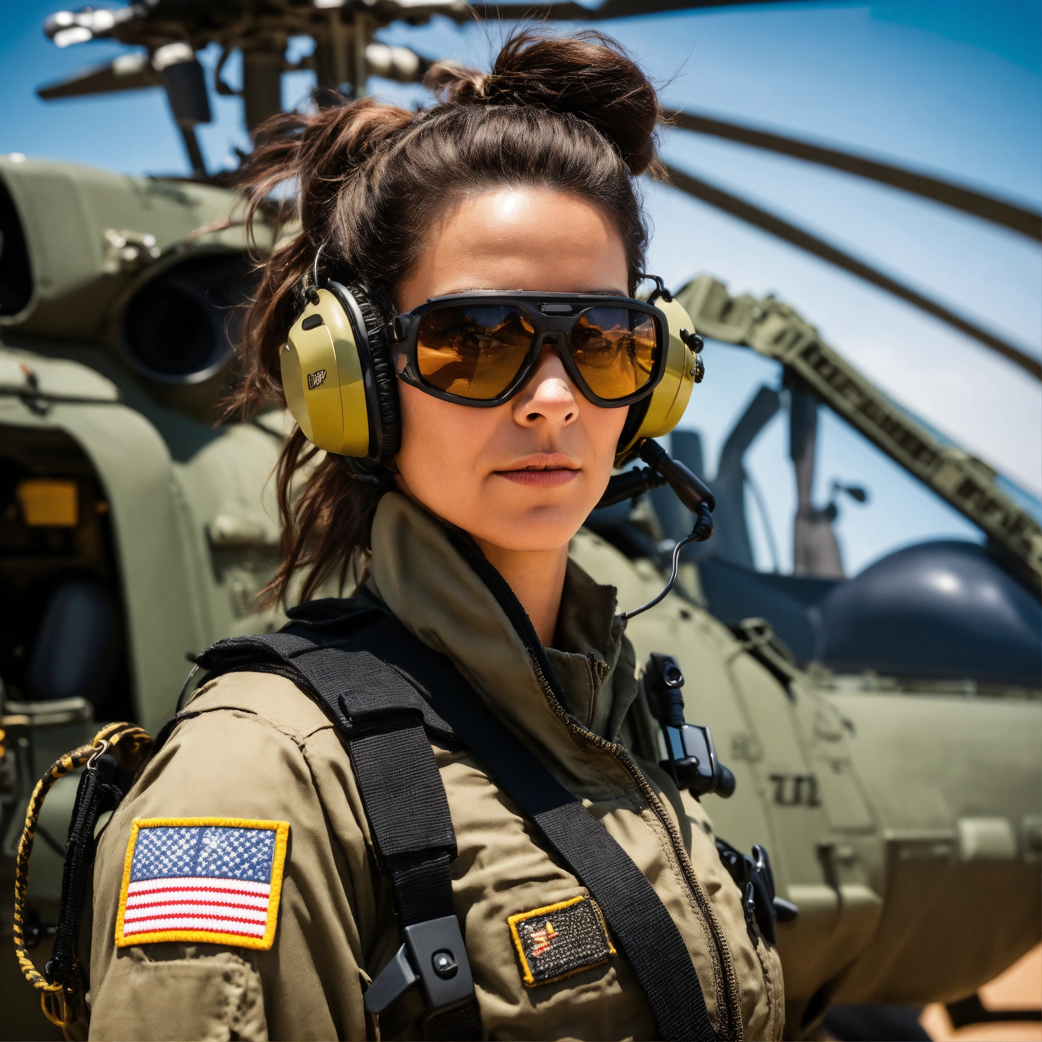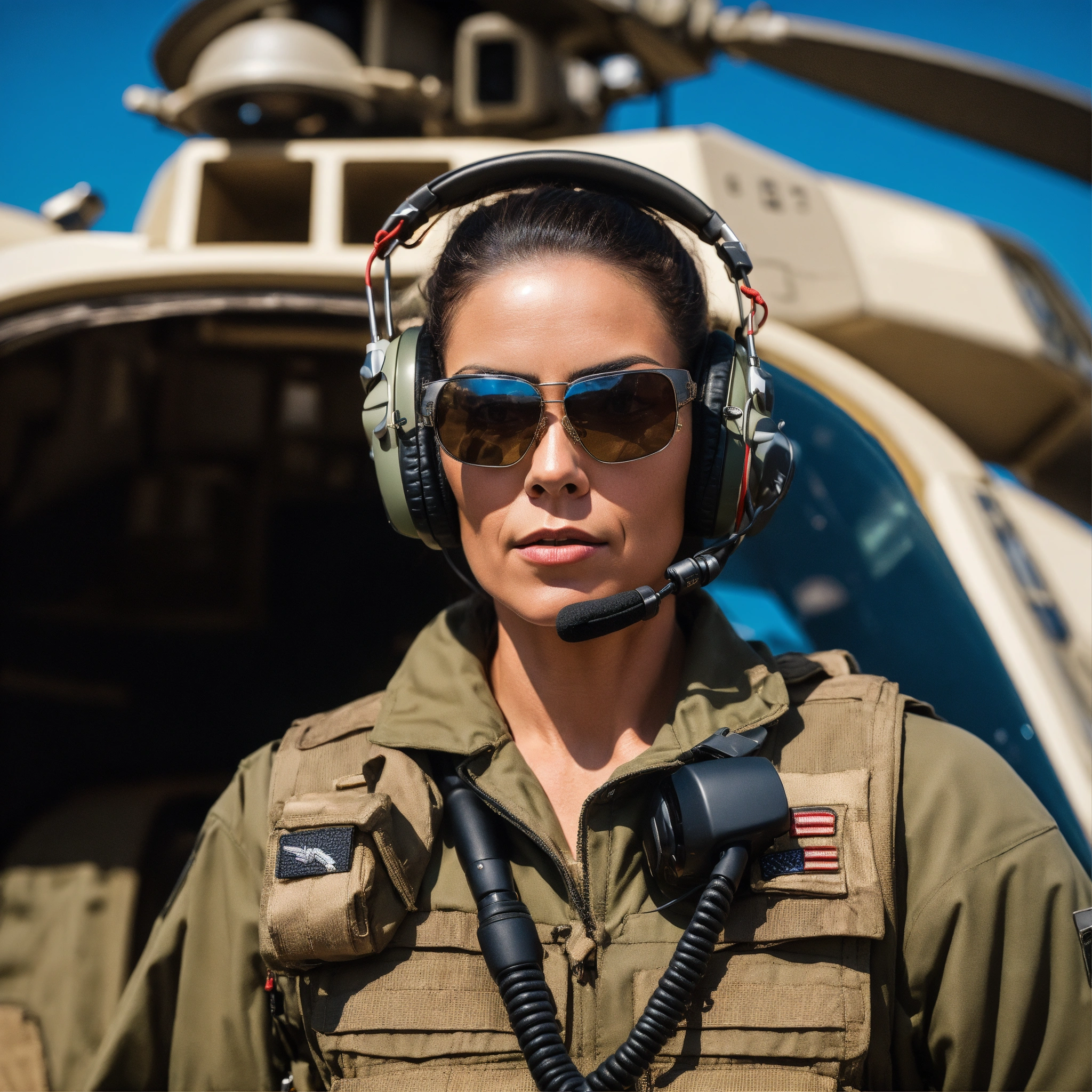 A rugged muscular fit woman in her late thirties with a ponytail and a commanding presence, wearing a big vintage-inspired boombox headset and classic wayfarer sunglasses. us air force helicopter pilot, portrait outside of an apache gunship with head turned towards the camera.