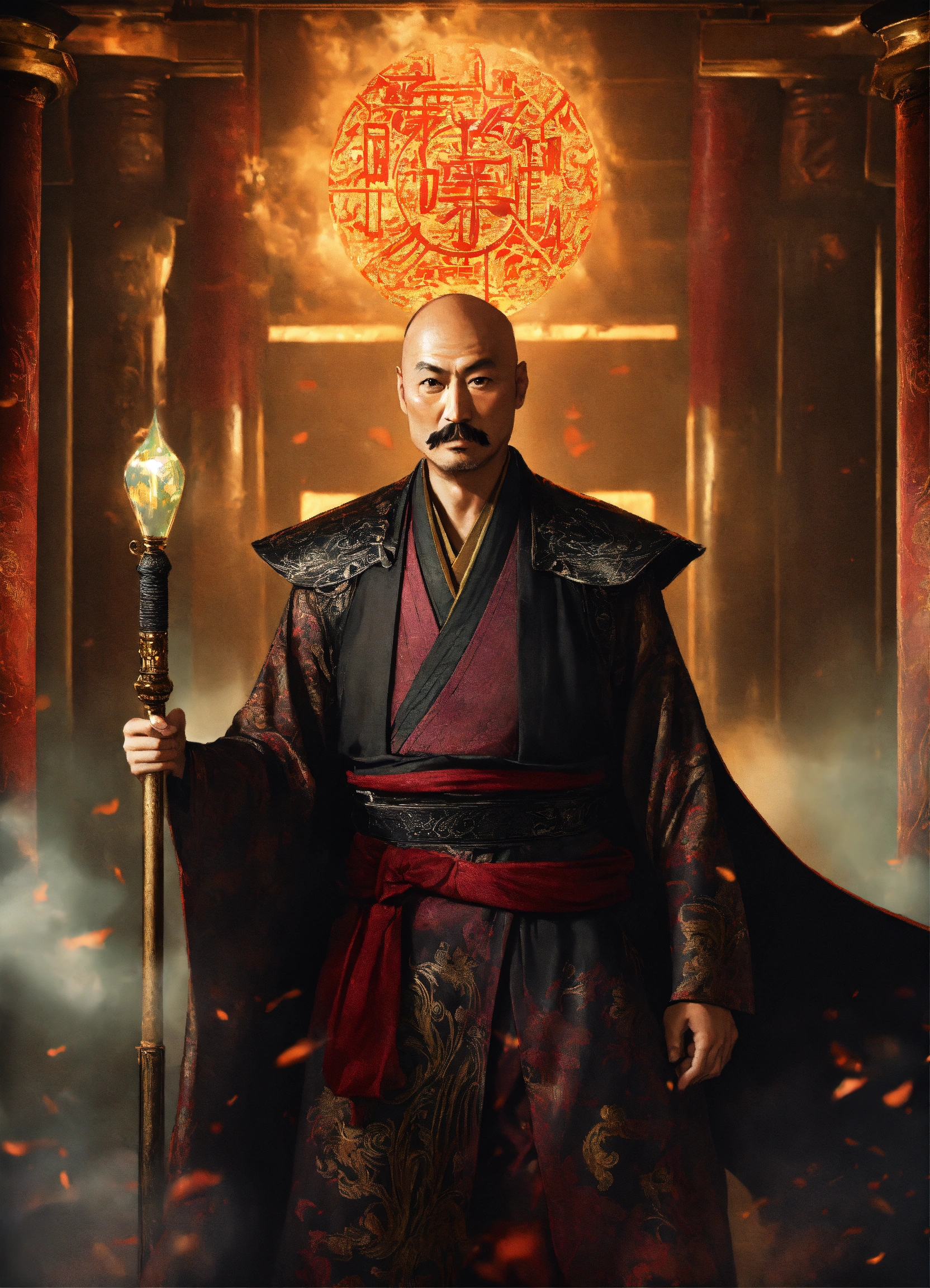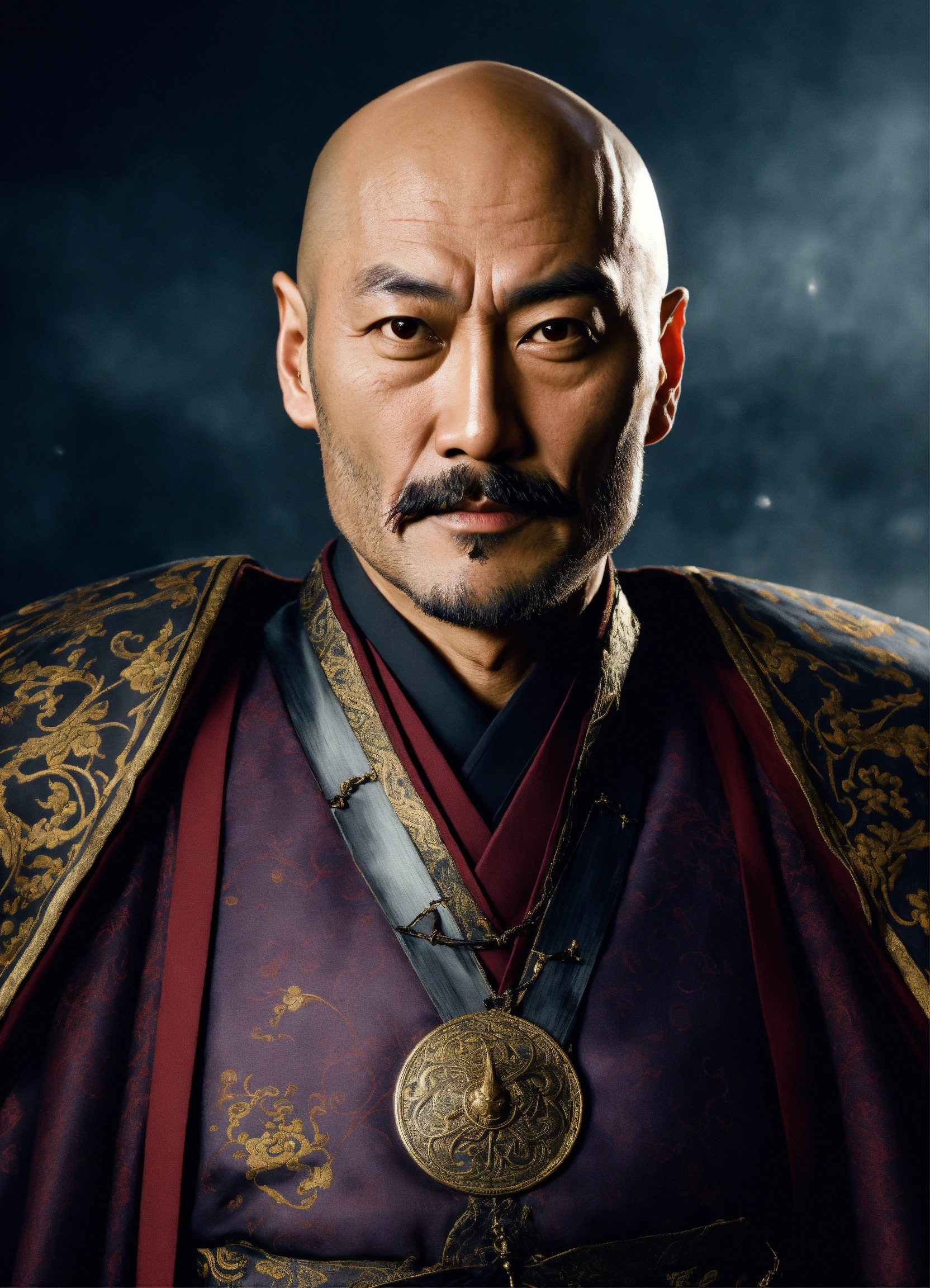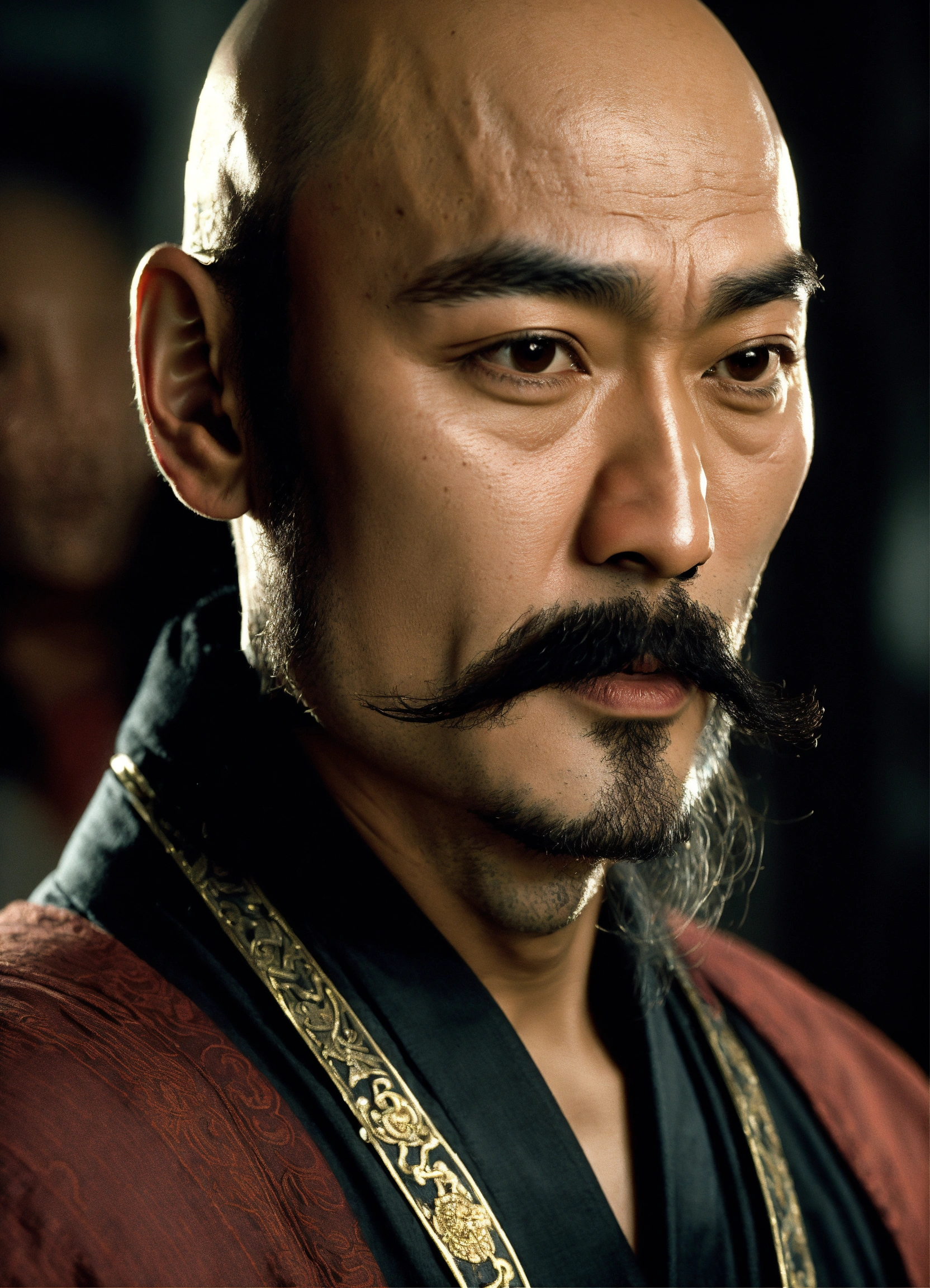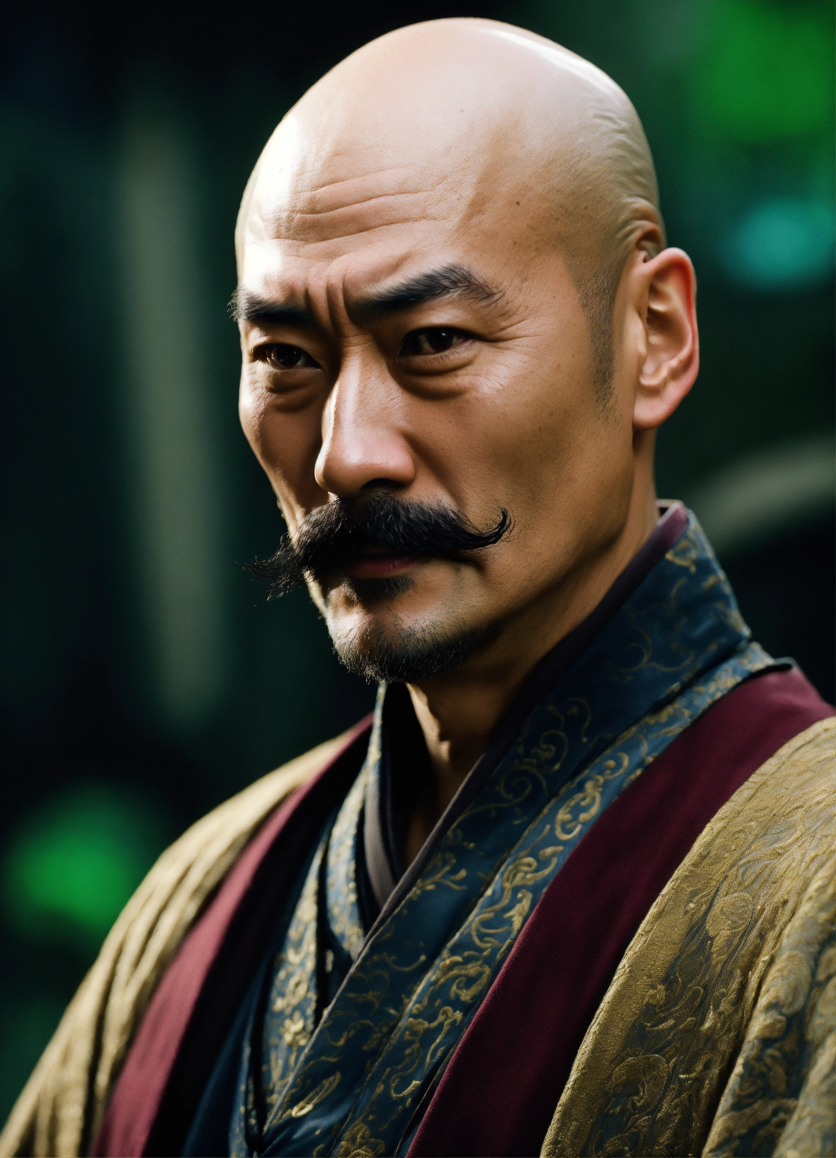 An bald and long black moustache ken watanabe as a very powerful oriental wizard for a fantasy rpg